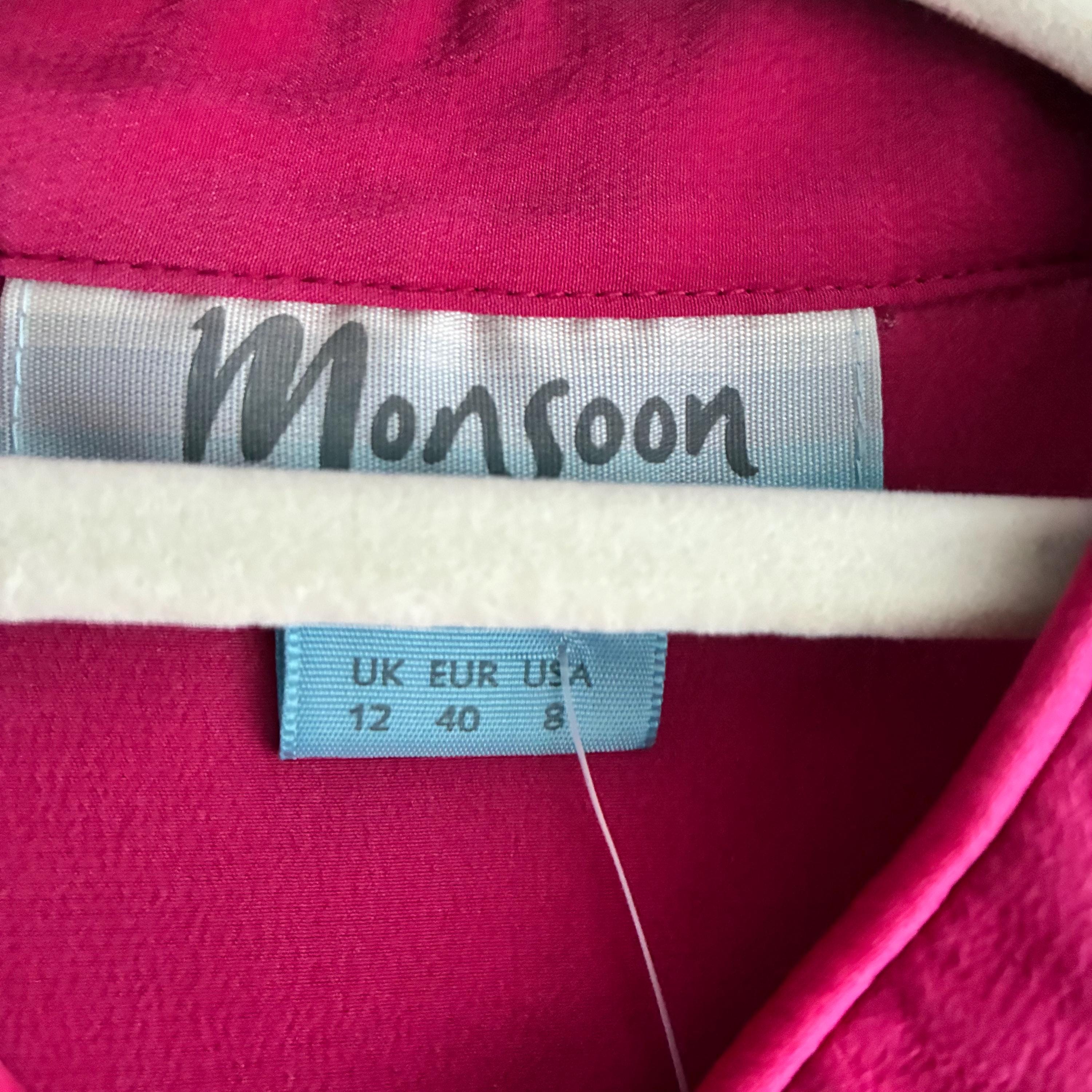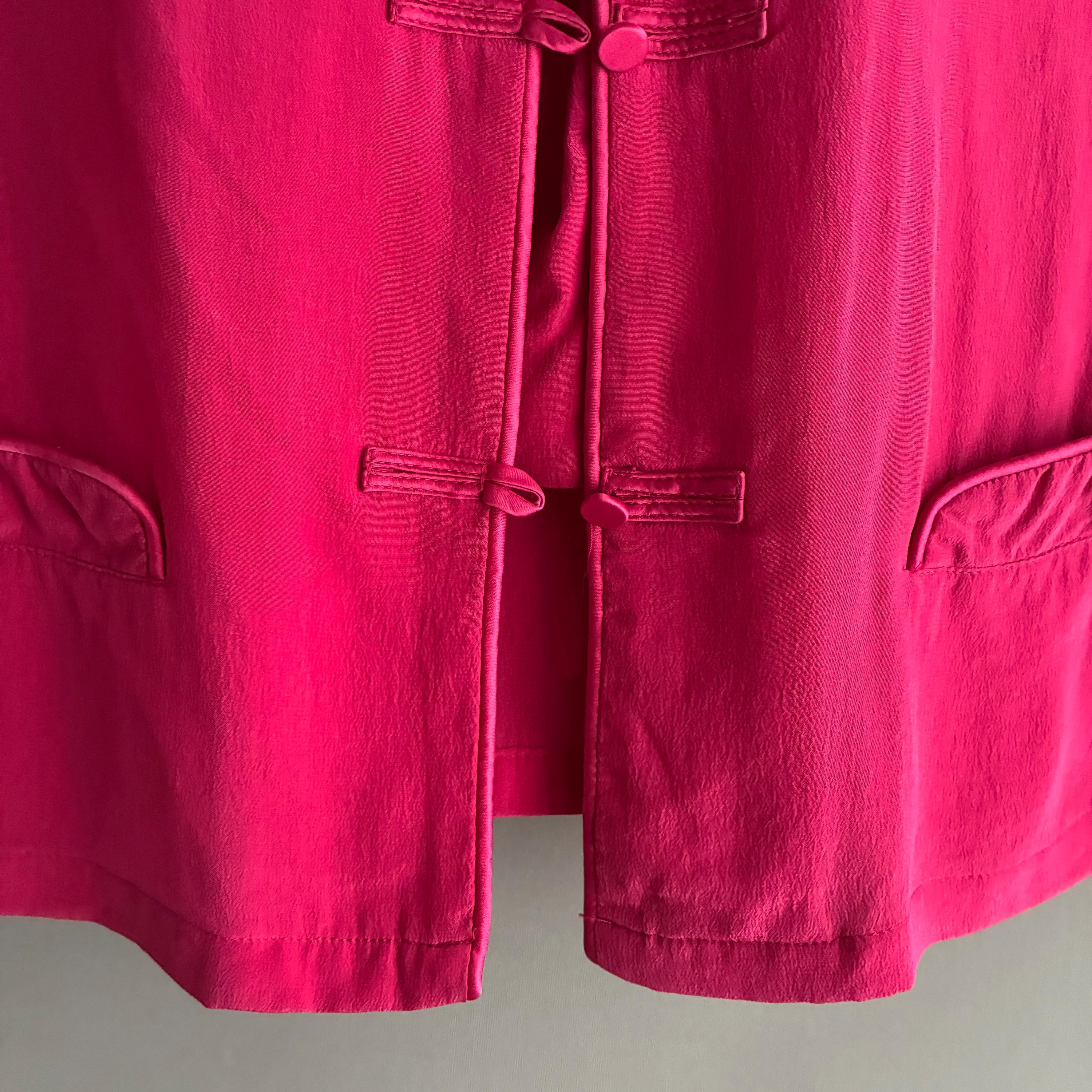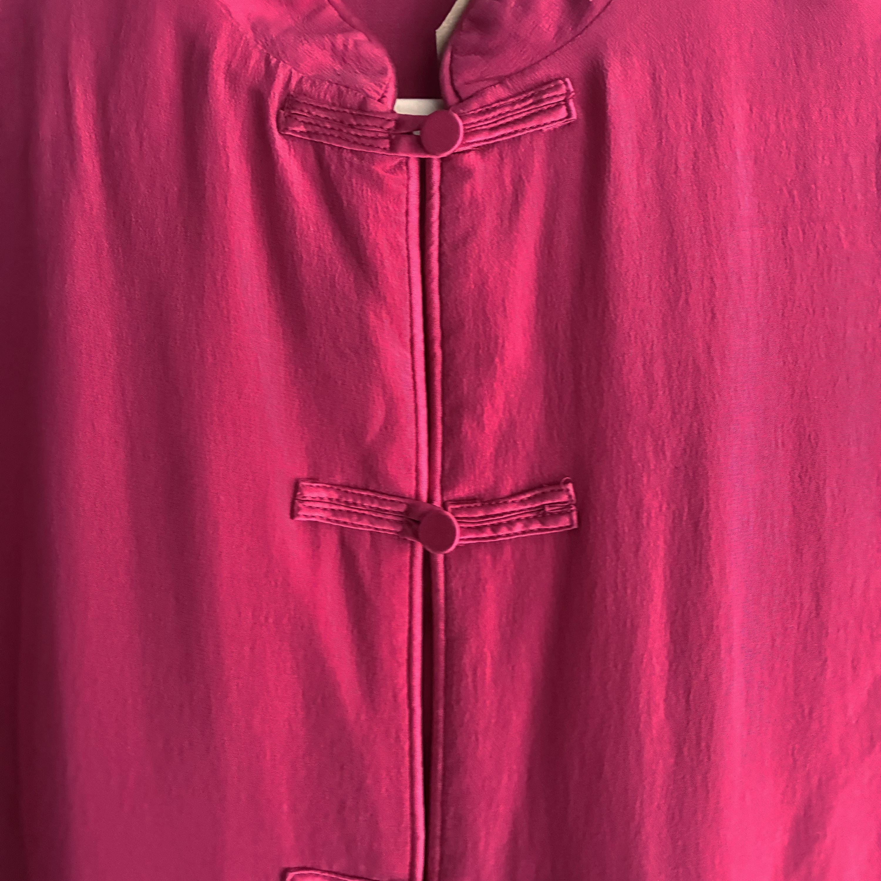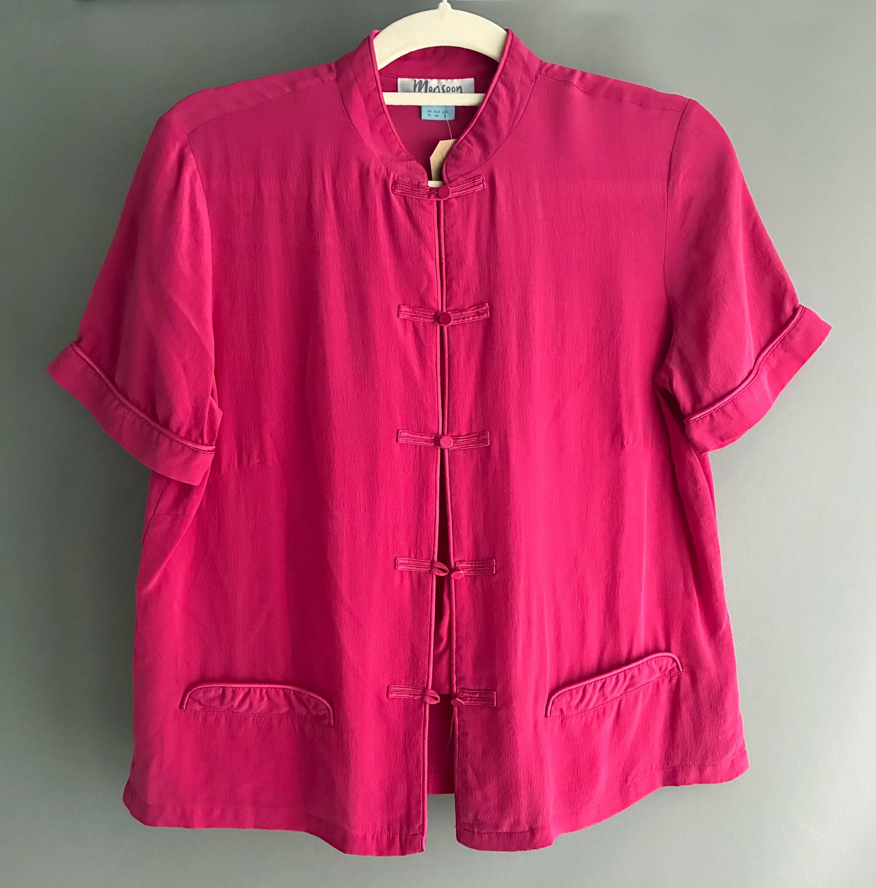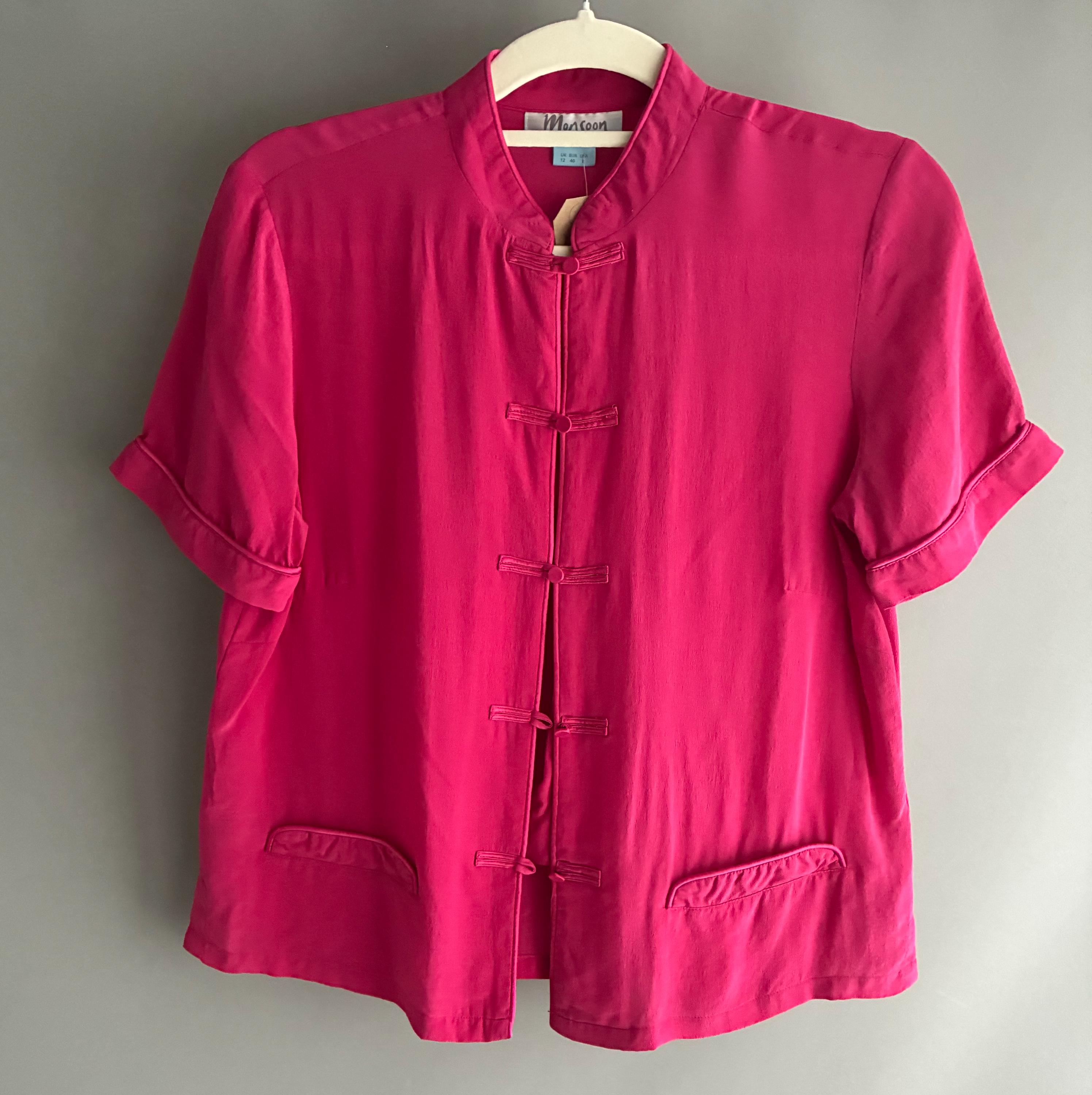 A stunning 1980s vintage Monsoon 100% Silk Blouse features a Chinese-style mandarin collar with traditional toggle fastenings.