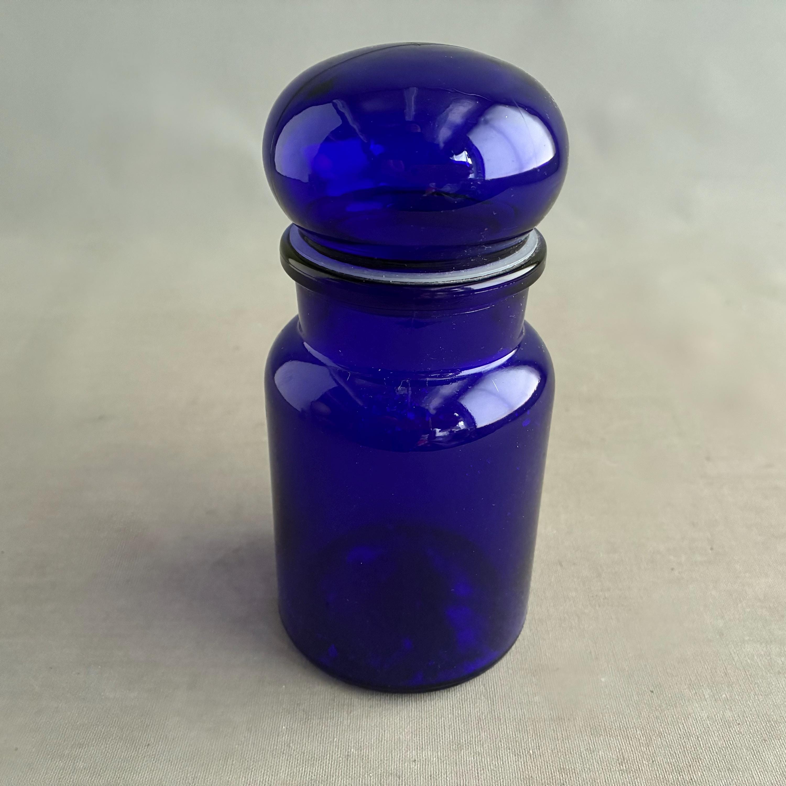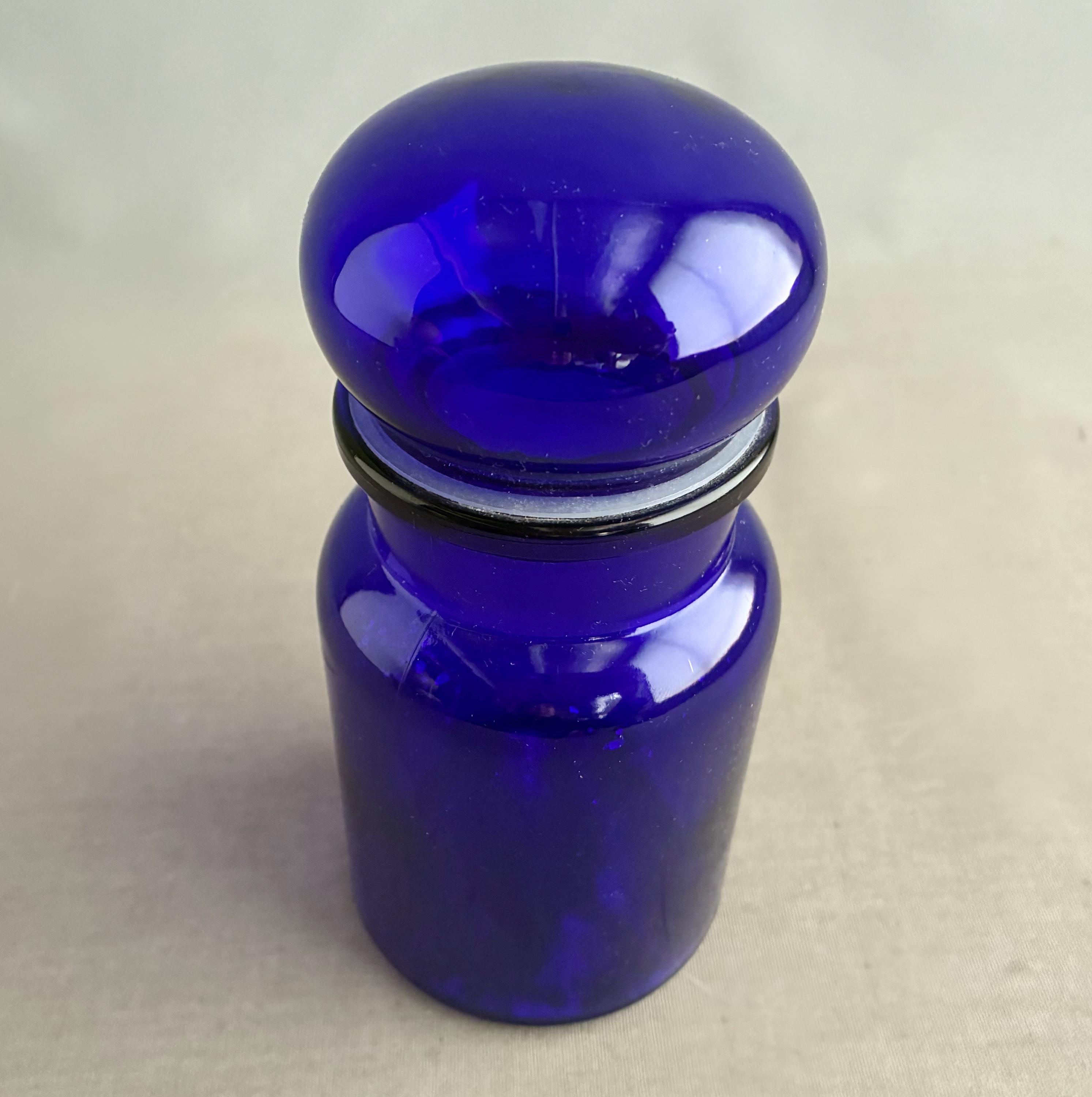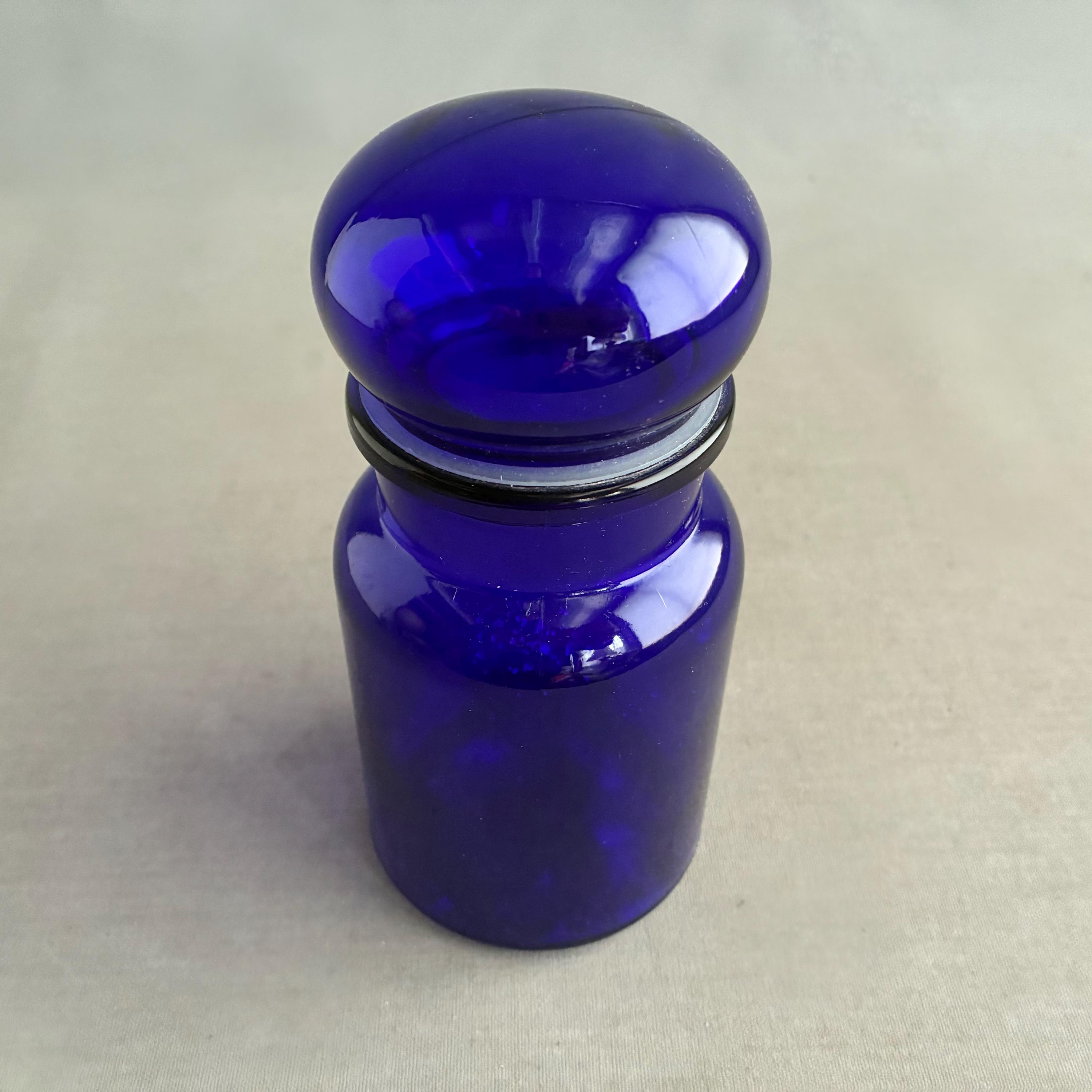 A mid-century vintage Belgian apothecary storage jar, crafted from vibrant cobalt blue glass with a distinctive bubble-shaped lid.