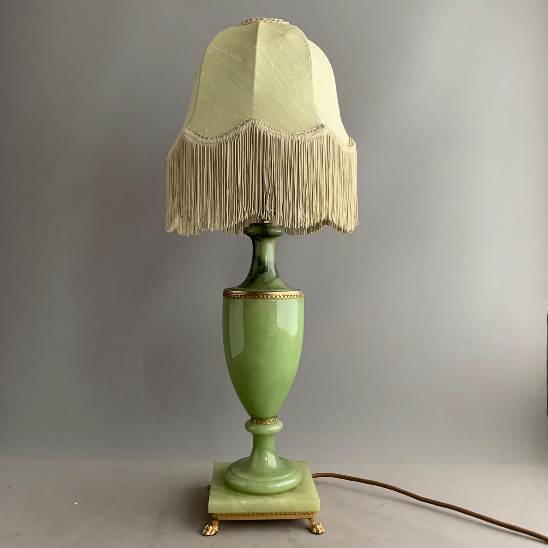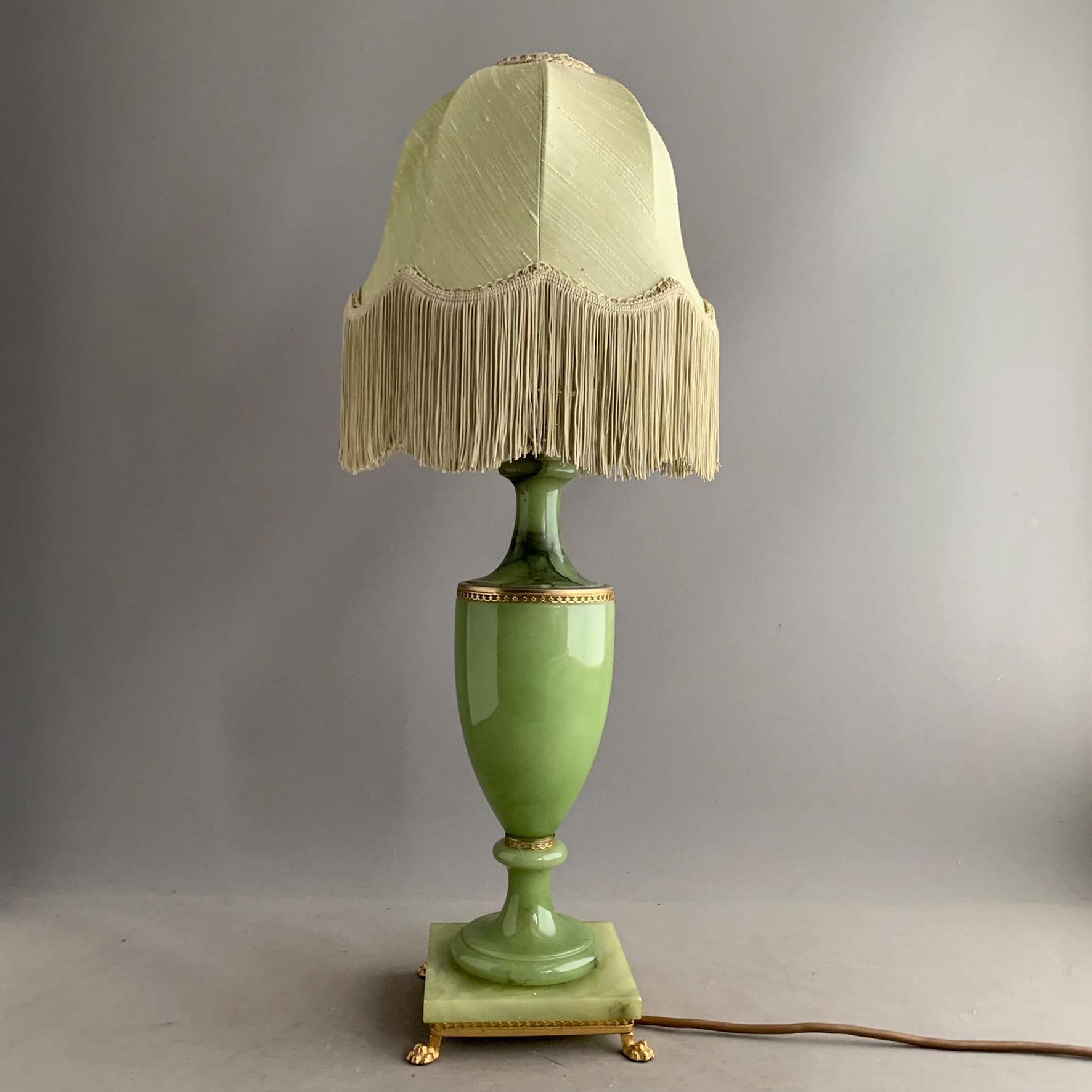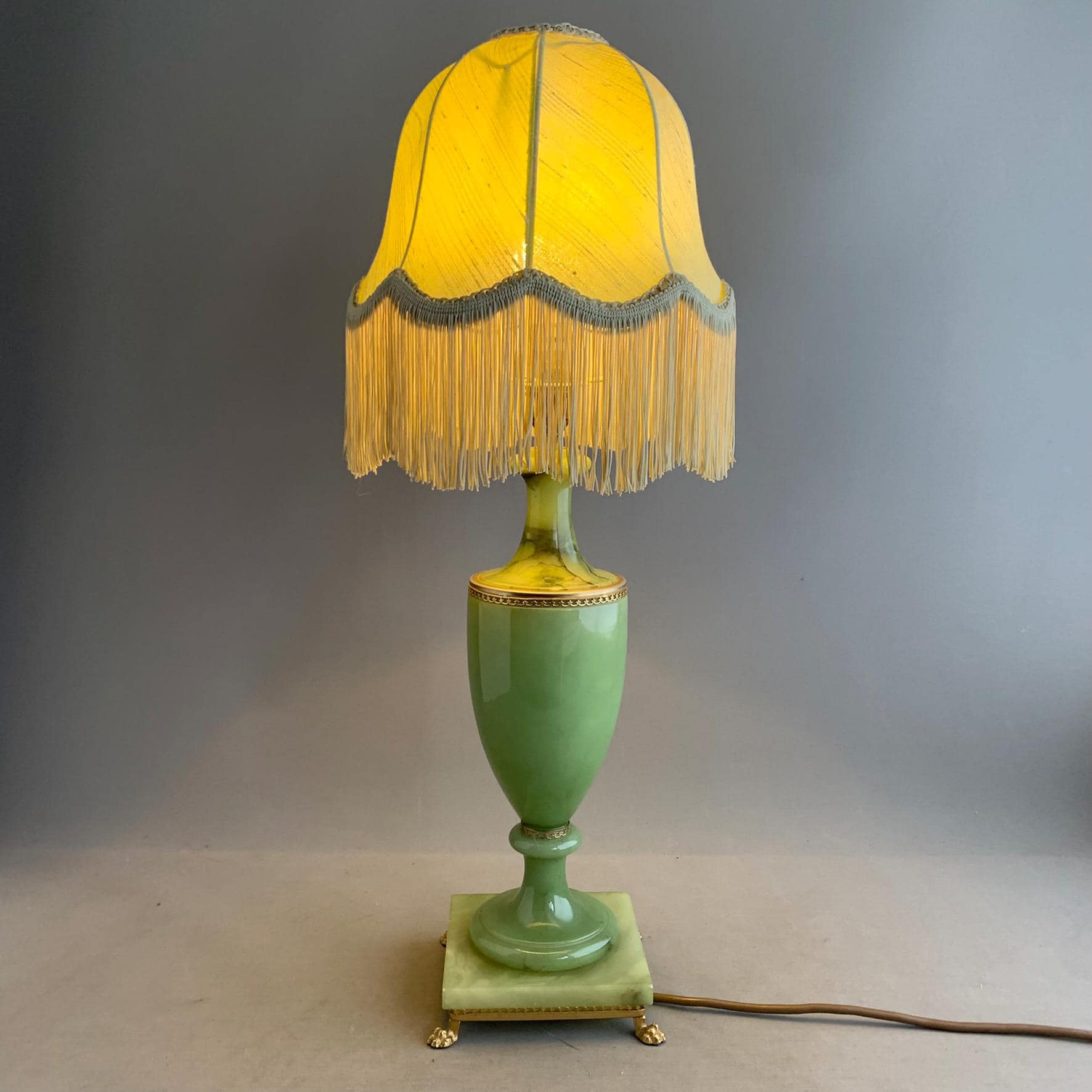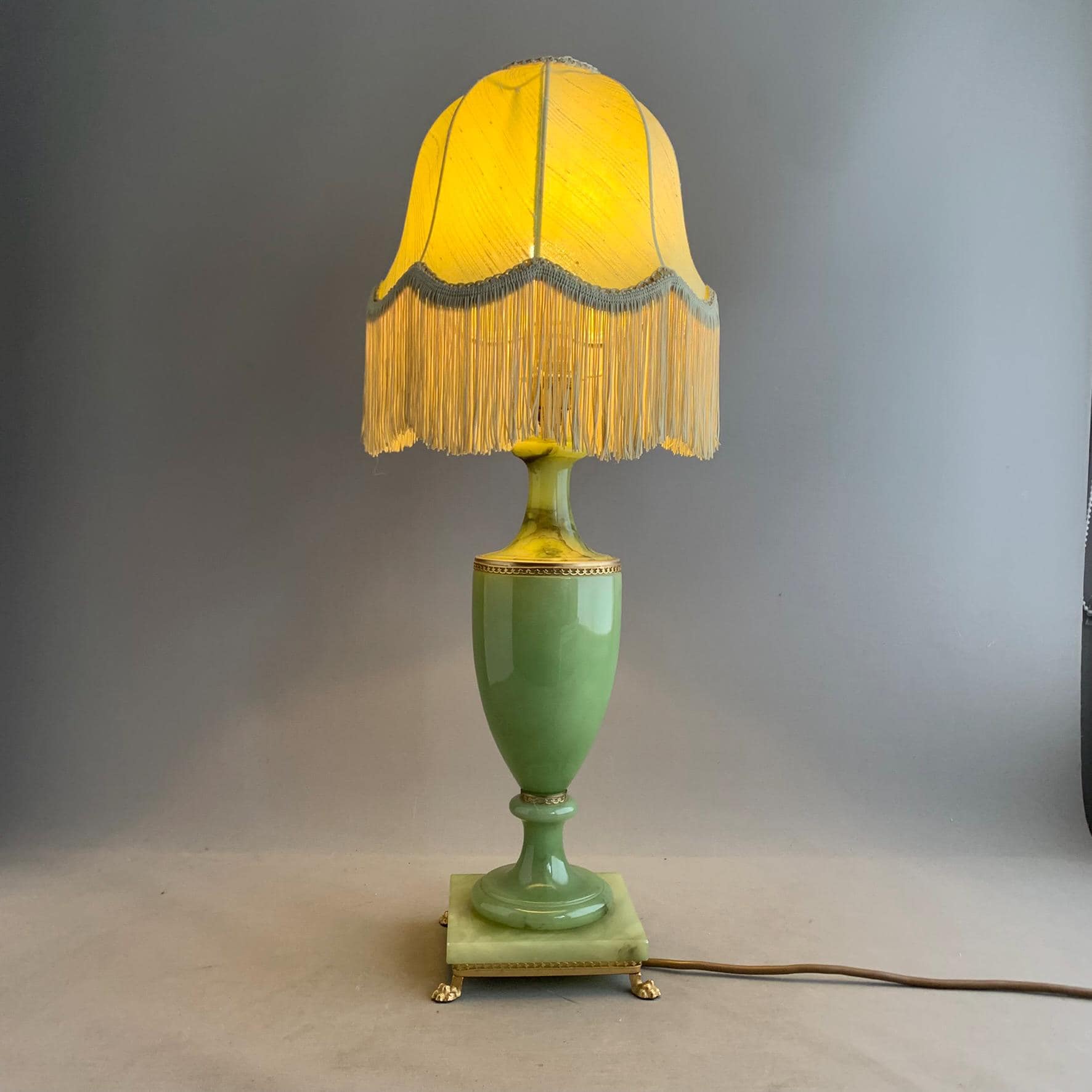 This 1950s solid Italian alabaster and brass table lamp is quite a show stopper. stood on little brass claw feet and shaped in the classic urn shape. Paired with the original tasseled lamp shade or if you prefer a contemporary raw linen drum shade- quite different looks but both fabulous . The stone has a green coating that has worn away on the corners of the base ( see photo) . Underneath is the original makers sticker- made in Italy Genuine Alabaster.