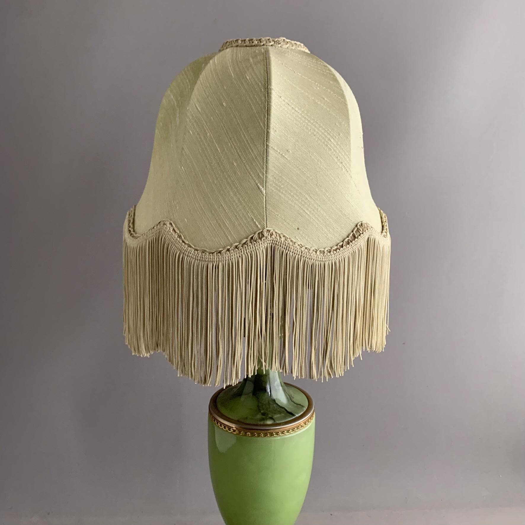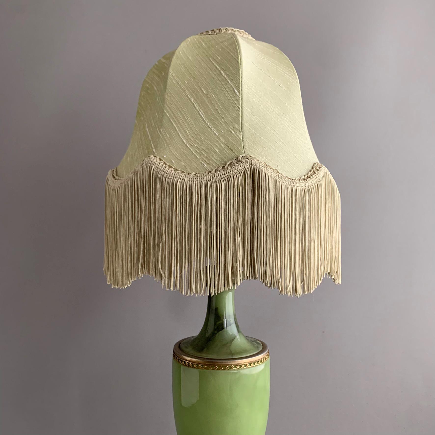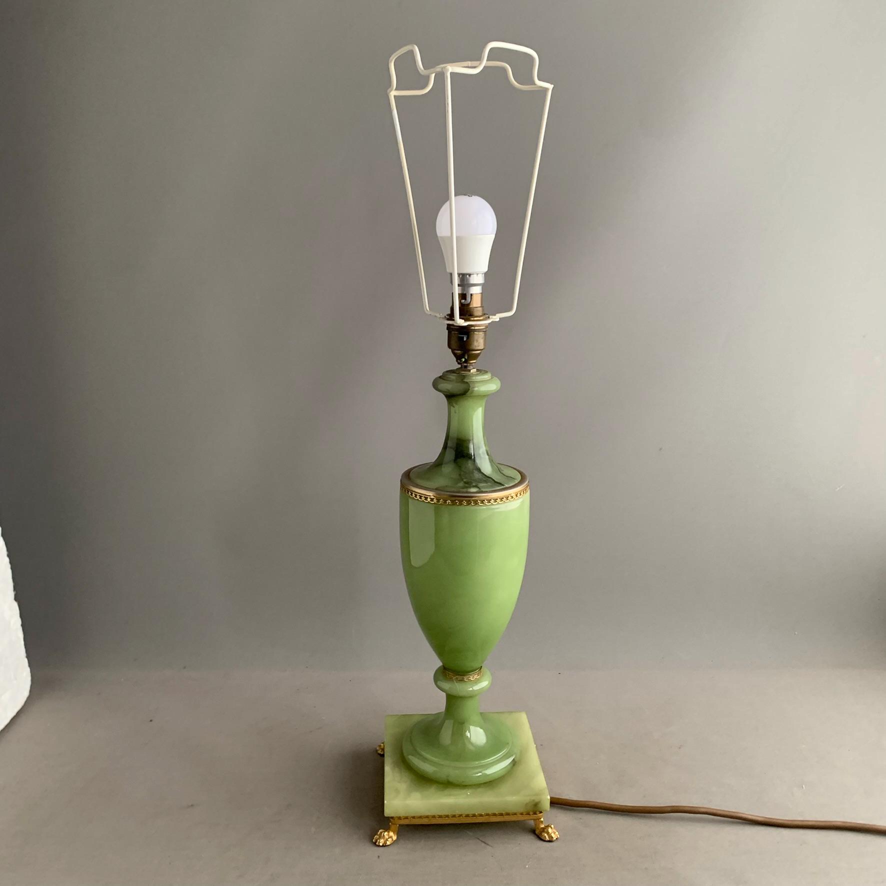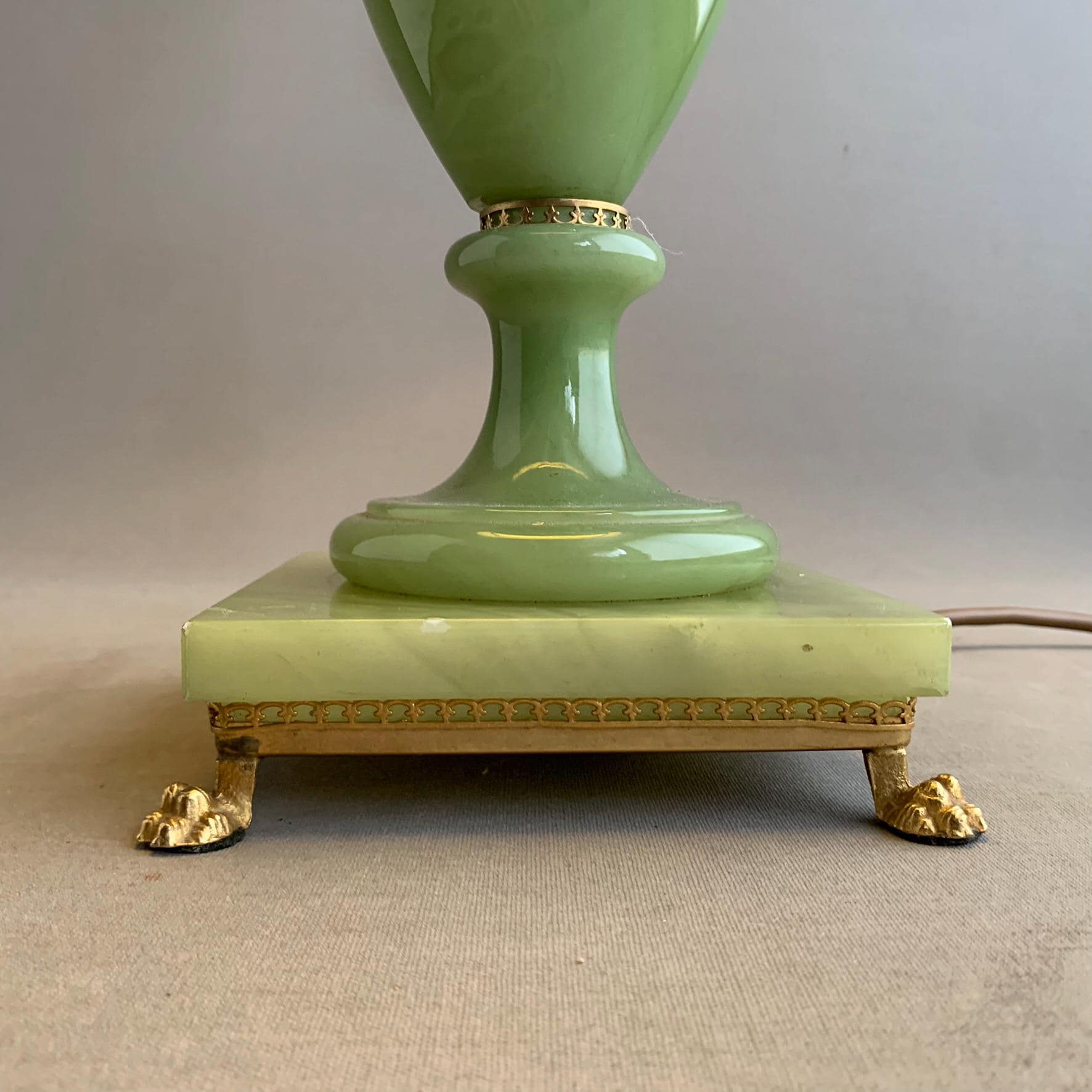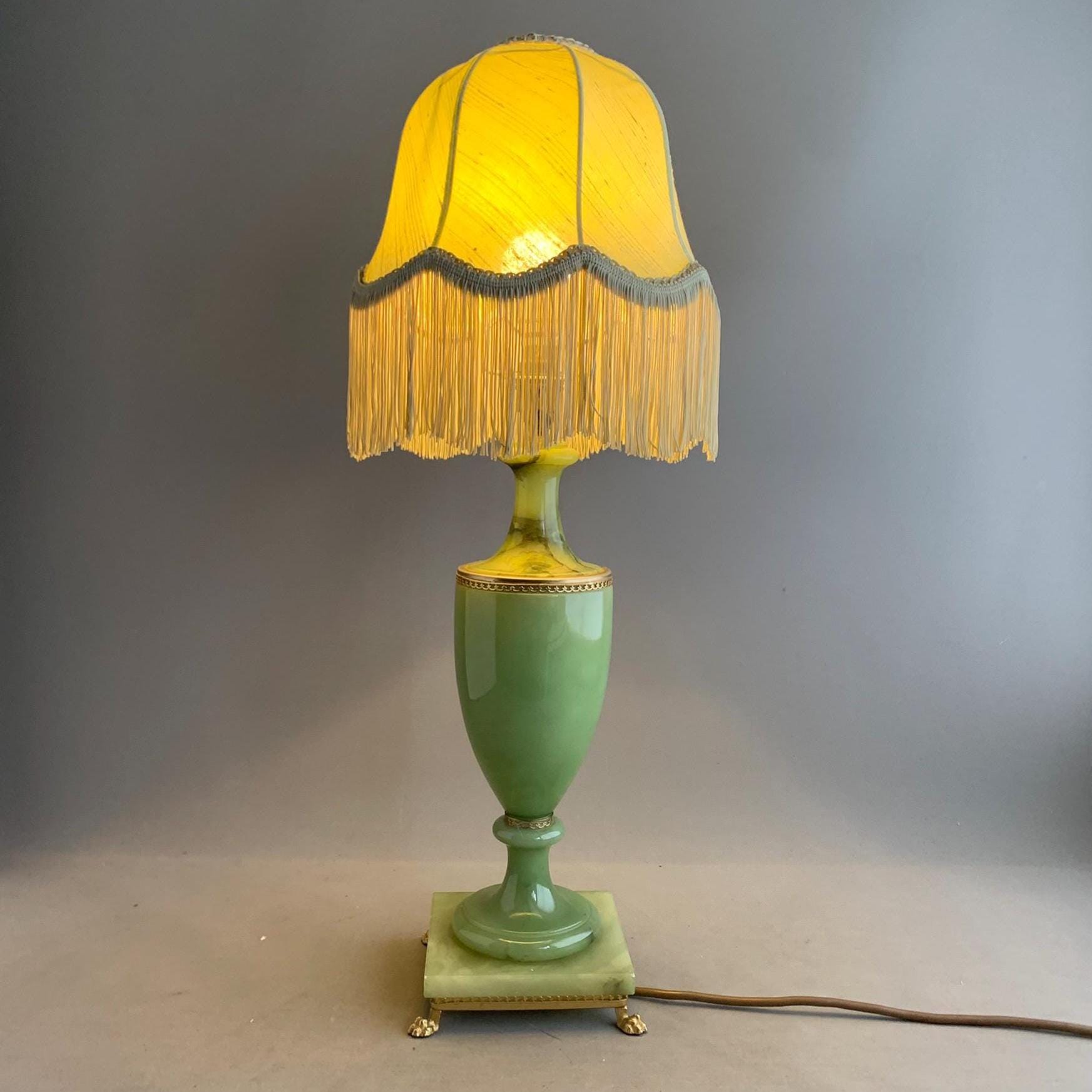 This 1950s solid Italian alabaster and brass table lamp is quite a show stopper. stood on little brass claw feet and shaped in the classic urn shape. Paired with the original tasseled lamp shade or if you prefer a contemporary raw linen drum shade- quite different looks but both fabulous . The stone has a green coating that has worn away on the corners of the base ( see photo) . Underneath is the original makers sticker- made in Italy Genuine Alabaster.