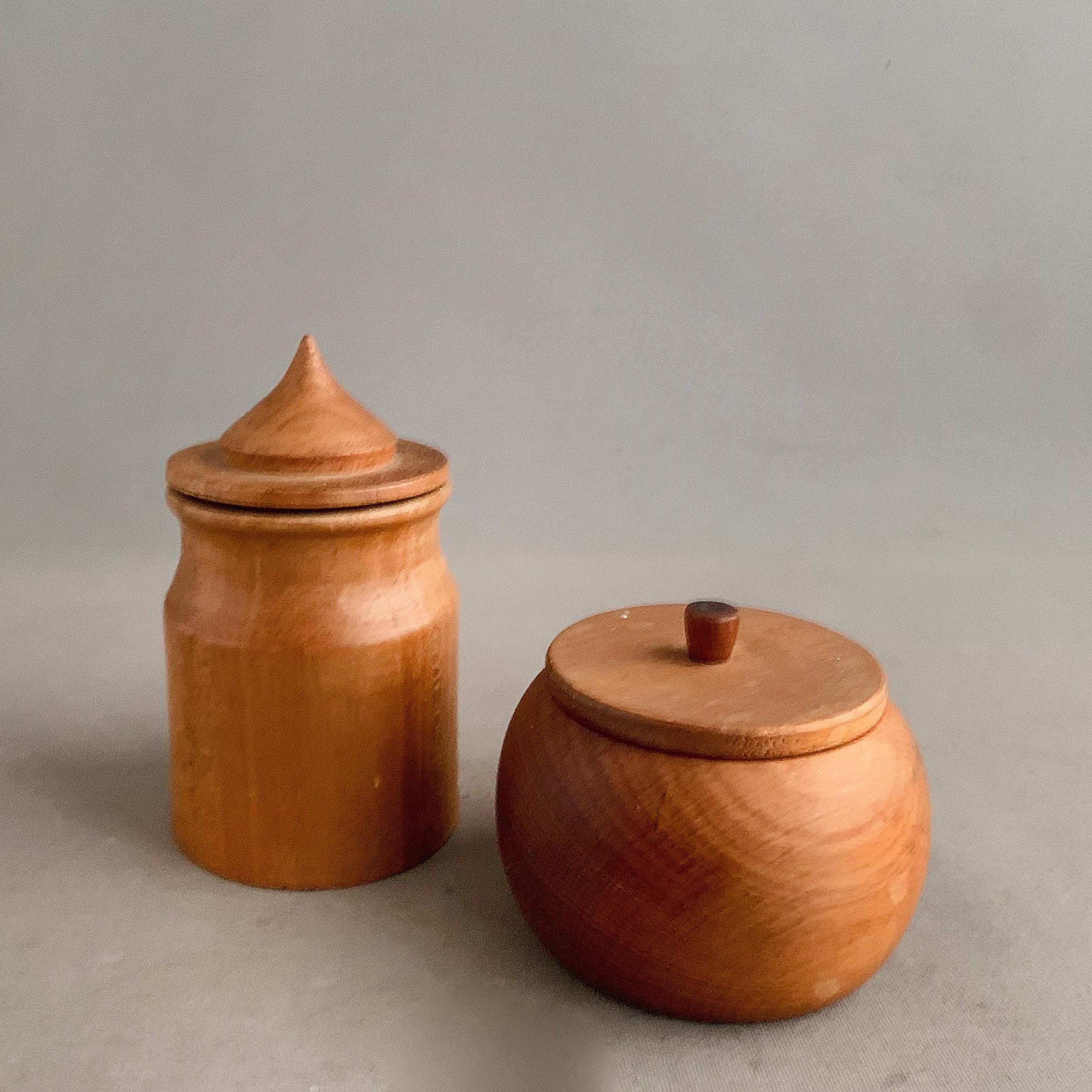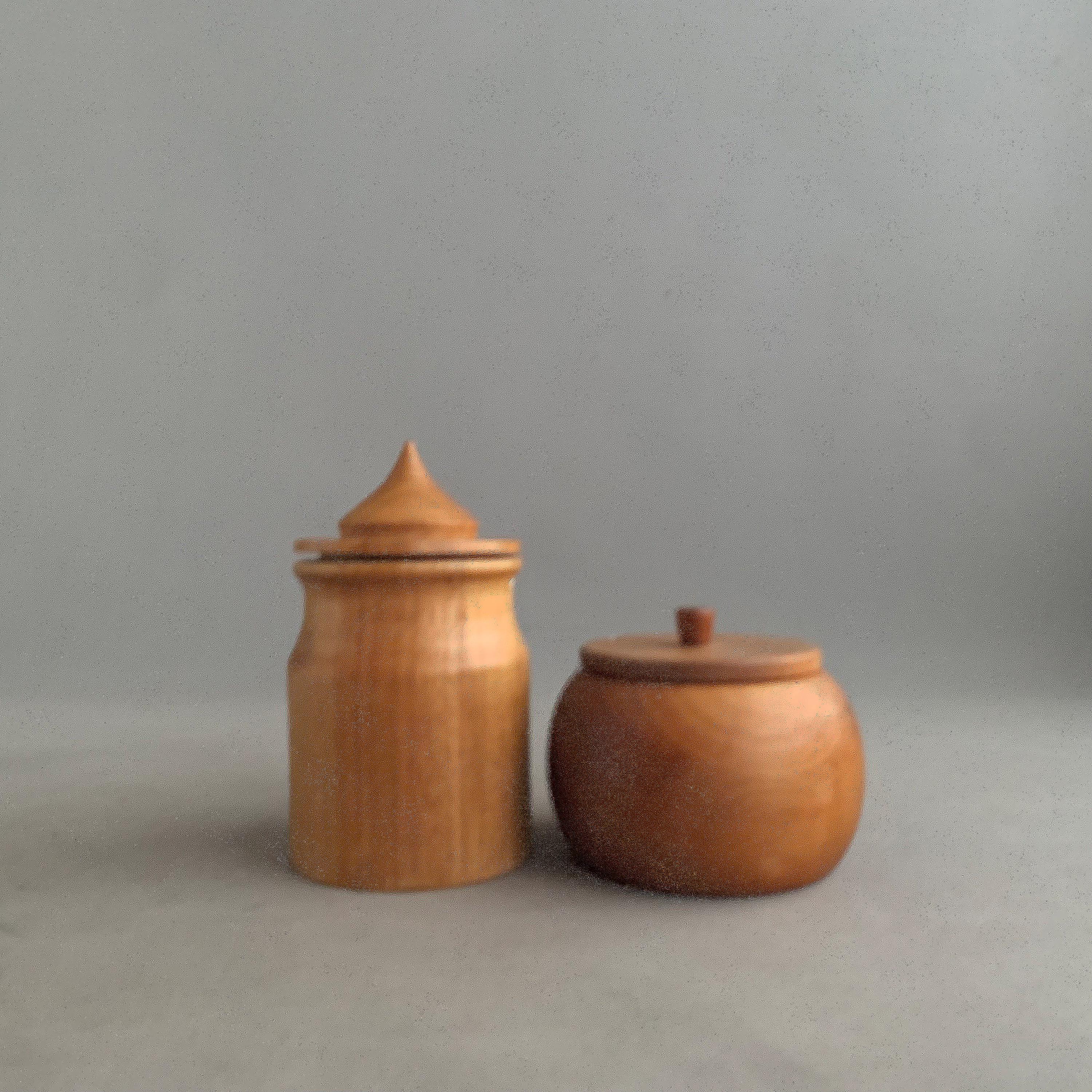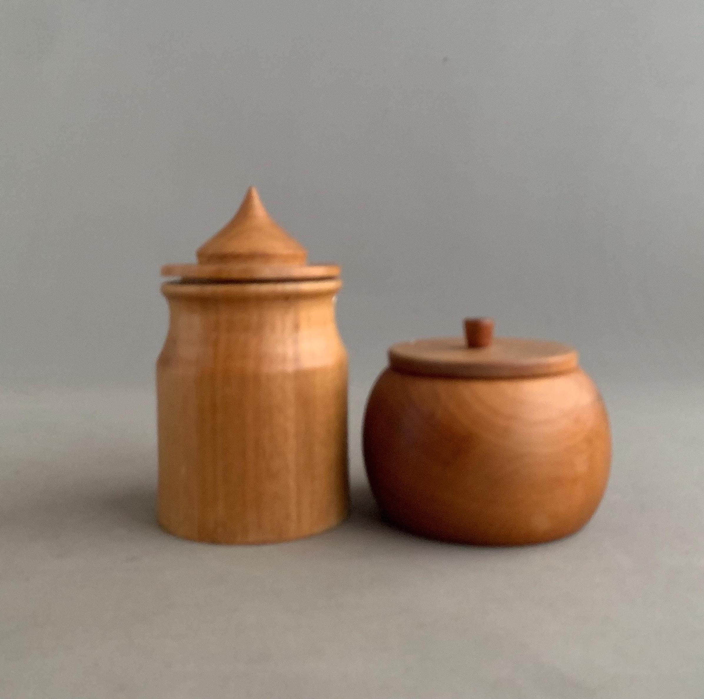 Made from solid wood hand-turned on a lathe, a process that creates the smooth, symmetrical curves and fitting lids