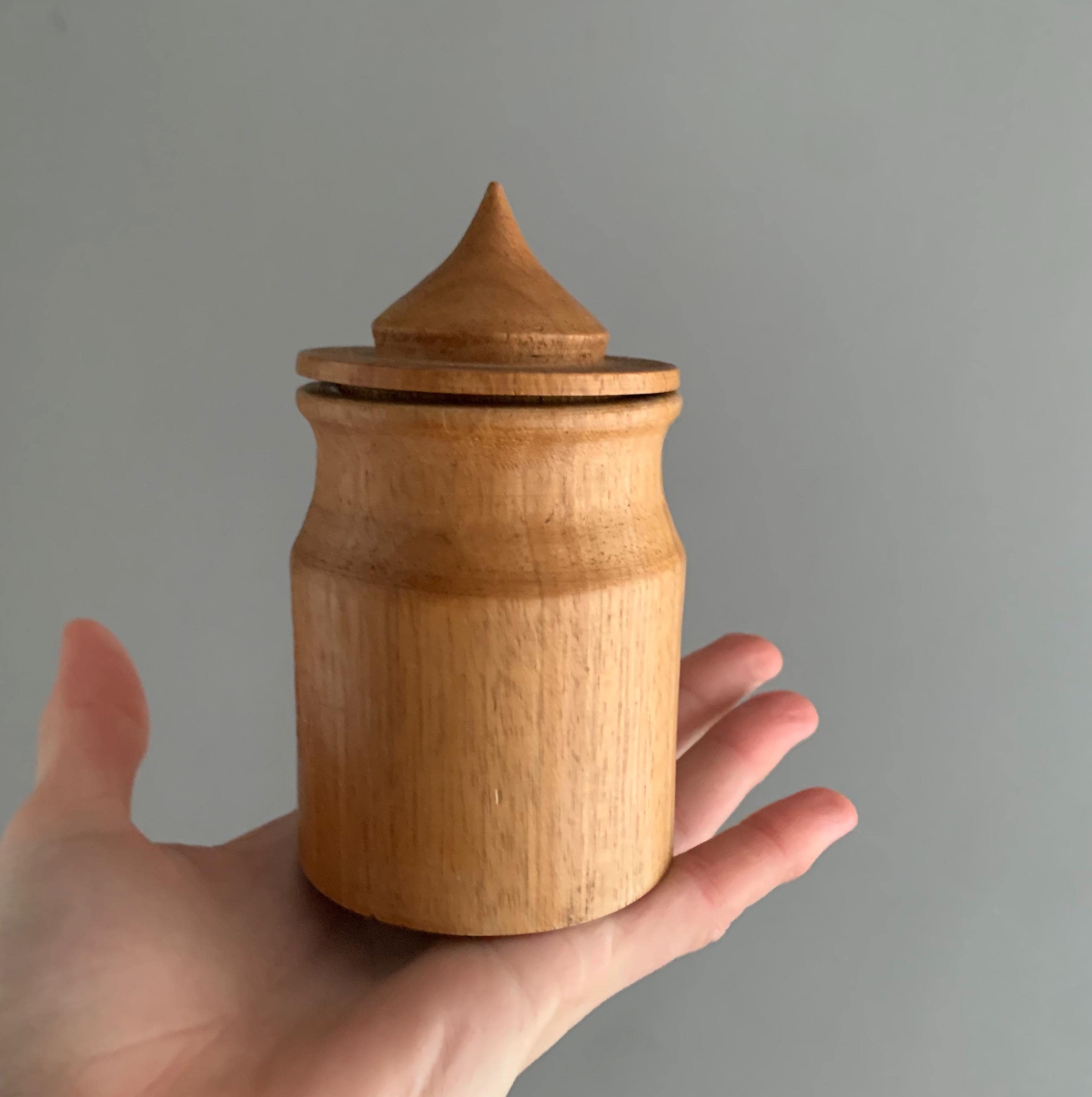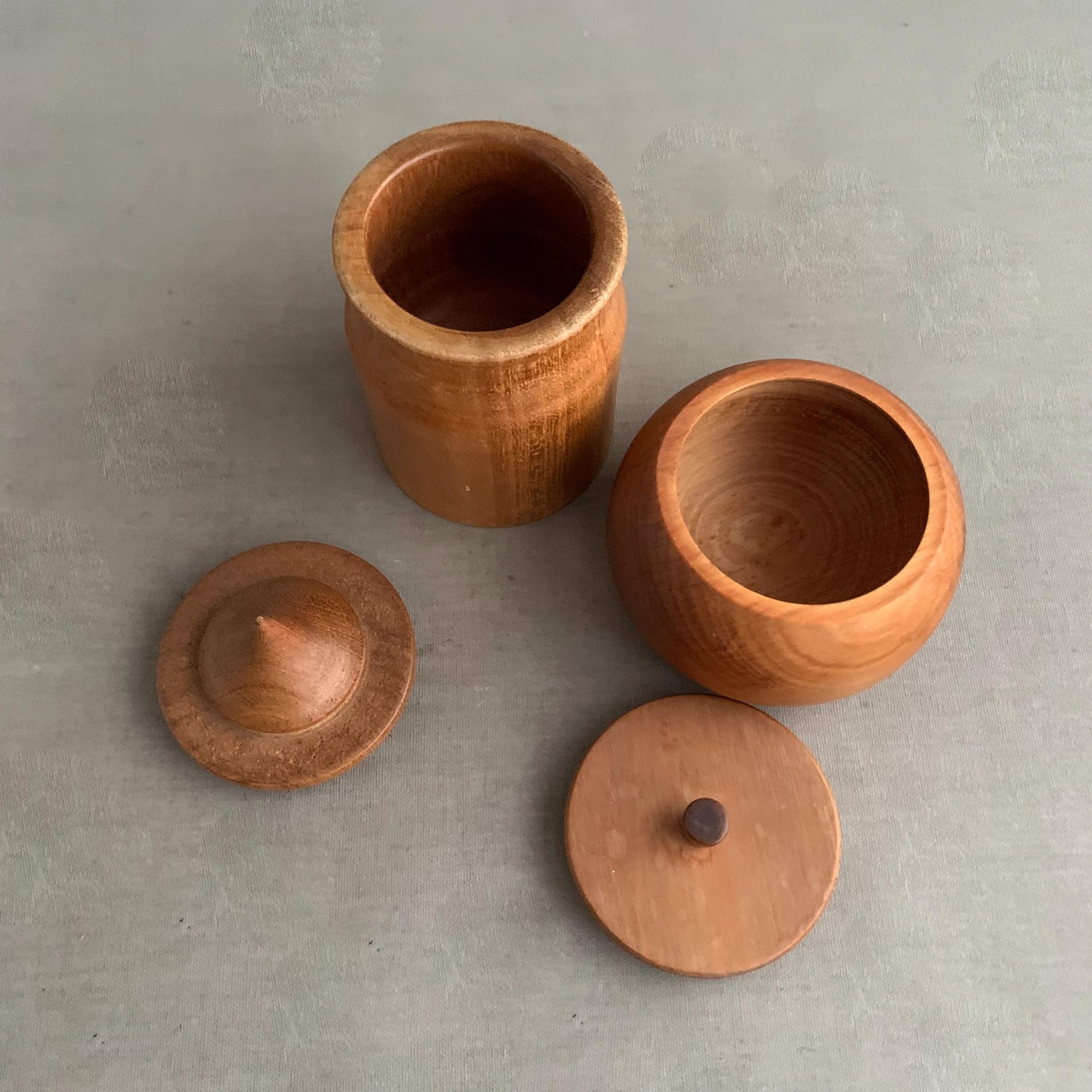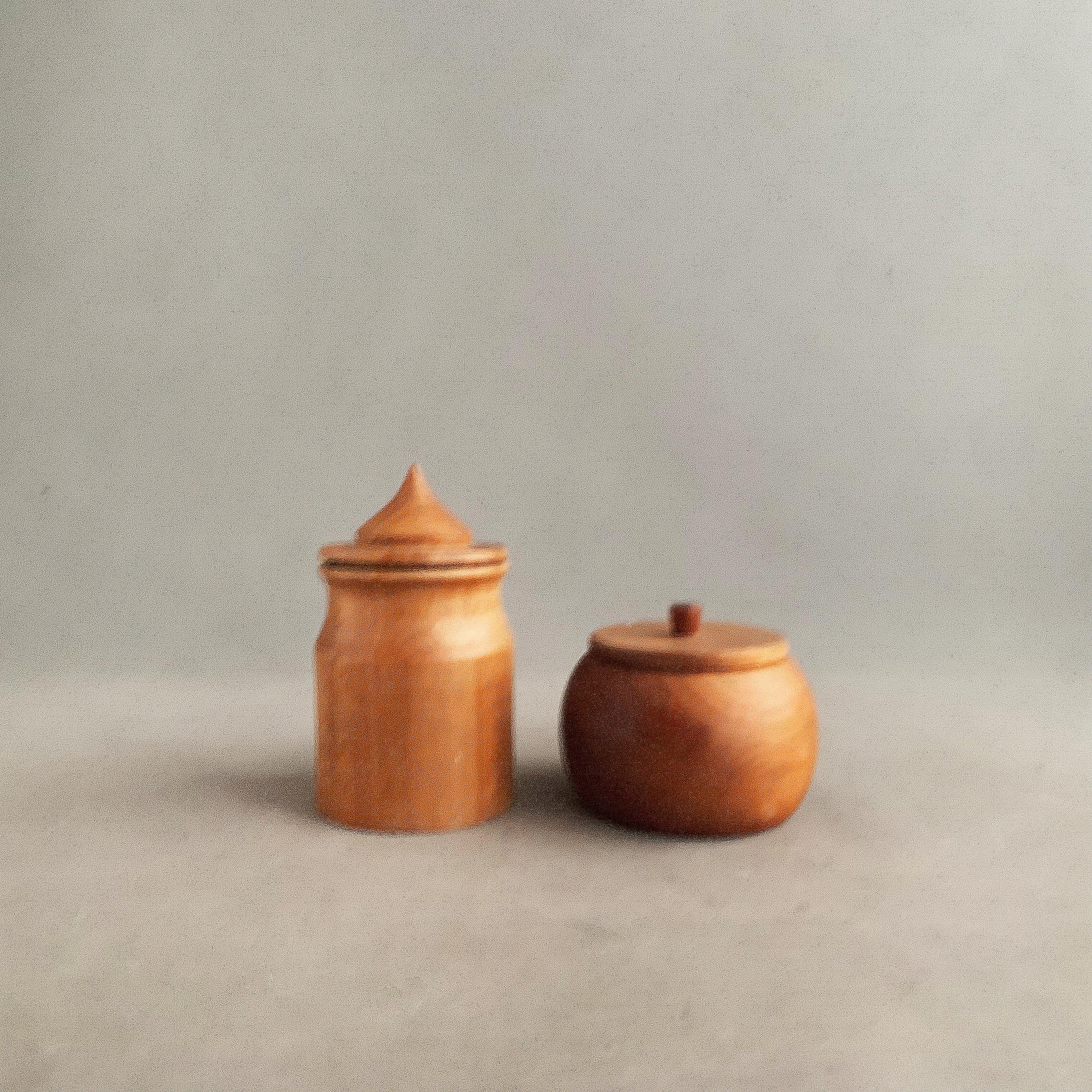 Made from solid wood hand-turned on a lathe, a process that creates the smooth, symmetrical curves and fitting lids