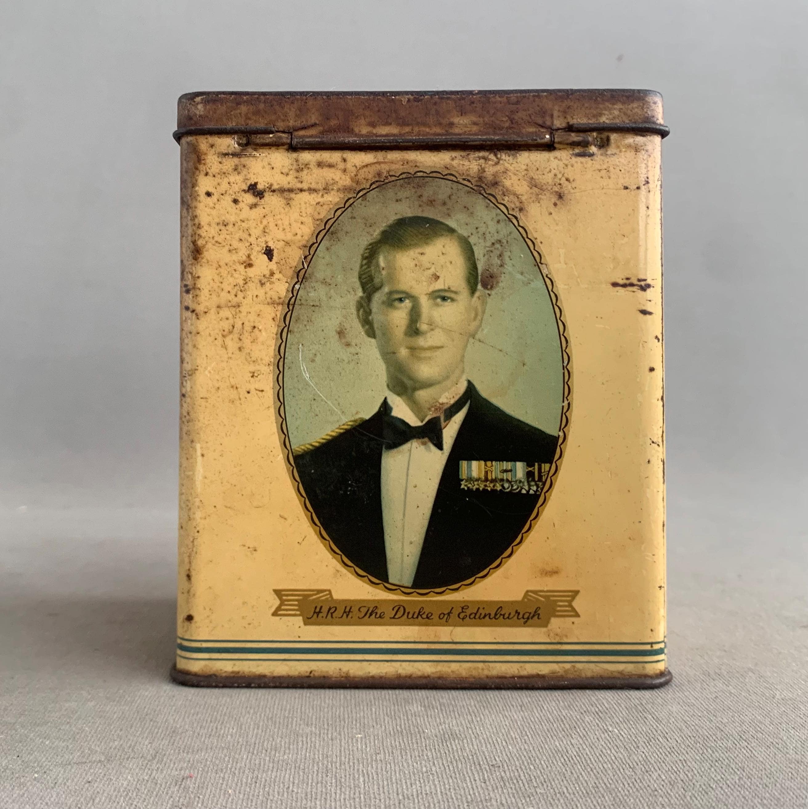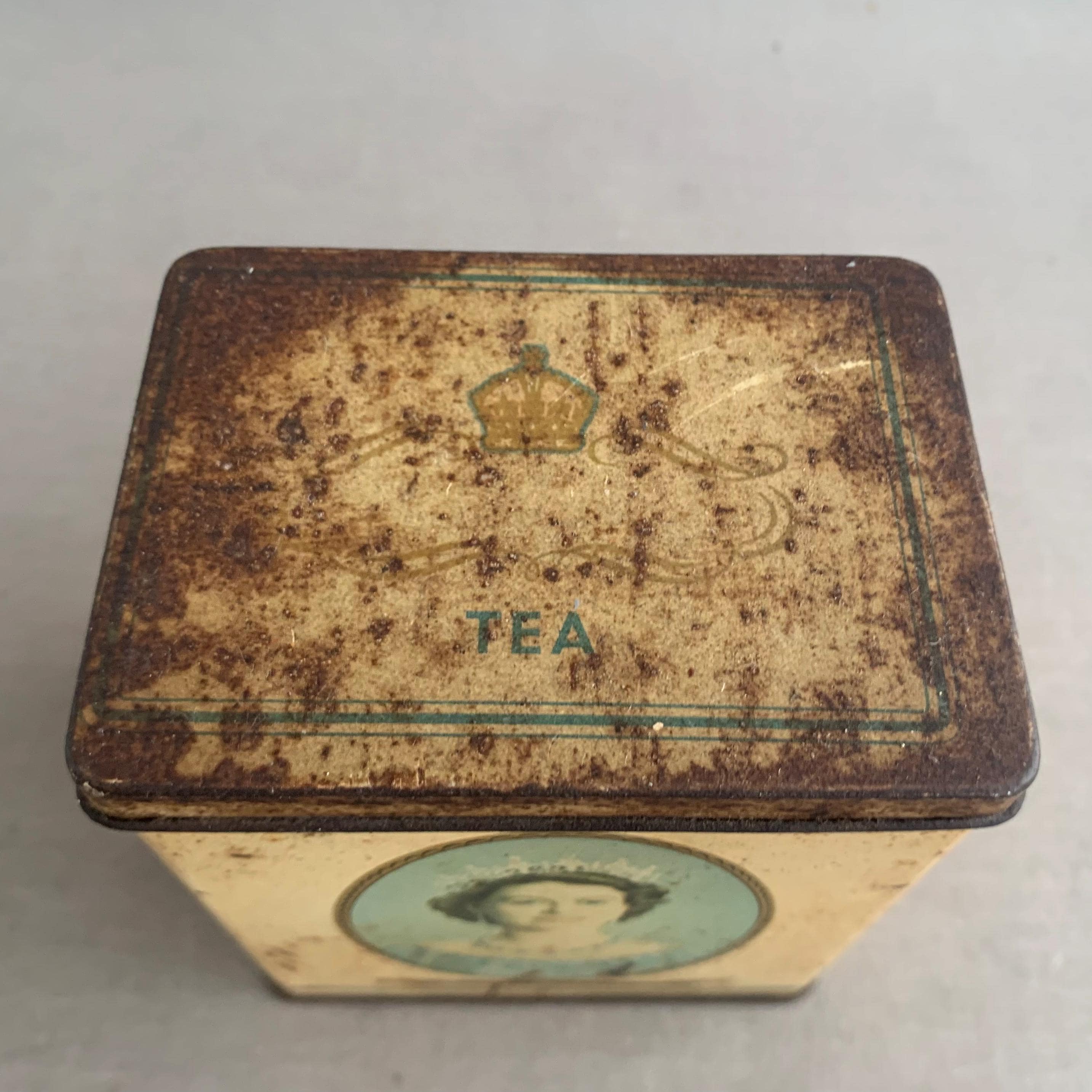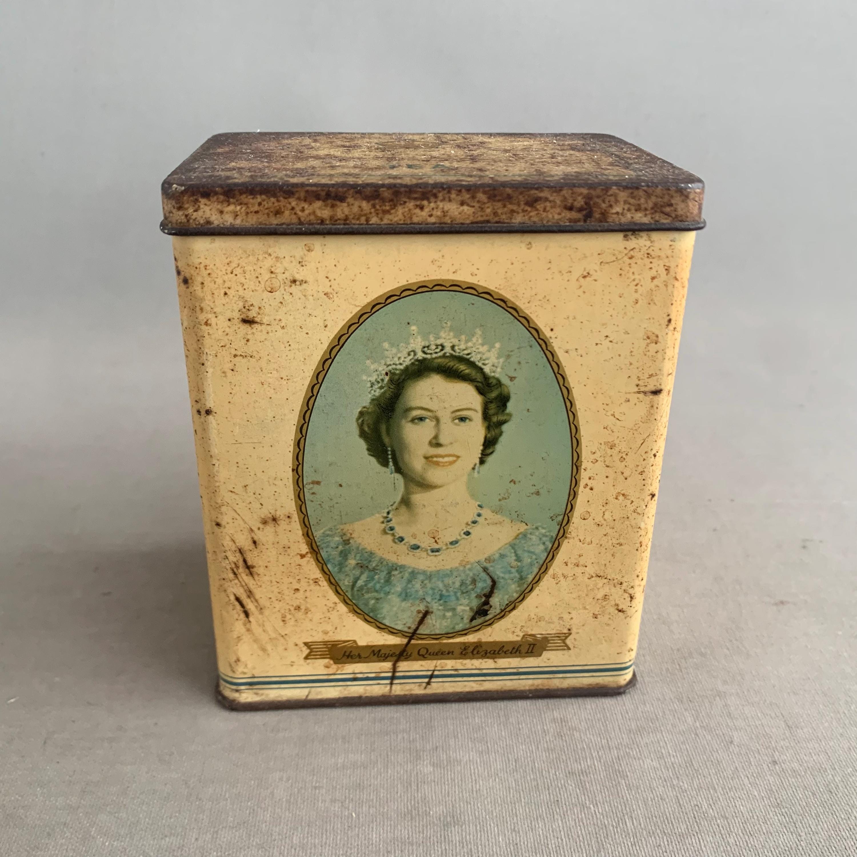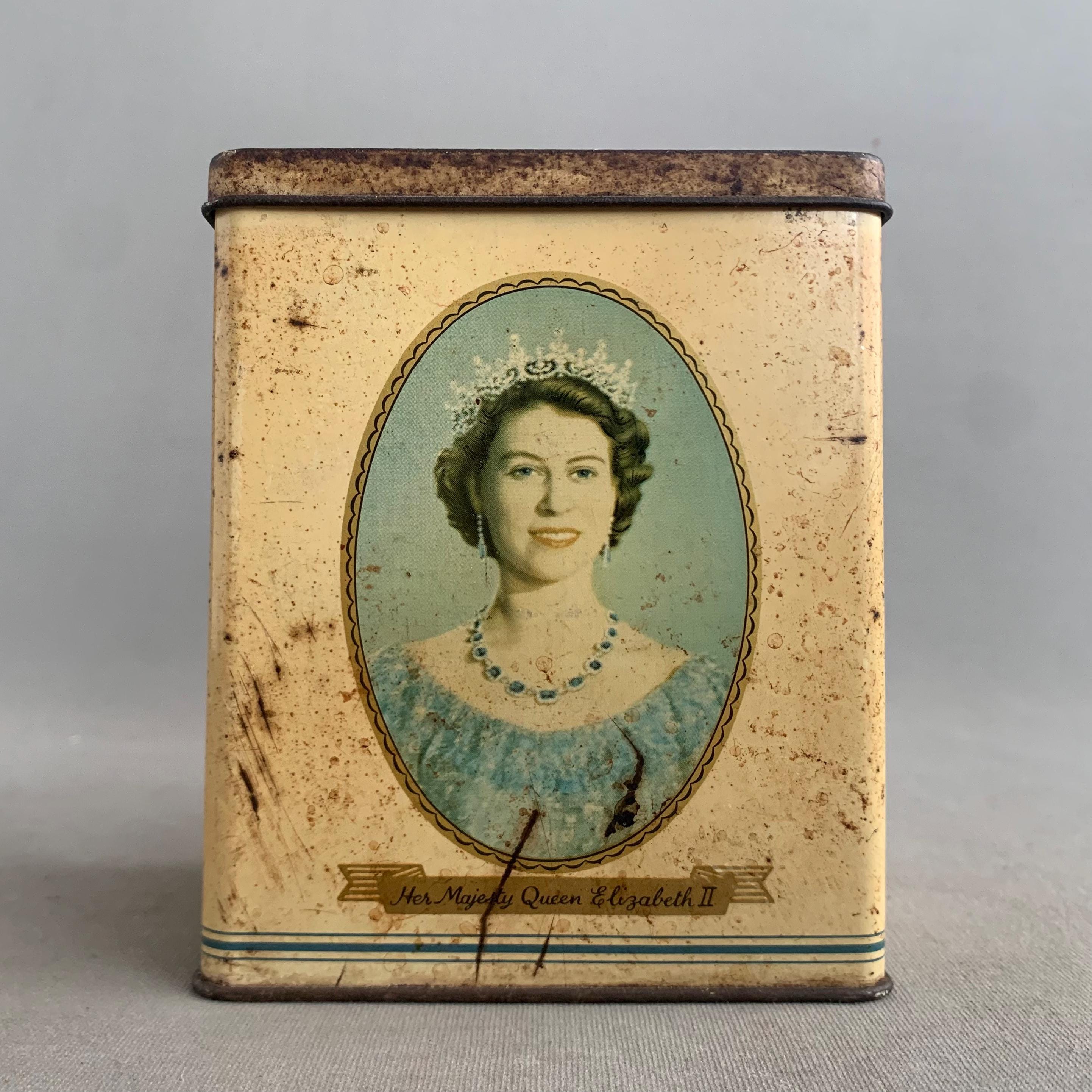 The Barber's Teas Coronation of Queen Elizabeth II Caddy Commemorative Tea Caddy is a vintage tin manufactured in England by Barber's Tea's to commemorate the coronation of Queen Elizabeth II in 1952. This collectable piece is themed around royalty and is a nostalgic piece of historical memorabilia from the UK Royalty. The tea caddy bears the iconic image of Queen Elizabeth II and is a unique and sought-after item for collectors interested in British history and royal celebrations. It has aged in a charming way with rust and scuffs , priced accordingly