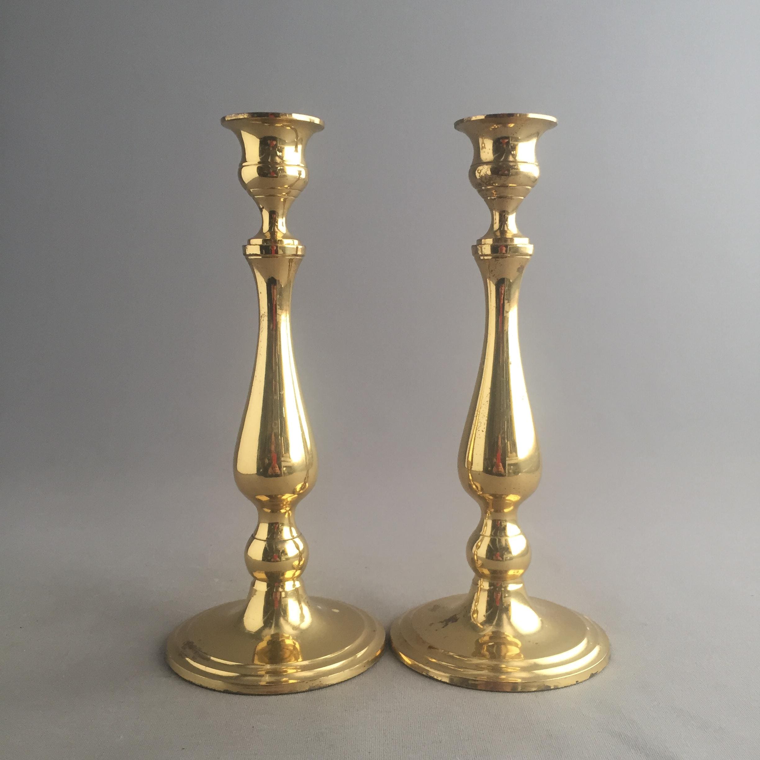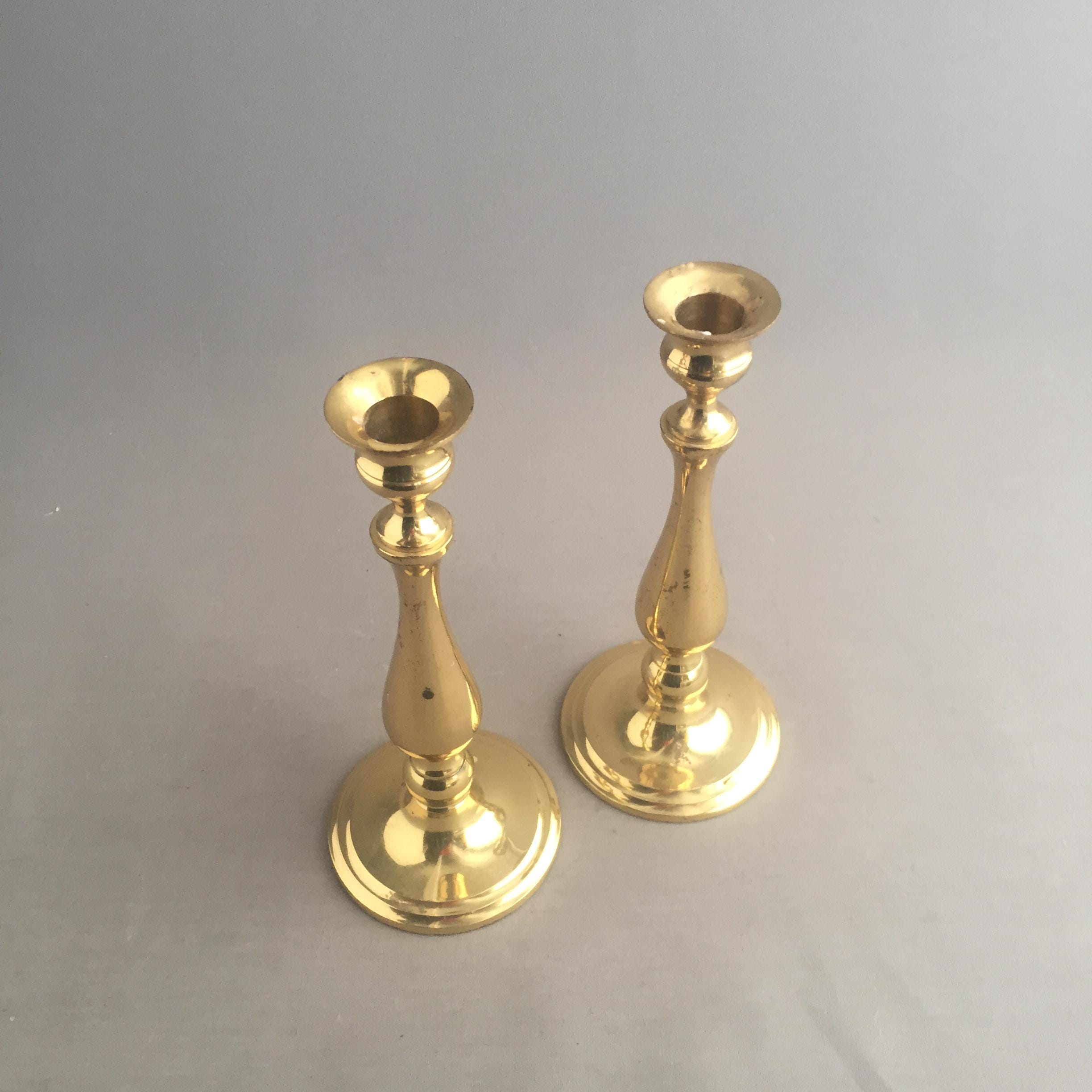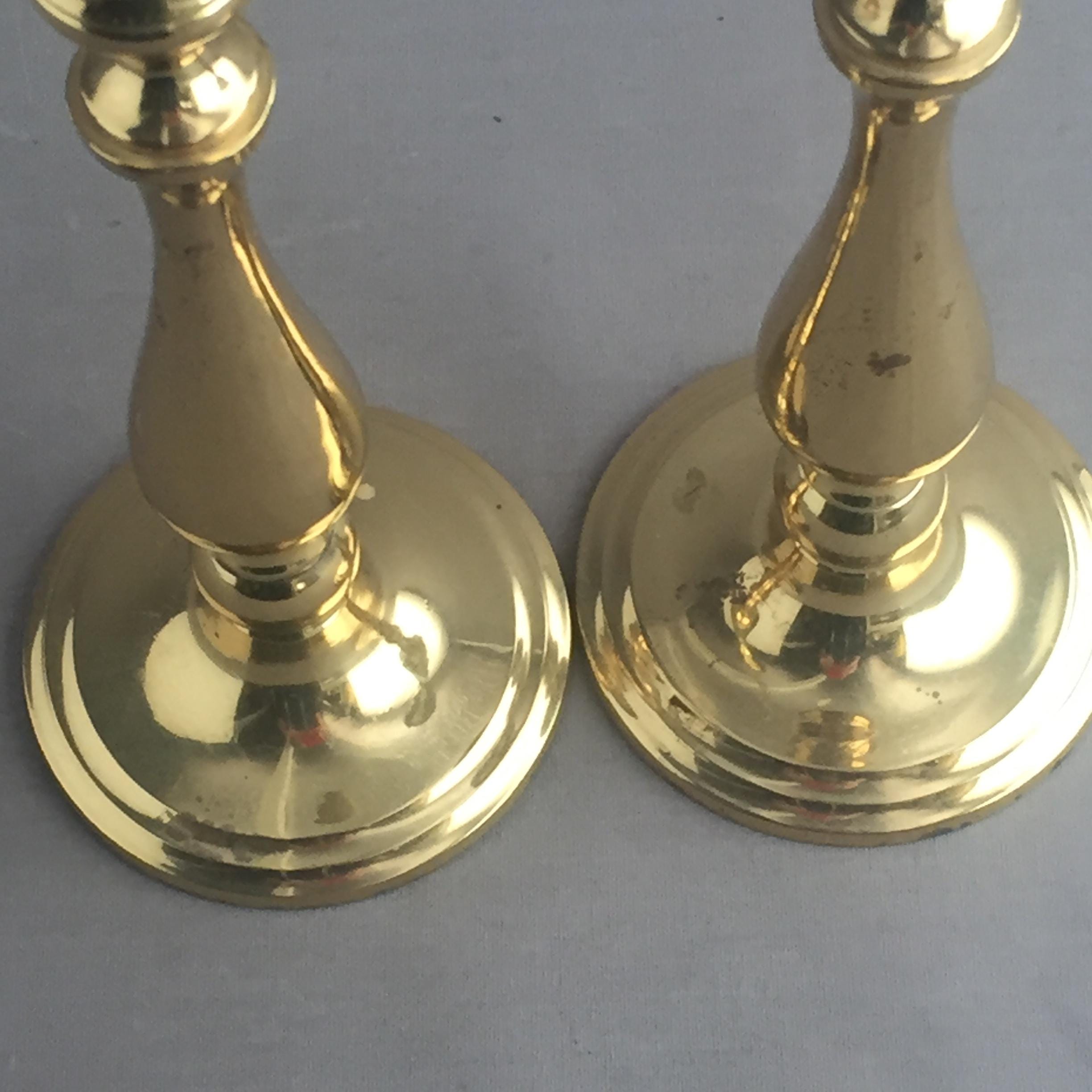 A lovely pair of antique Victorian brass candlesticks features shapely baluster columns rising from round bases.