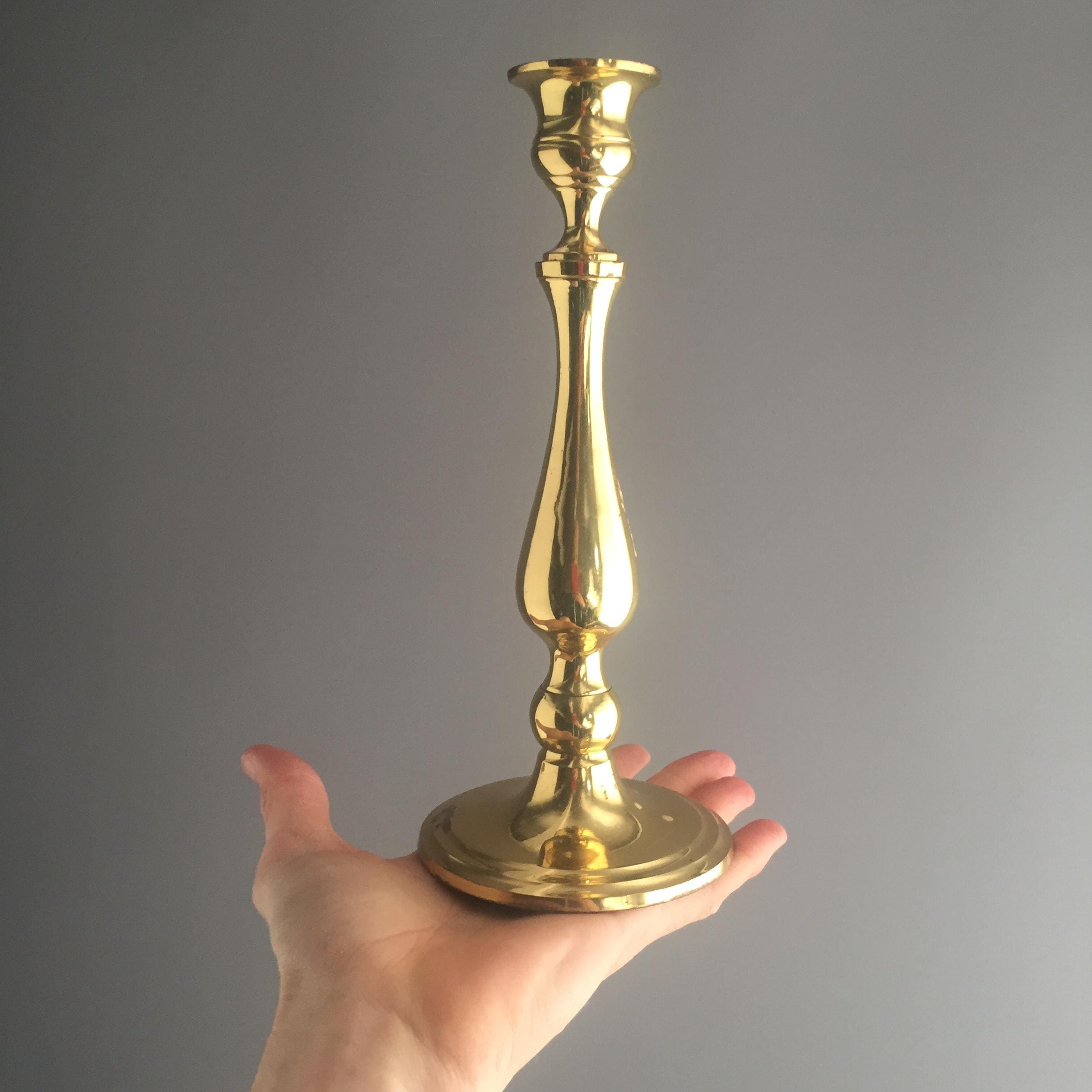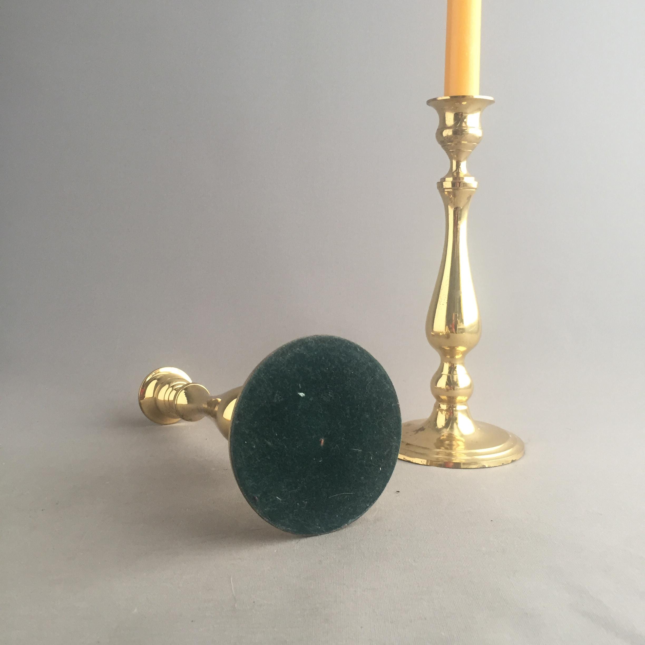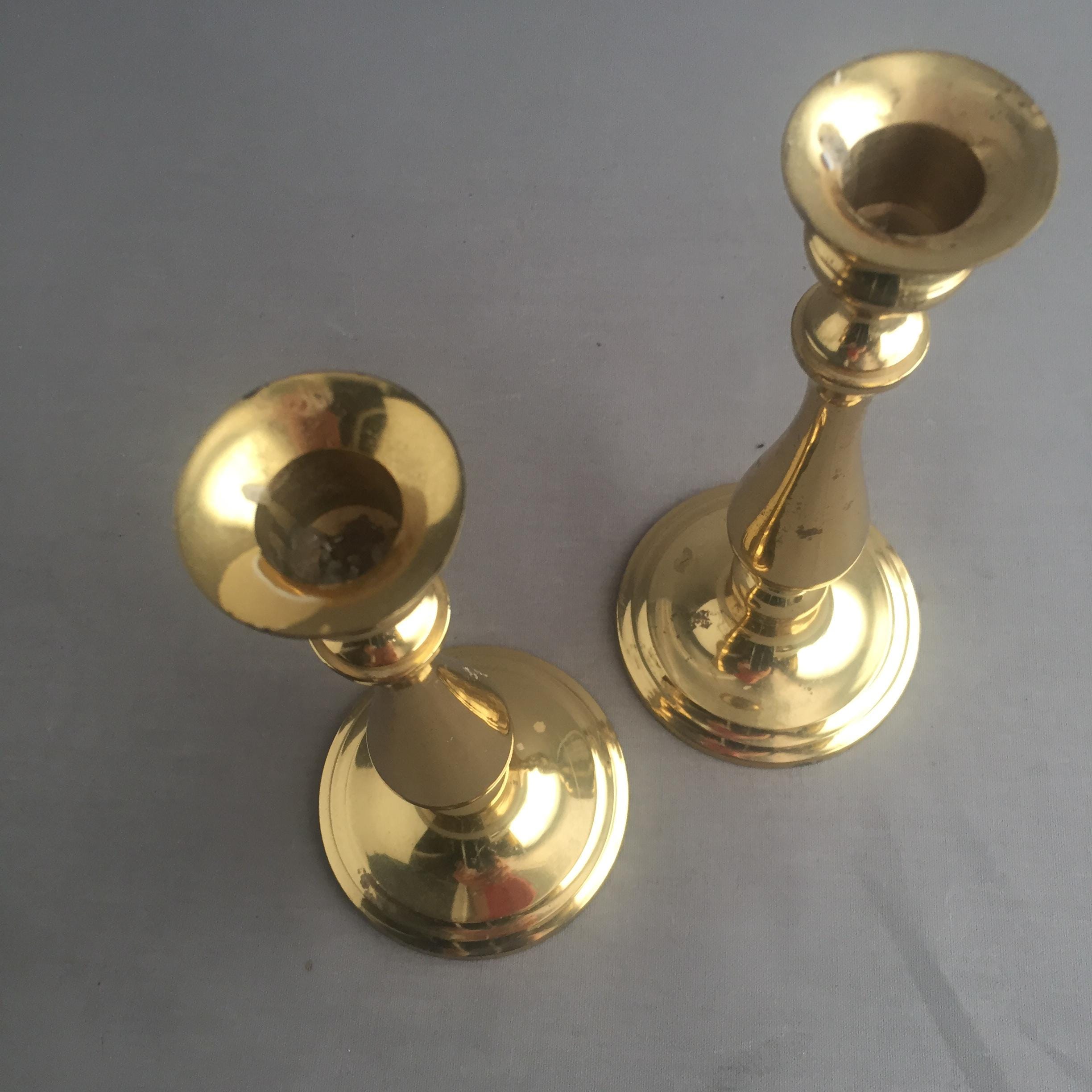 A lovely pair of antique Victorian brass candlesticks features shapely baluster columns rising from round bases.