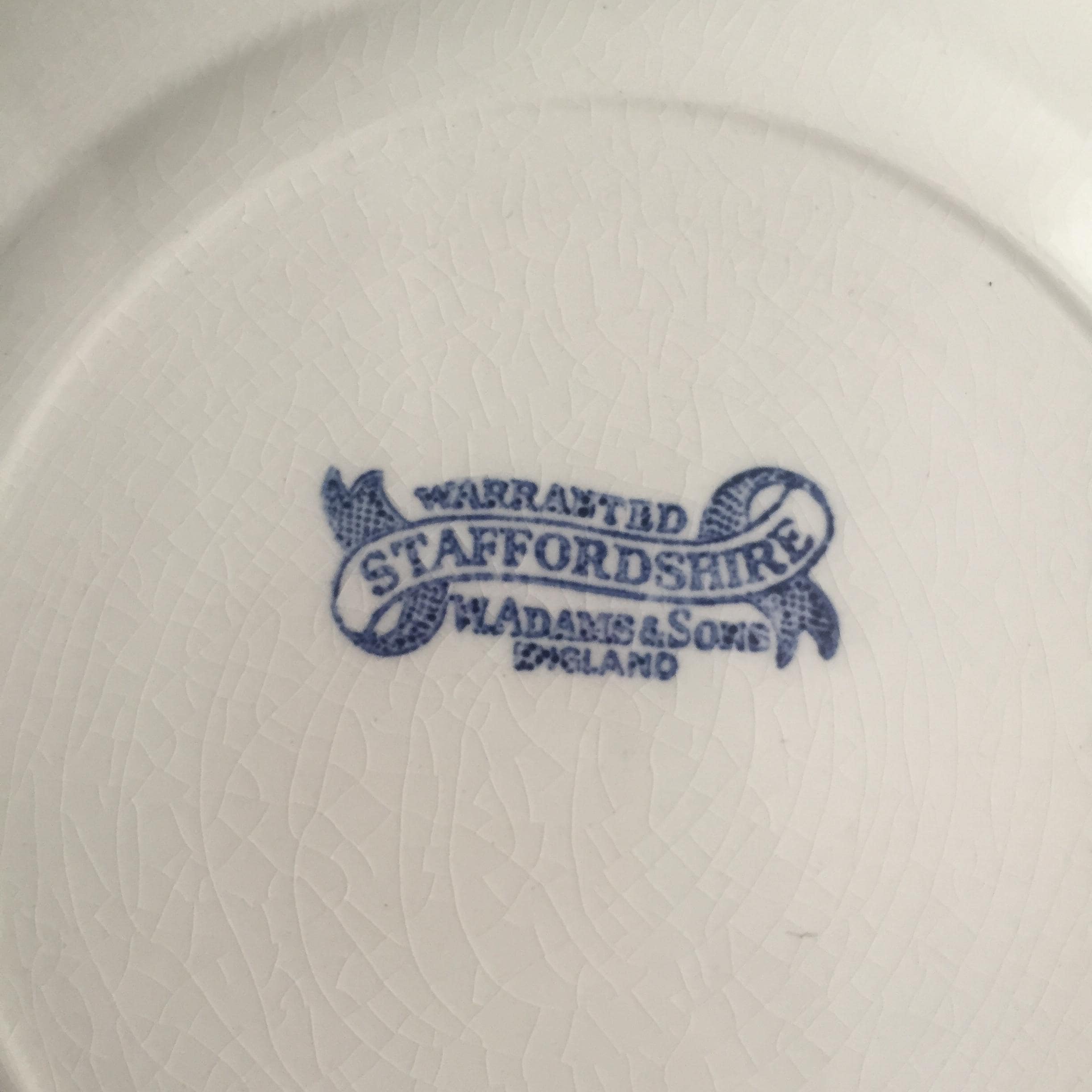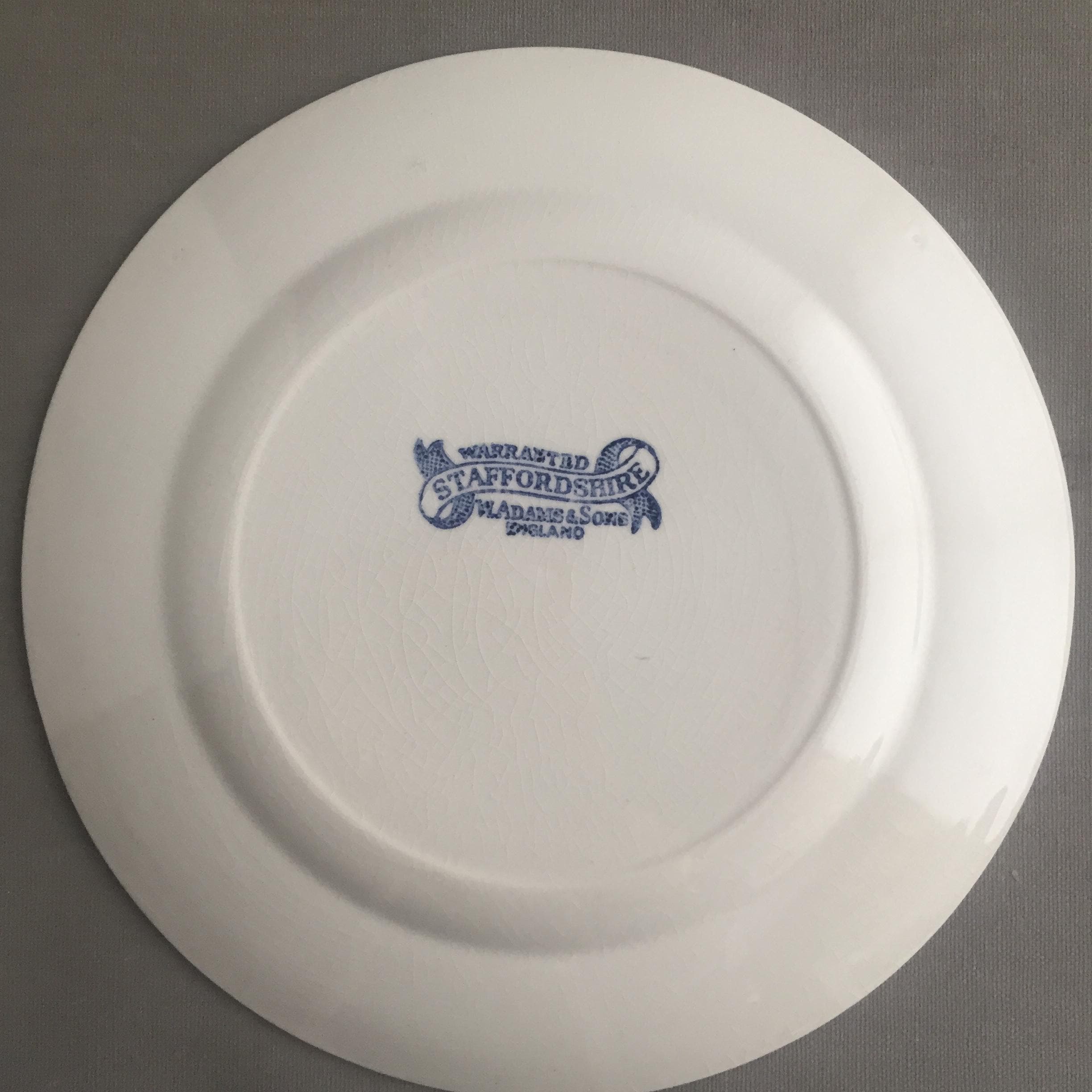 Features: The back stamp reads "WARRANTED STAFFORDSHIRE W. ADAMS & SONS ENGLAND" and is often accompanied by crazing in the glaze. The backstamp includes the word "England," which indicates it was produced after 1891 to comply with US trade laws. Most surviving examples featuring this specific banner-style backstamp date from the 1891 to early 1900s period.