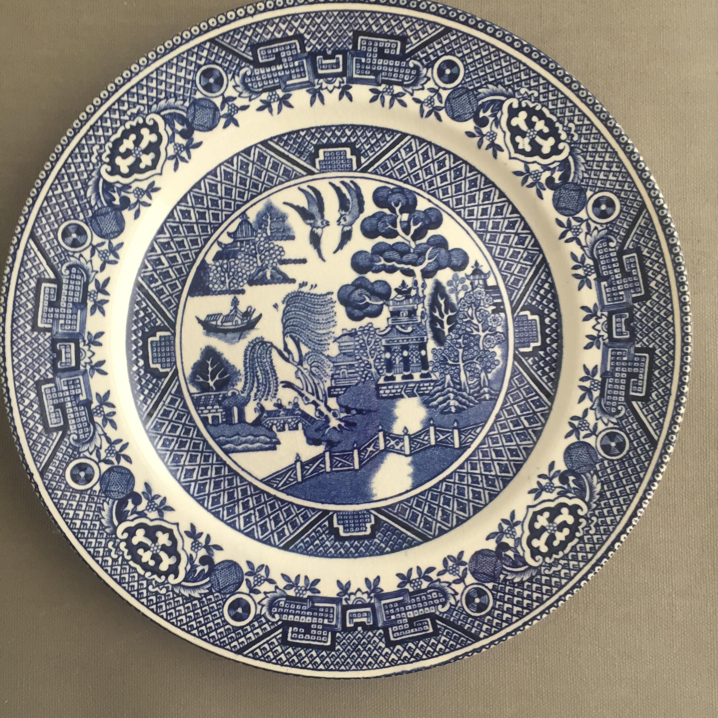 A classic example of Blue Willow transferware, sproduced by W. Adams & Sons of Staffordshire, England. The "Willow Pattern" is a famous chinoiserie design developed in late 18th-century England that traditionally depicts a story involving a pagoda, two birds, a bridge with three figures, and a weeping willow tree.