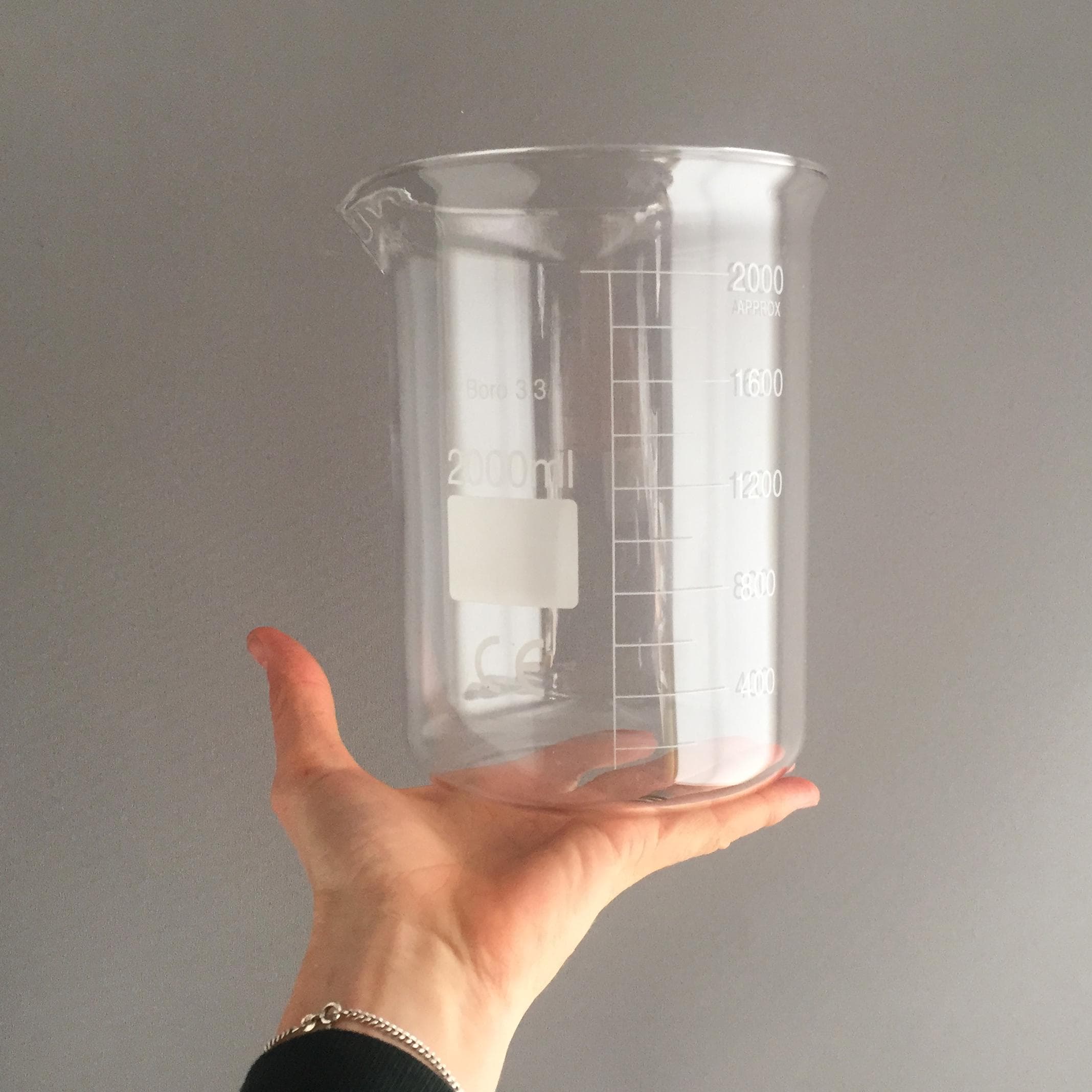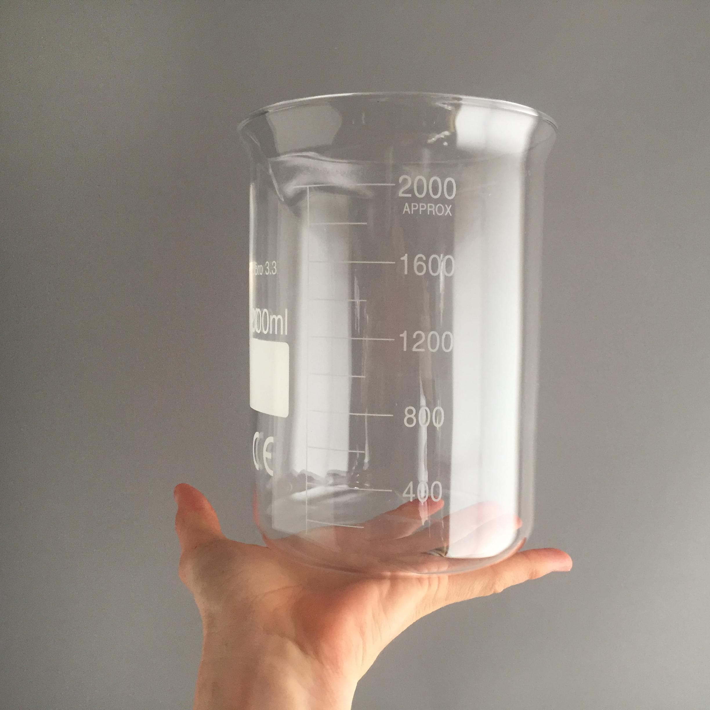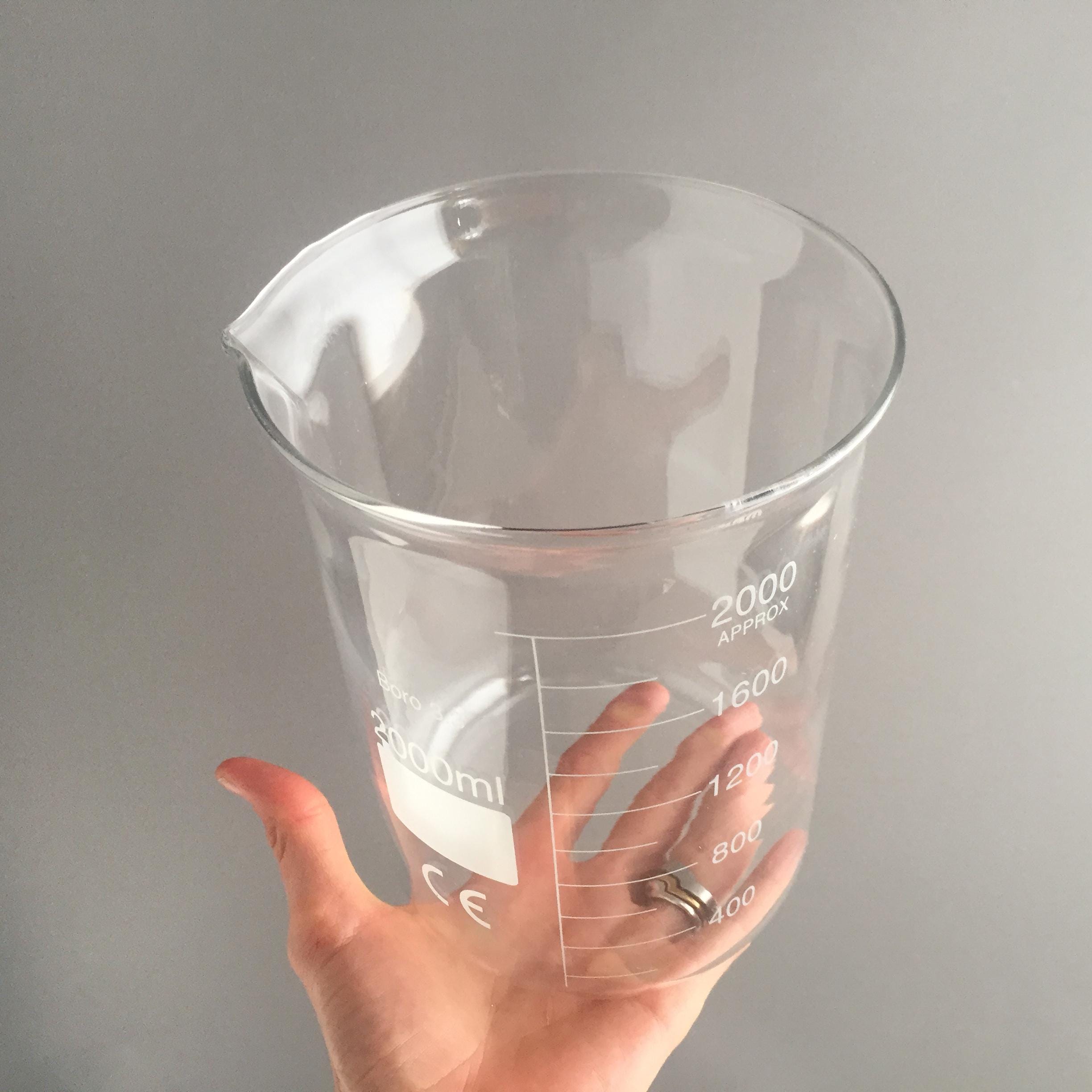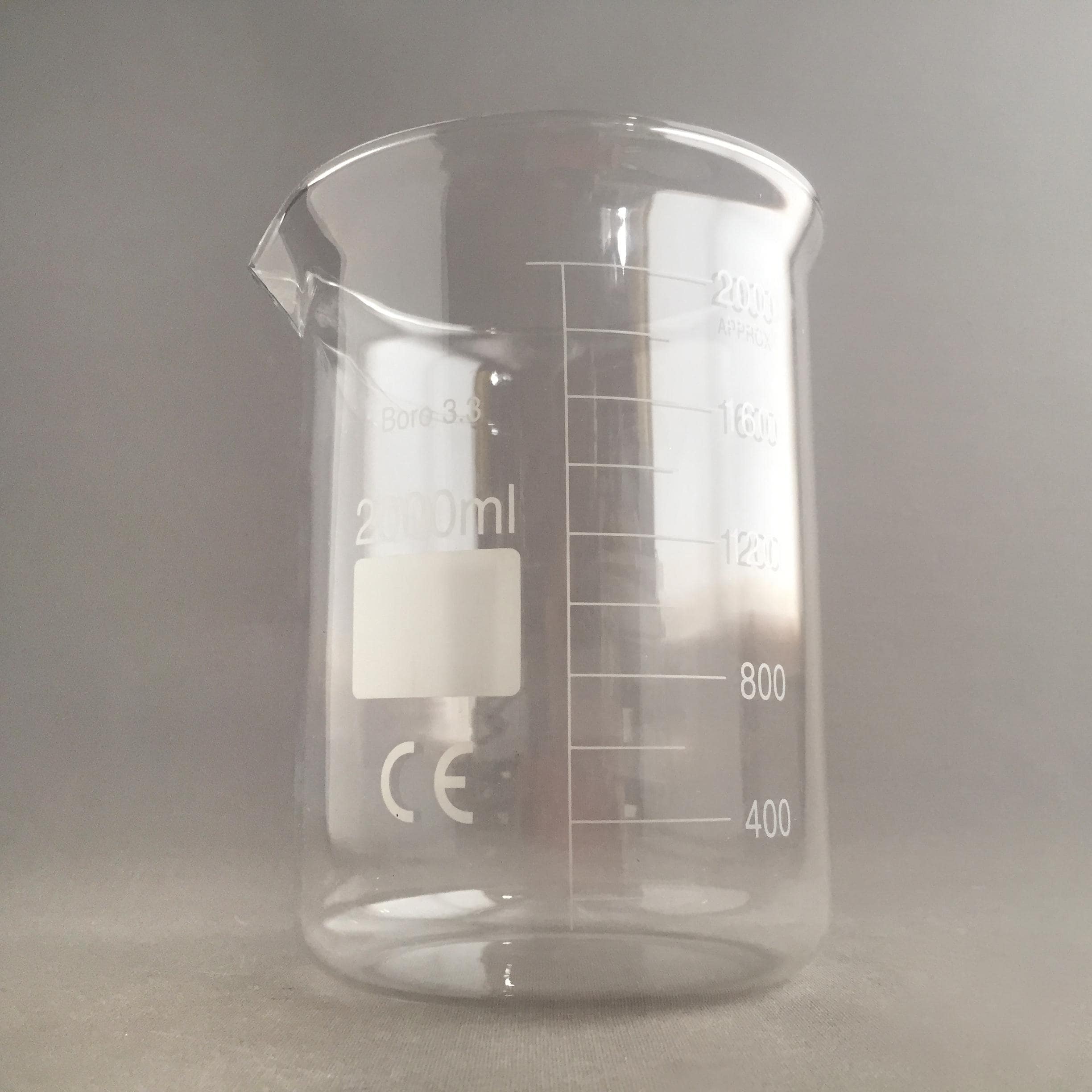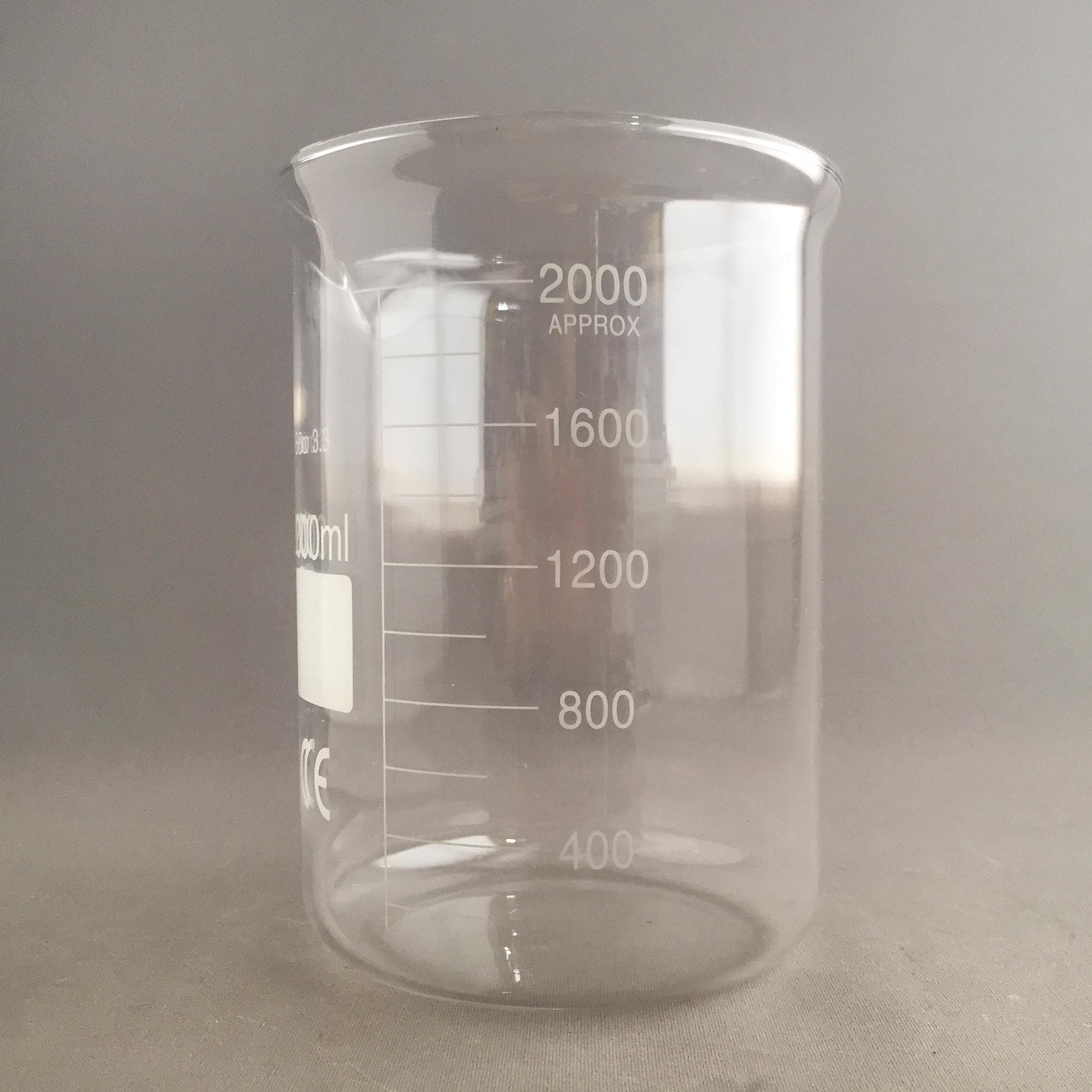 A 2000 ml borosilicate glass Griffin-style low-form beaker.