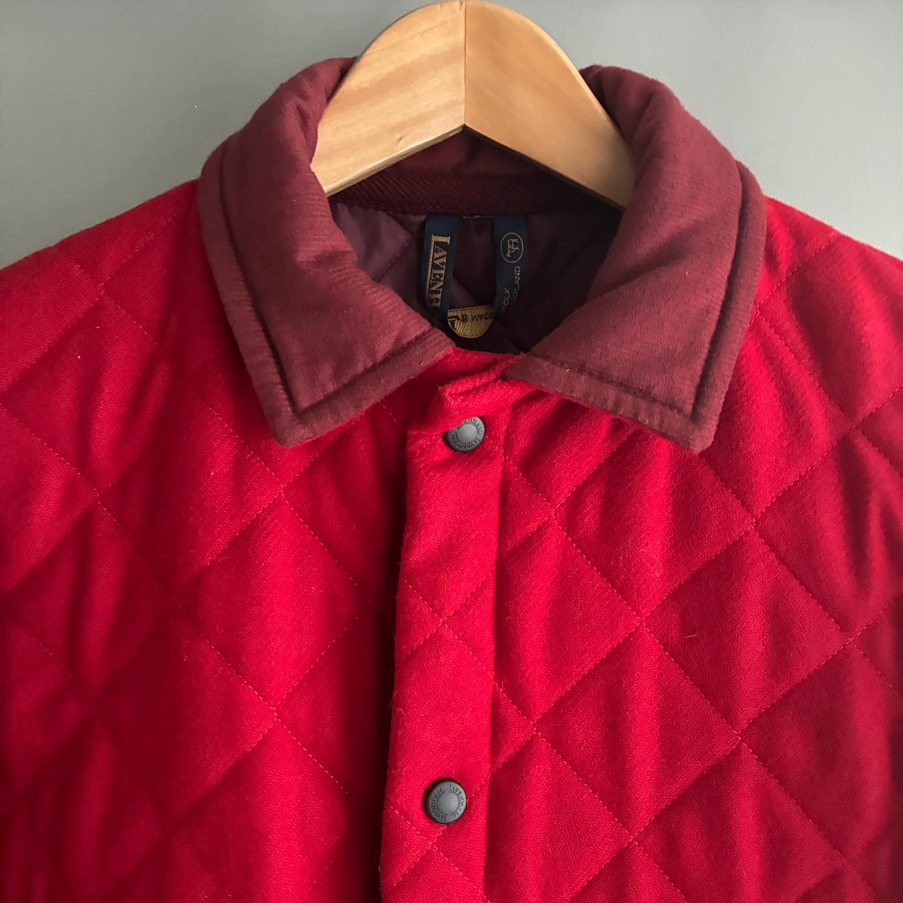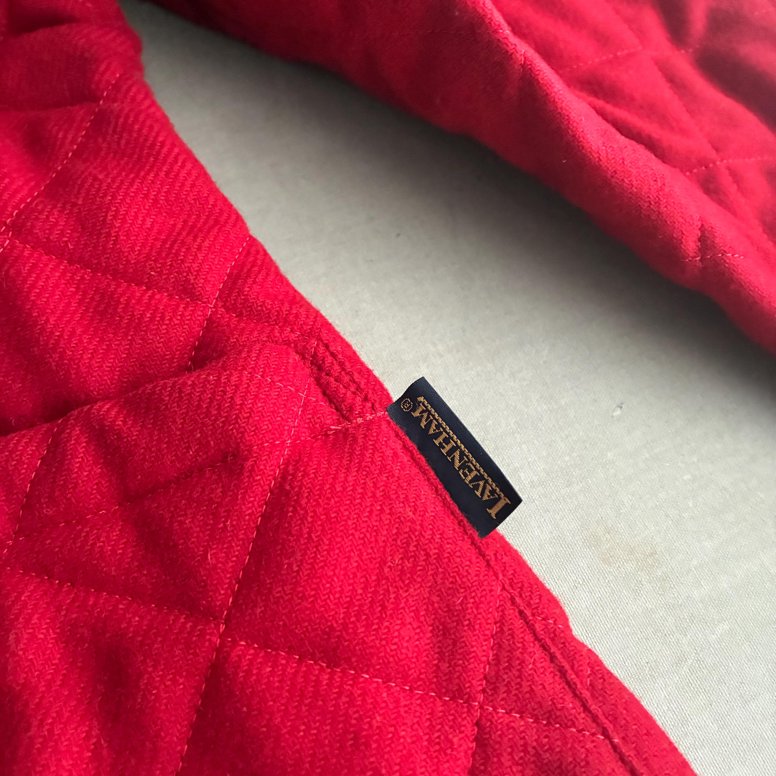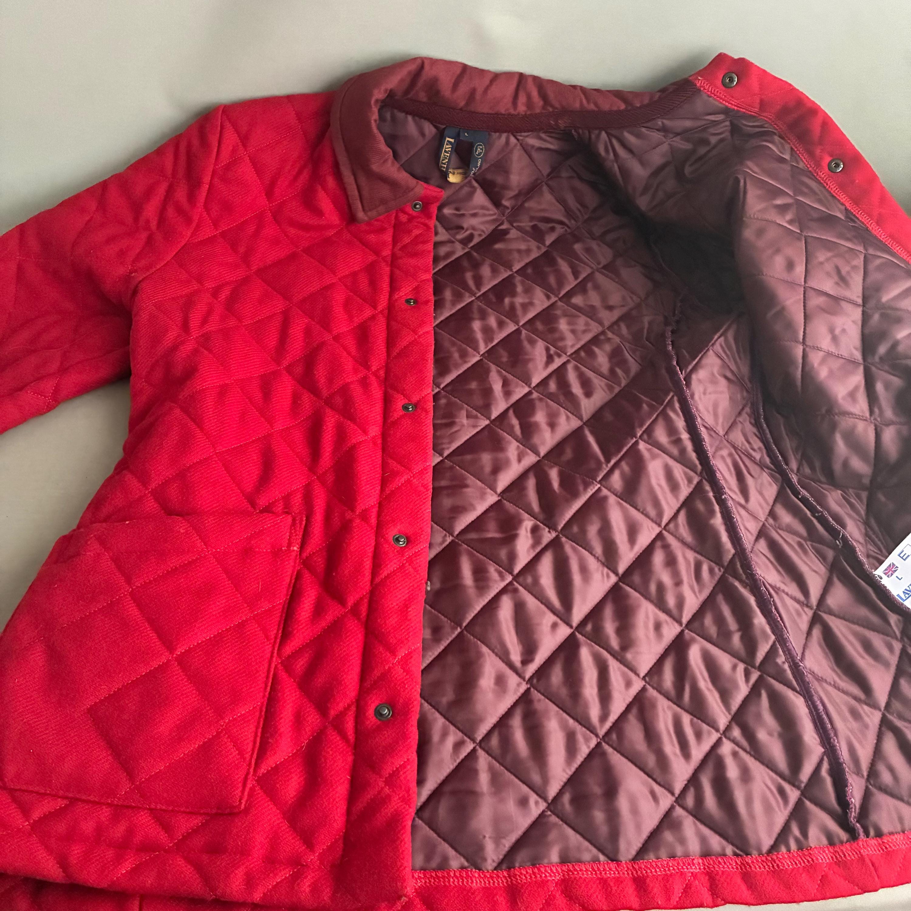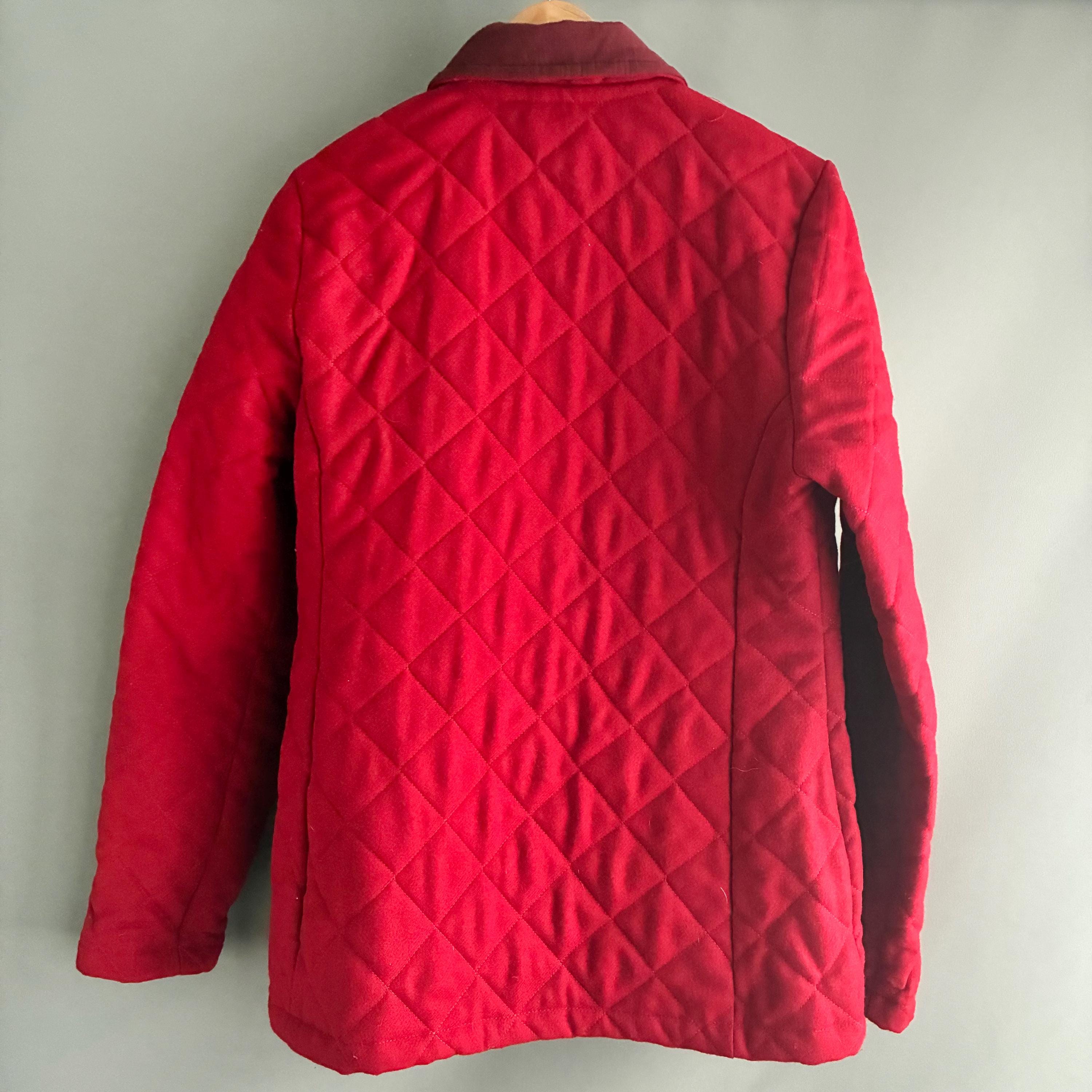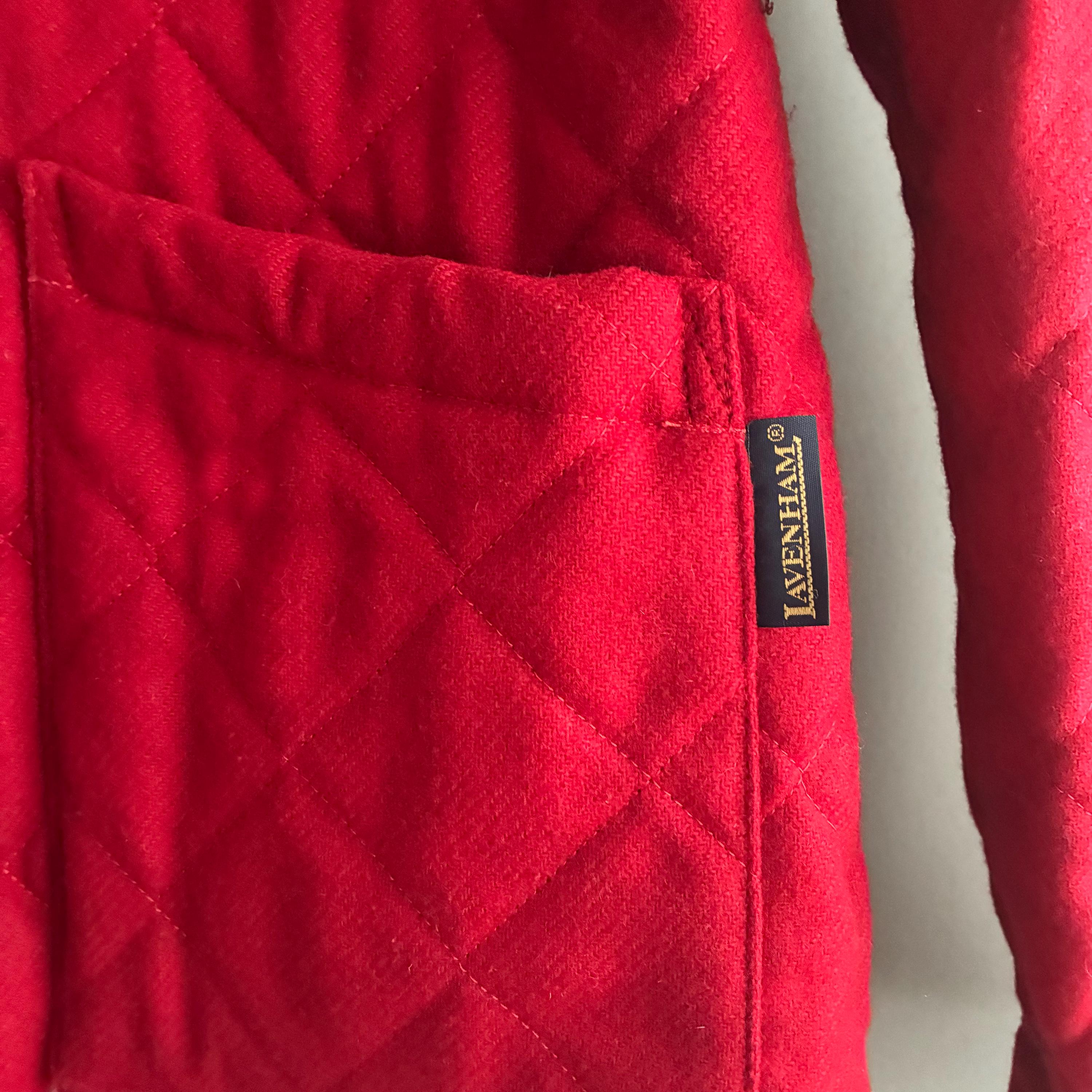 Stunning Vintage Lavenham Red riding jacket. Red wool quilted country coat with contrasting burgandy collar. Fully lined . 2 patch pockets and one internal pocket. Stylish , neat , light , warm a perfect jacket really for town and country. UK size 12 . Made in England by heritage brand Lavenham sufolk