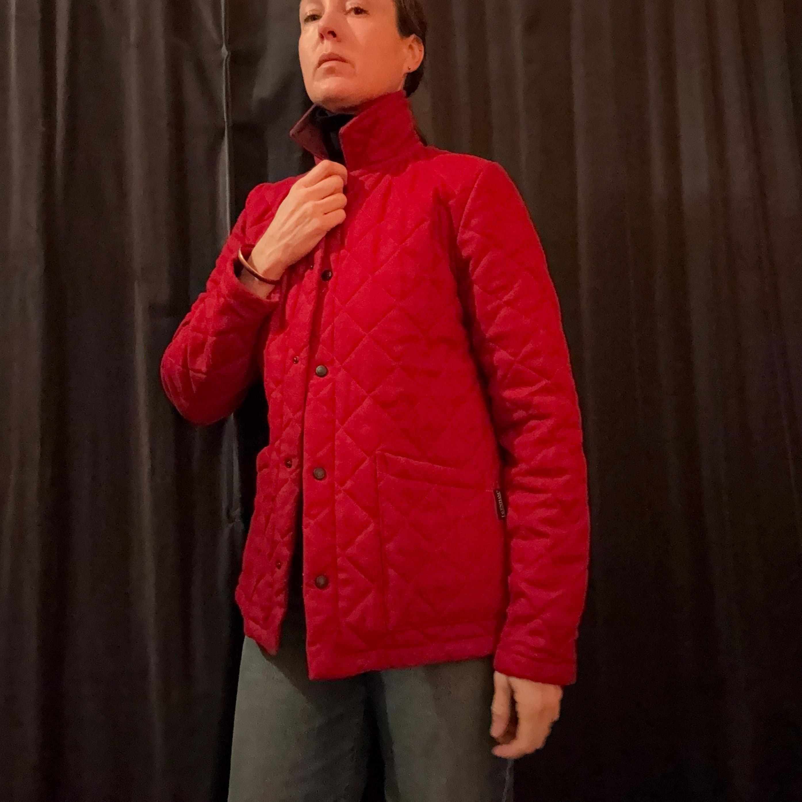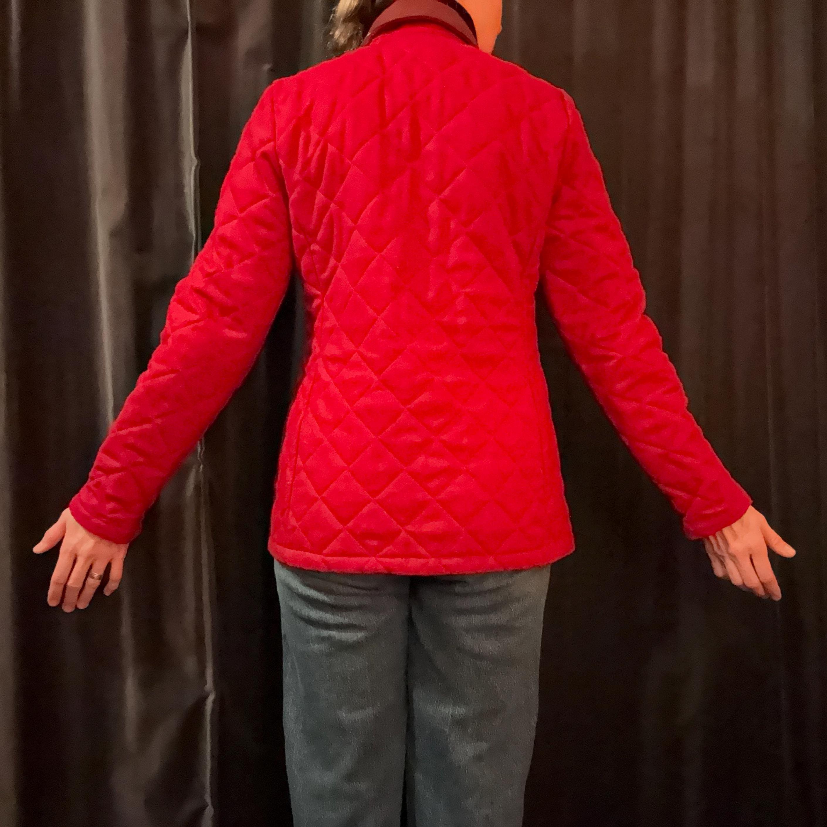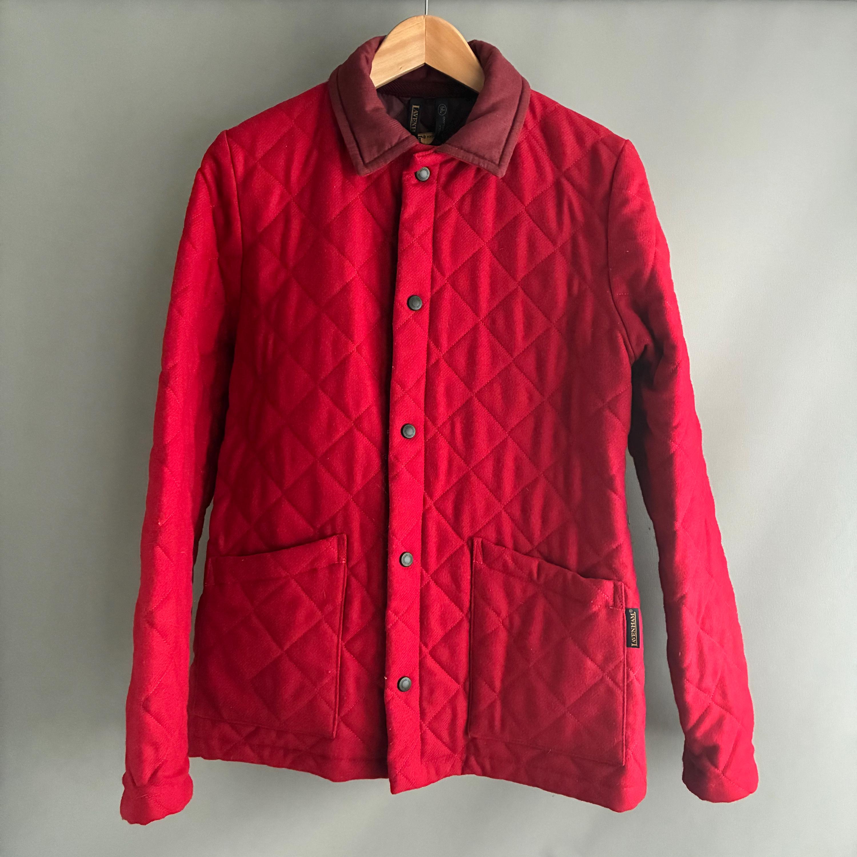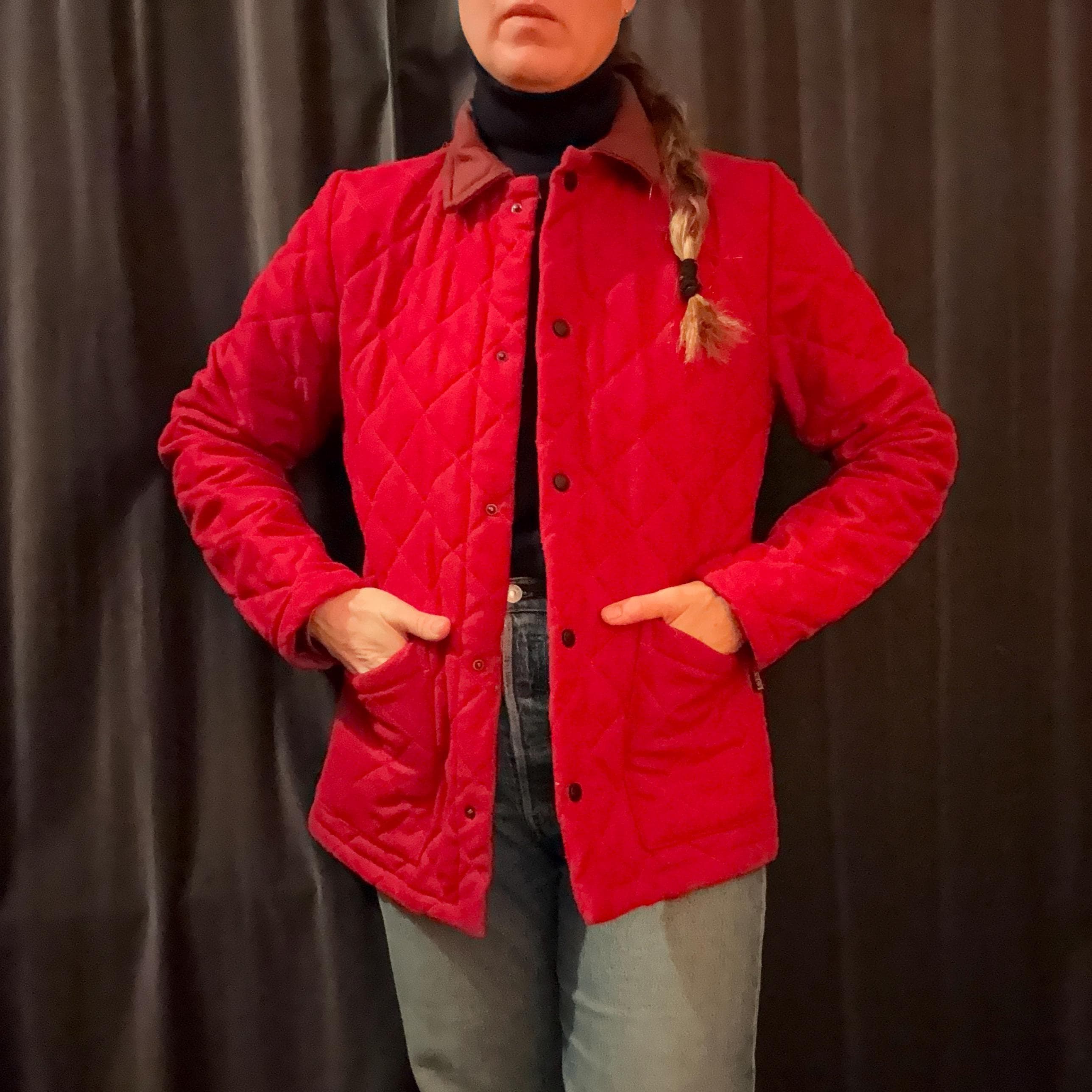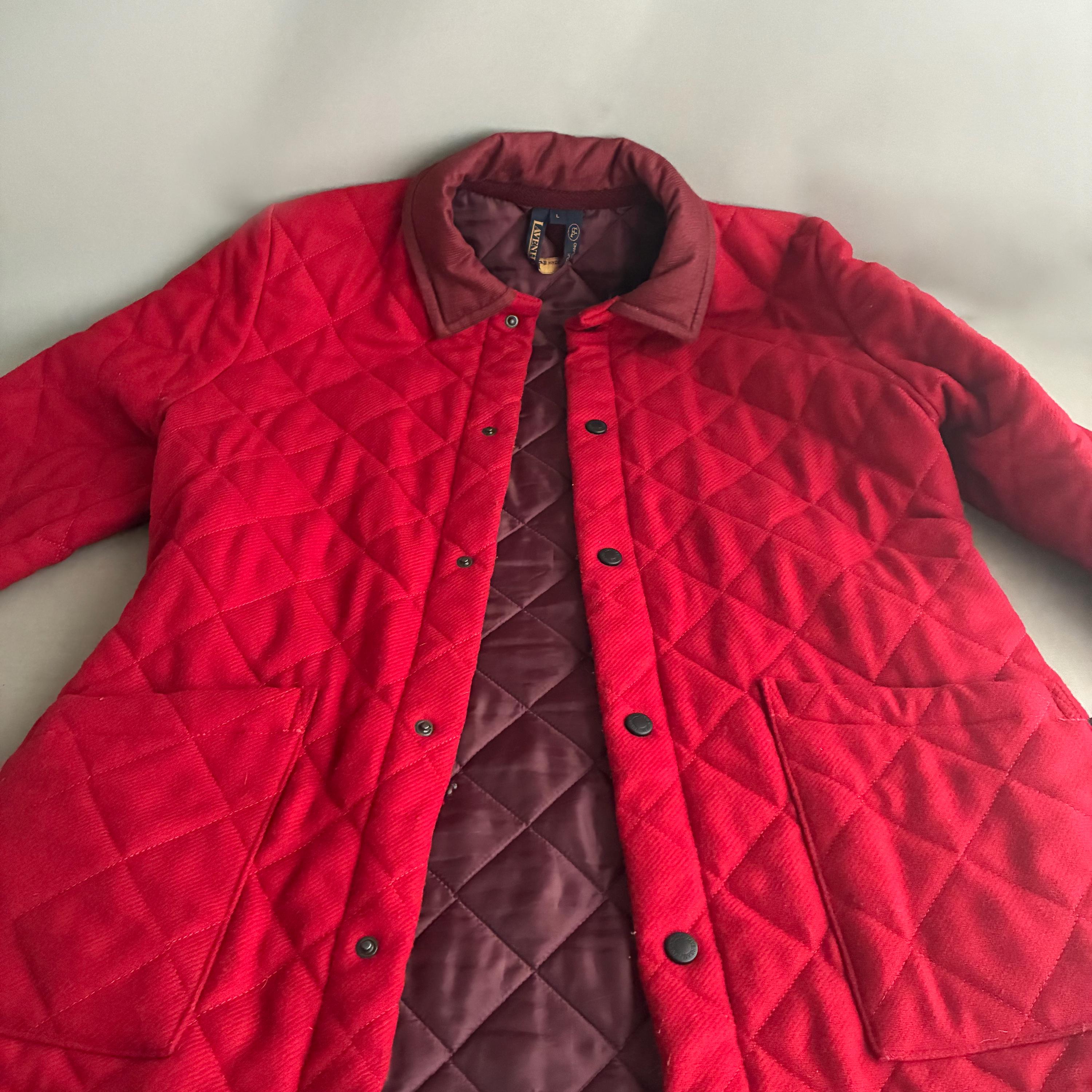 Stunning Vintage Lavenham Red riding jacket. Red wool quilted country coat with contrasting burgandy collar. Fully lined . 2 patch pockets and one internal pocket. Stylish , neat , light , warm a perfect jacket really for town and country. UK size 12 . Made in England by heritage brand Lavenham sufolk