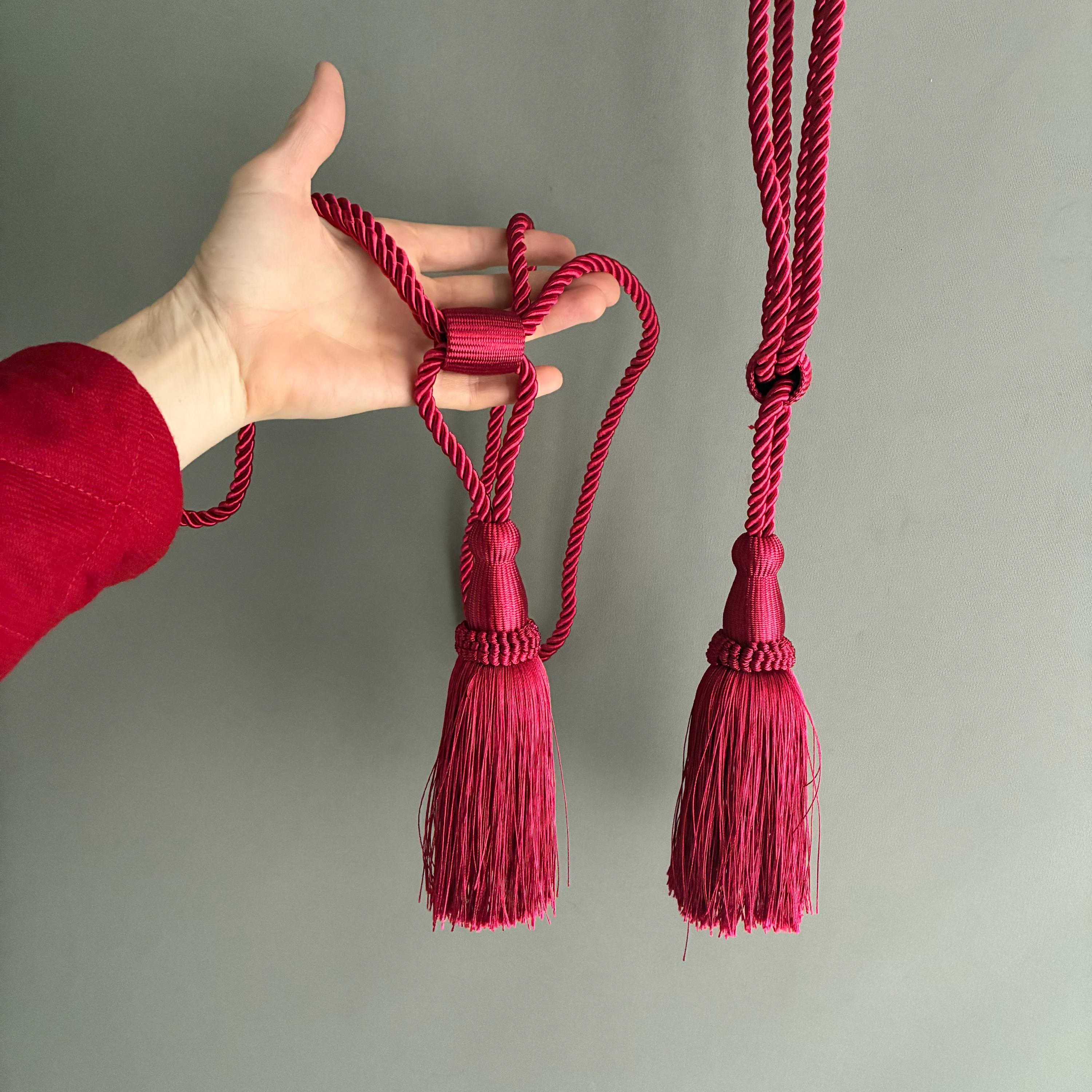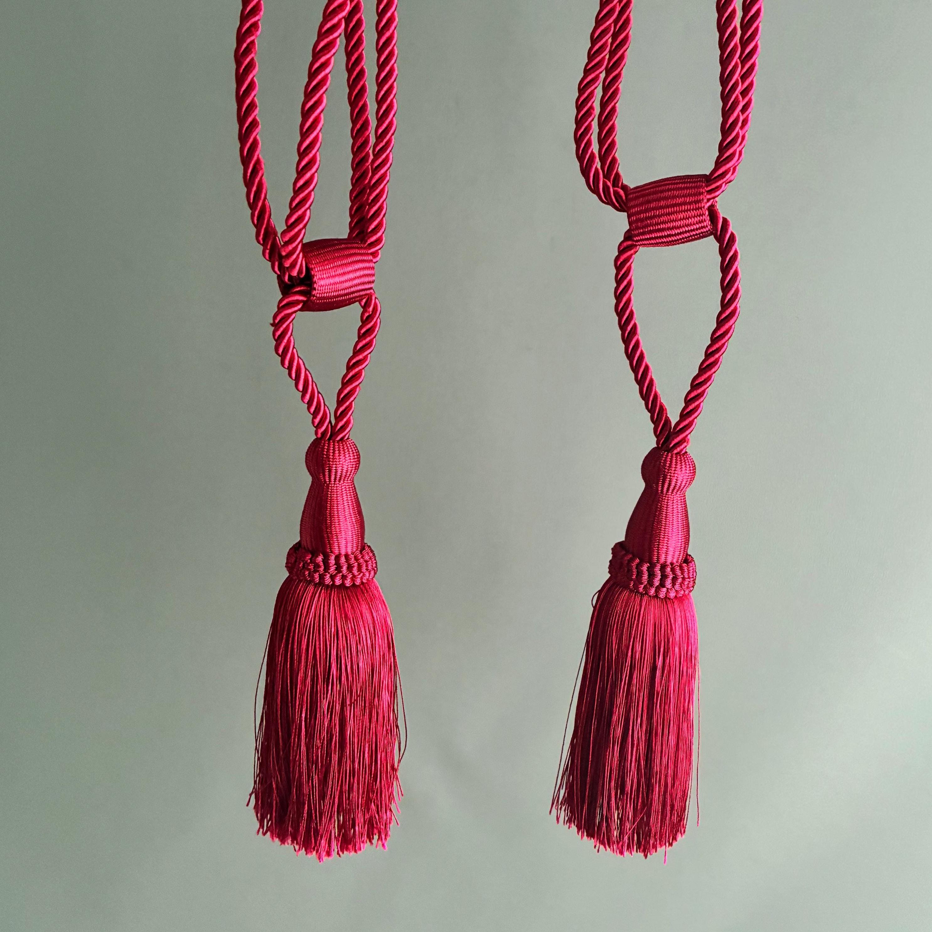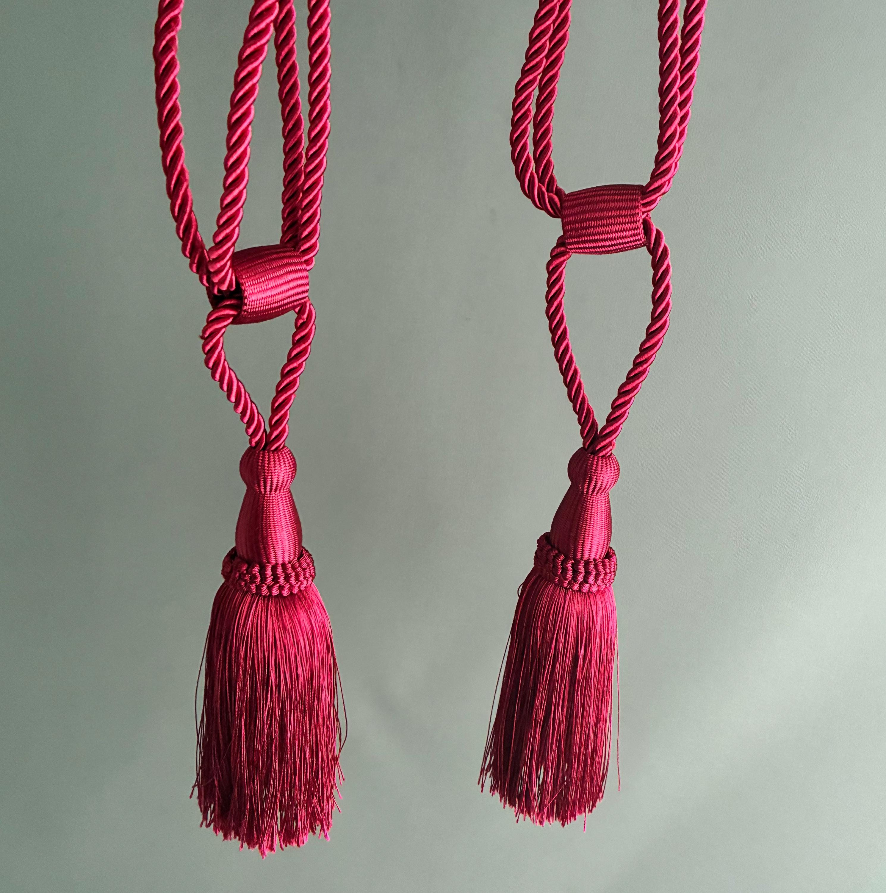 A pair of tassel tie-back corded rope curtain holdbacks in a vibrant wine-red color. These decorative accessories are designed to hold curtains back from a window while adding a touch of elegance to the room's decor. sold as a pair