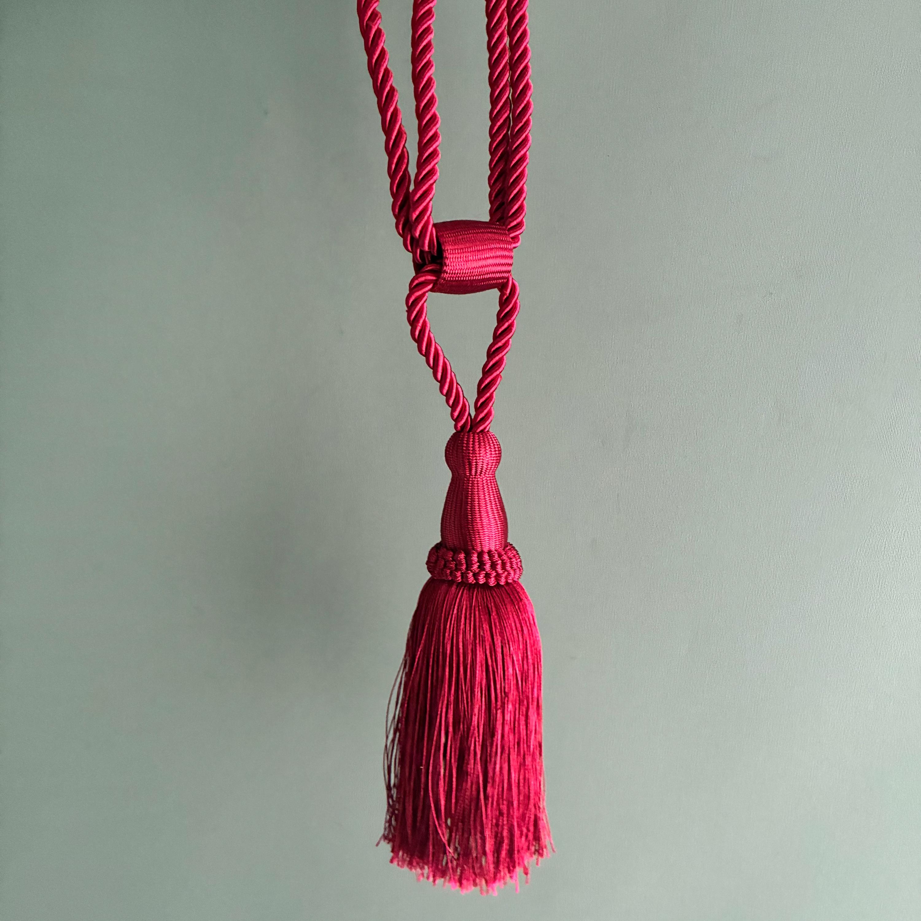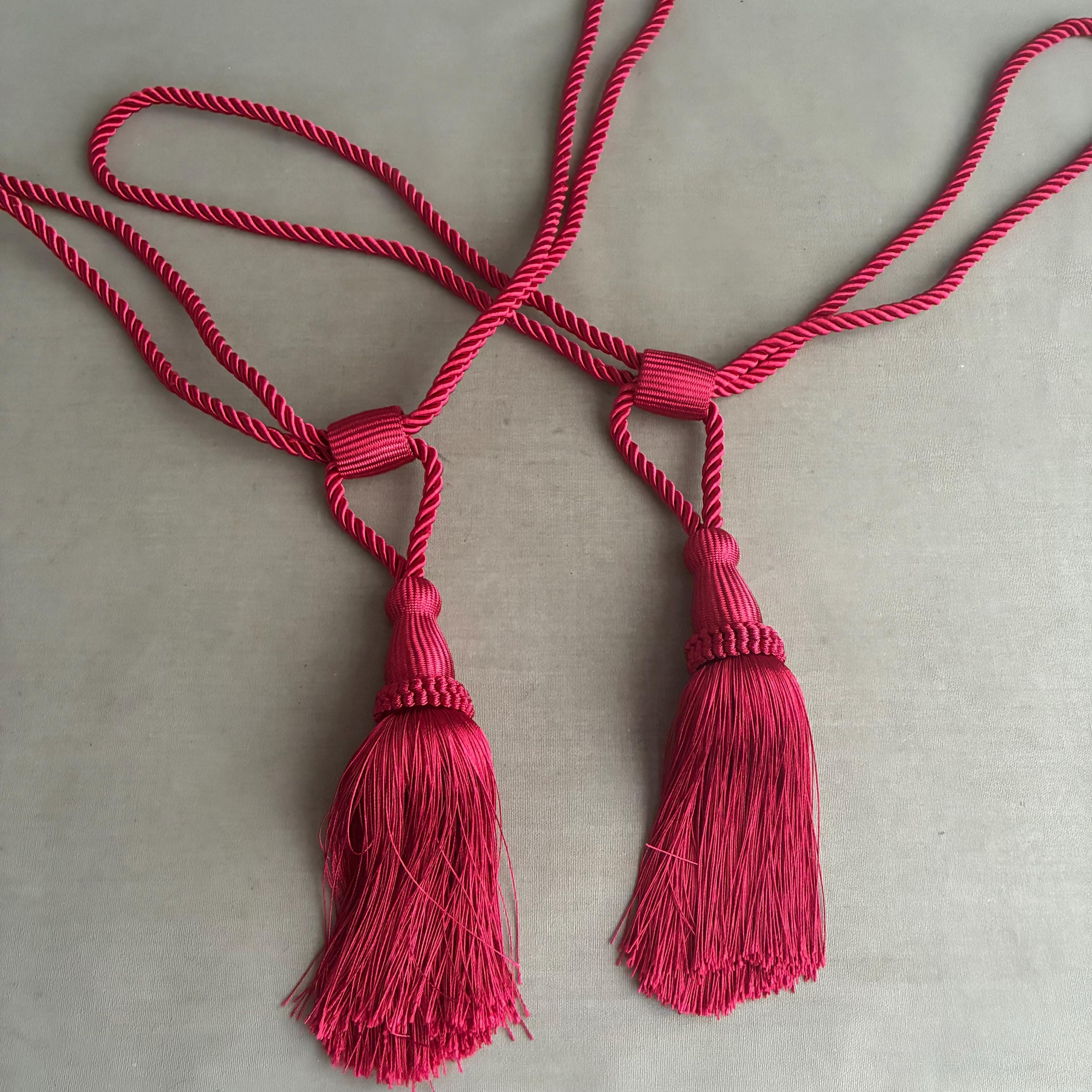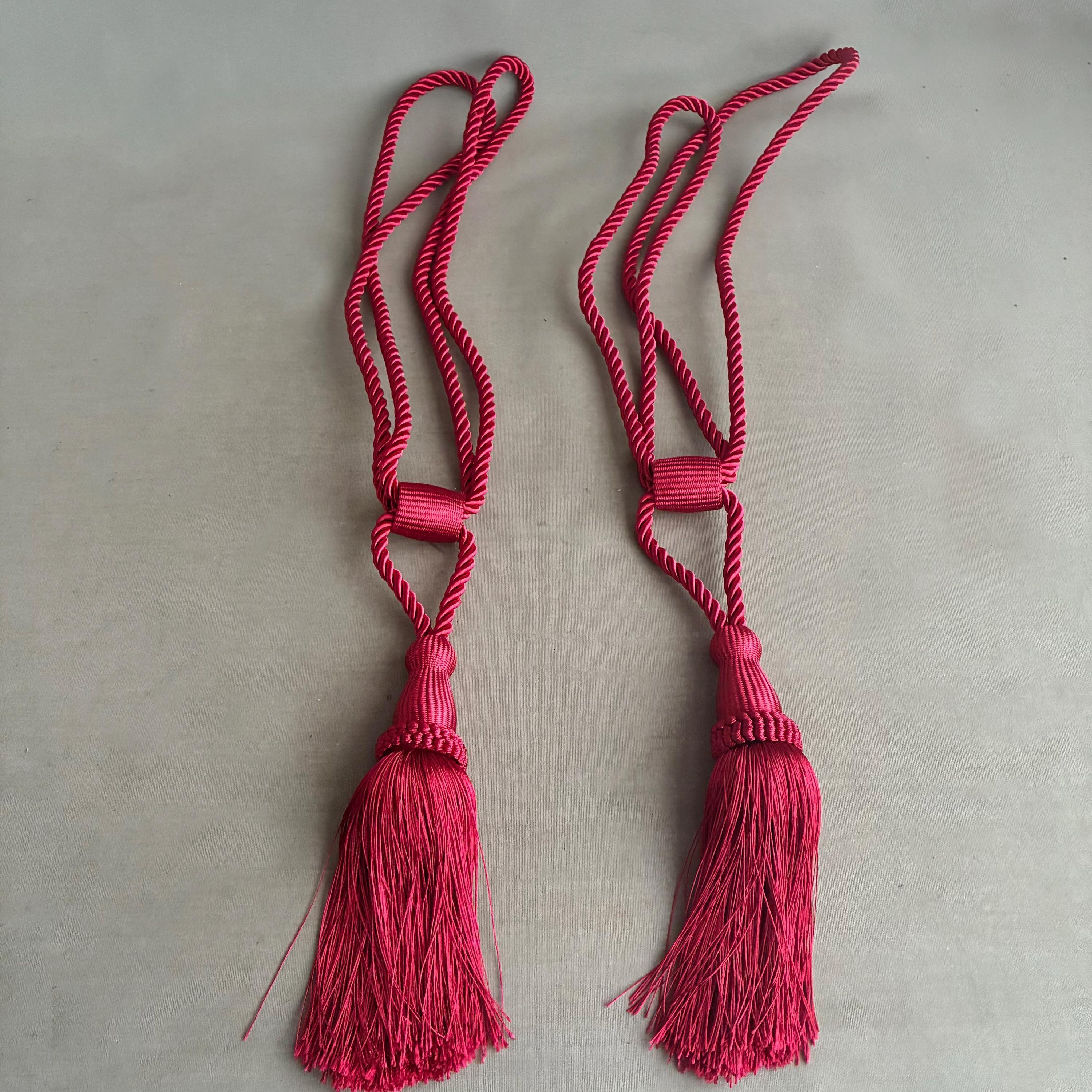 A pair of tassel tie-back corded rope curtain holdbacks in a vibrant wine-red color. These decorative accessories are designed to hold curtains back from a window while adding a touch of elegance to the room's decor. sold as a pair