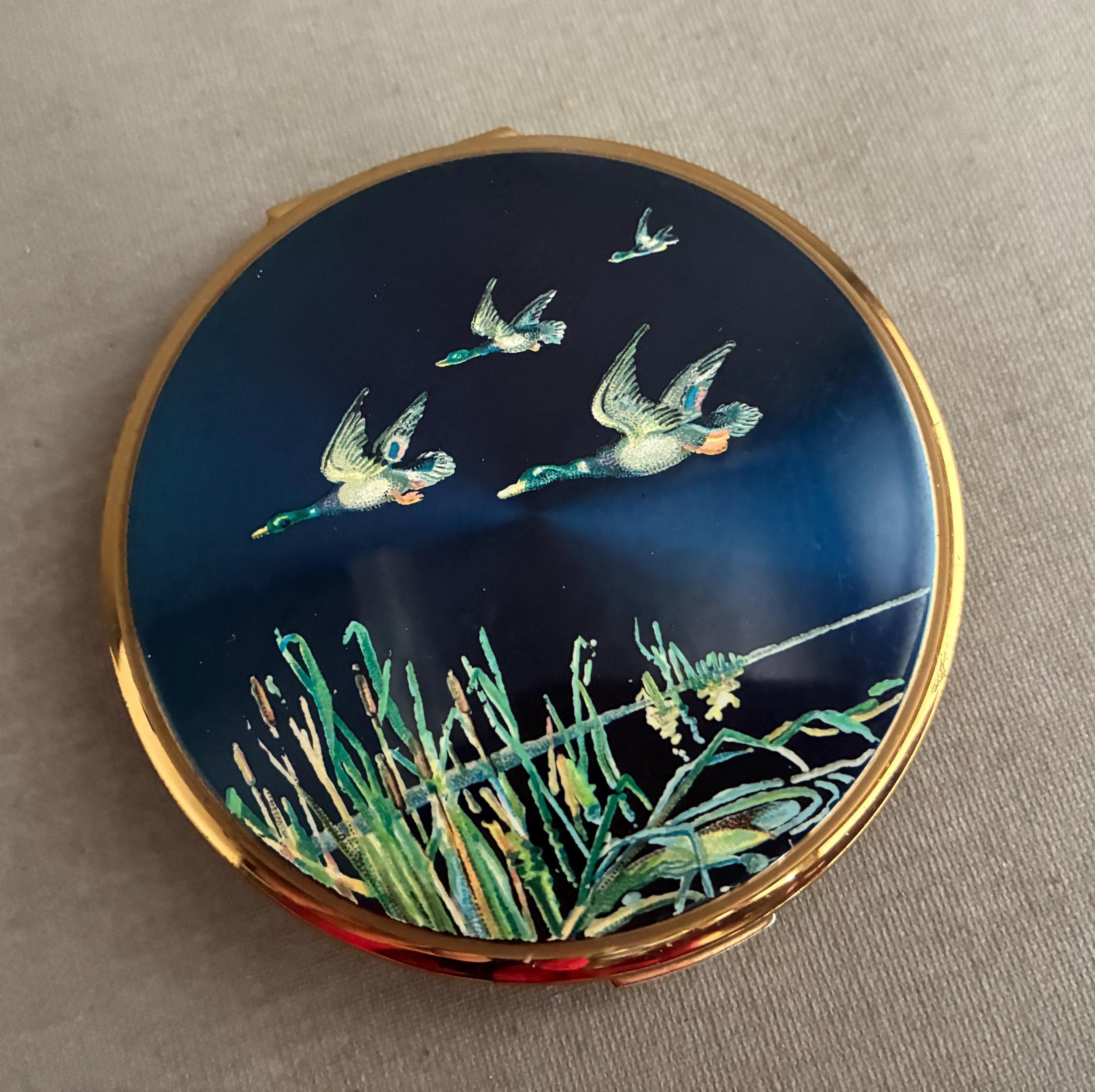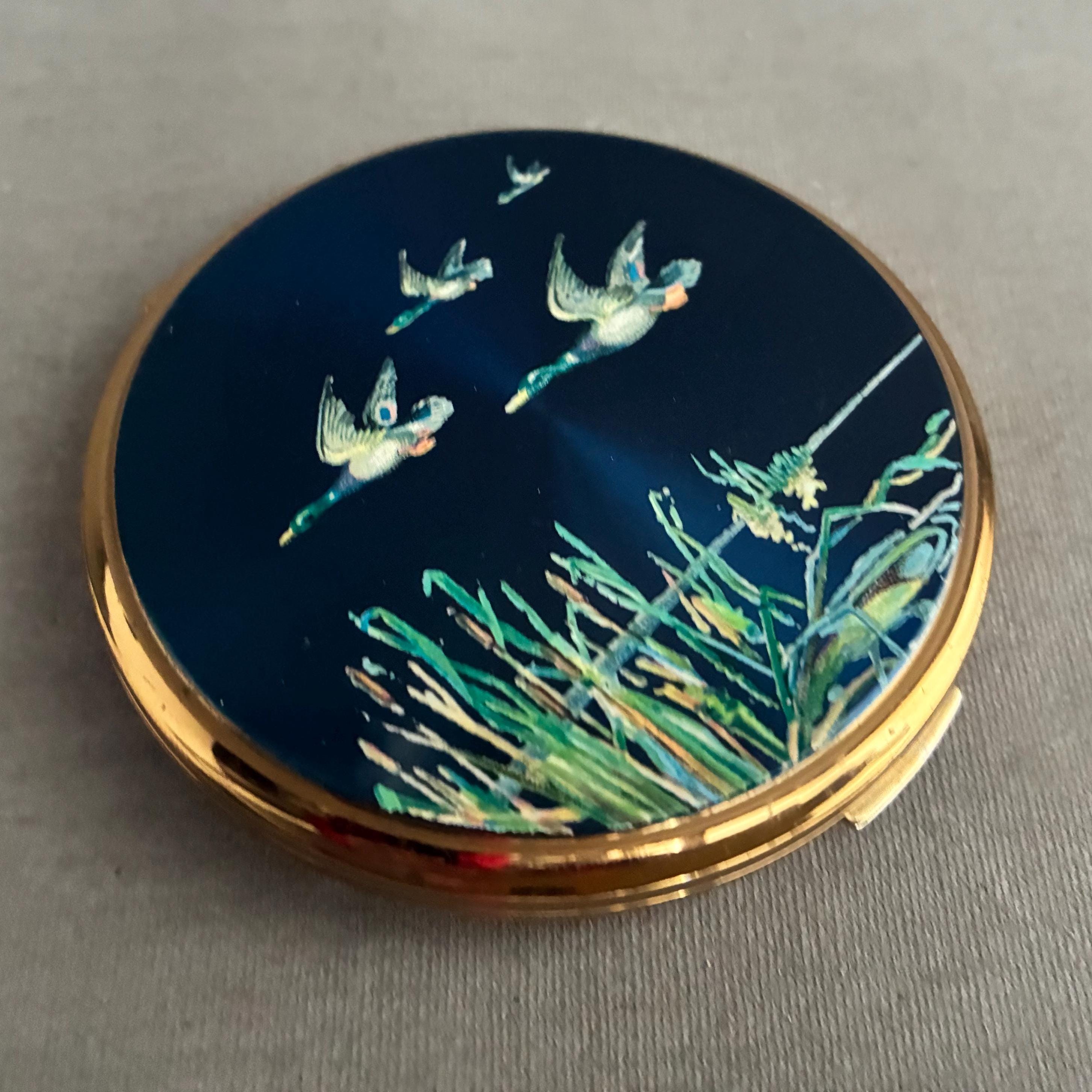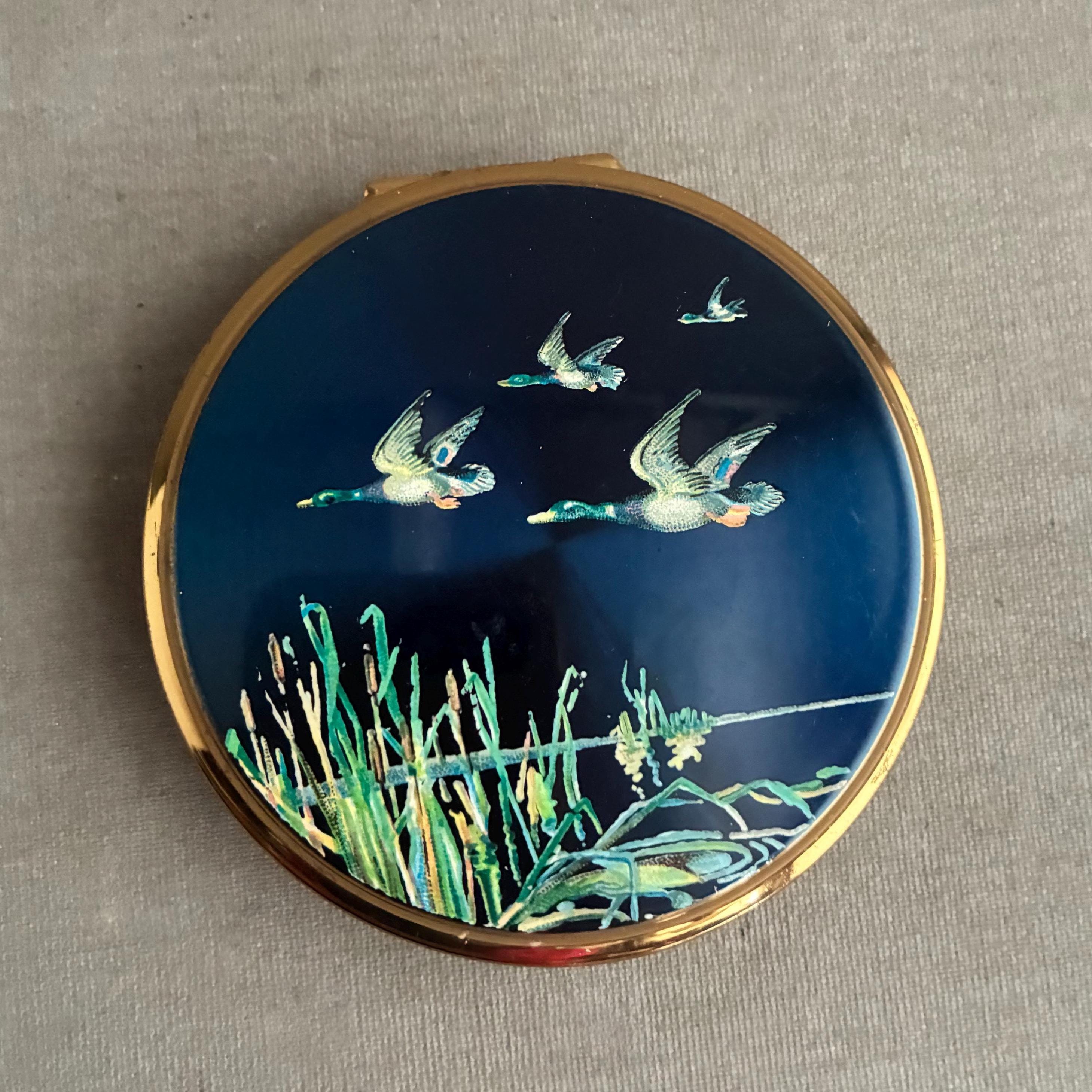 A vintage Stratton powder compact, Featuring blue enamel with a detailed scene of flying ducks over reeds. A limited edition "Flying Ducks" series. Produced by the English brand Stratton, known for high-quality metal compacts. Contains a mirror inside the lid, with many models featuring an inner lid for powder storage.