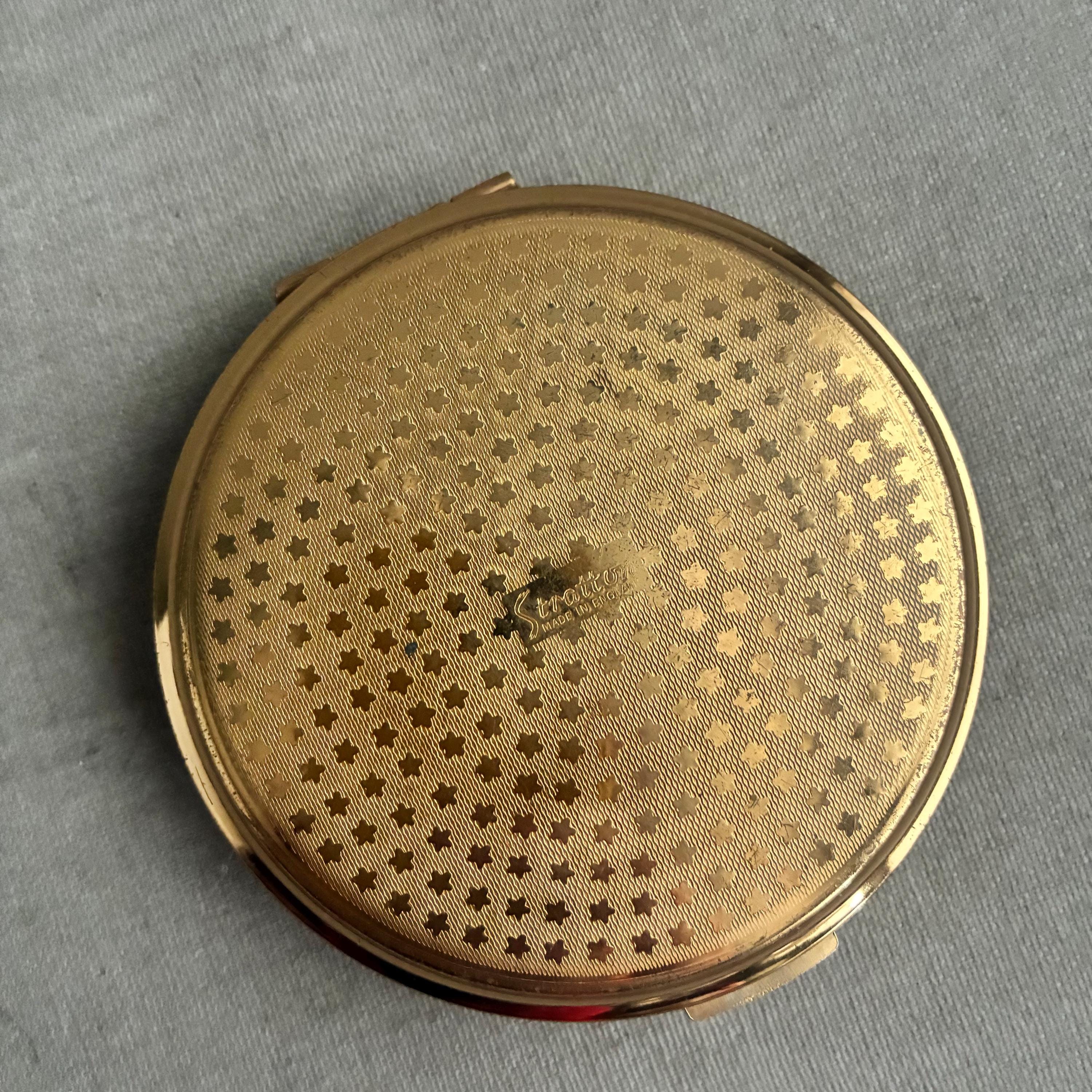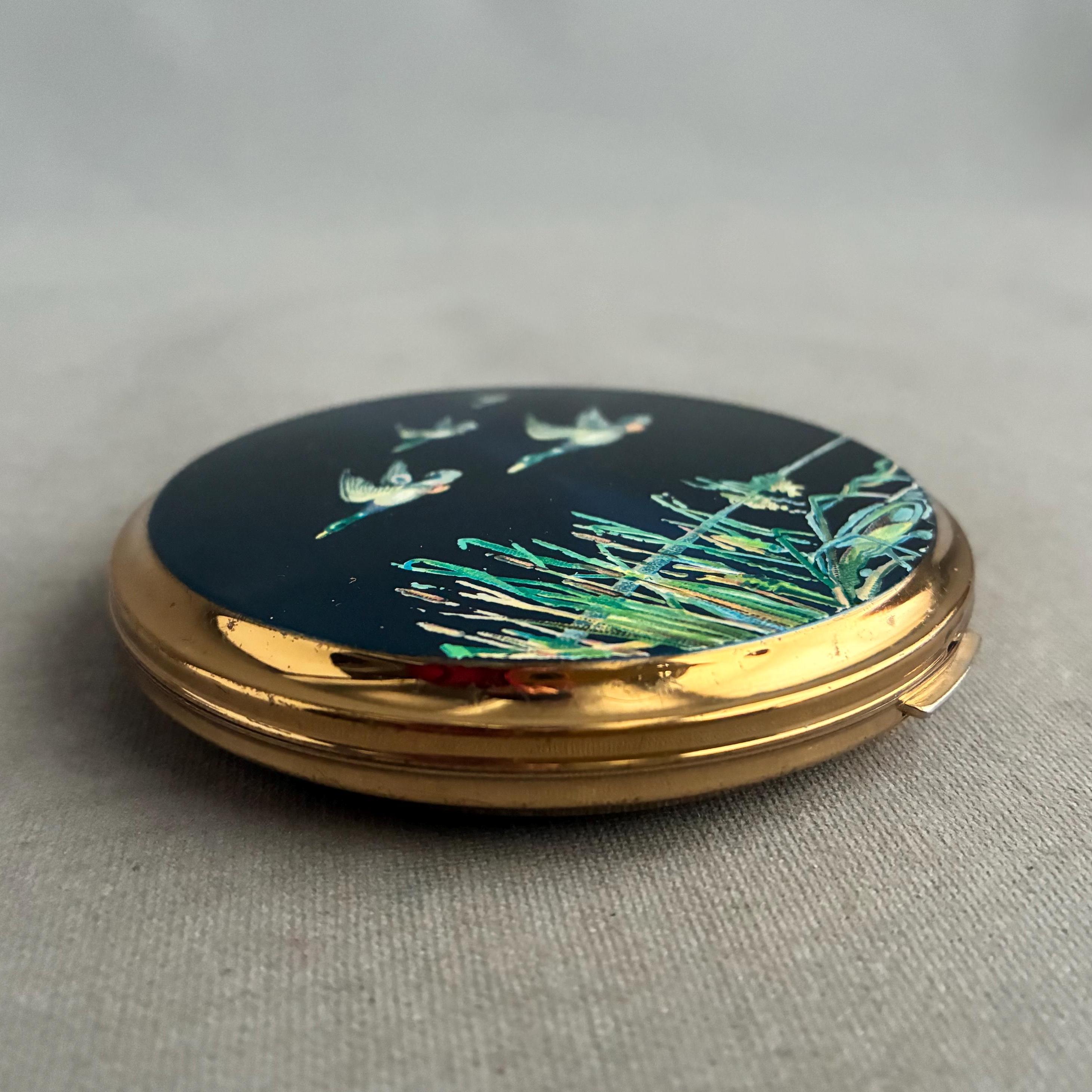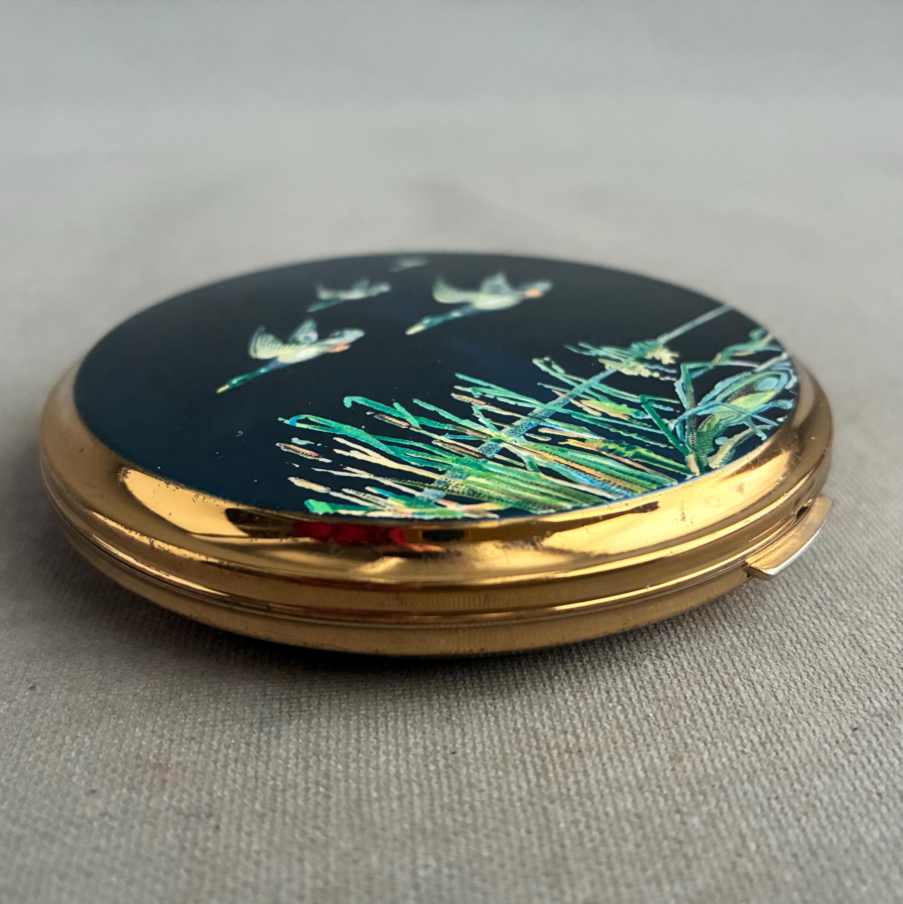 A vintage Stratton powder compact, Featuring blue enamel with a detailed scene of flying ducks over reeds. A limited edition "Flying Ducks" series. Produced by the English brand Stratton, known for high-quality metal compacts. Contains a mirror inside the lid, with many models featuring an inner lid for powder storage.