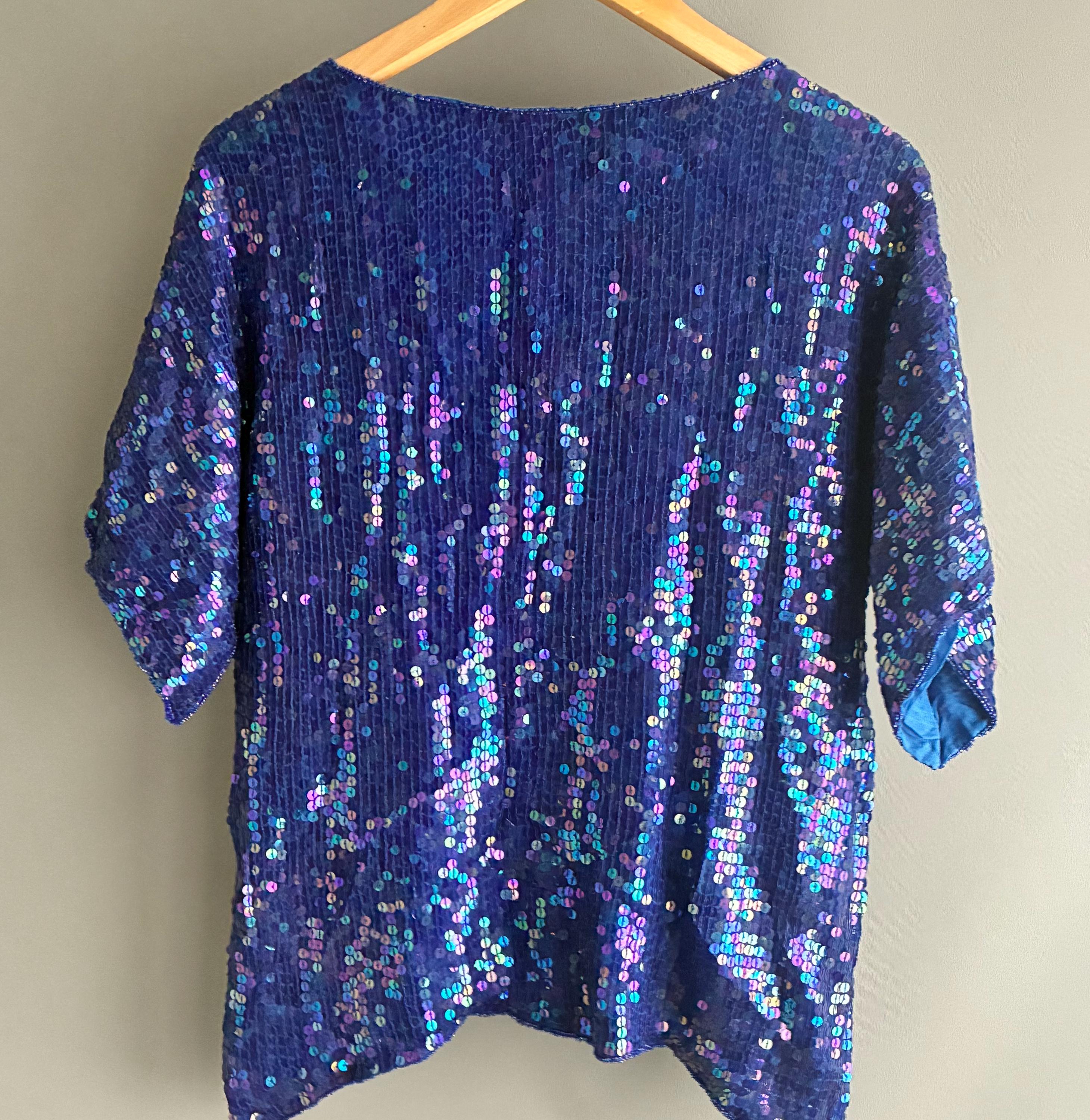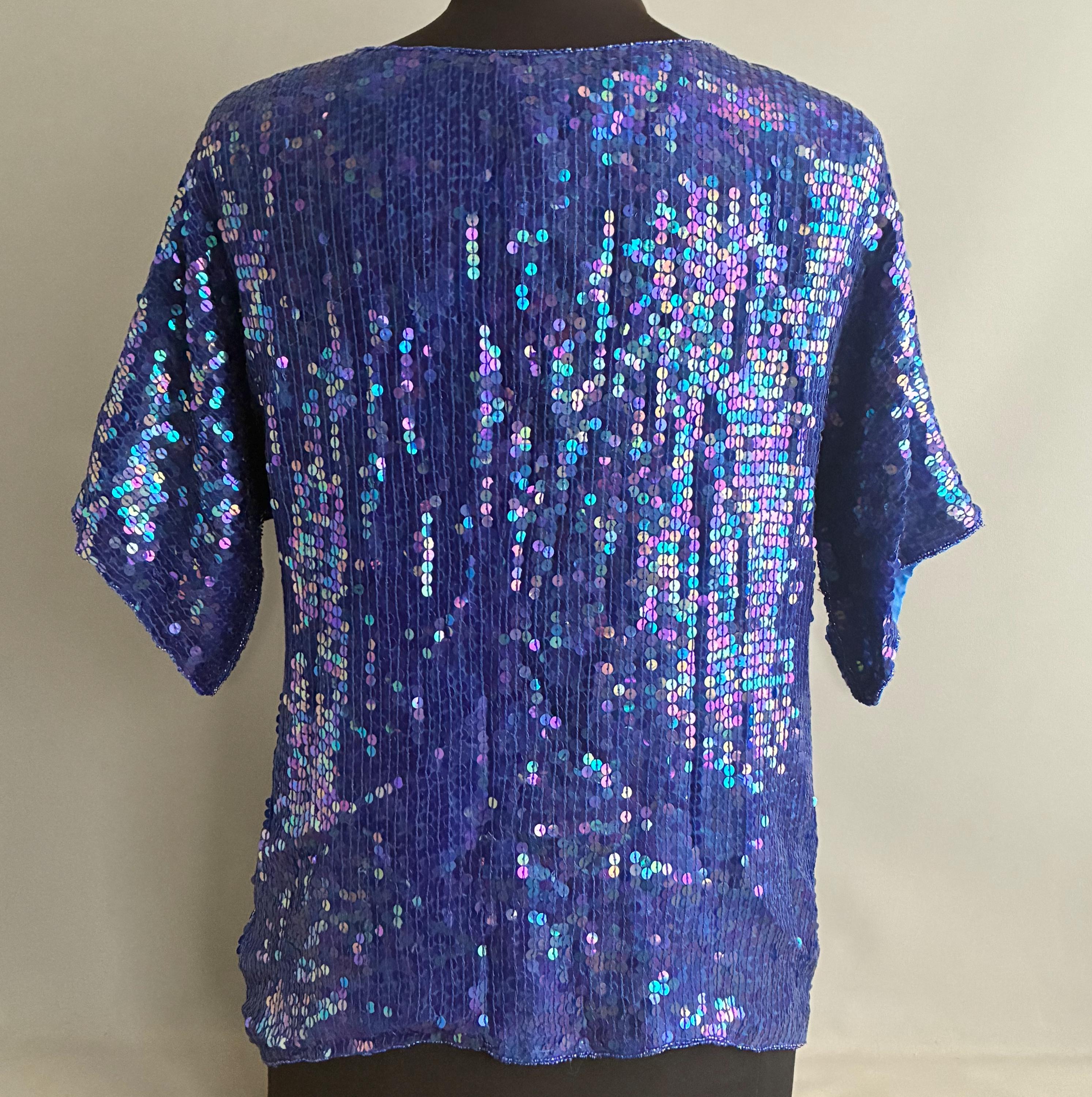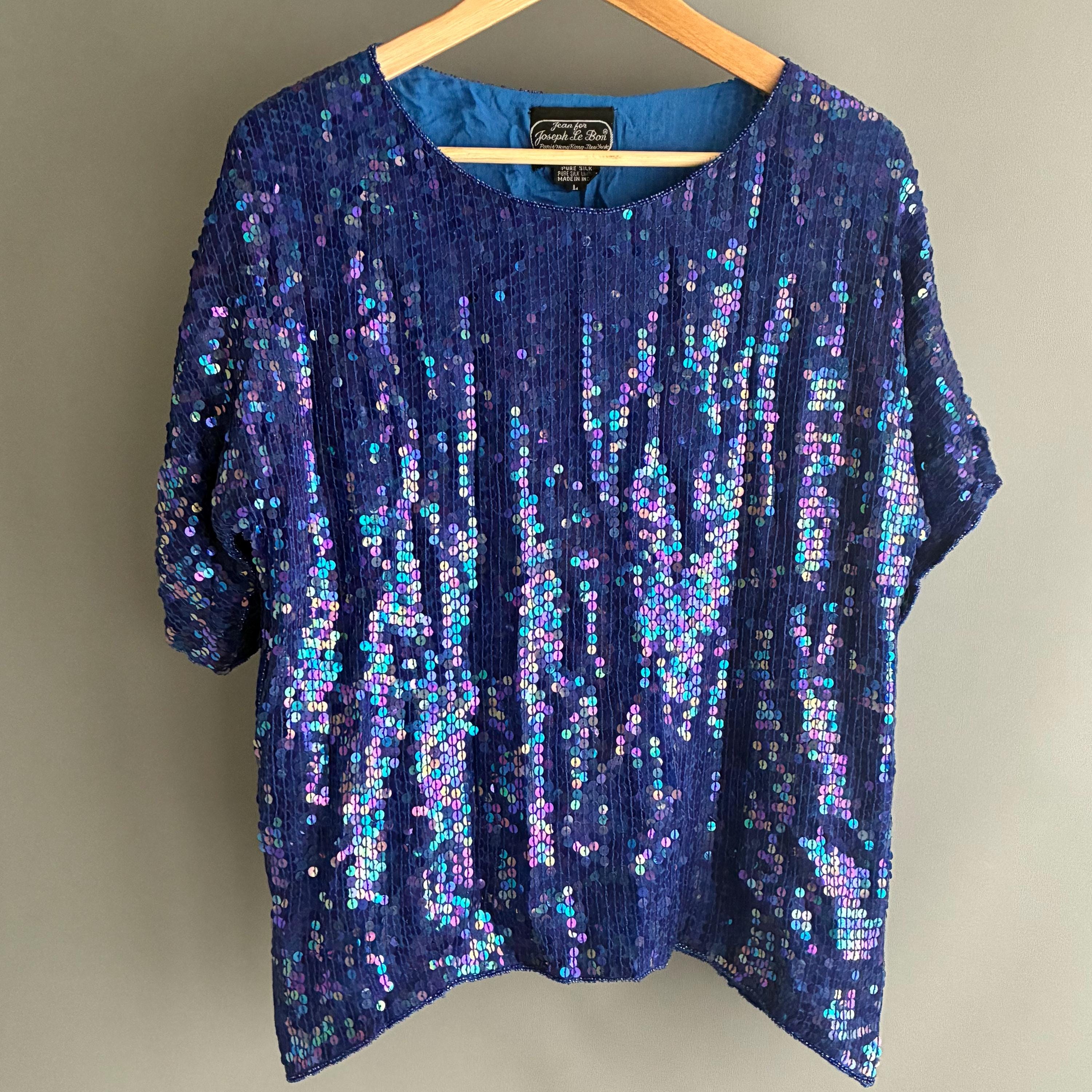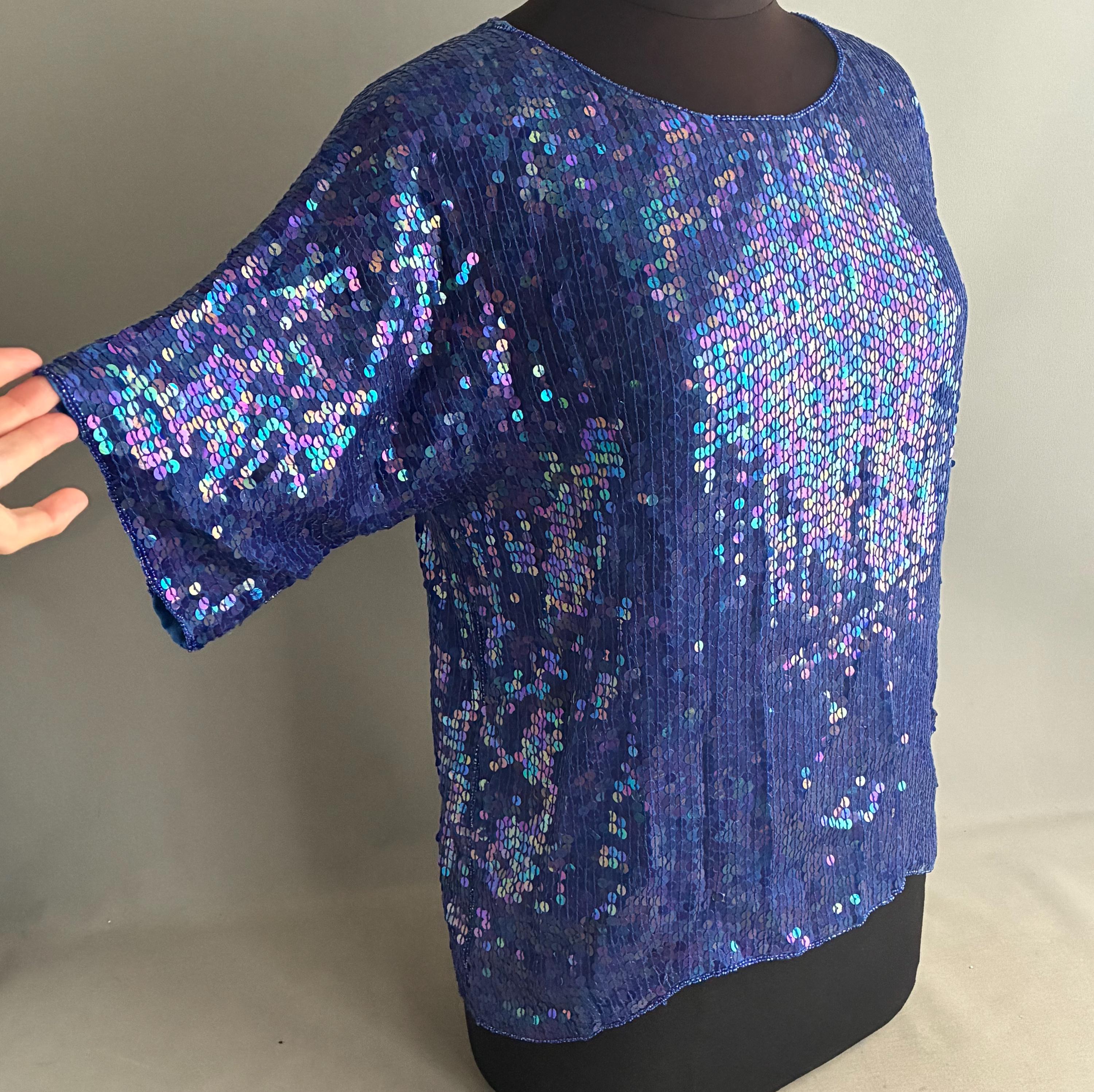 An eye-catching vintage 1980s sequin blouse, crafted with a 100% silk base and adorned with iridescent blue / purple sequins .Known as "trophy tops" They were popular for their high-glam, party-ready aesthetic and often featured a loose, short-sleeved fit and a simple round neckline It has a nice weight and drape . Throw on with a pair of jeans and you are ready to go to the disco .Made by Jean for Joseph le Bon