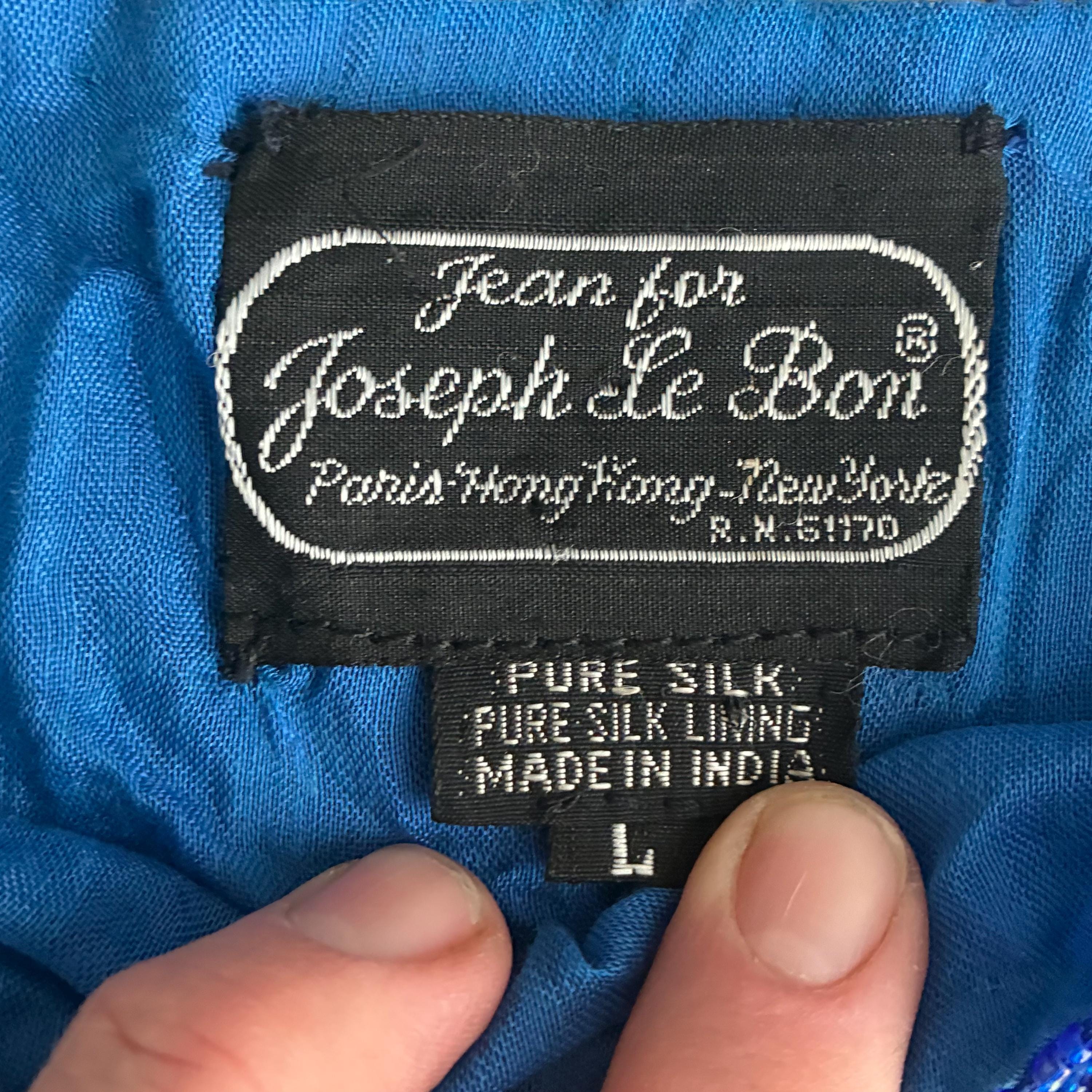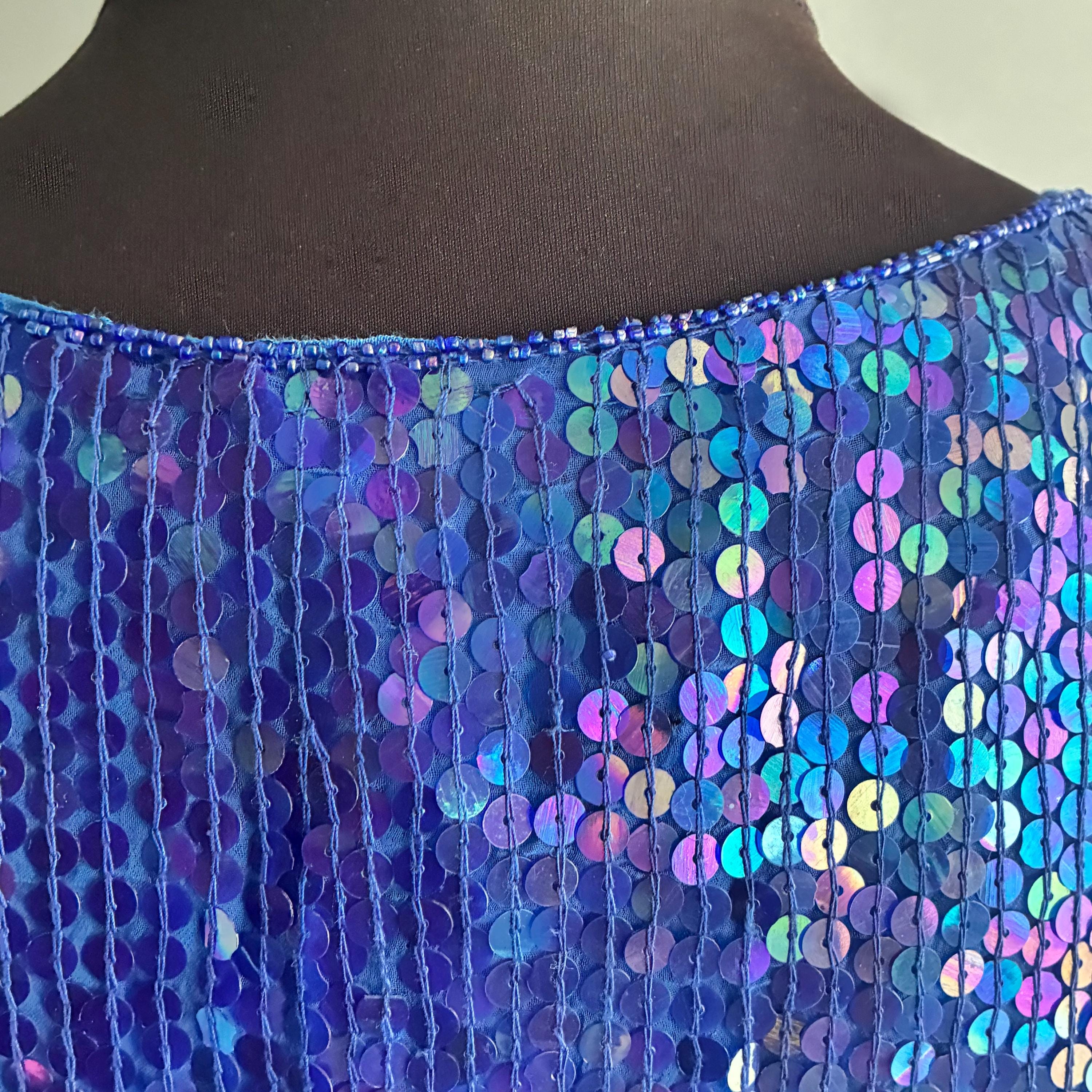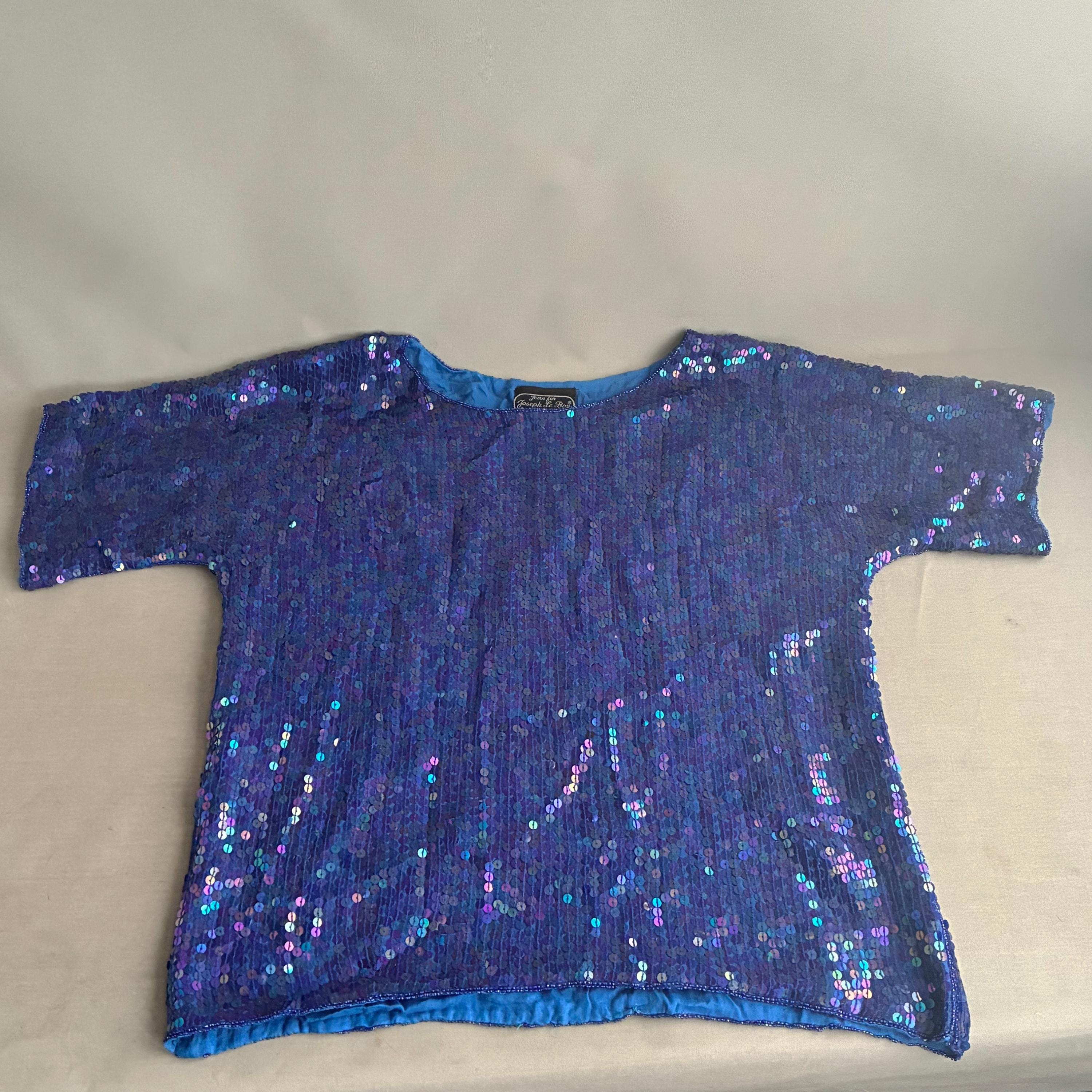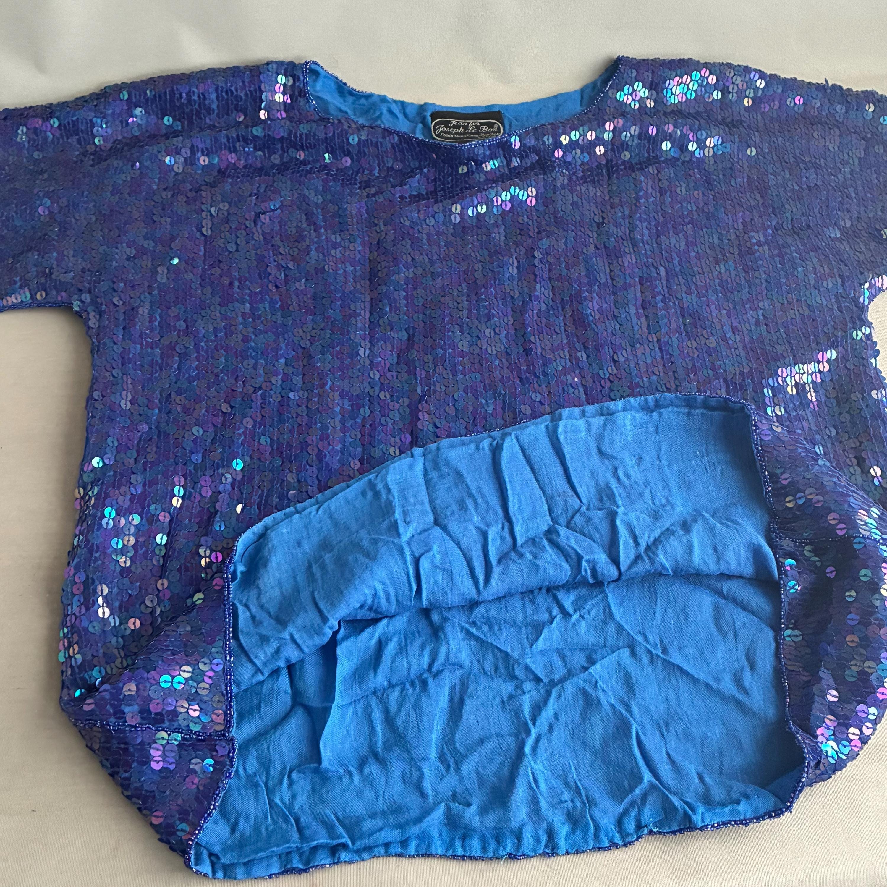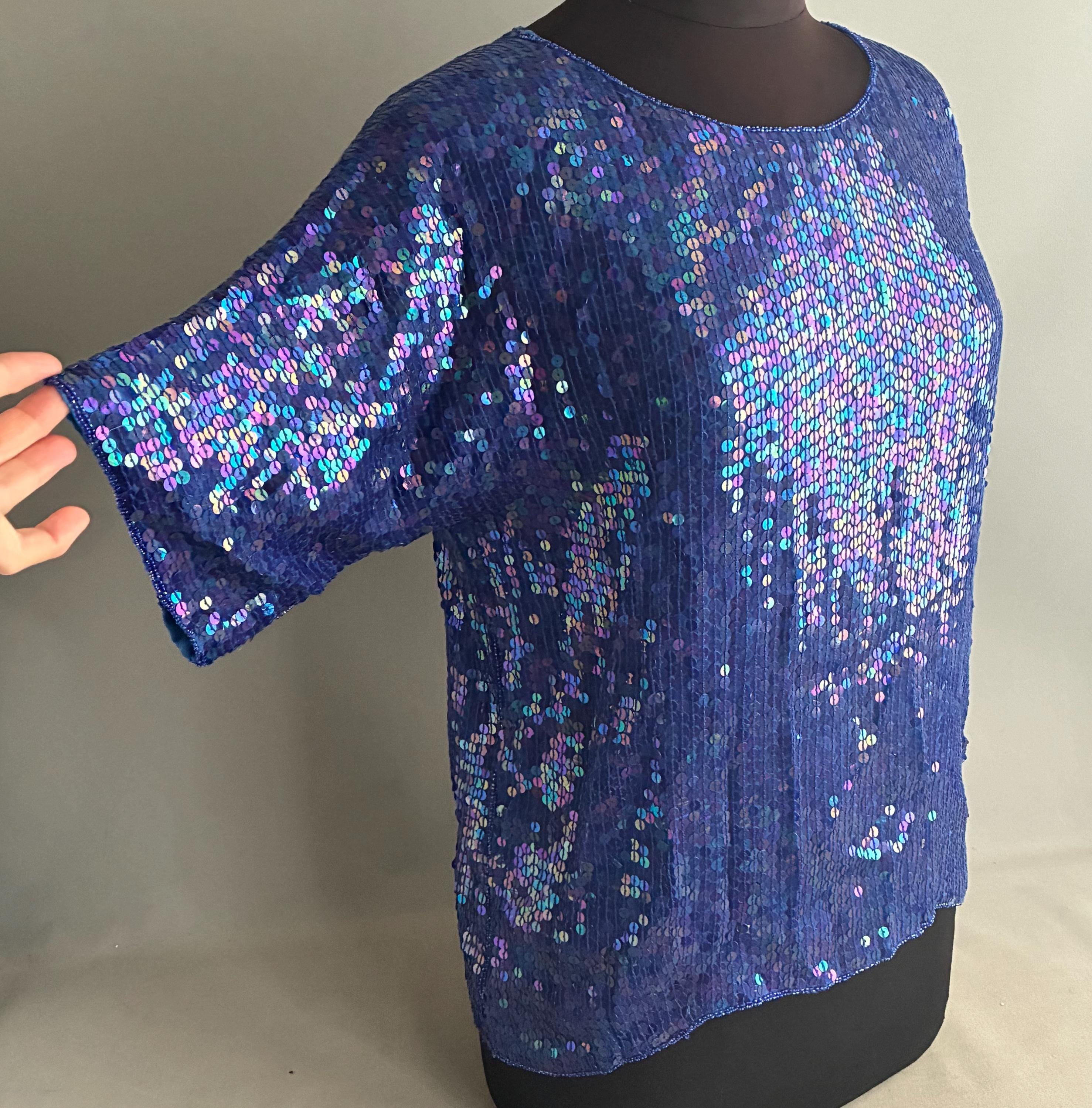 An eye-catching vintage 1980s sequin blouse, crafted with a 100% silk base and adorned with iridescent blue / purple sequins .Known as "trophy tops" They were popular for their high-glam, party-ready aesthetic and often featured a loose, short-sleeved fit and a simple round neckline It has a nice weight and drape . Throw on with a pair of jeans and you are ready to go to the disco .Made by Jean for Joseph le Bon