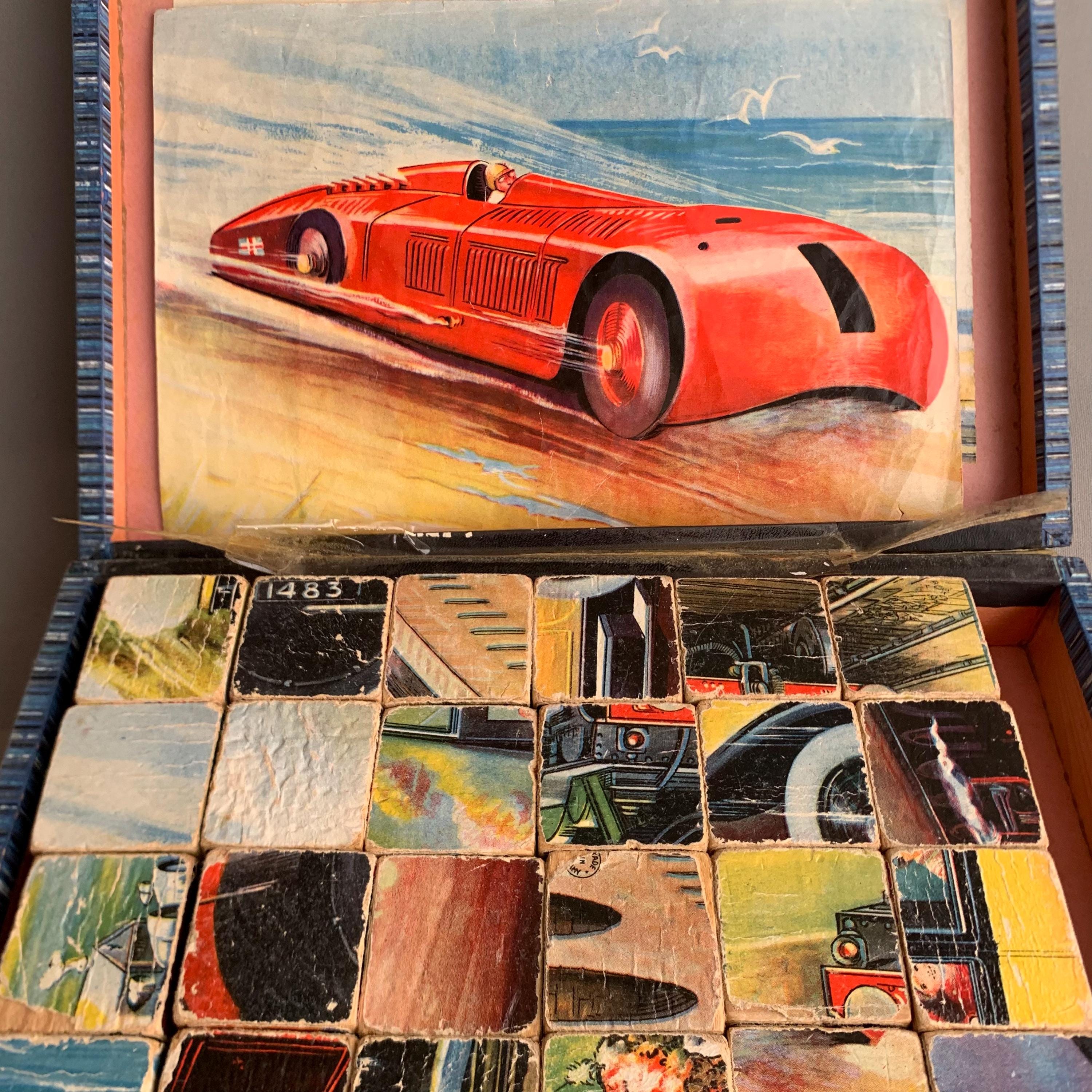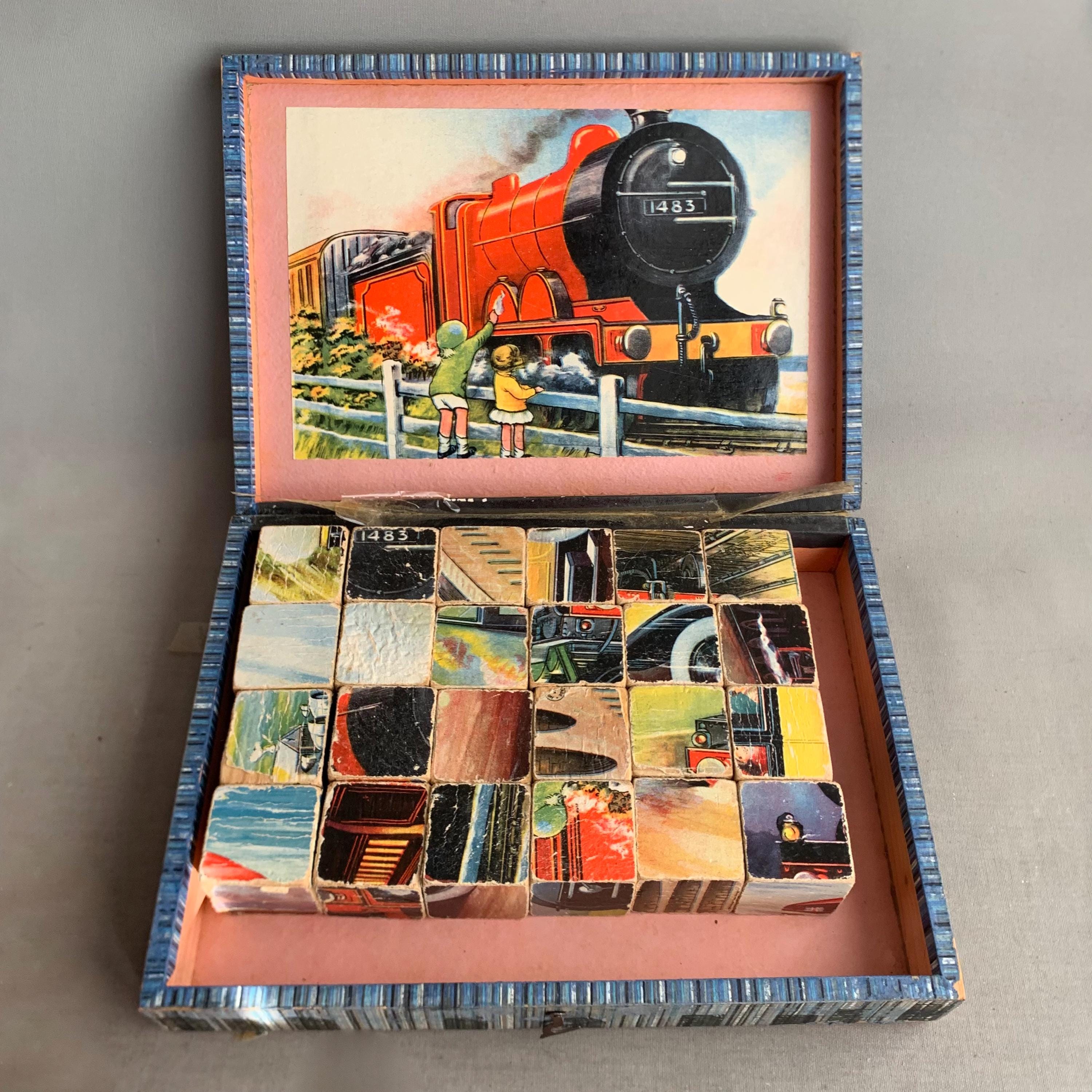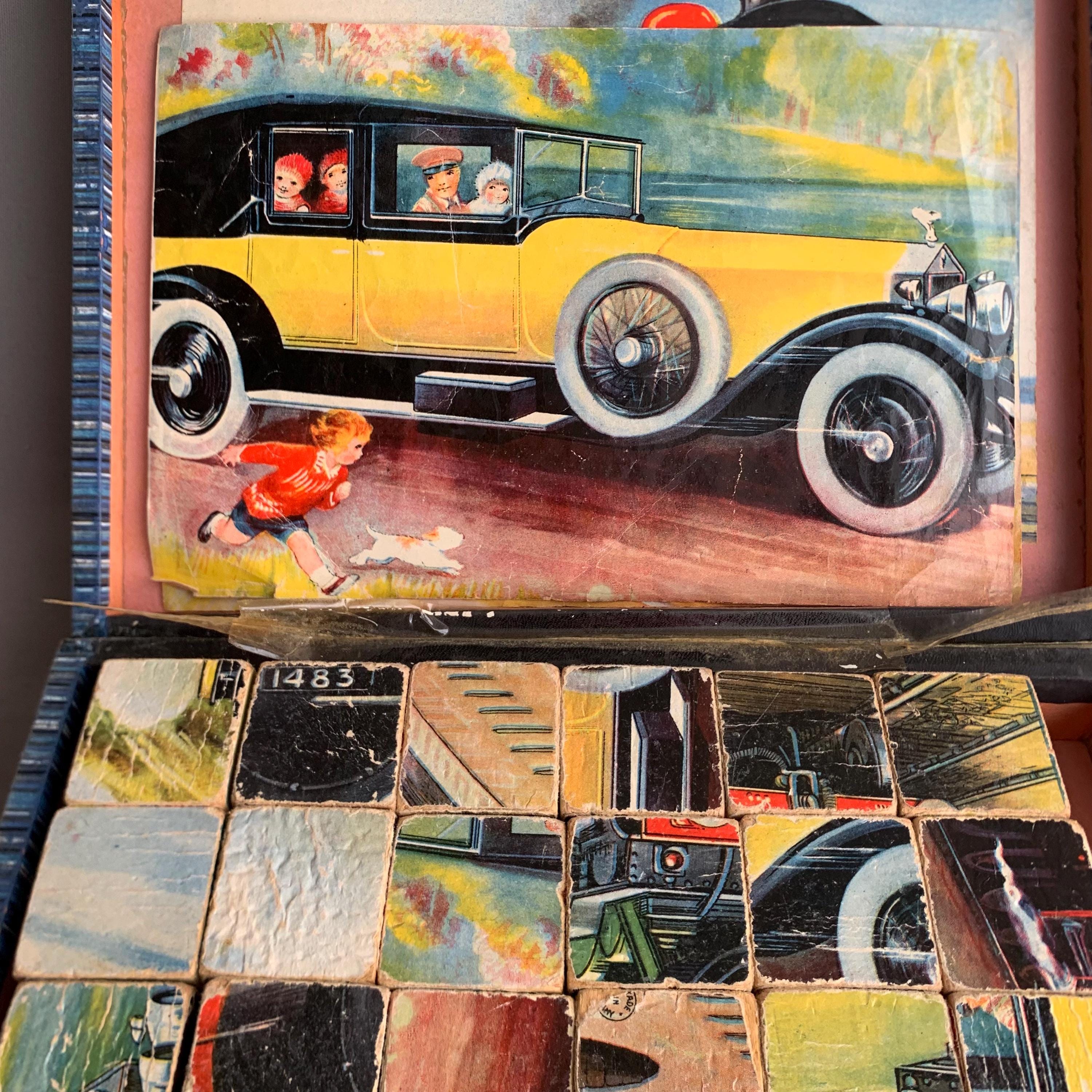 A vintage wooden cube picture puzzle, a classic mid-20th century toy. Consist of a set of six-sided wooden blocks, where each side features a different lithographed paper image, allowing the user to assemble six different complete pictures.