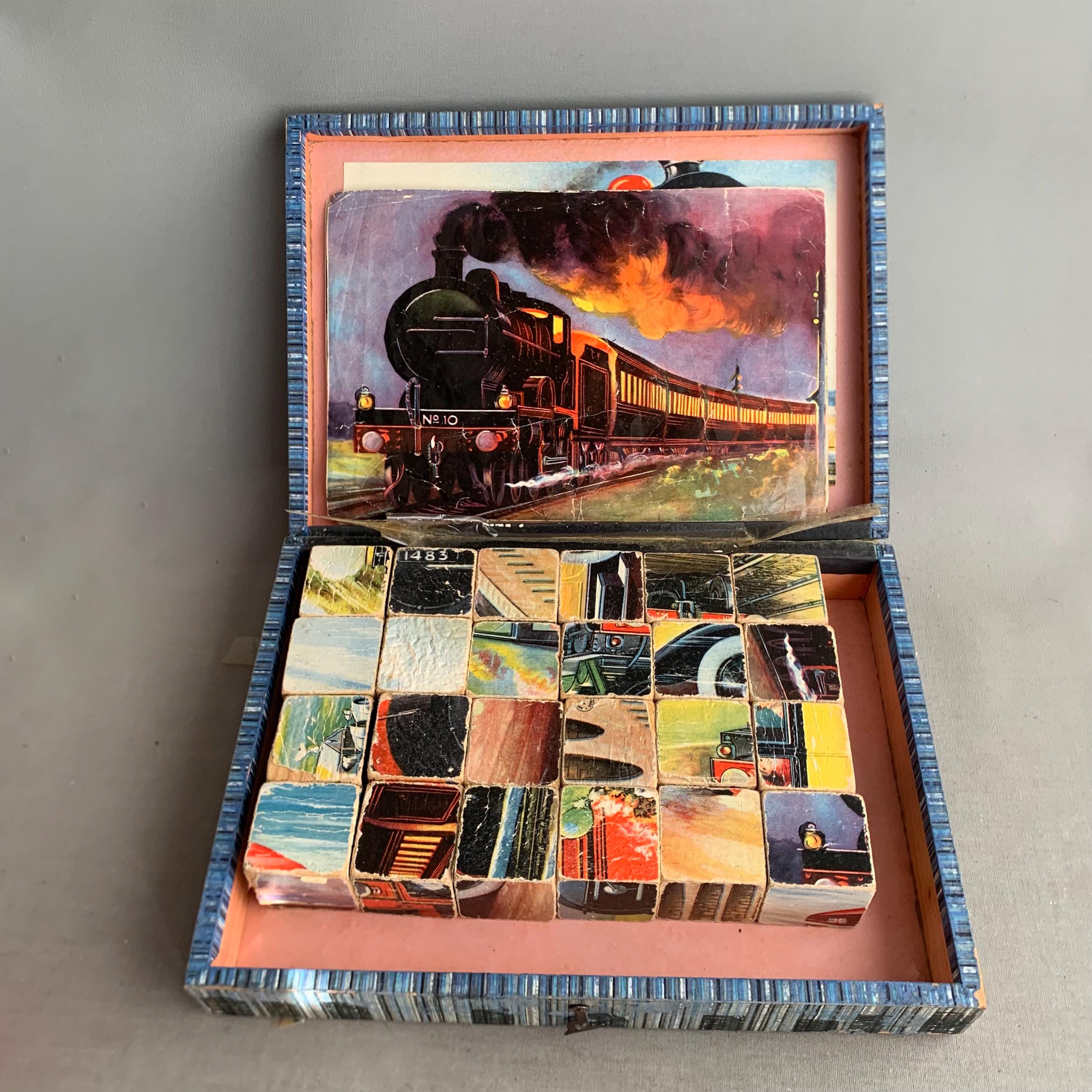 The Main Image: The lid of the box displays the "master" image for one of the puzzles, showing a steam locomotive