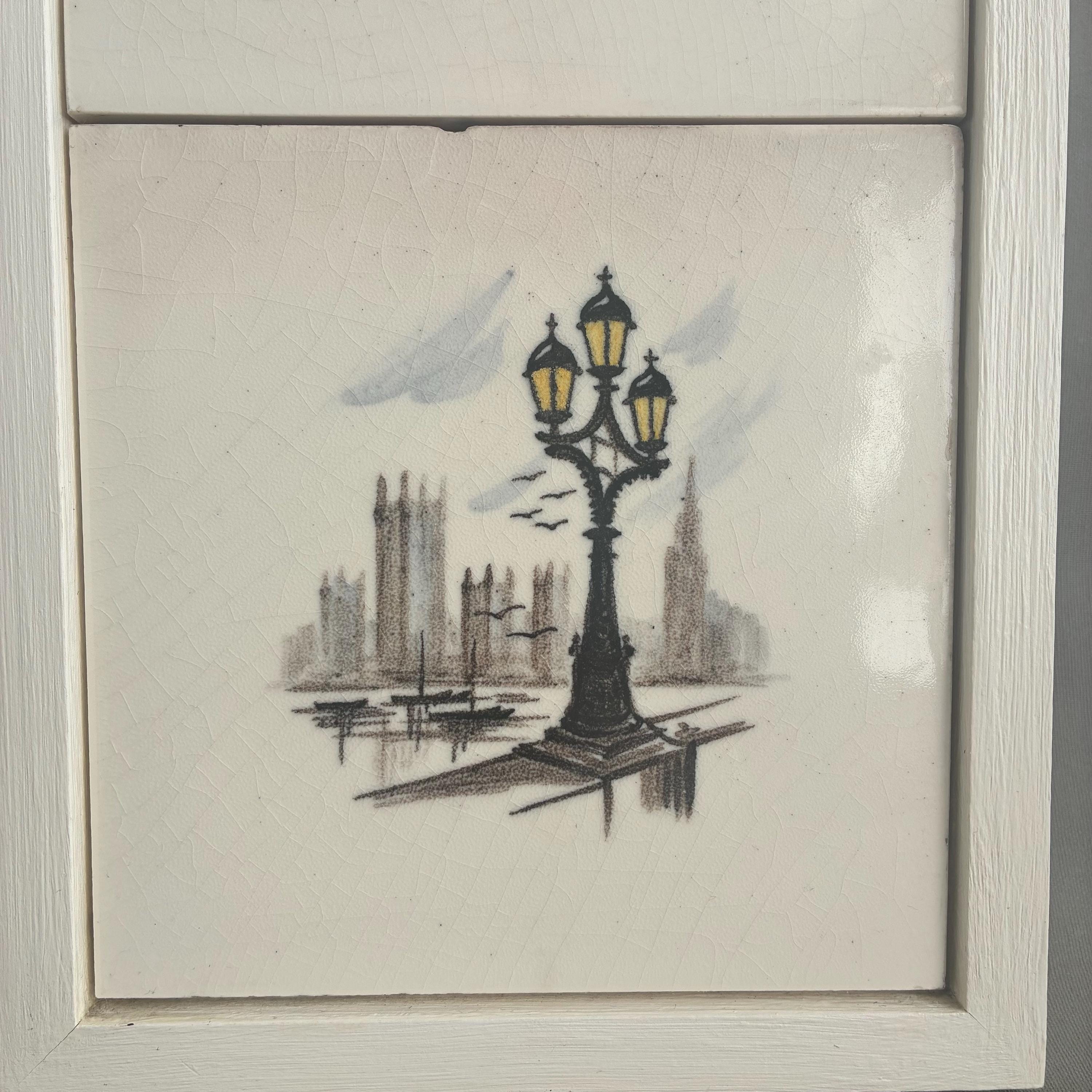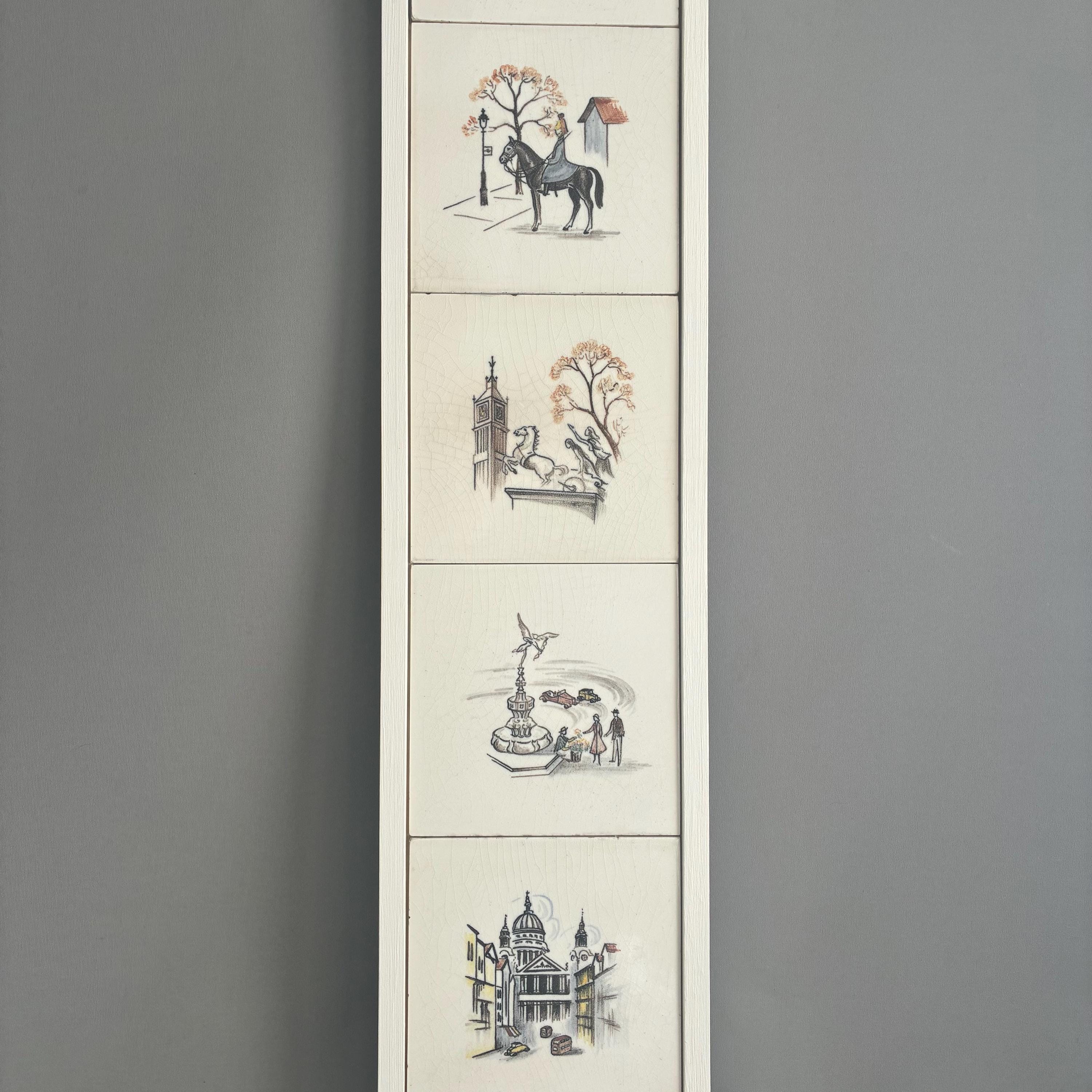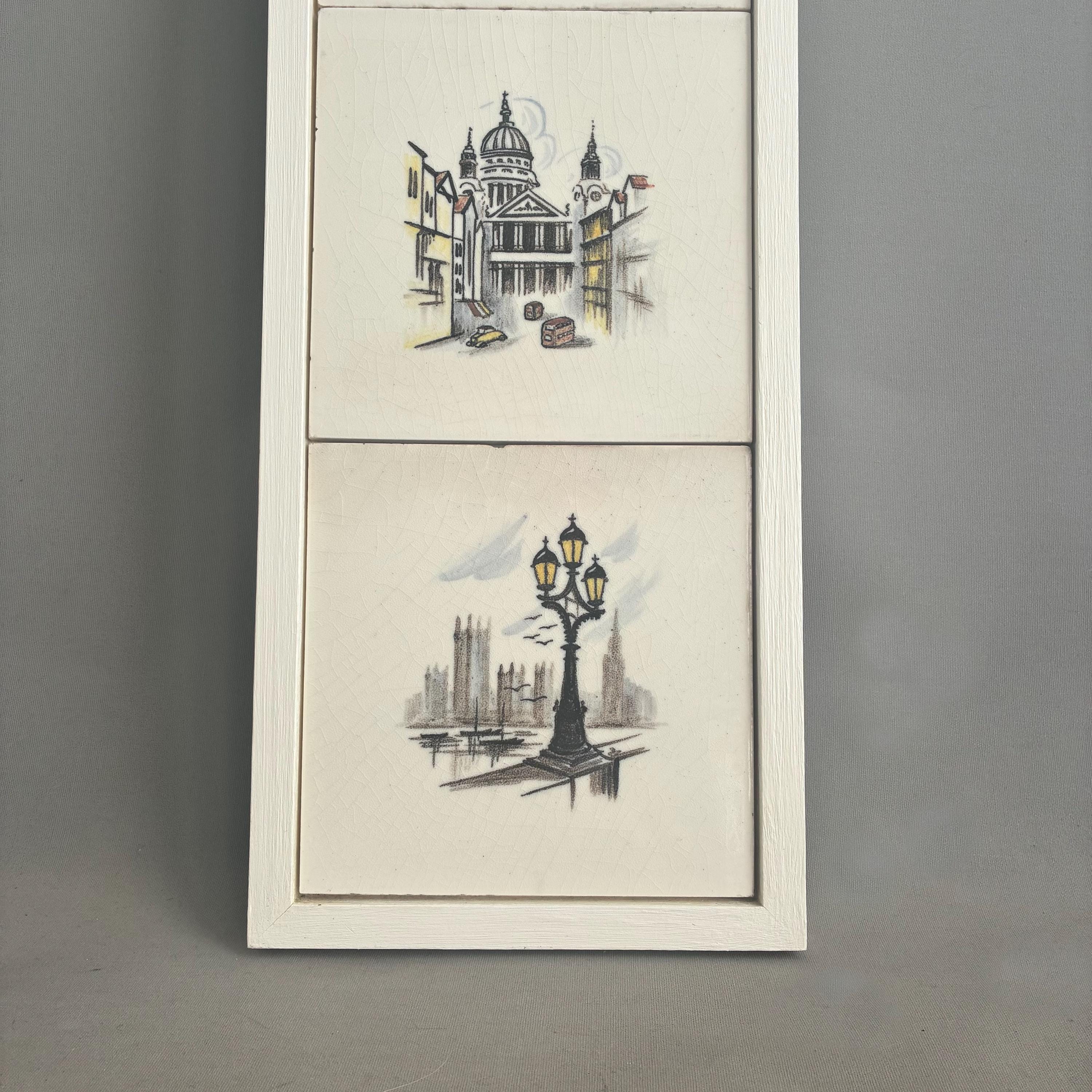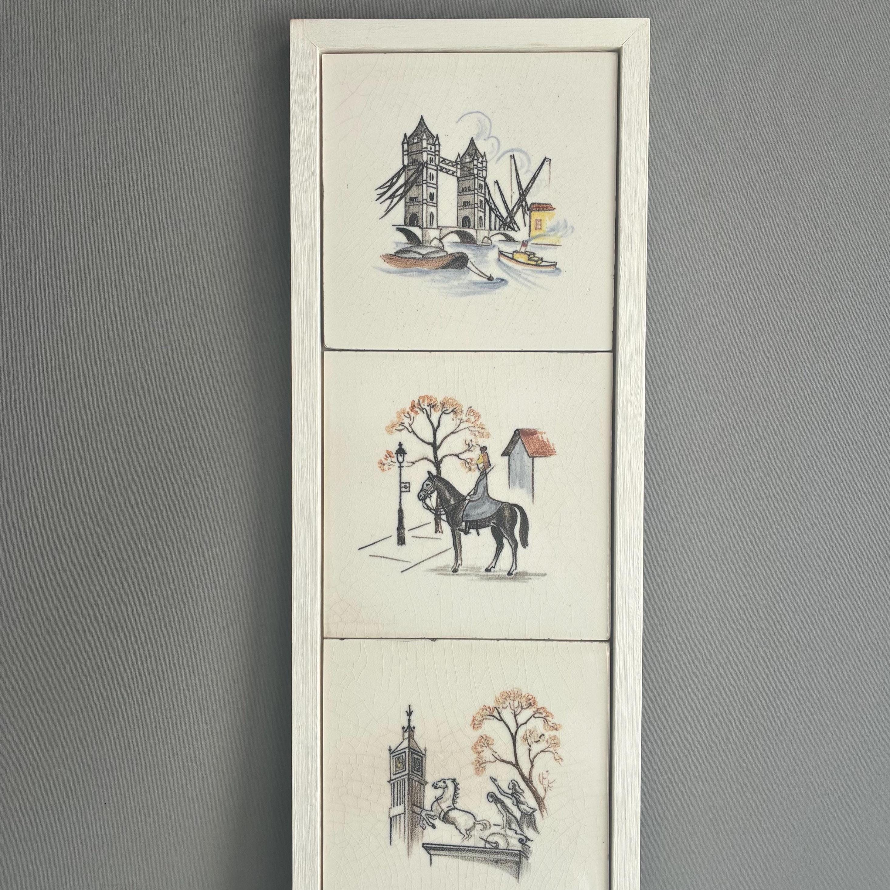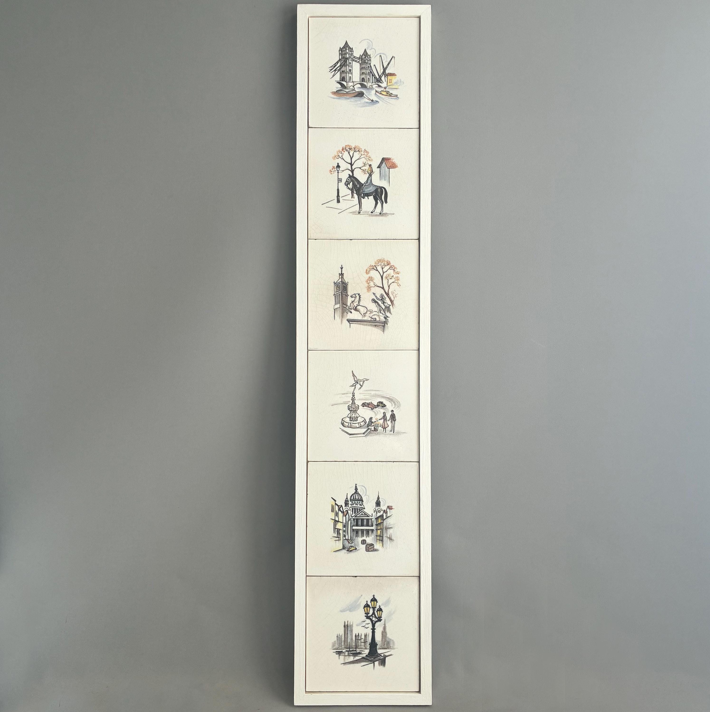 This is a really special and rare Treasure from my own private collection .There is nothing else like it out there on the web I can compare it to. Its a set of 6 hand painted tiles depicting famous and iconic scenes of London featuring tower bridge, A Queens gaurd horseman, big ben, eros picadilly circus, St pauls Cathedral and a scene of the river Thames looking over to the houses of parliment. I had the tiles professionally framed in a simple wooden box frame painted matt white with no glazing. Ready to hang. The tiles have crackled glaze, known as crazing, which is a common characteristic of vintage or antique earthenware tiles. The artwork is hand-painted with a charming, illustrative style circa 1930s/1940s . It measures 18 cm wide x 94 cm tall x 2.5 cm deep.