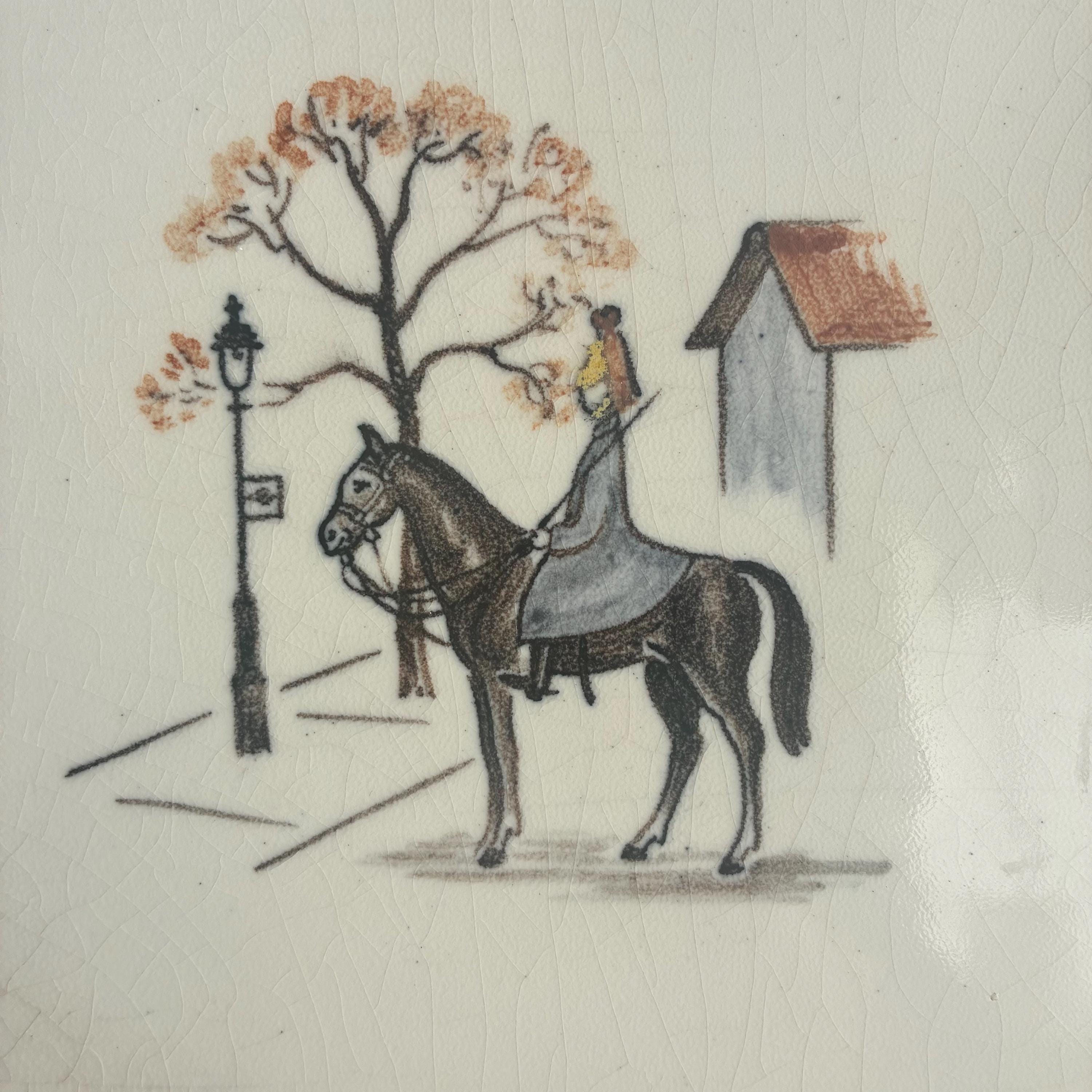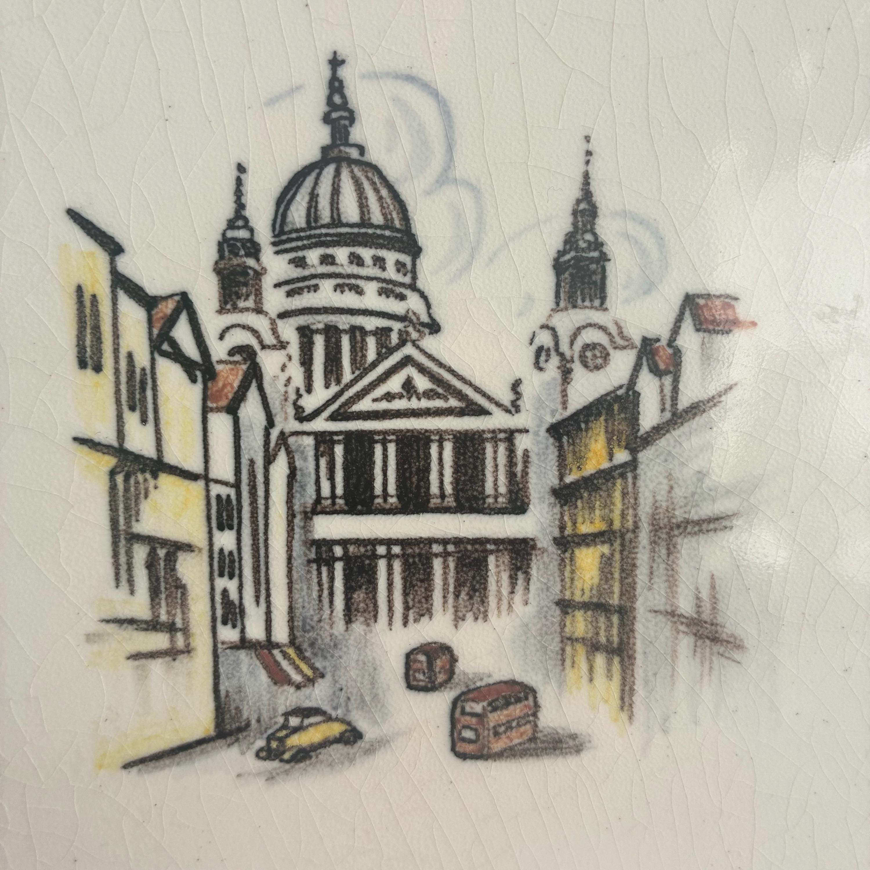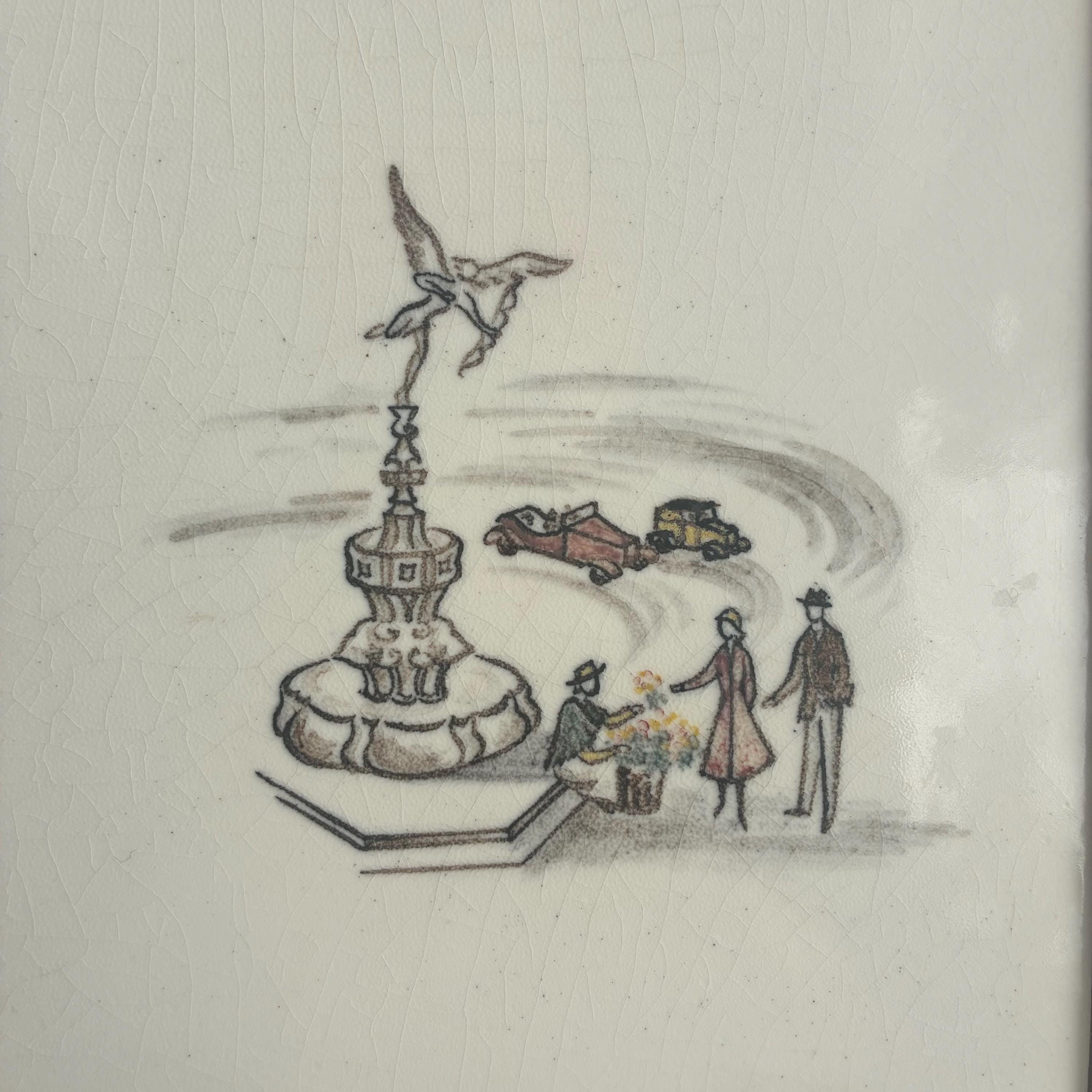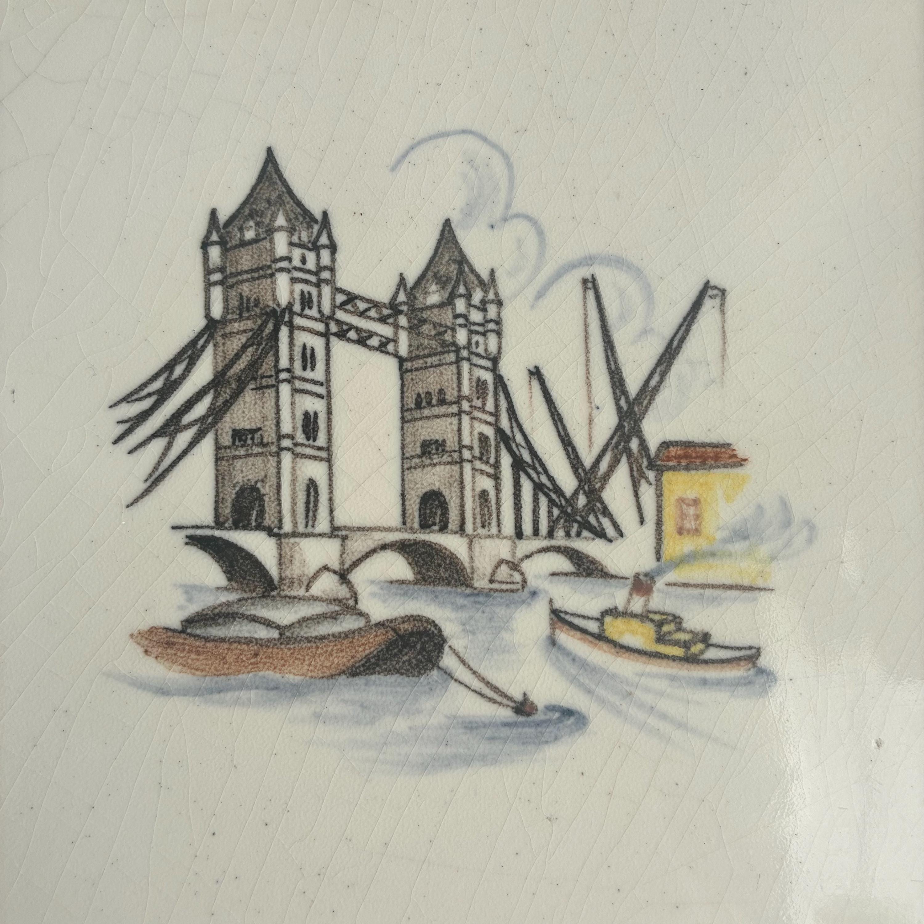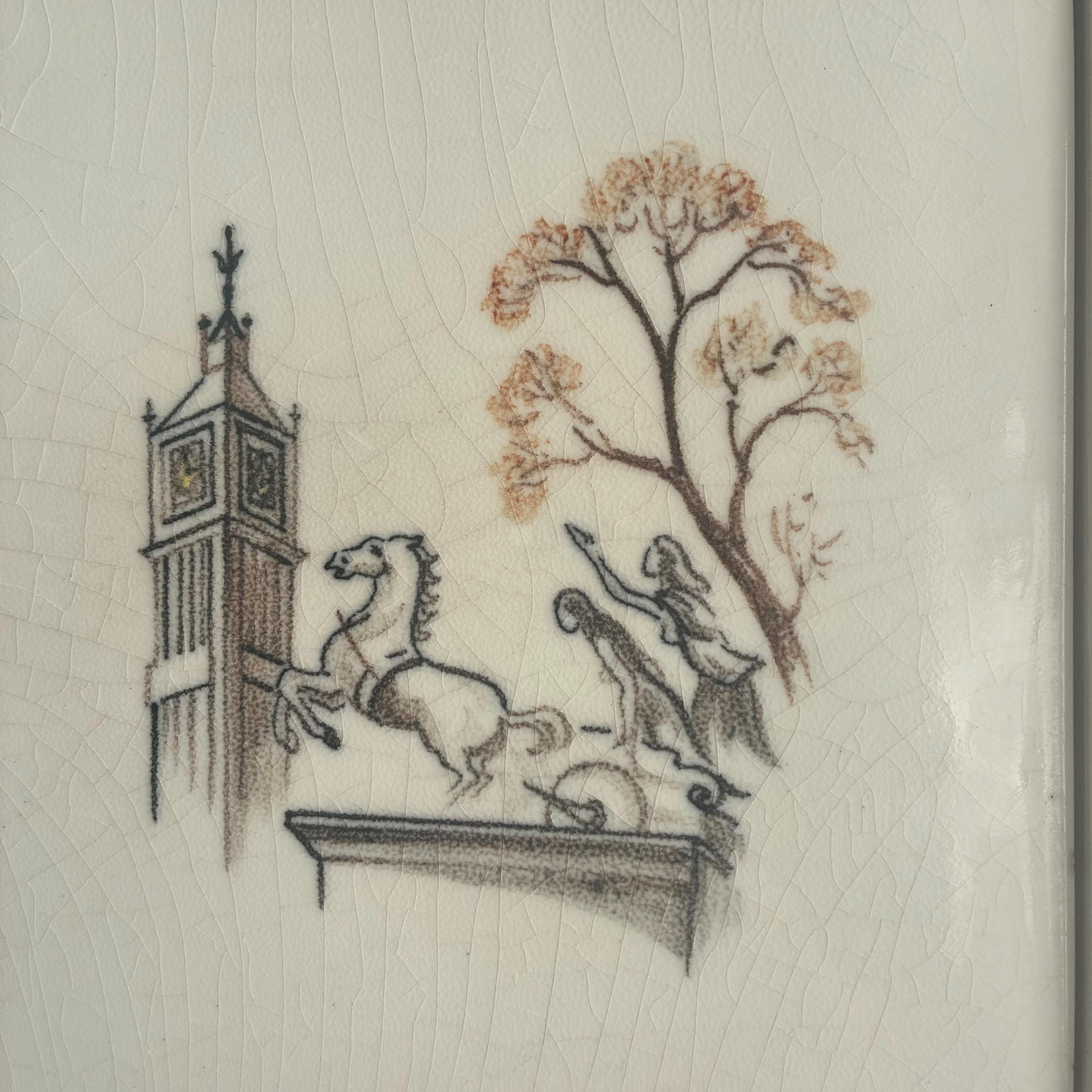 This is a really special and rare Treasure from my own private collection .There is nothing else like it out there on the web I can compare it to. Its a set of 6 hand painted tiles depicting famous and iconic scenes of London featuring tower bridge, A Queens gaurd horseman, big ben, eros picadilly circus, St pauls Cathedral and a scene of the river Thames looking over to the houses of parliment. I had the tiles professionally framed in a simple wooden box frame painted matt white with no glazing. Ready to hang. The tiles have crackled glaze, known as crazing, which is a common characteristic of vintage or antique earthenware tiles. The artwork is hand-painted with a charming, illustrative style circa 1930s/1940s . It measures 18 cm wide x 94 cm tall x 2.5 cm deep.