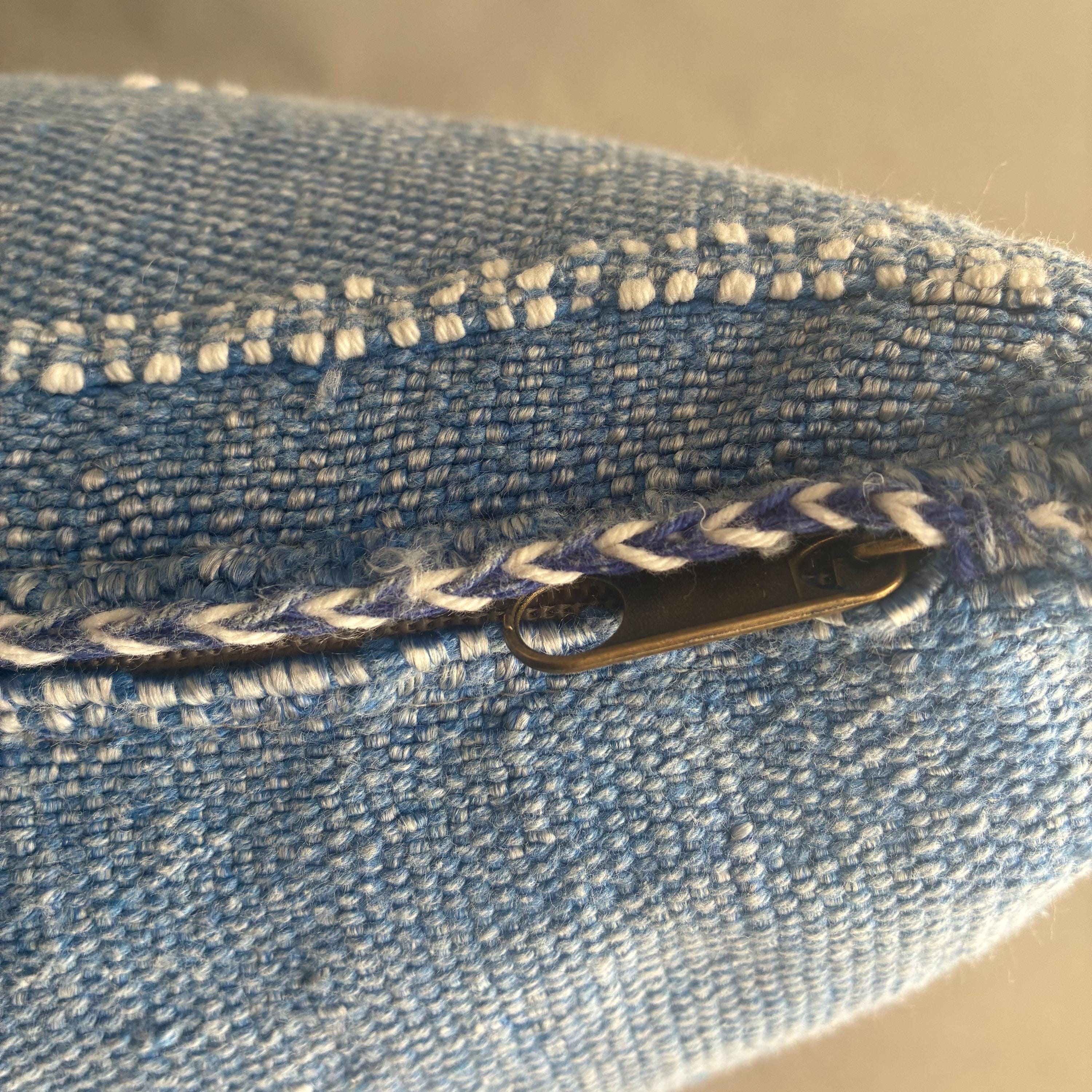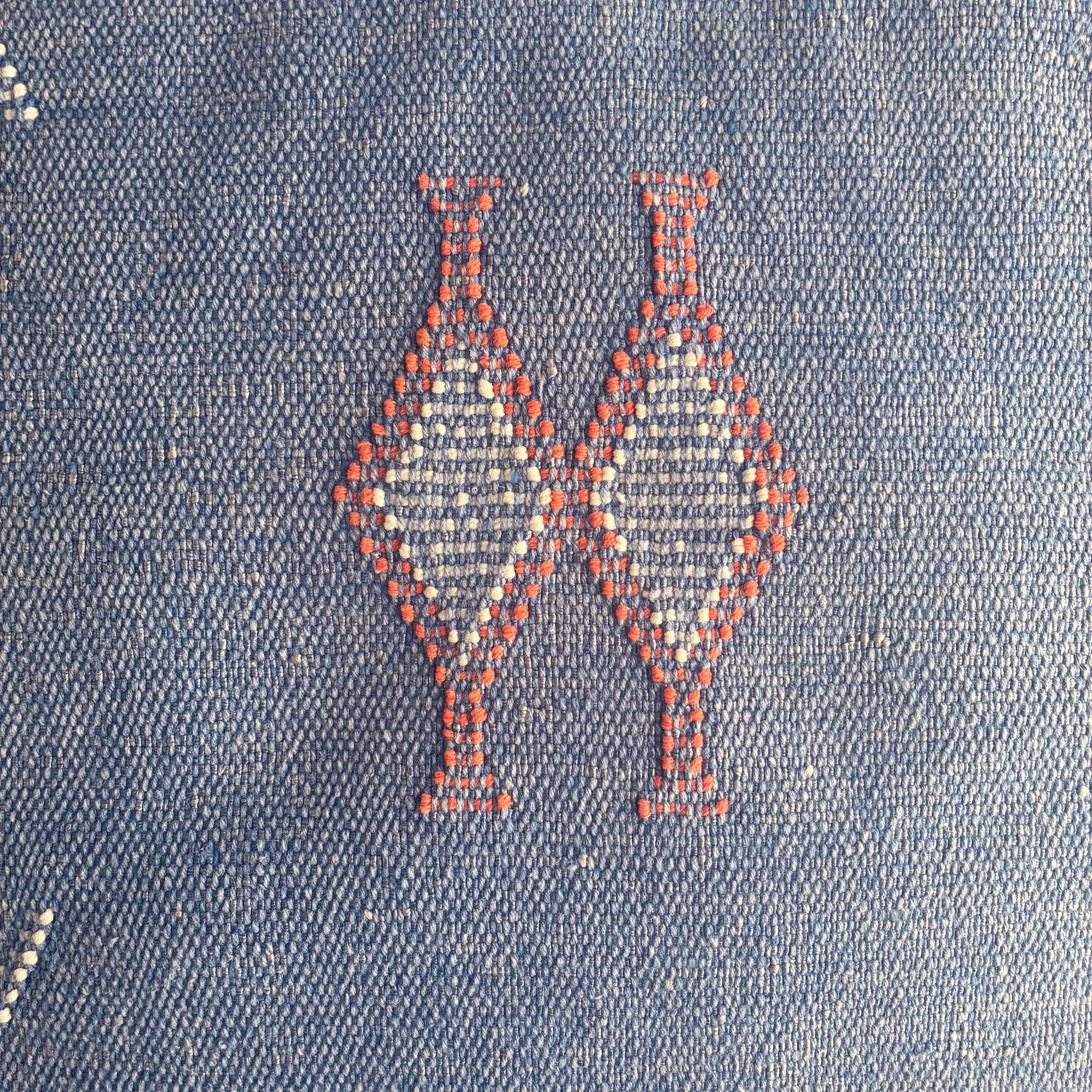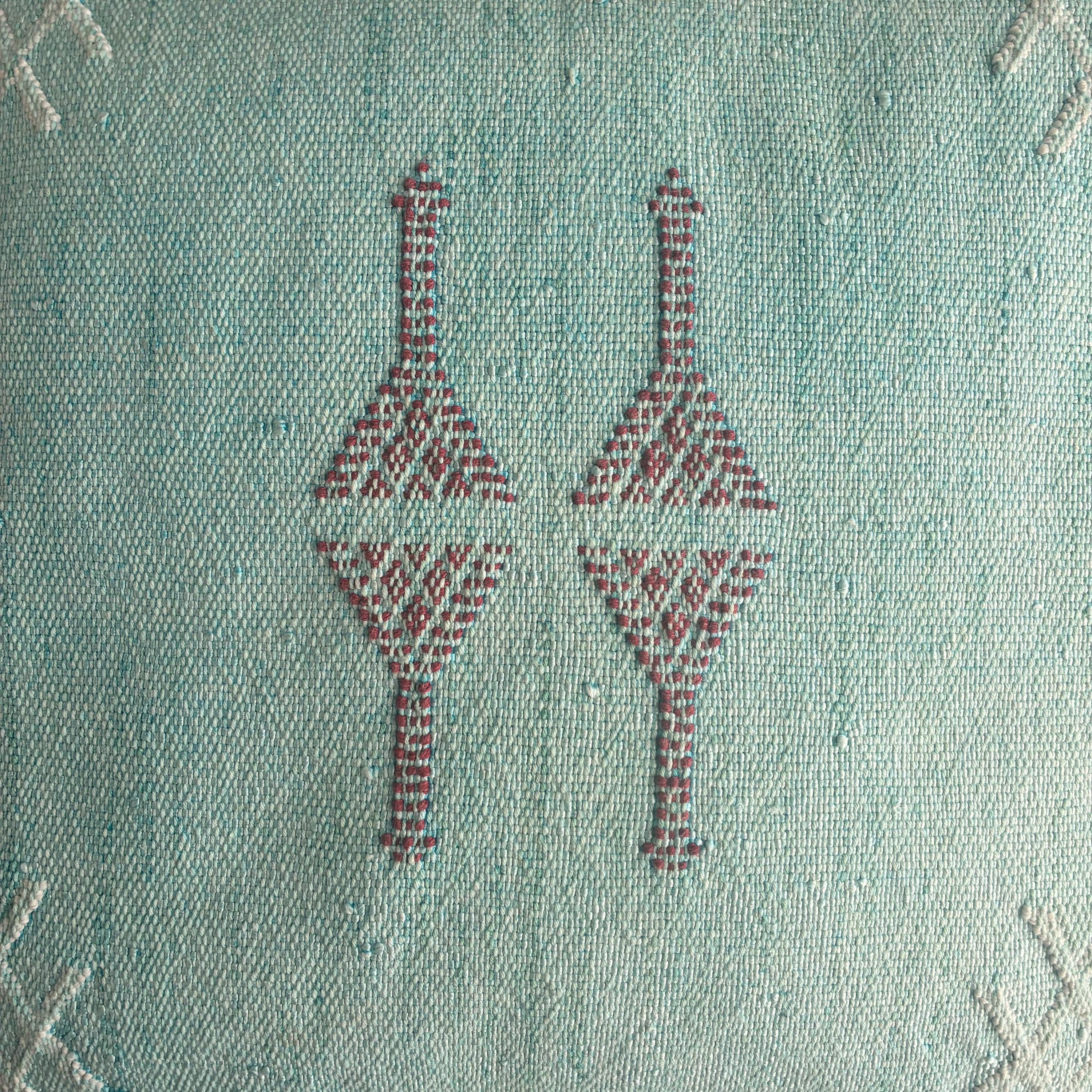 These cushions are handcrafted by artisans in Morocco using fibers derived from the Saharan agave cactus. The fibers are woven with cotton and camel wool on traditional wooden looms, then naturally dyed with botanical pigments.