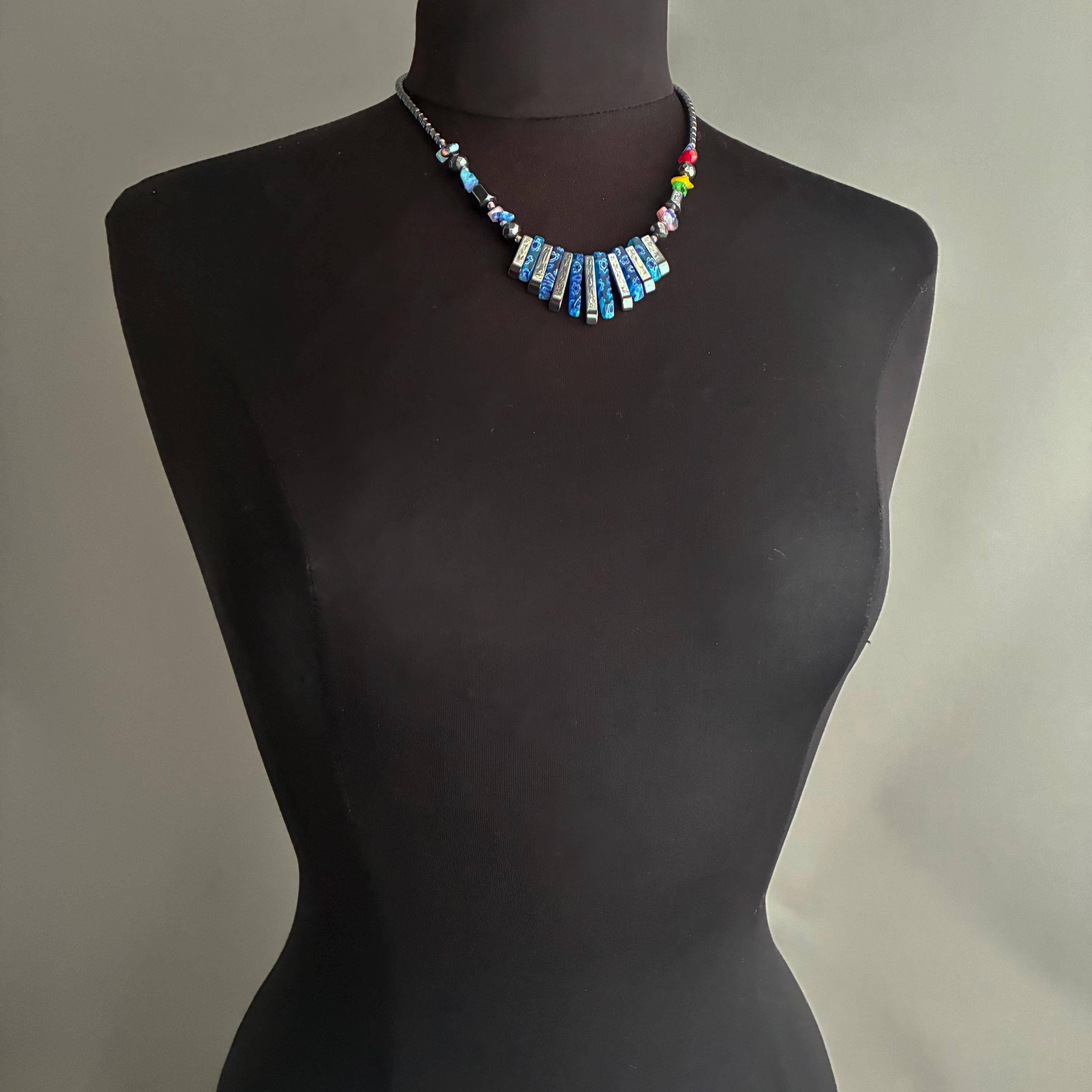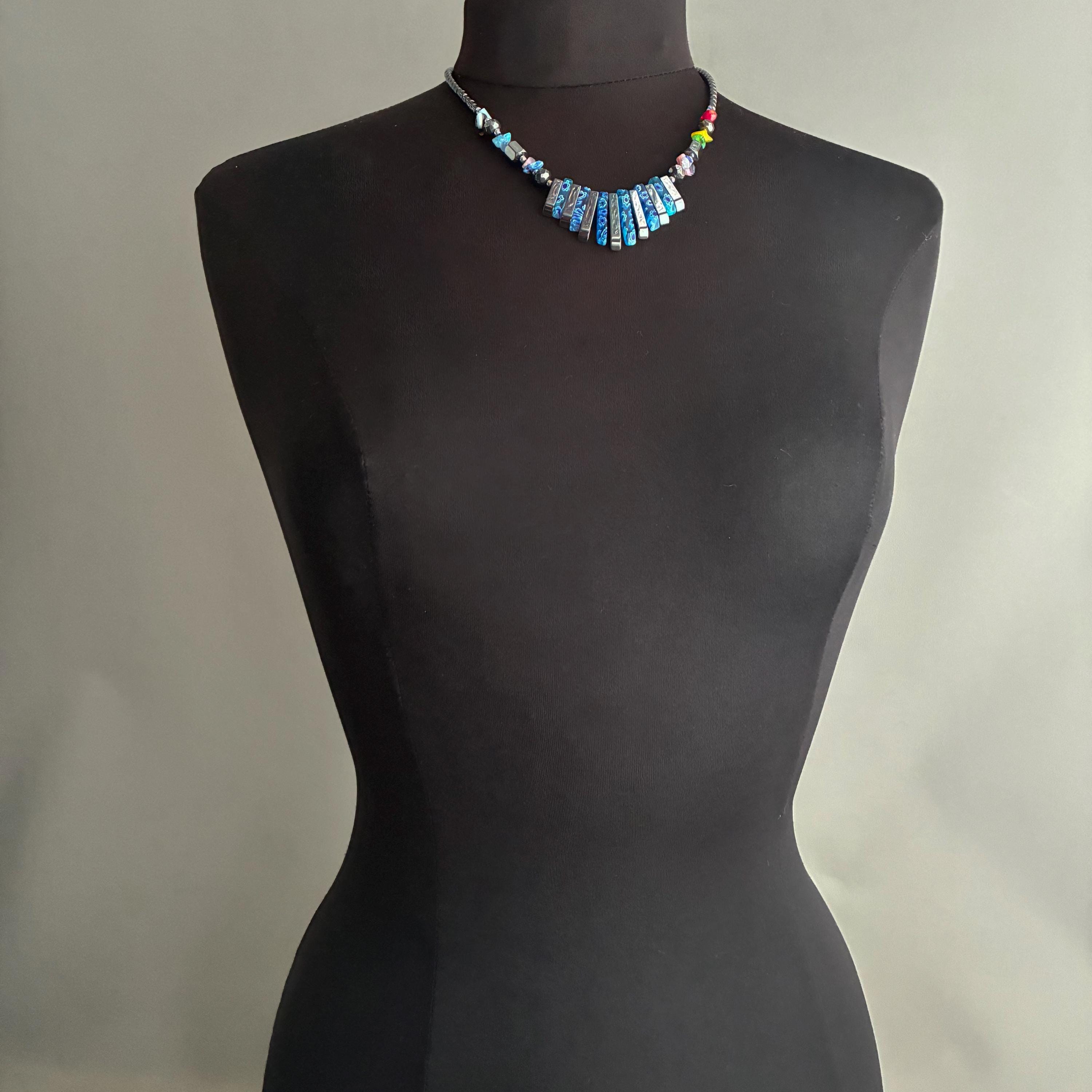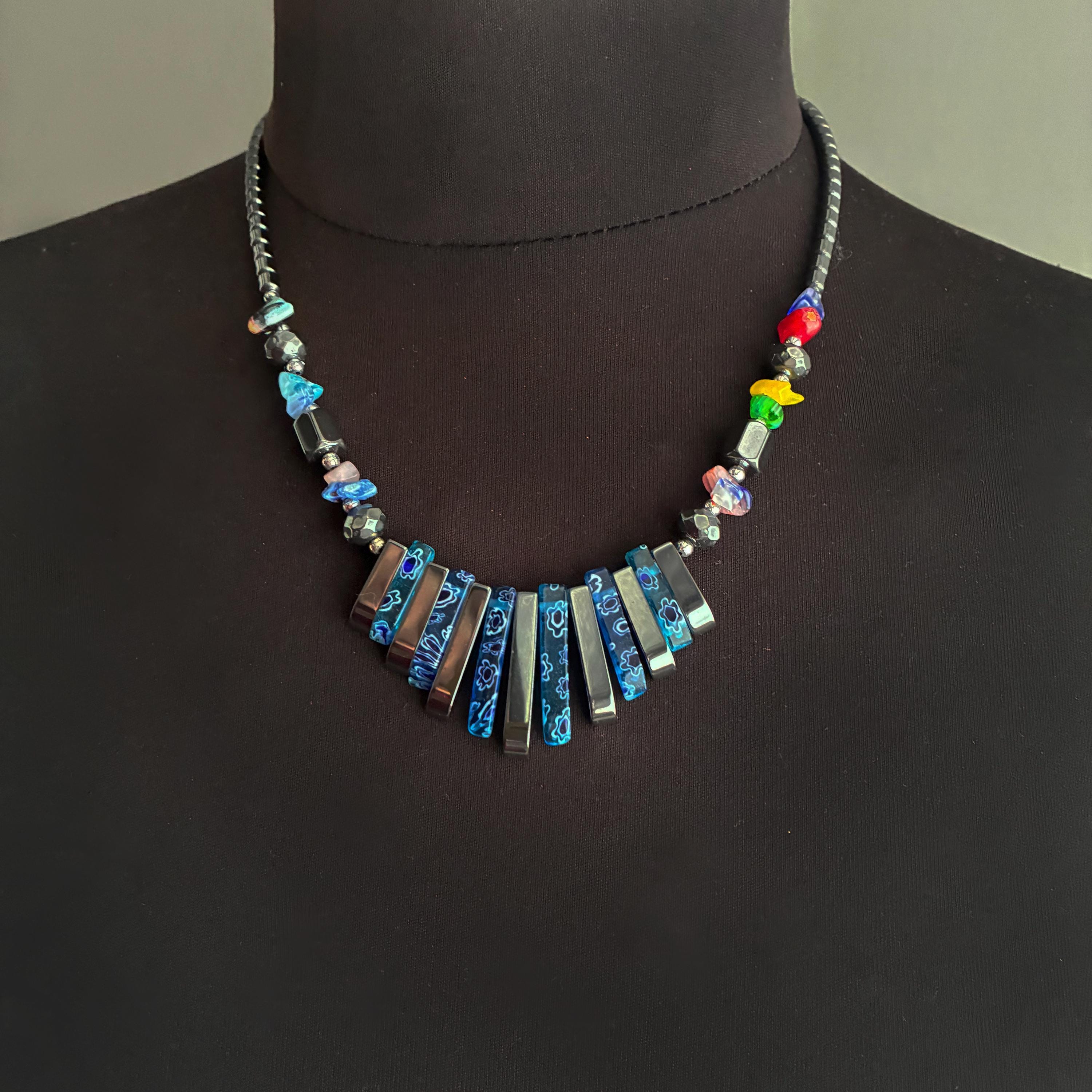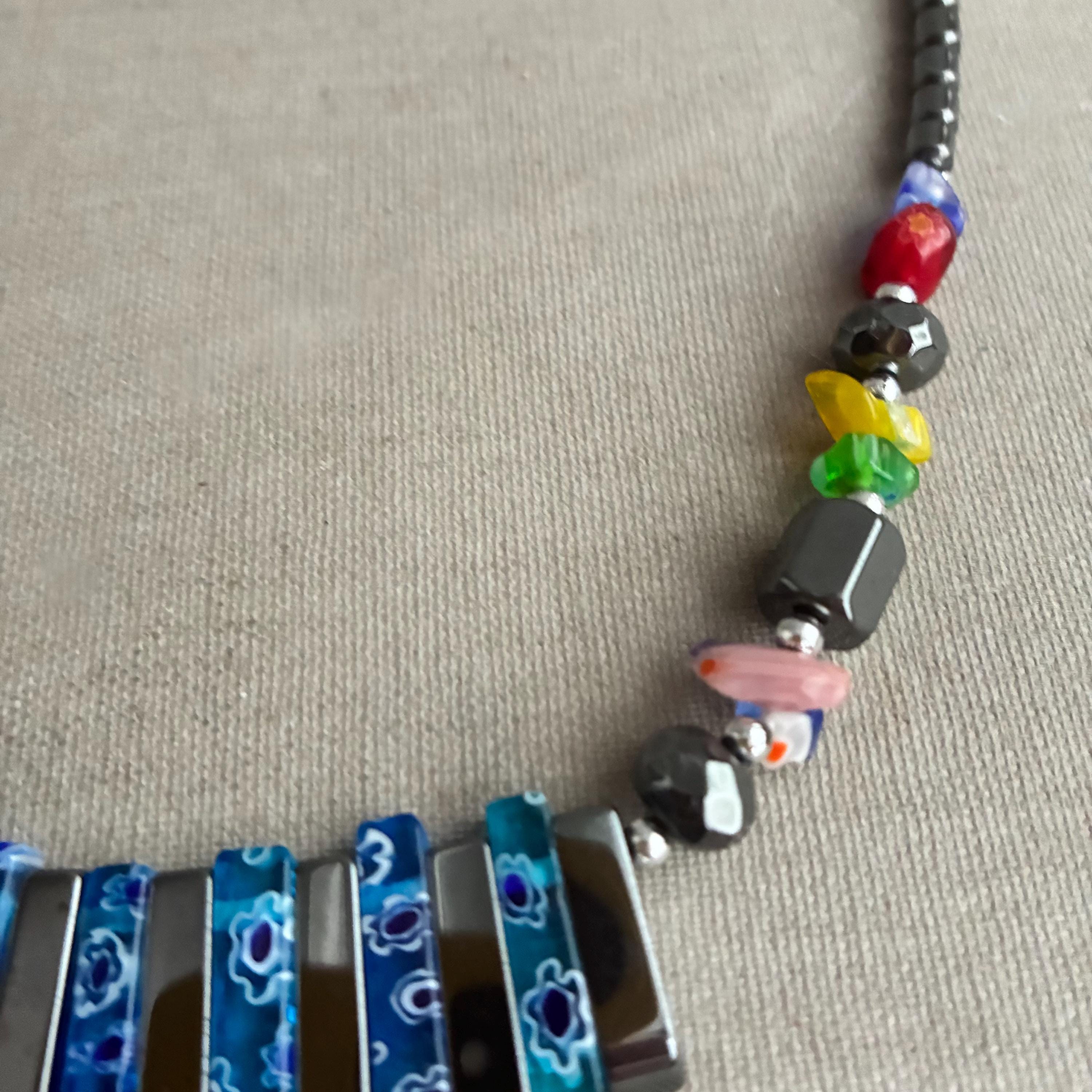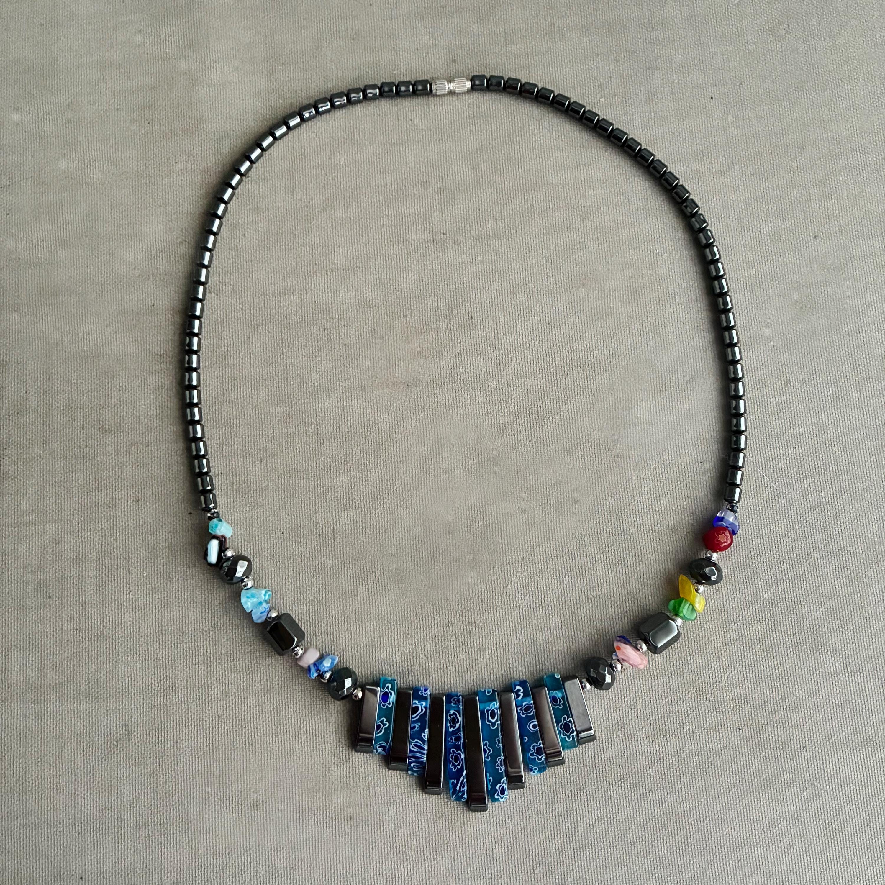 A beautiful hand strung Vintage Hematite & Floral Millefiori Art Glass Graduated Necklace , with a silver-tone metal screw clasp closure