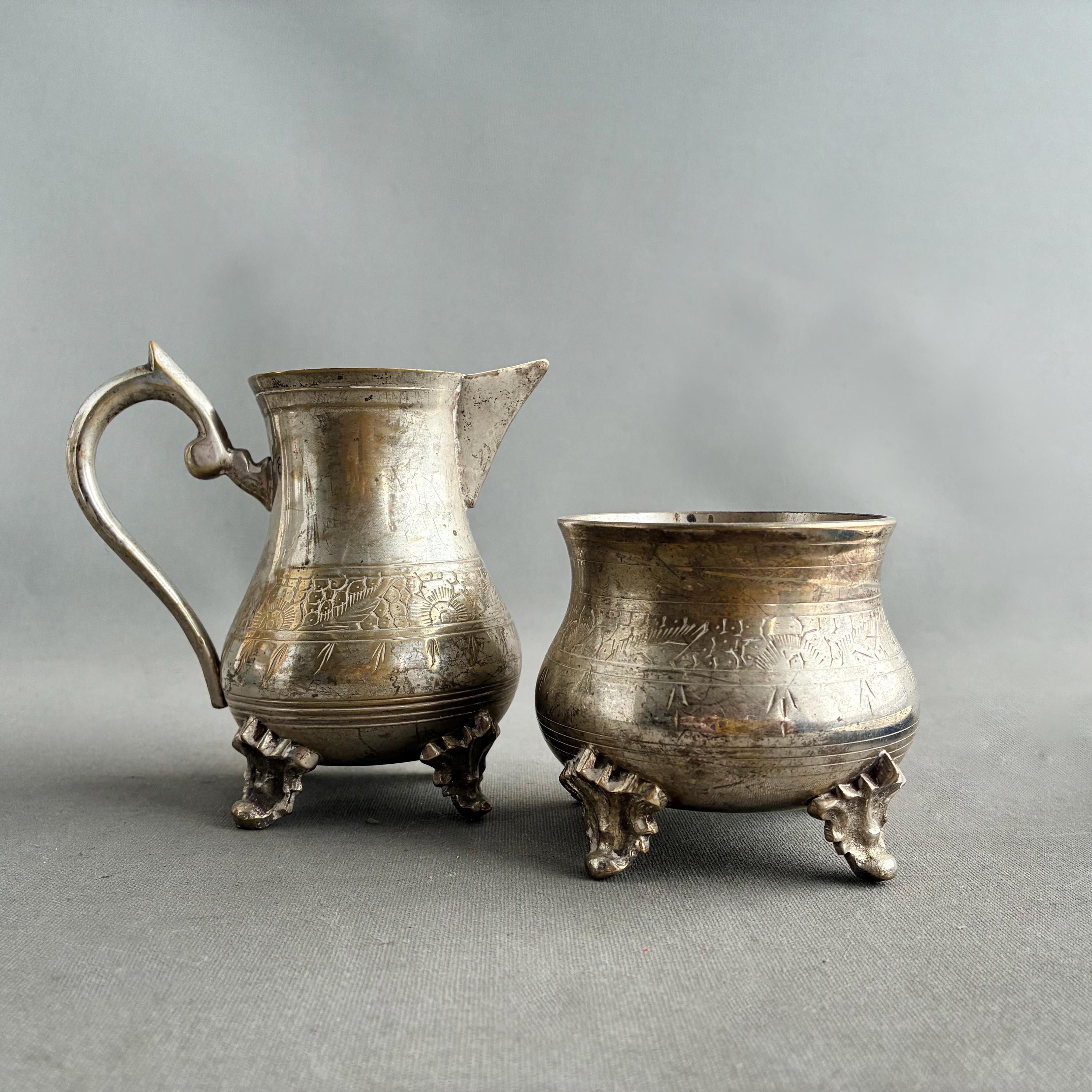 The silver-platehas worn off in places creating a natural patina with soft golden tones, reflecting their age. The tea pot is stained and the lid is a bit loose. This is a display piece/ decorative item perfect for still life