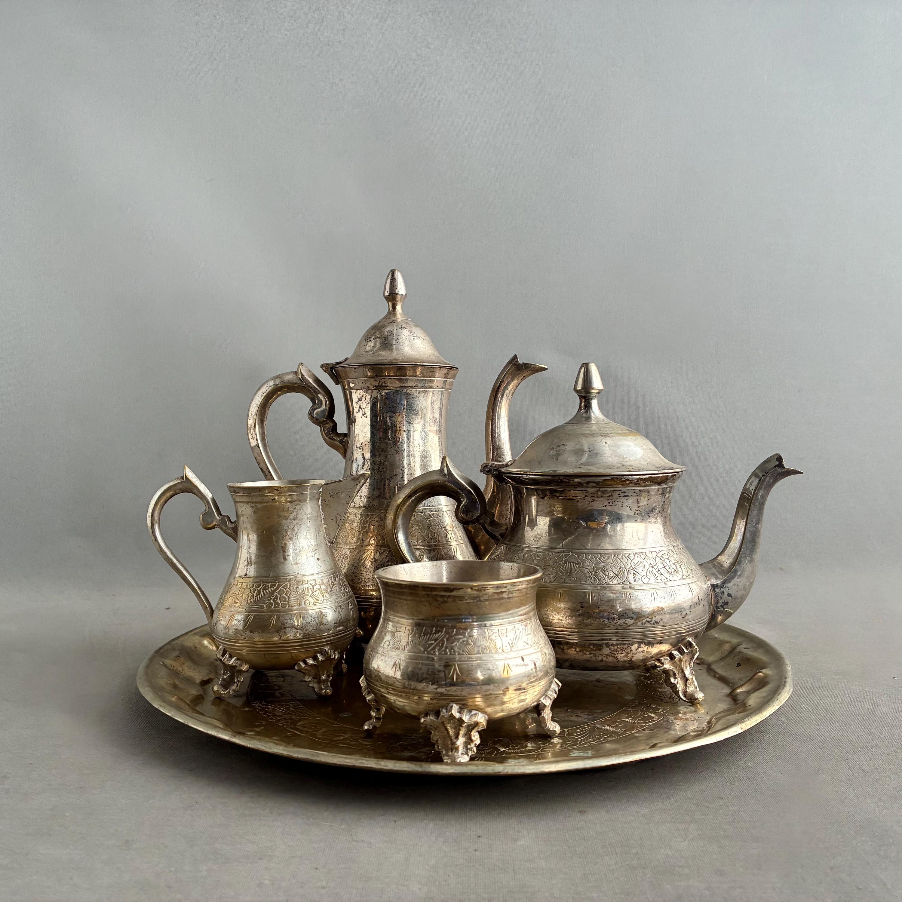 The set includes a tall hot water jug, a teapot, a sugar bowl, and a cream jug, all displayed on a large circular serving tray.