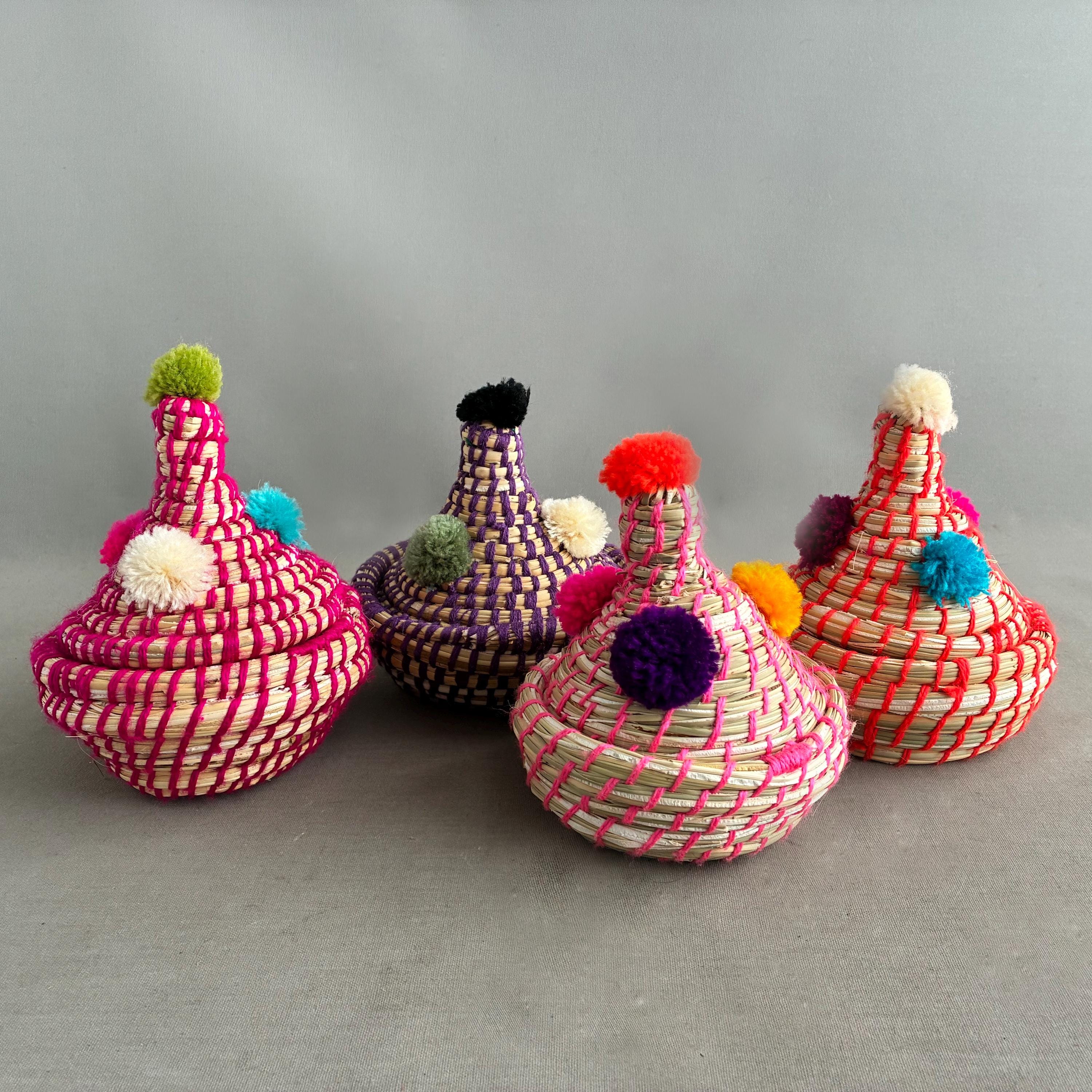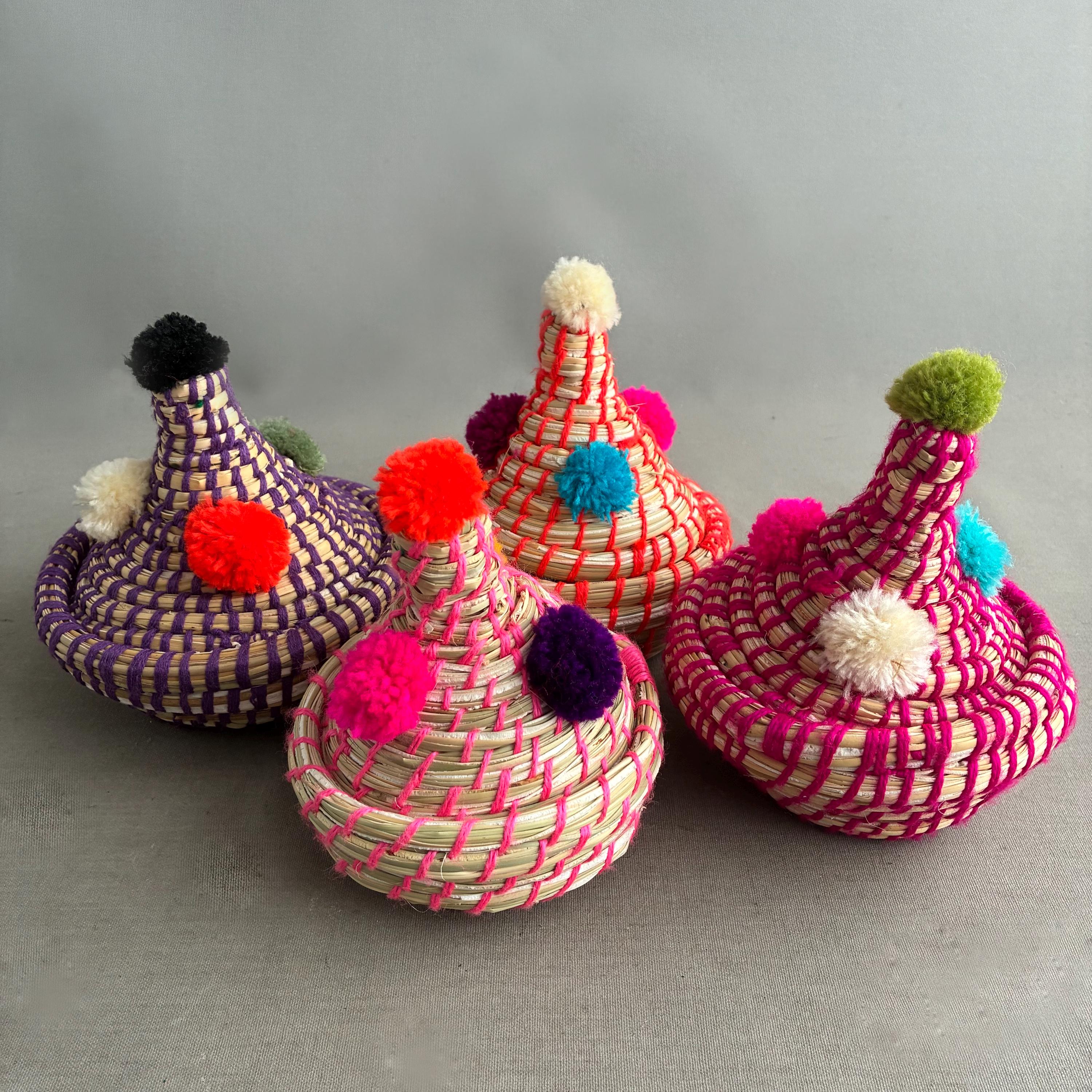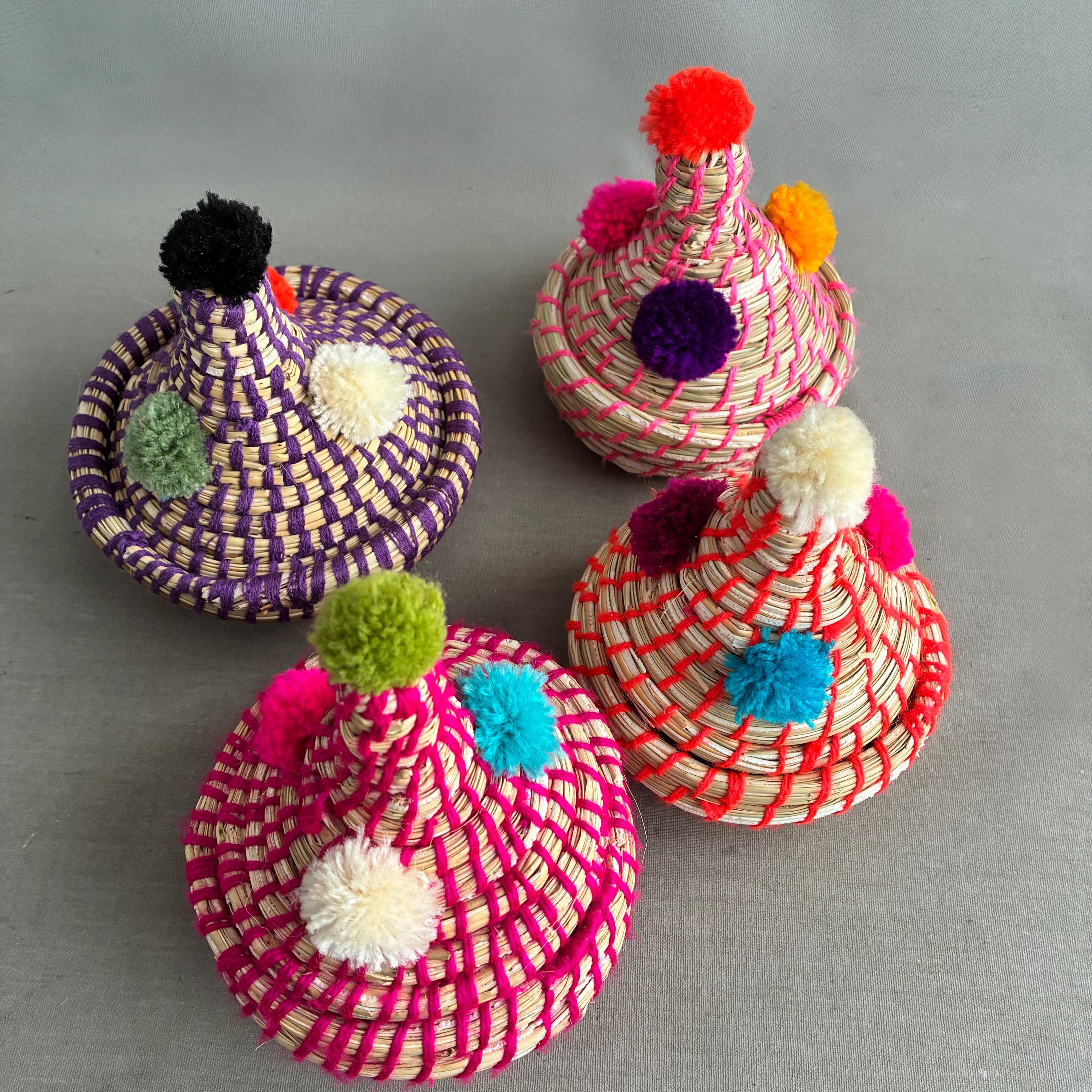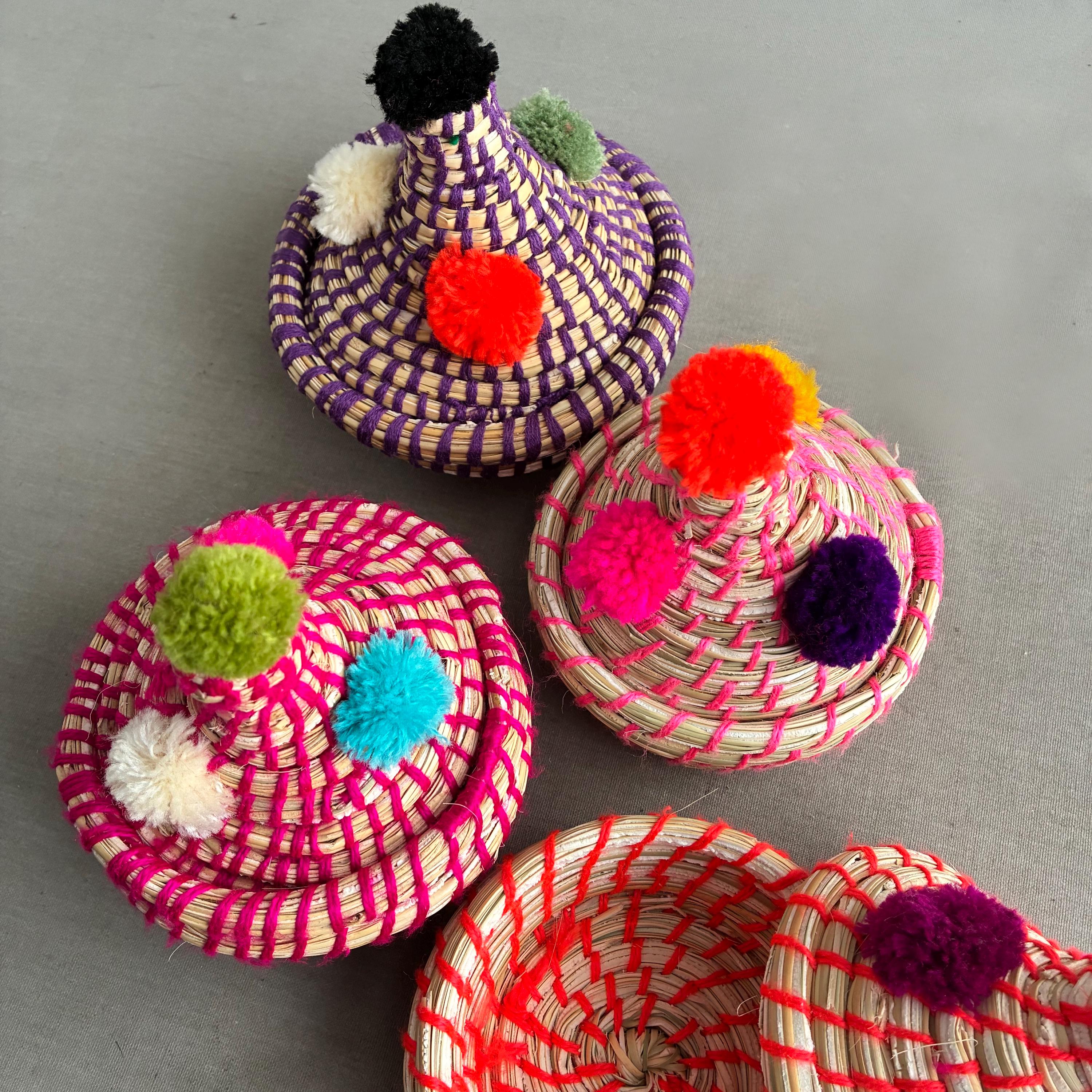 Each basket features a lid topped with vibrant wool pom-poms Made by hand by the indigenous Berber people of North Africa, primarily in Morocco. Stylish decorative storage items for small things like jewellery / cables/ Nik- naks. Fun , colourful and playfull. price per basket