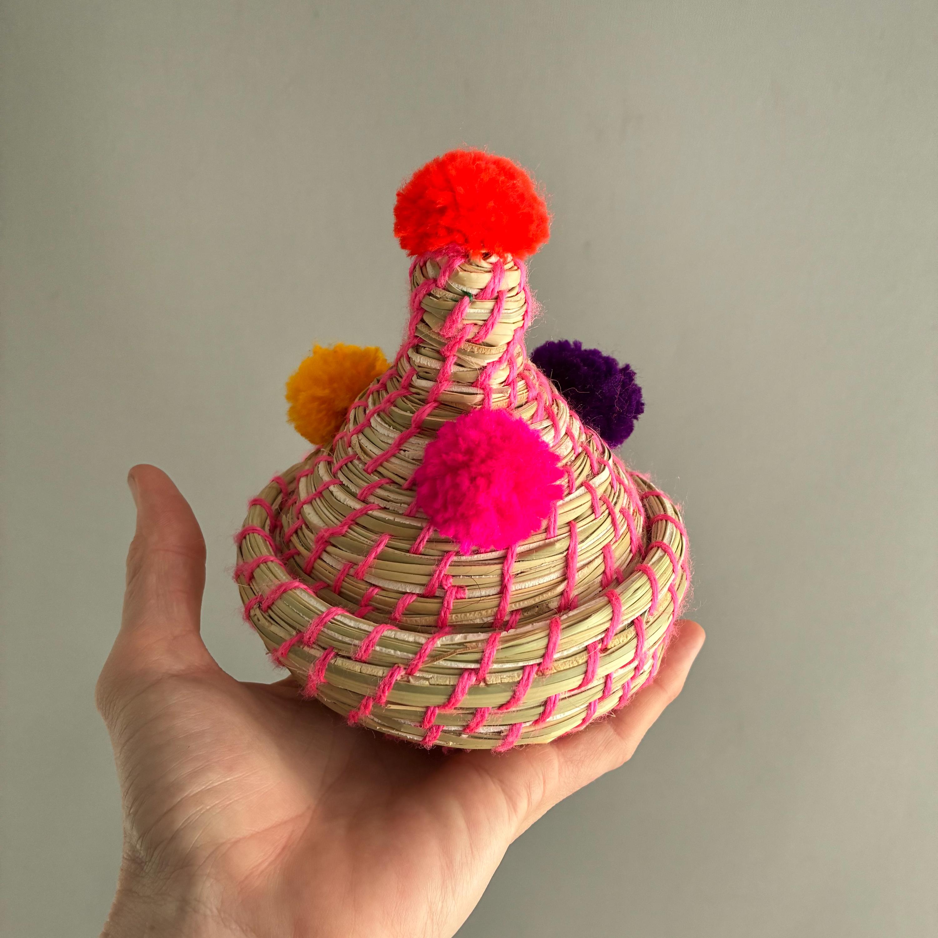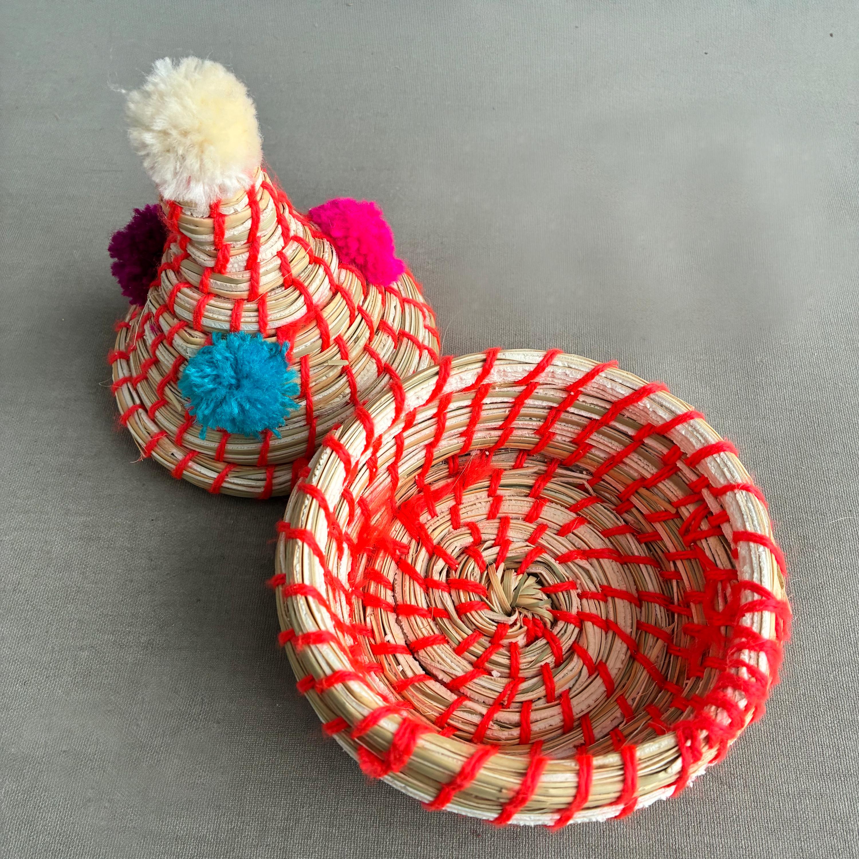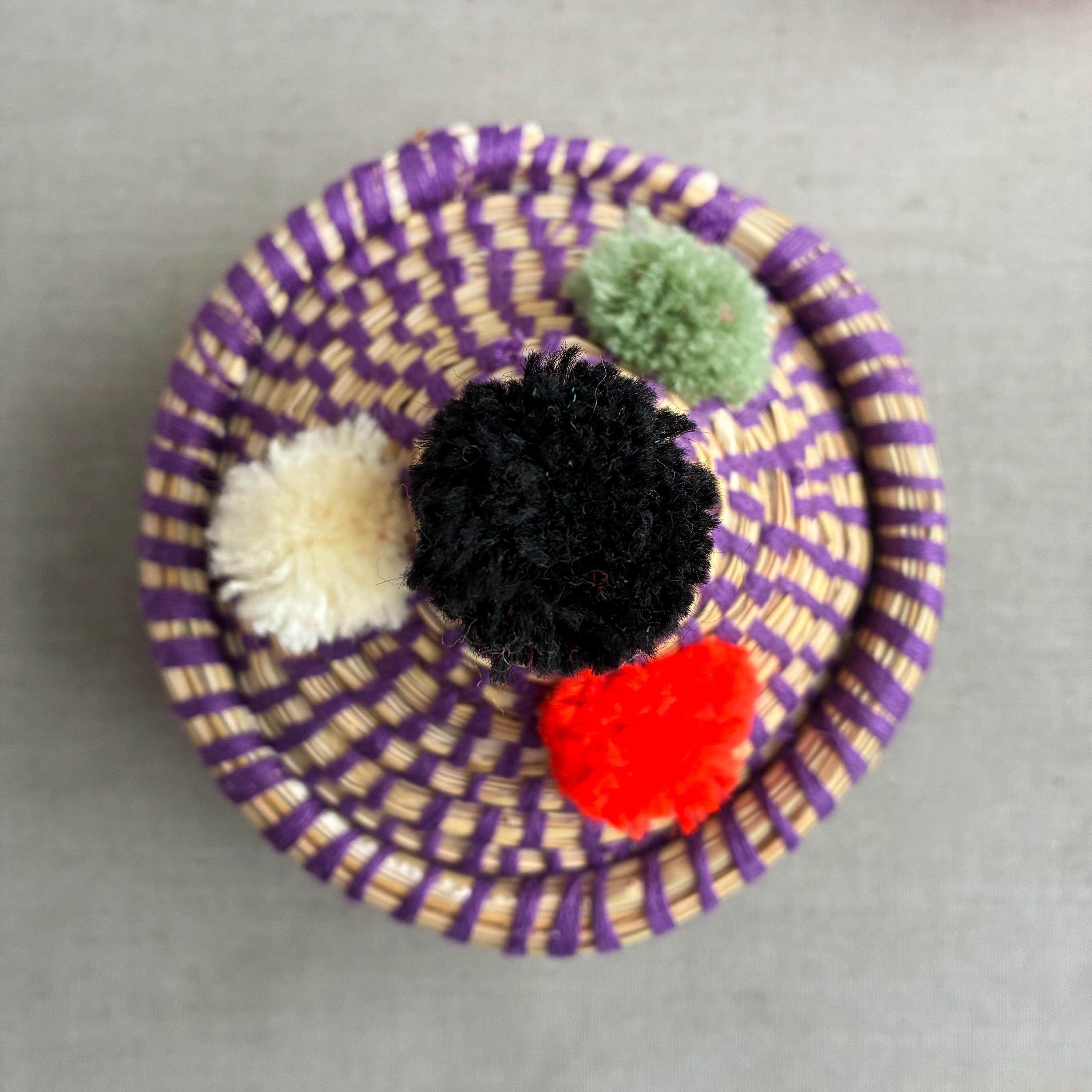 Each basket features a lid topped with vibrant wool pom-poms Made by hand by the indigenous Berber people of North Africa, primarily in Morocco. Stylish decorative storage items for small things like jewellery / cables/ Nik- naks. Fun , colourful and playfull. price per basket