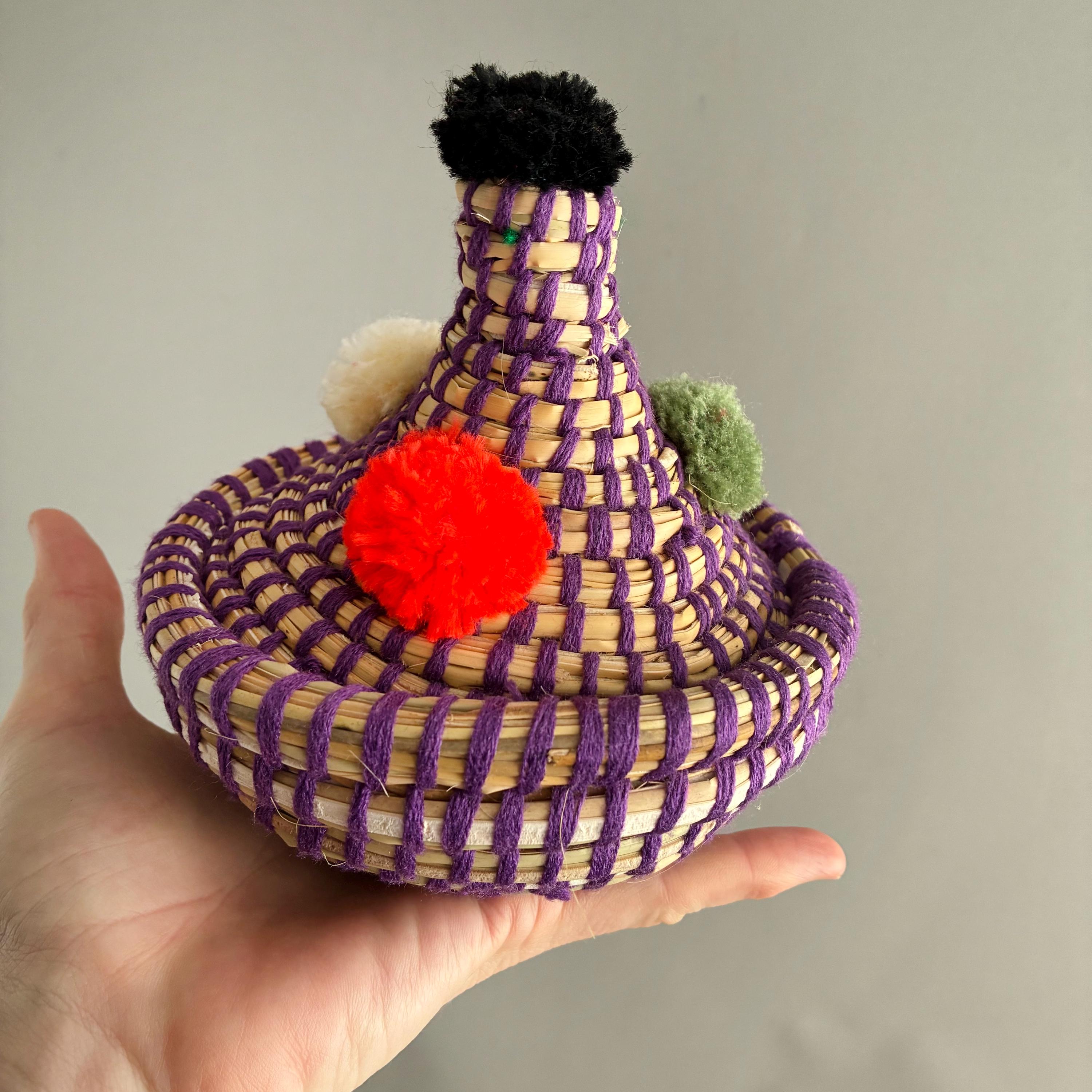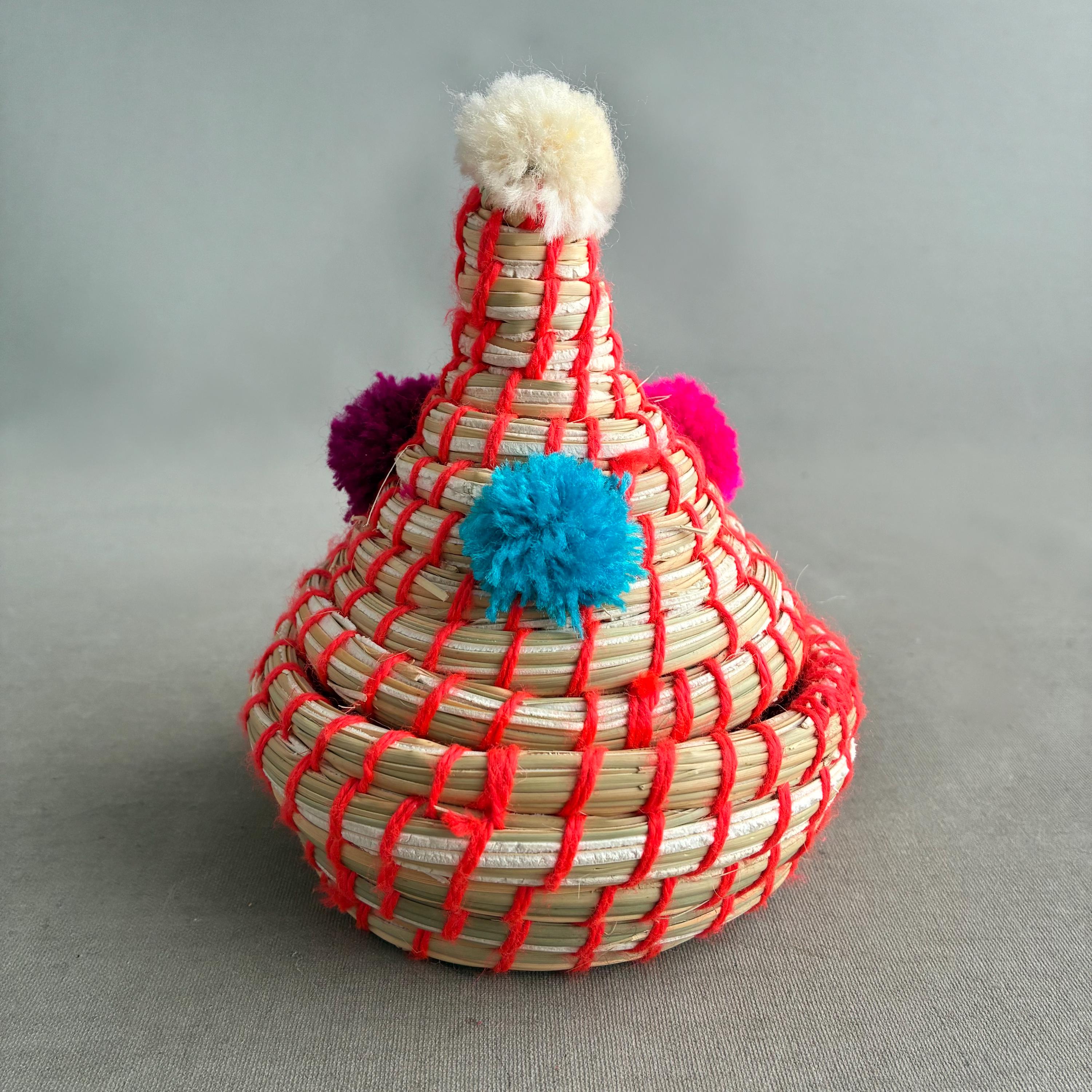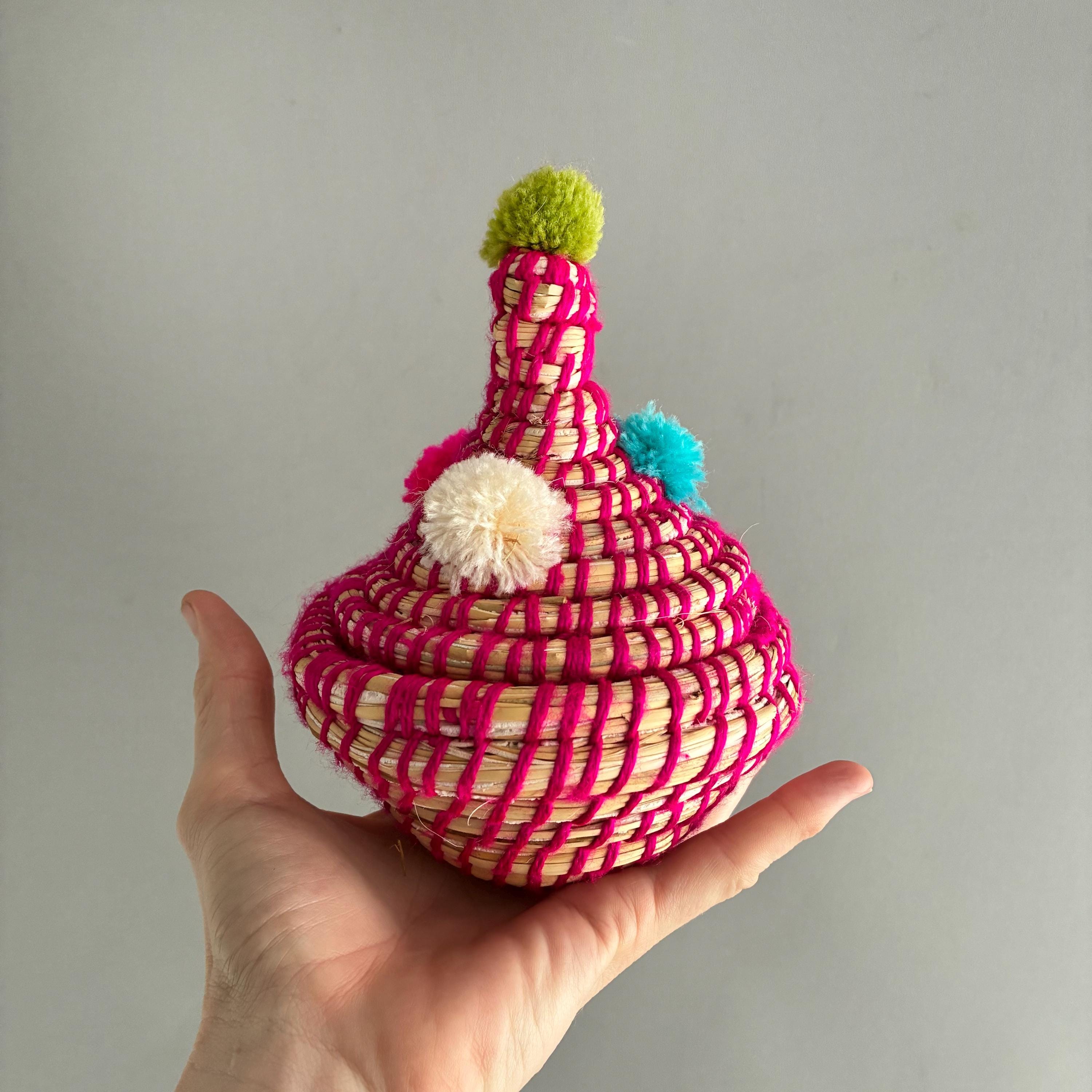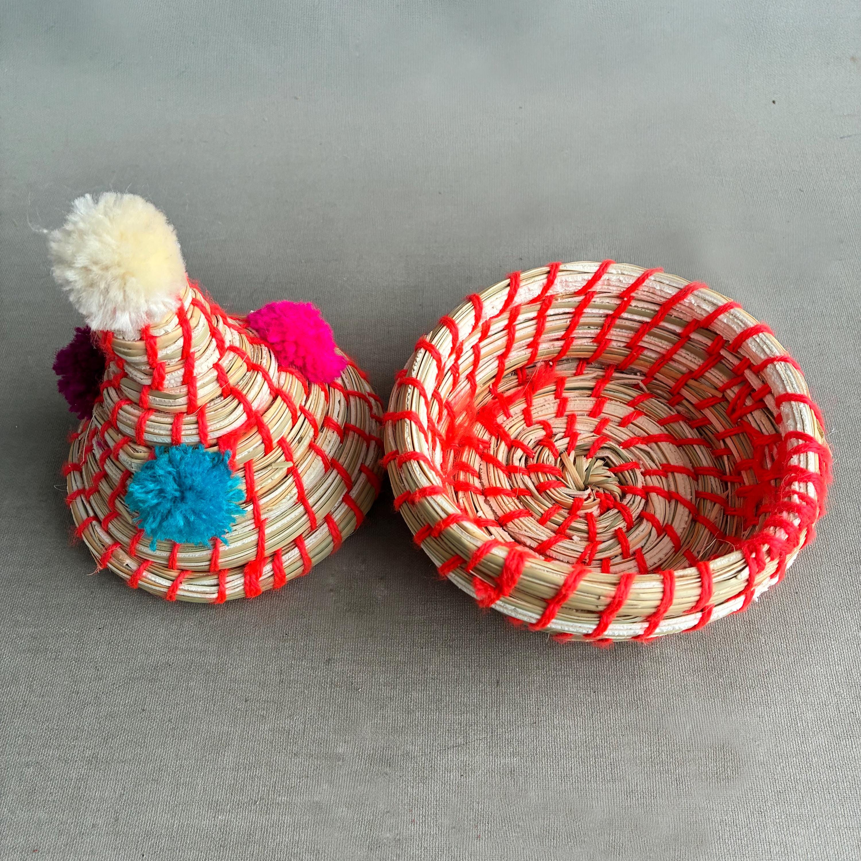 Each basket features a lid topped with vibrant wool pom-poms Made by hand by the indigenous Berber people of North Africa, primarily in Morocco. Stylish decorative storage items for small things like jewellery / cables/ Nik- naks. Fun , colourful and playfull. price per basket