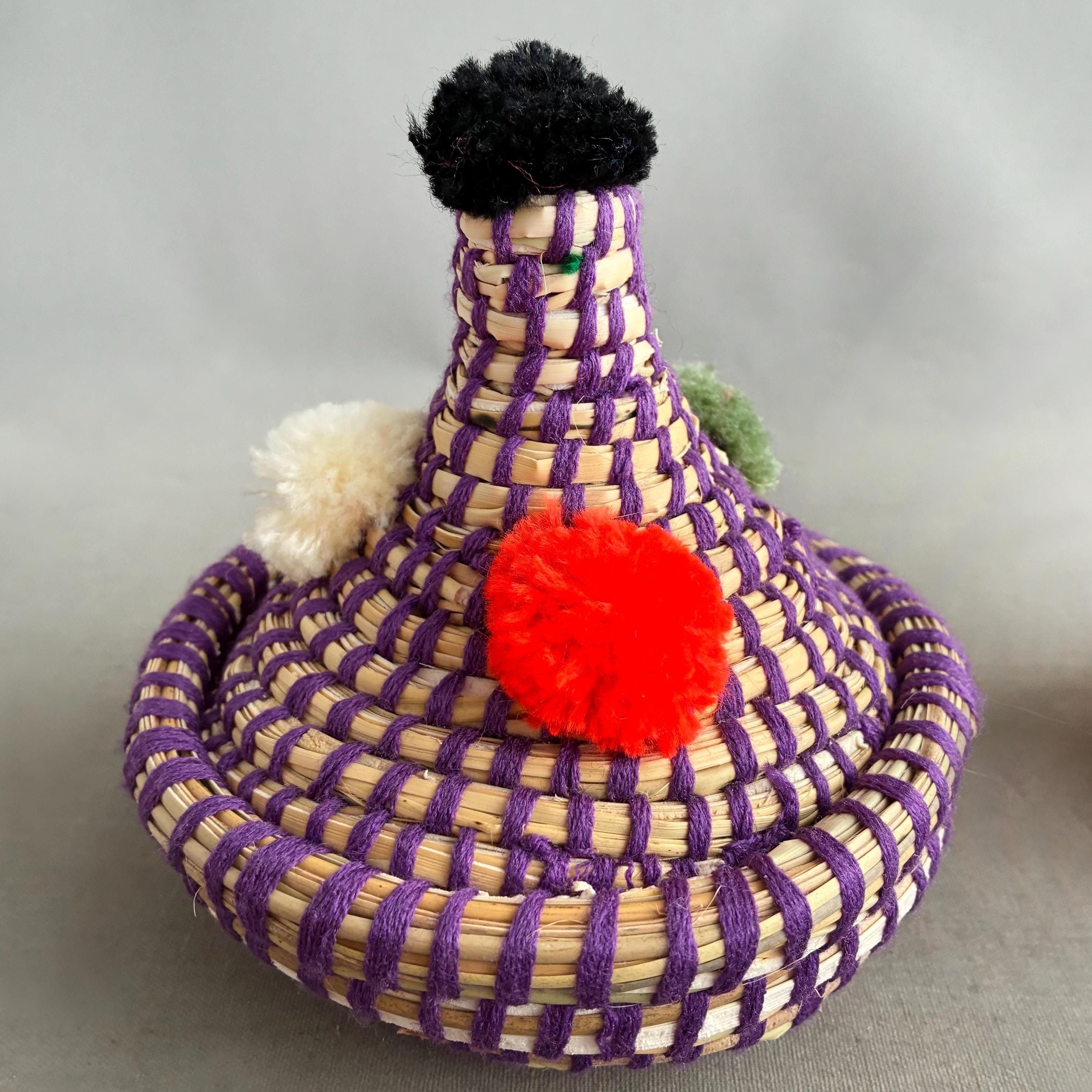 Materials: Woven from natural materials such as palm leaves, grasses, and reeds, then decorated with colorful wool.