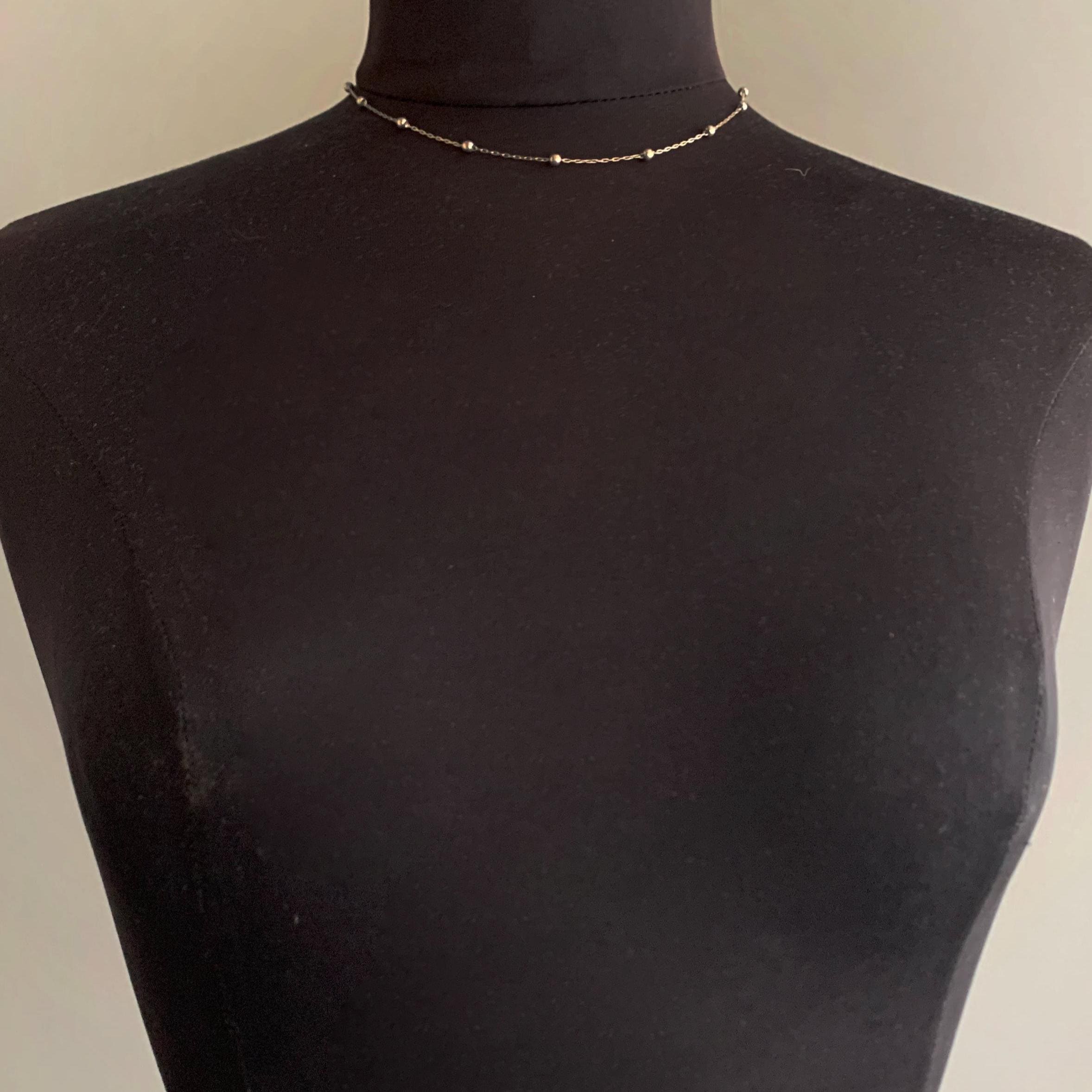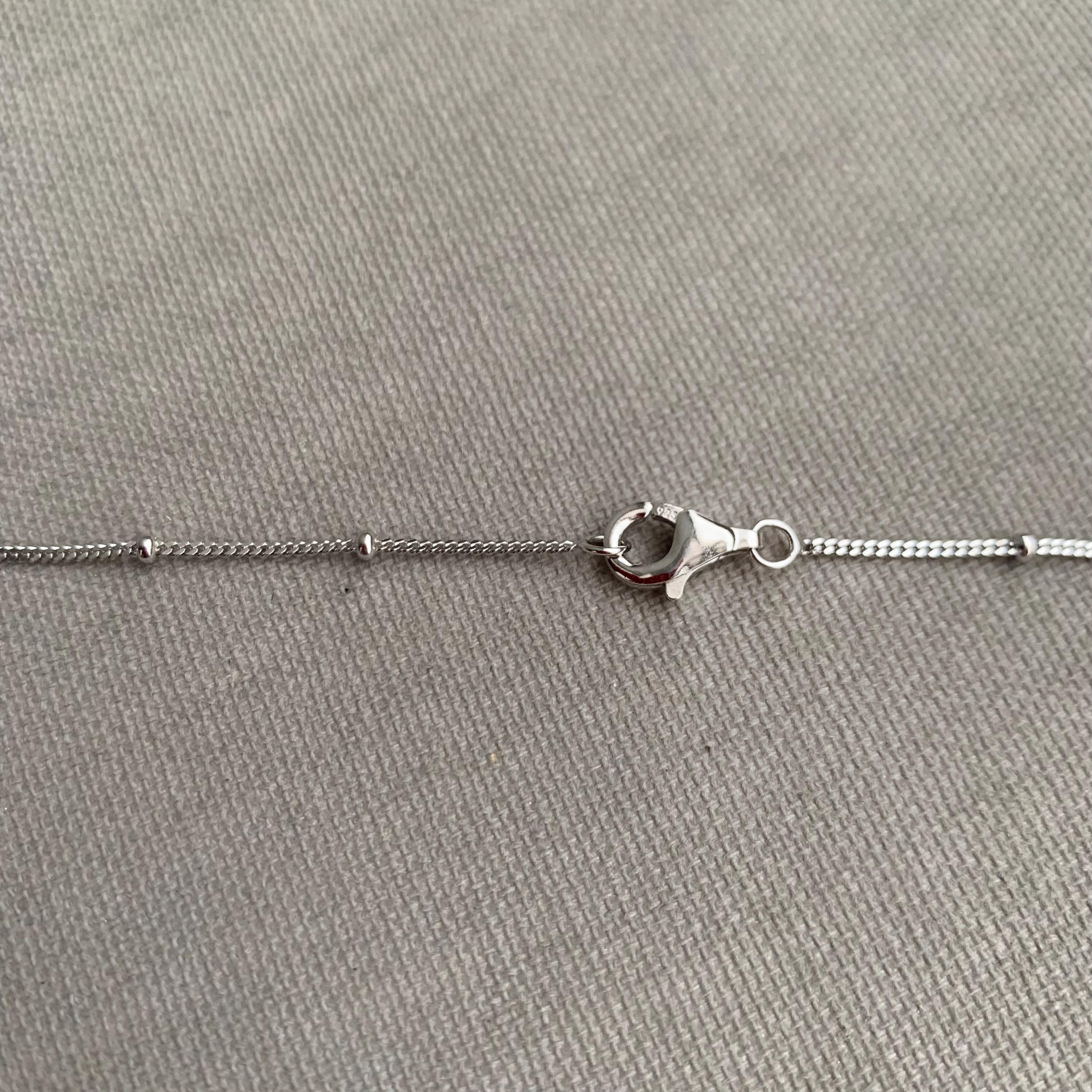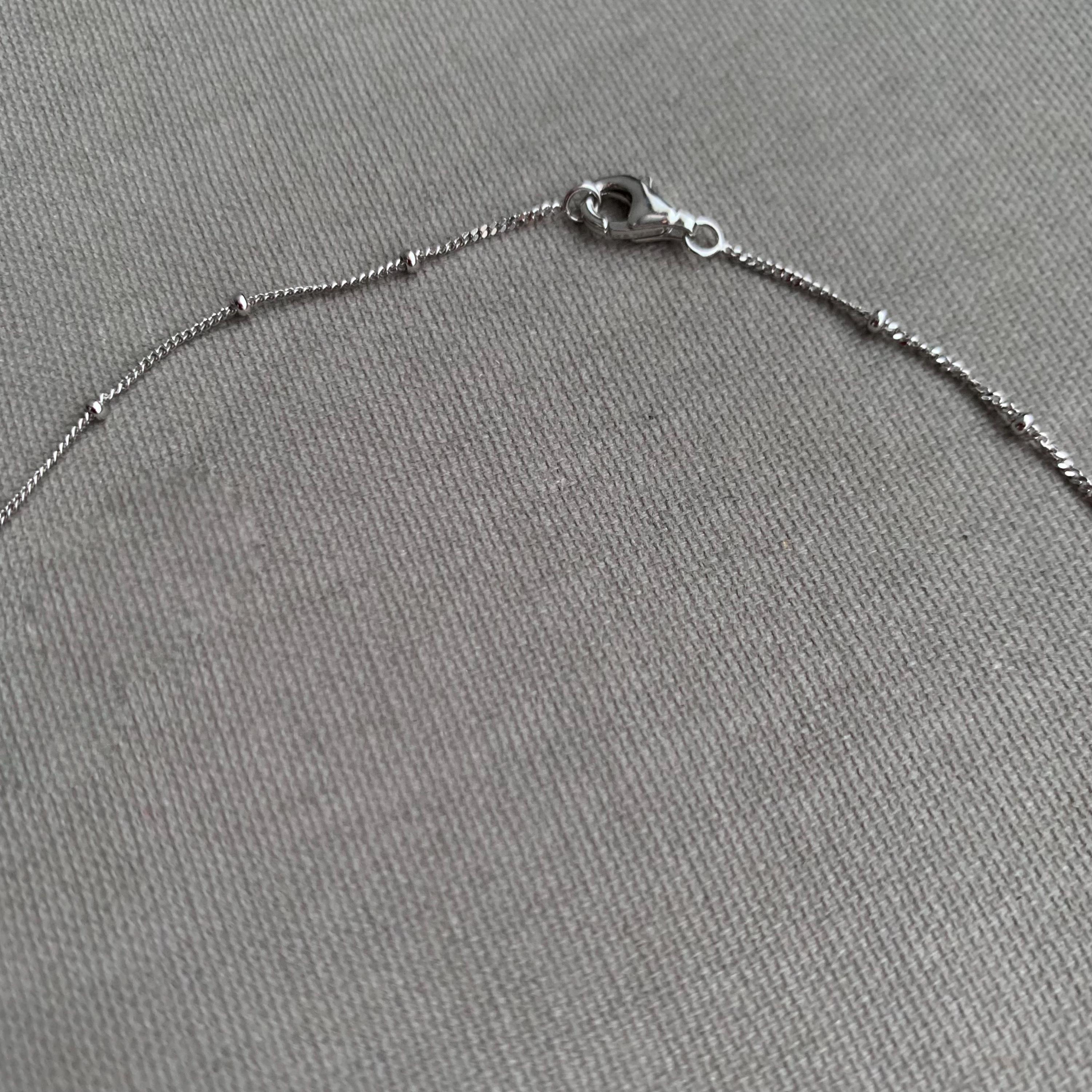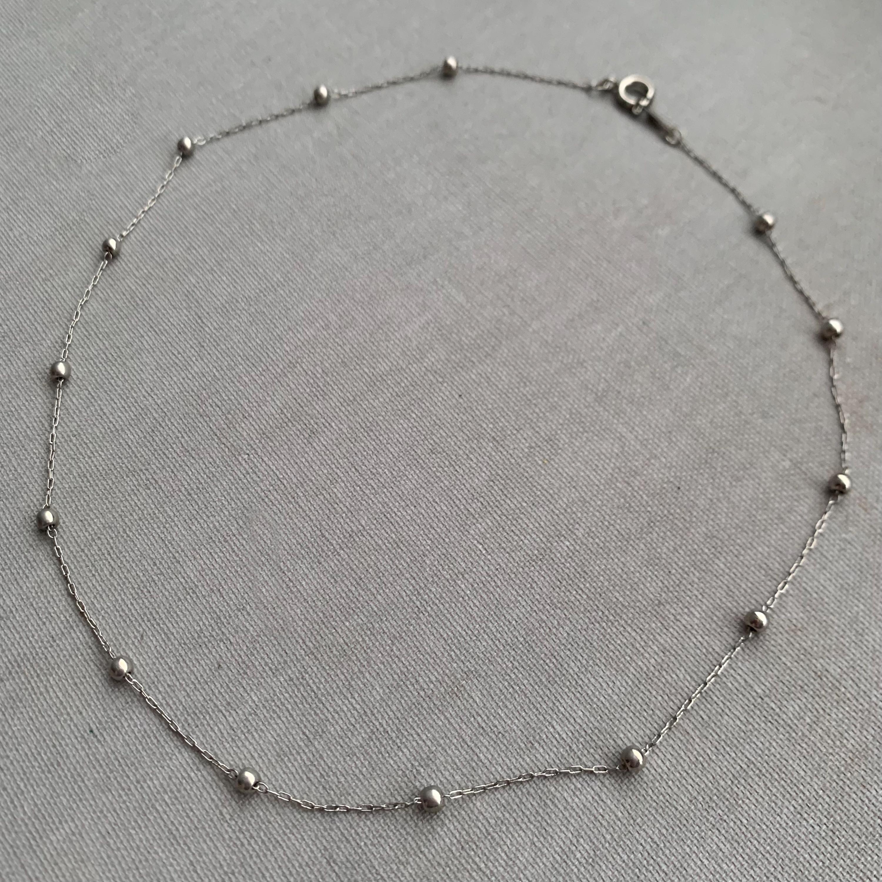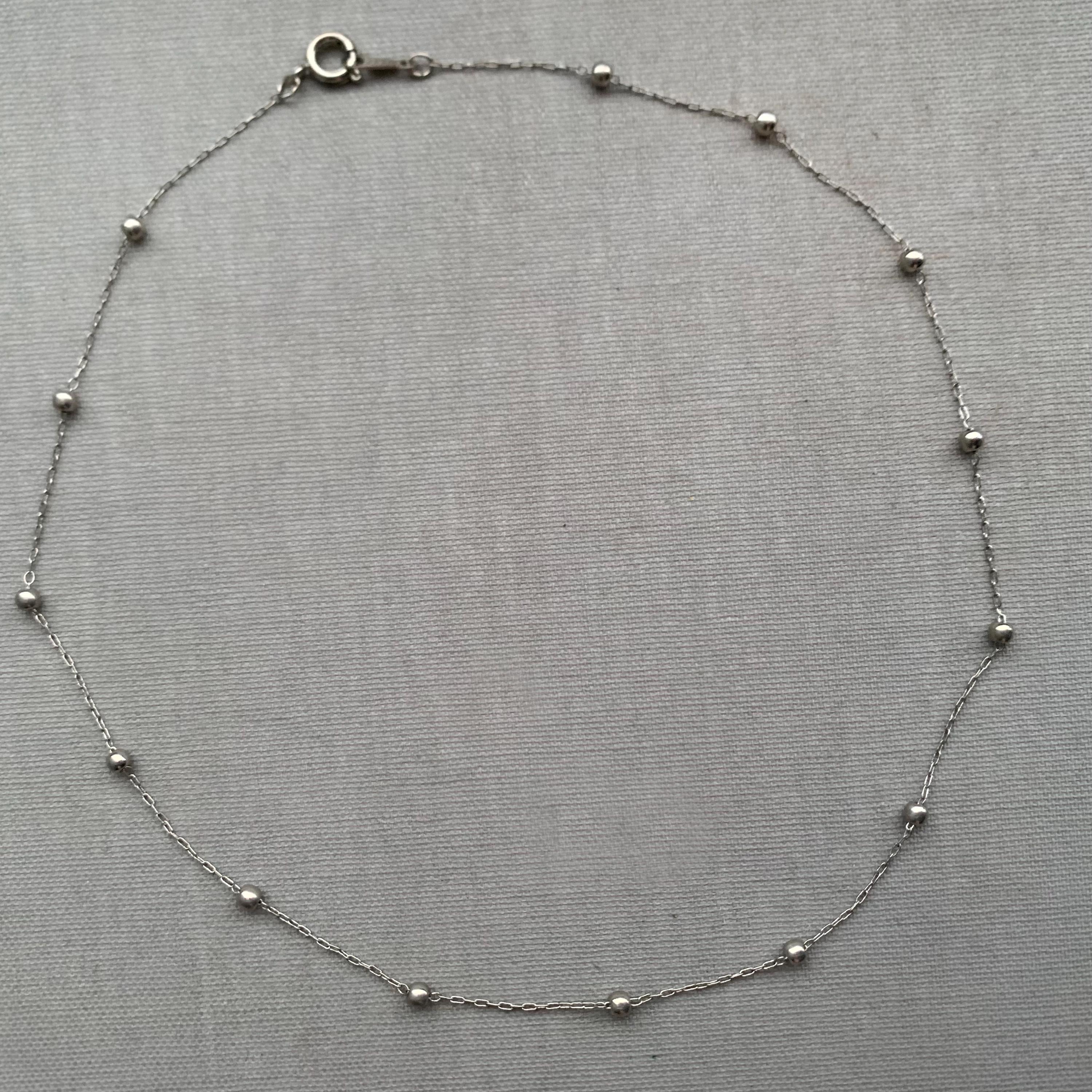 A sterling silver satellite chain or station chain, characterized by a delicate metal chain interspersed with small, round beads or "bobbles" at regular intervals. Its a choker style chain . Presented in a gift box