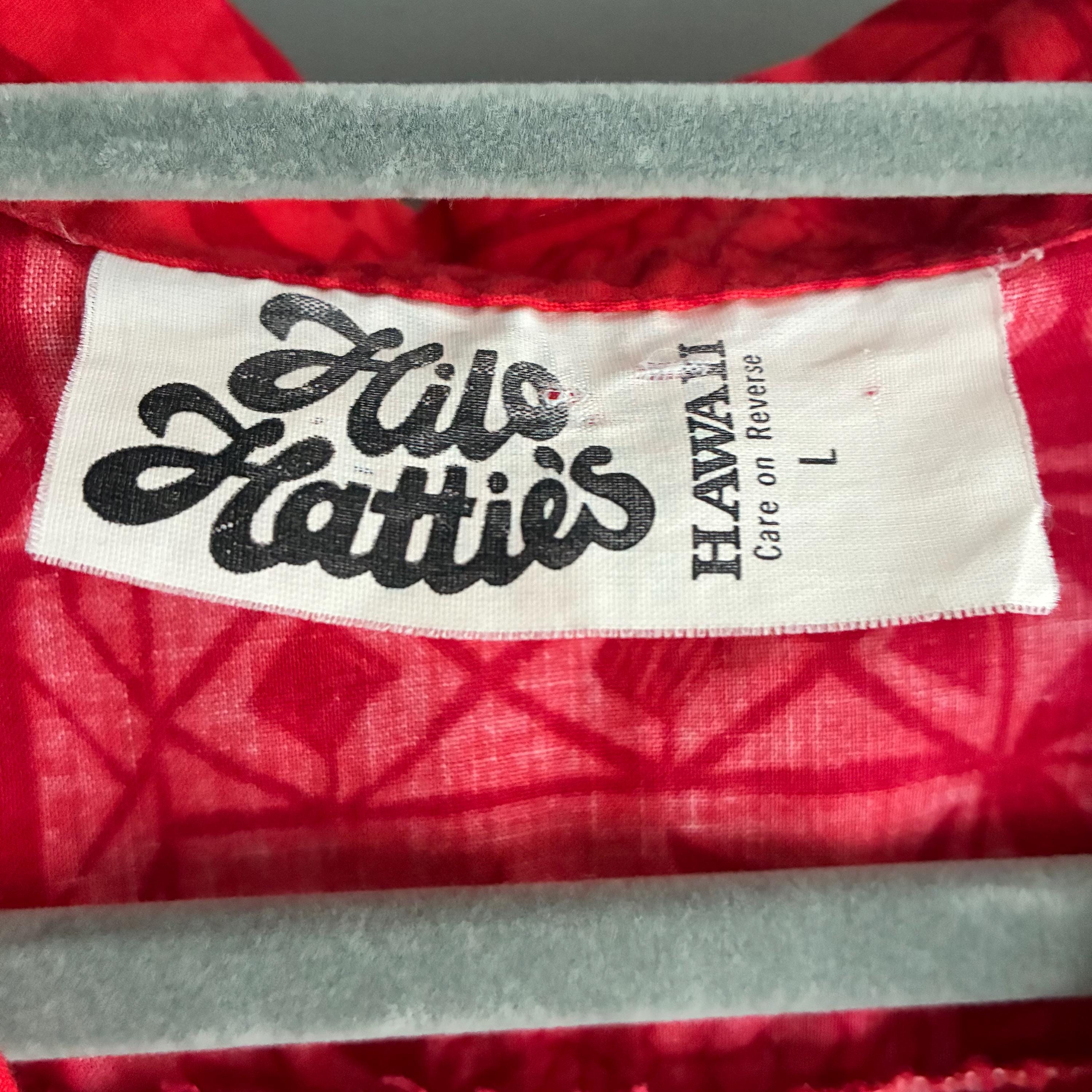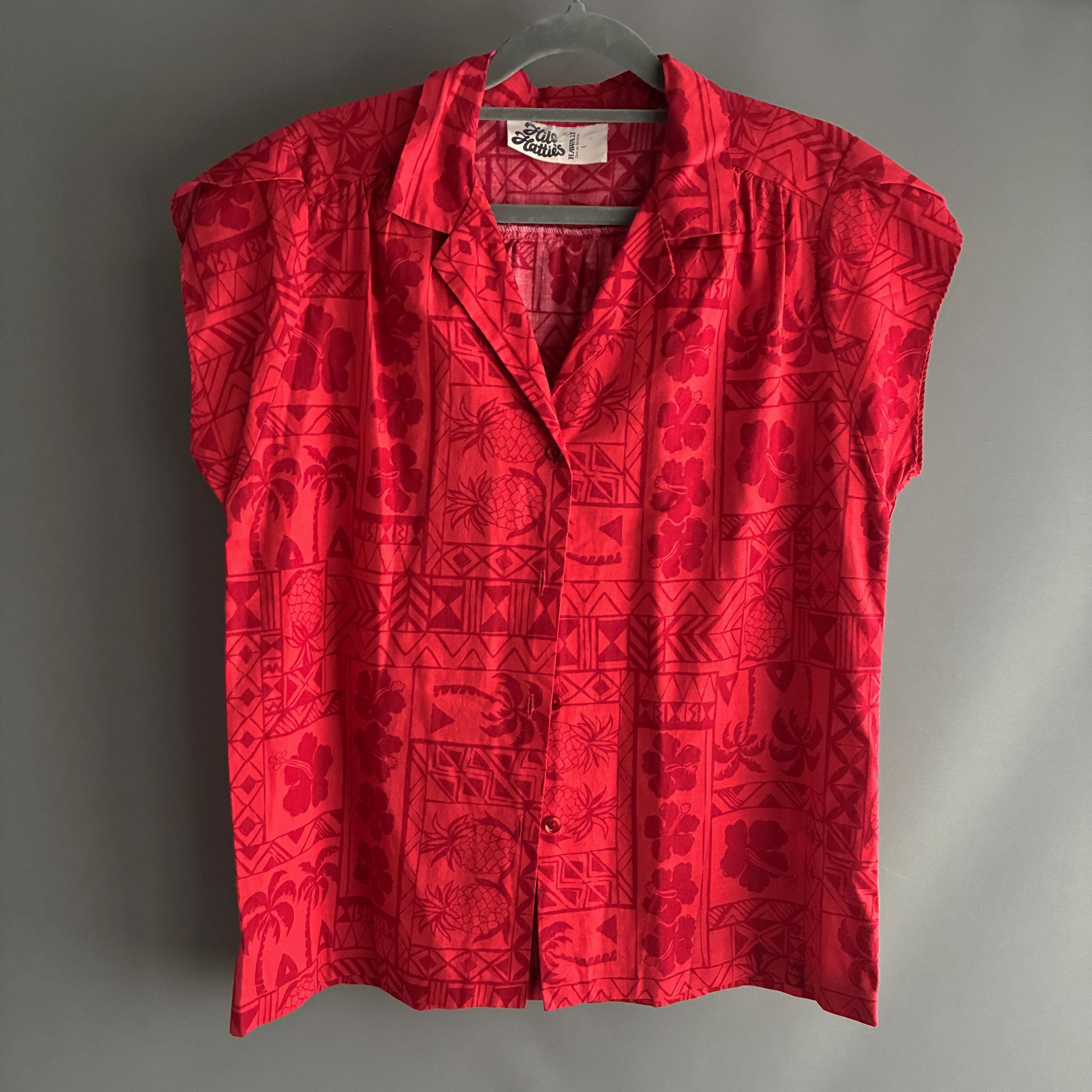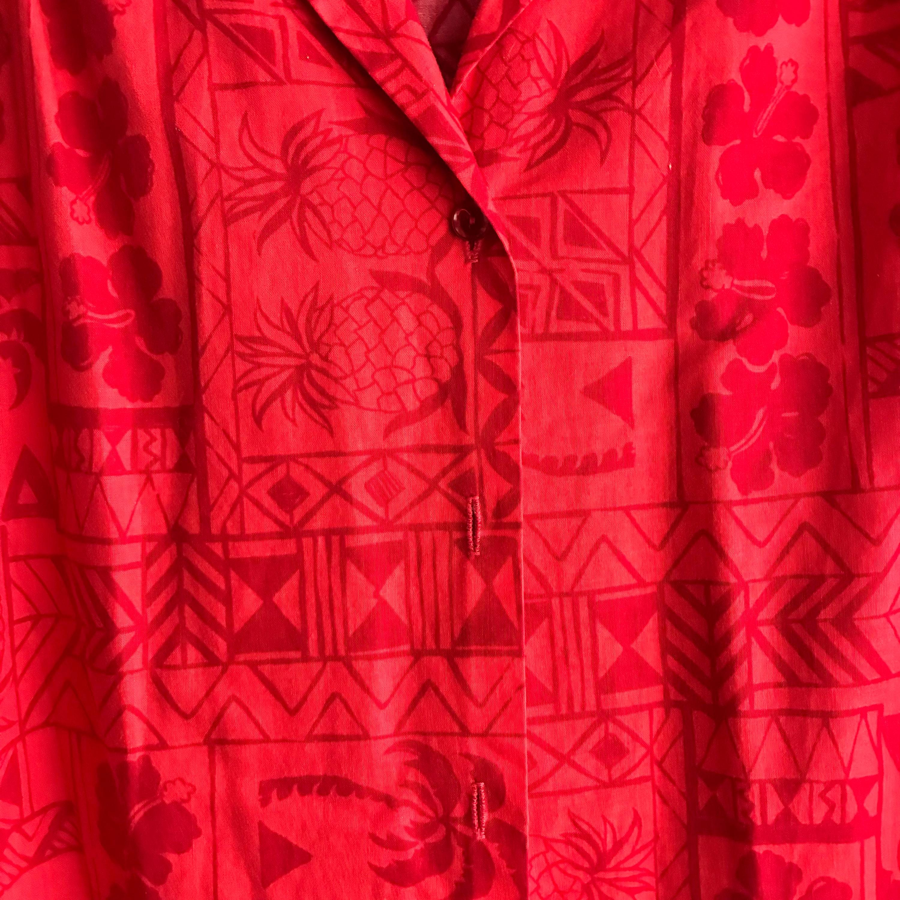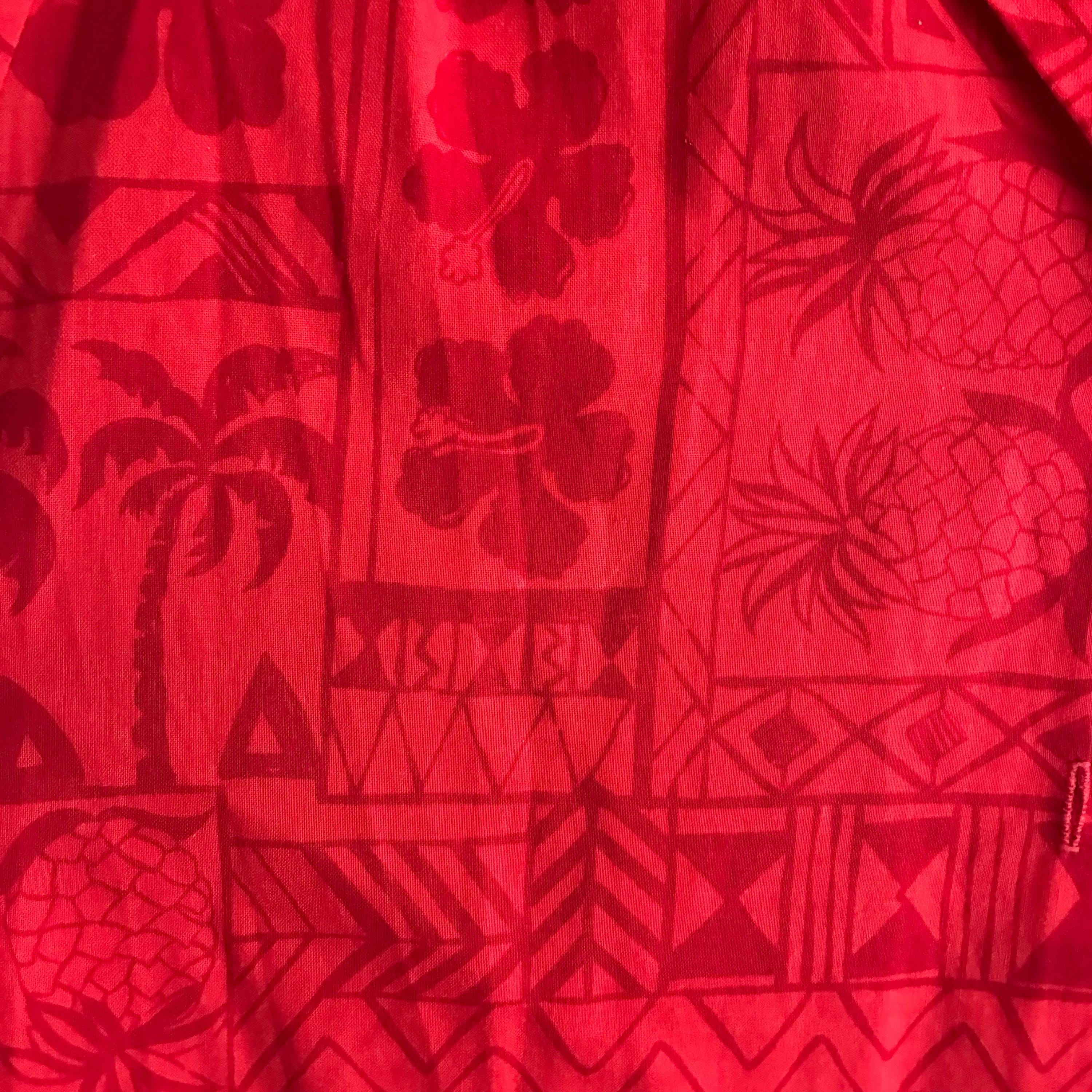 Hilo Hattie, a well-known Hawaiian manufacturer.This red-on-red "tapa" print features traditional Hawaiian motifs, including pineapples, palm trees, hibiscus flowers, and geometric tribal designs.