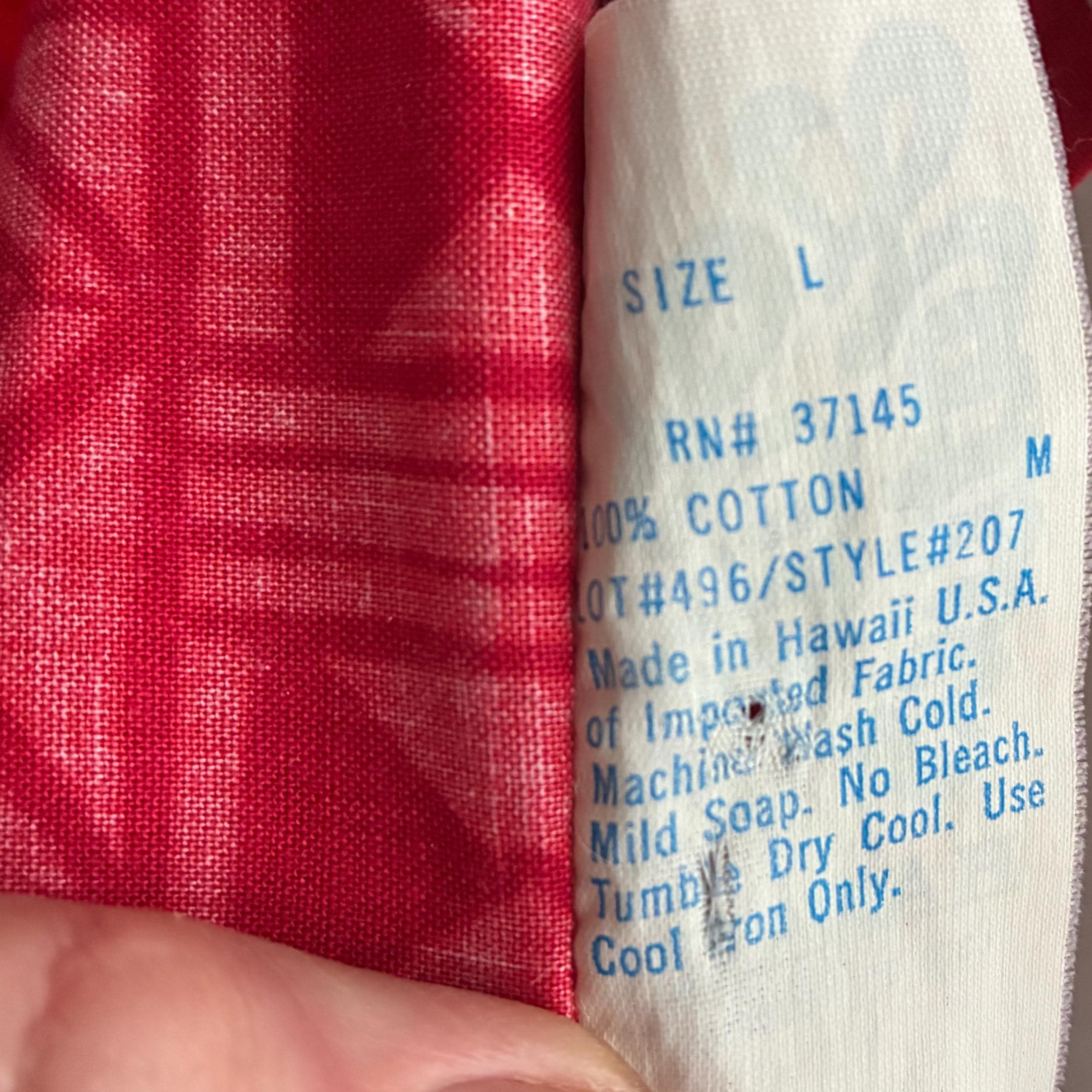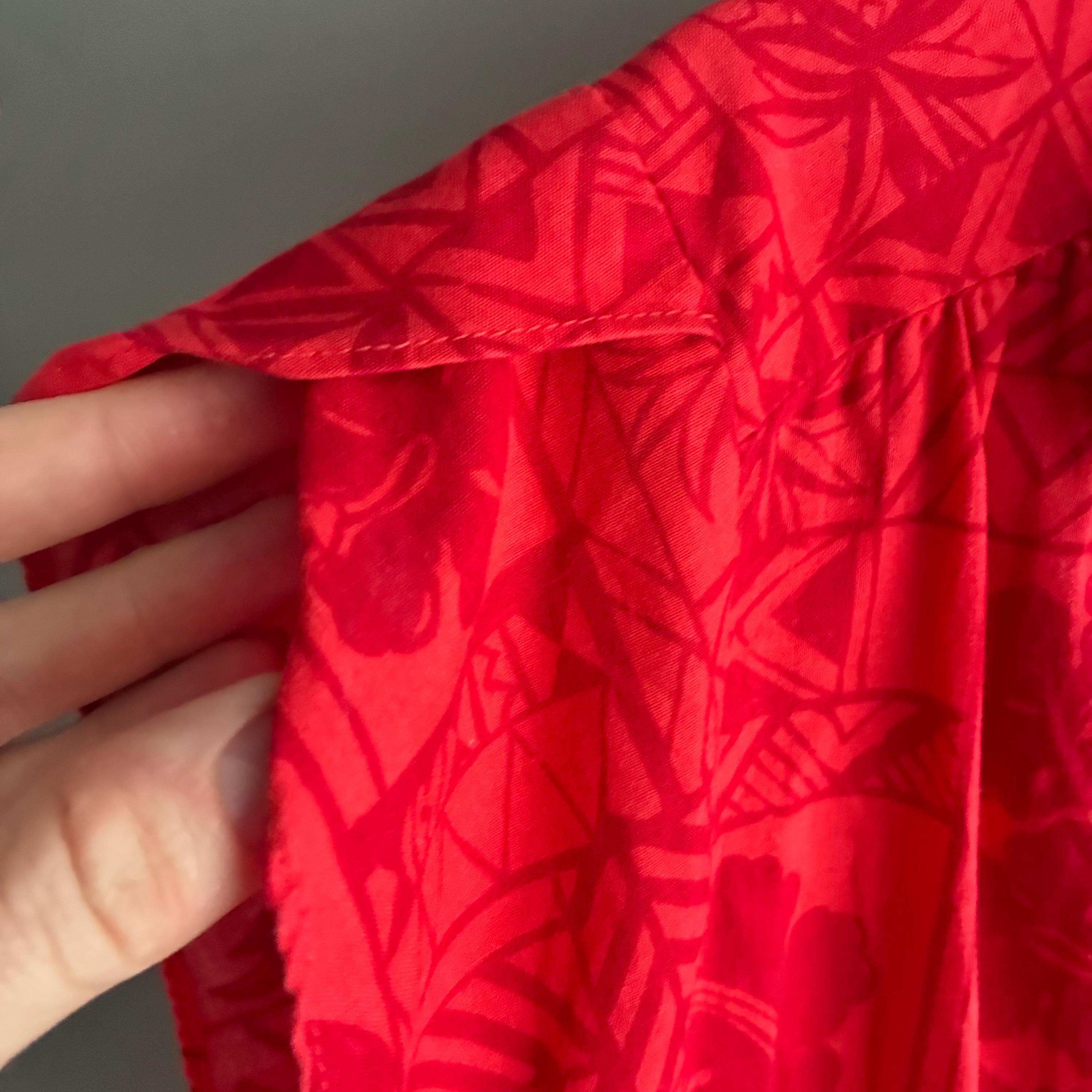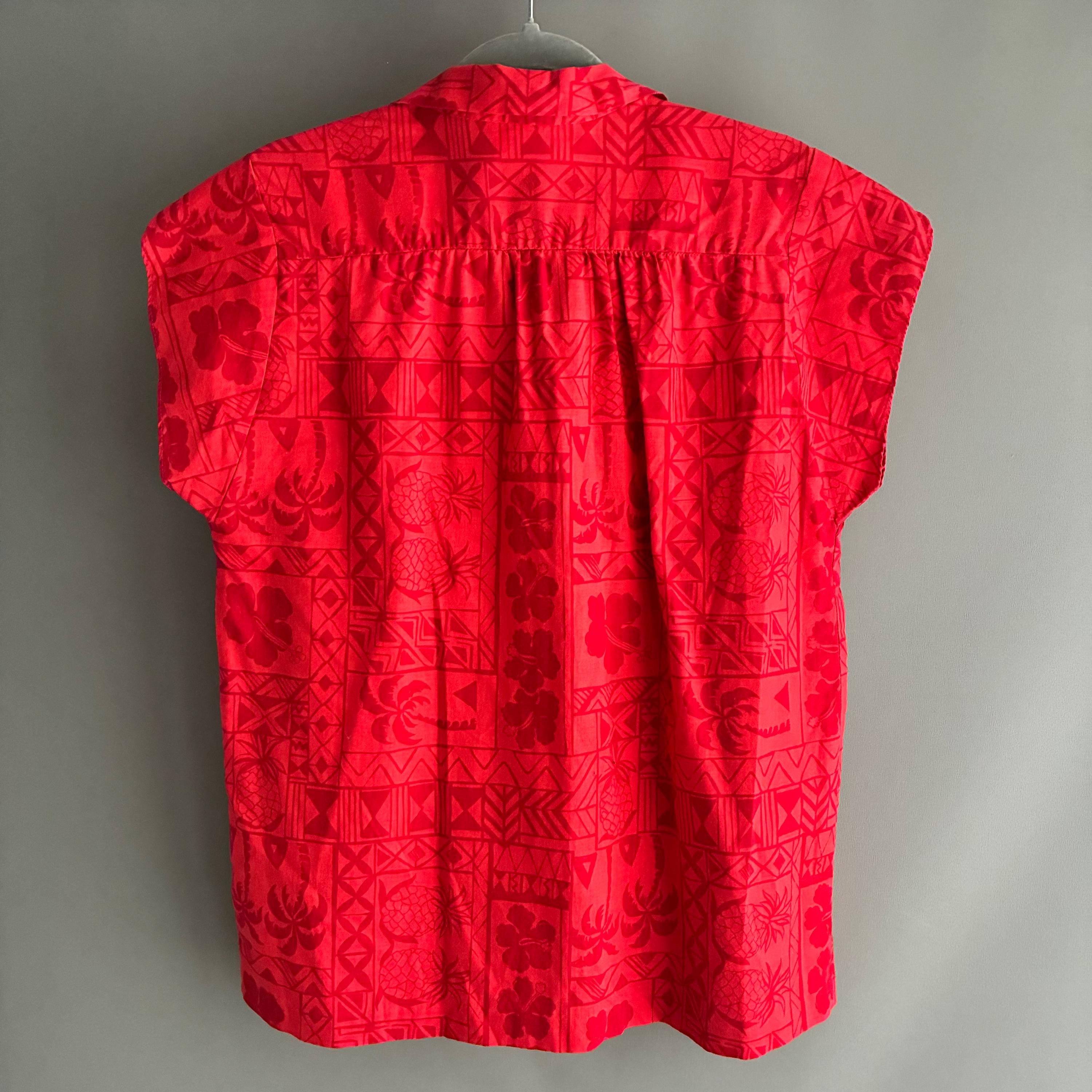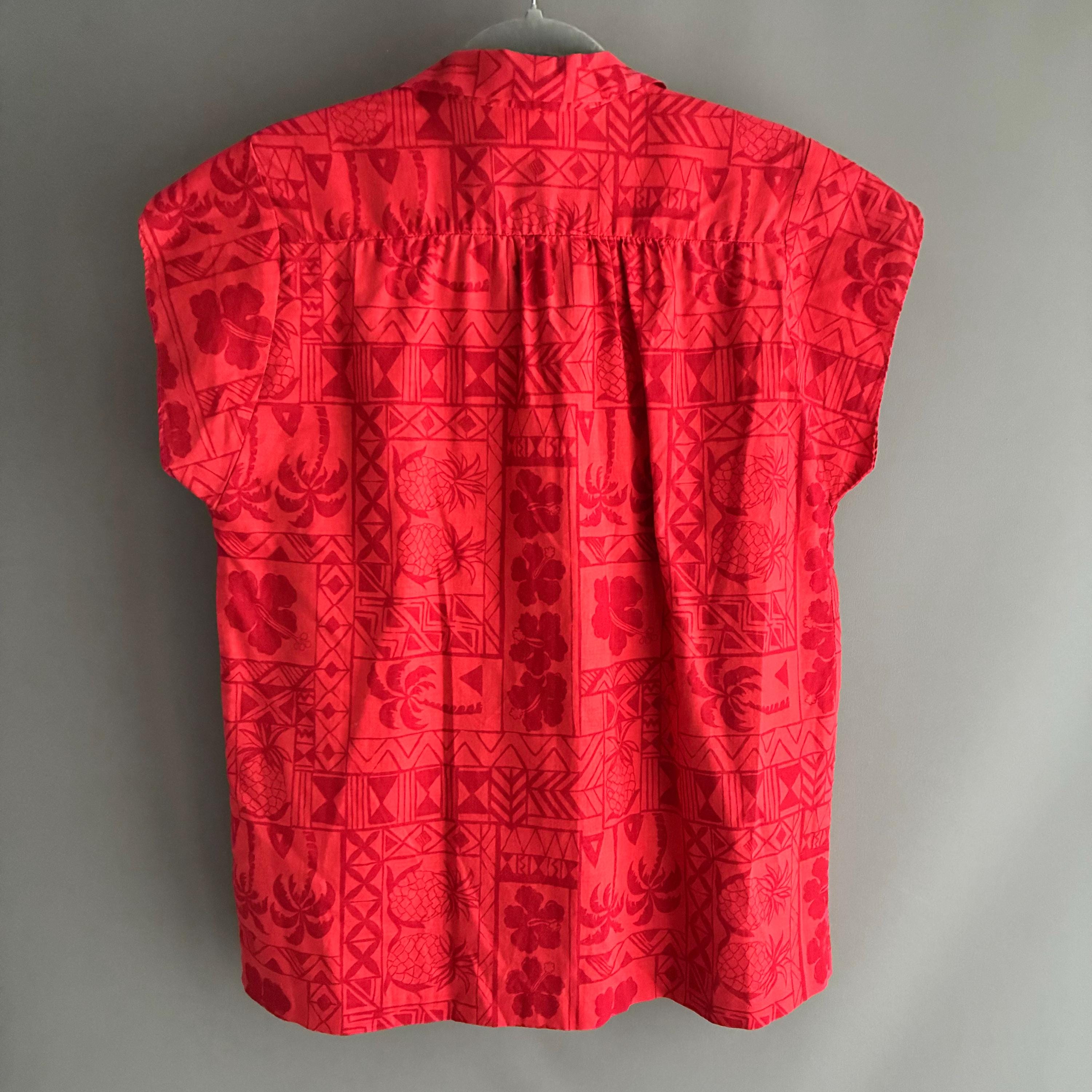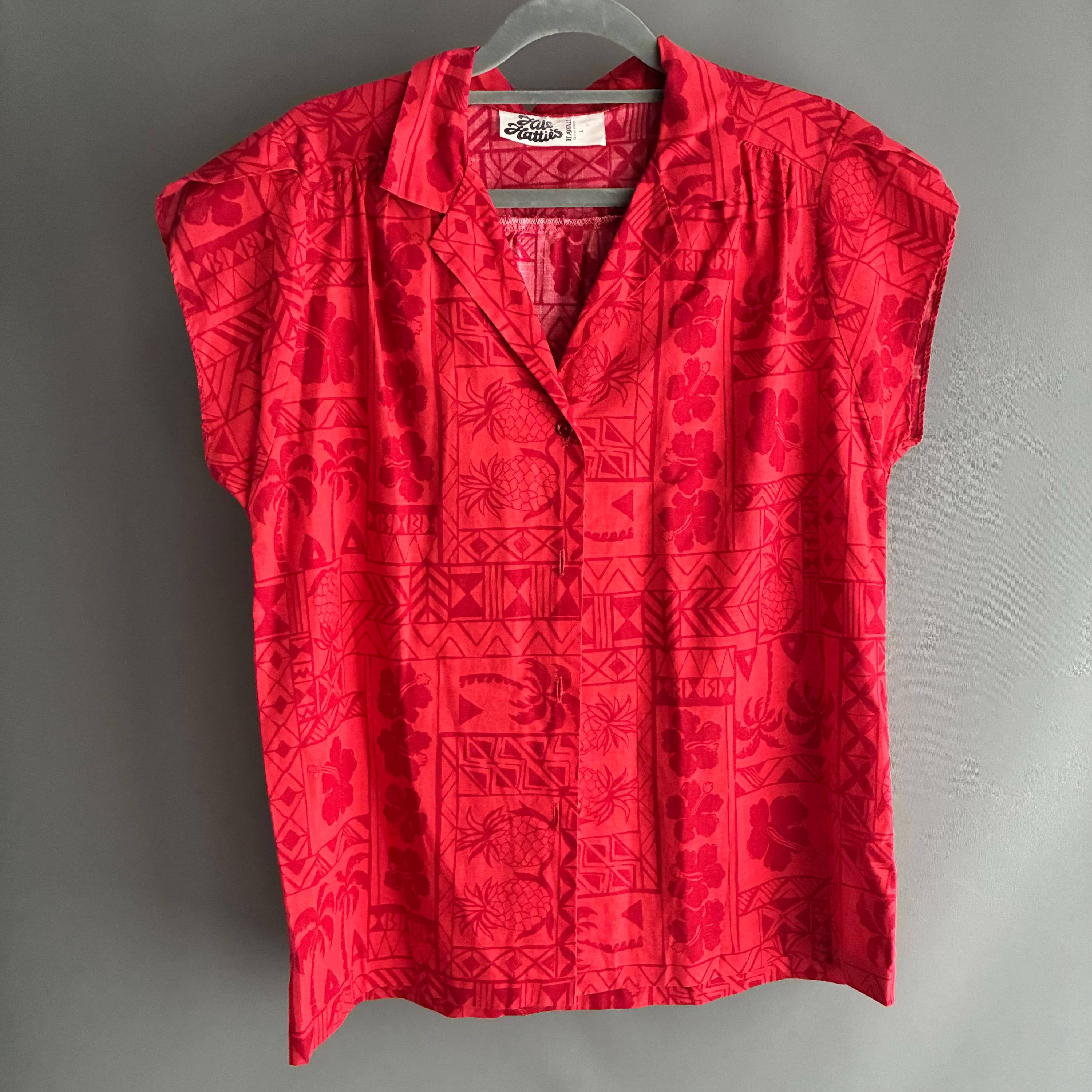 Hilo Hattie, a well-known Hawaiian manufacturer.This red-on-red "tapa" print features traditional Hawaiian motifs, including pineapples, palm trees, hibiscus flowers, and geometric tribal designs.