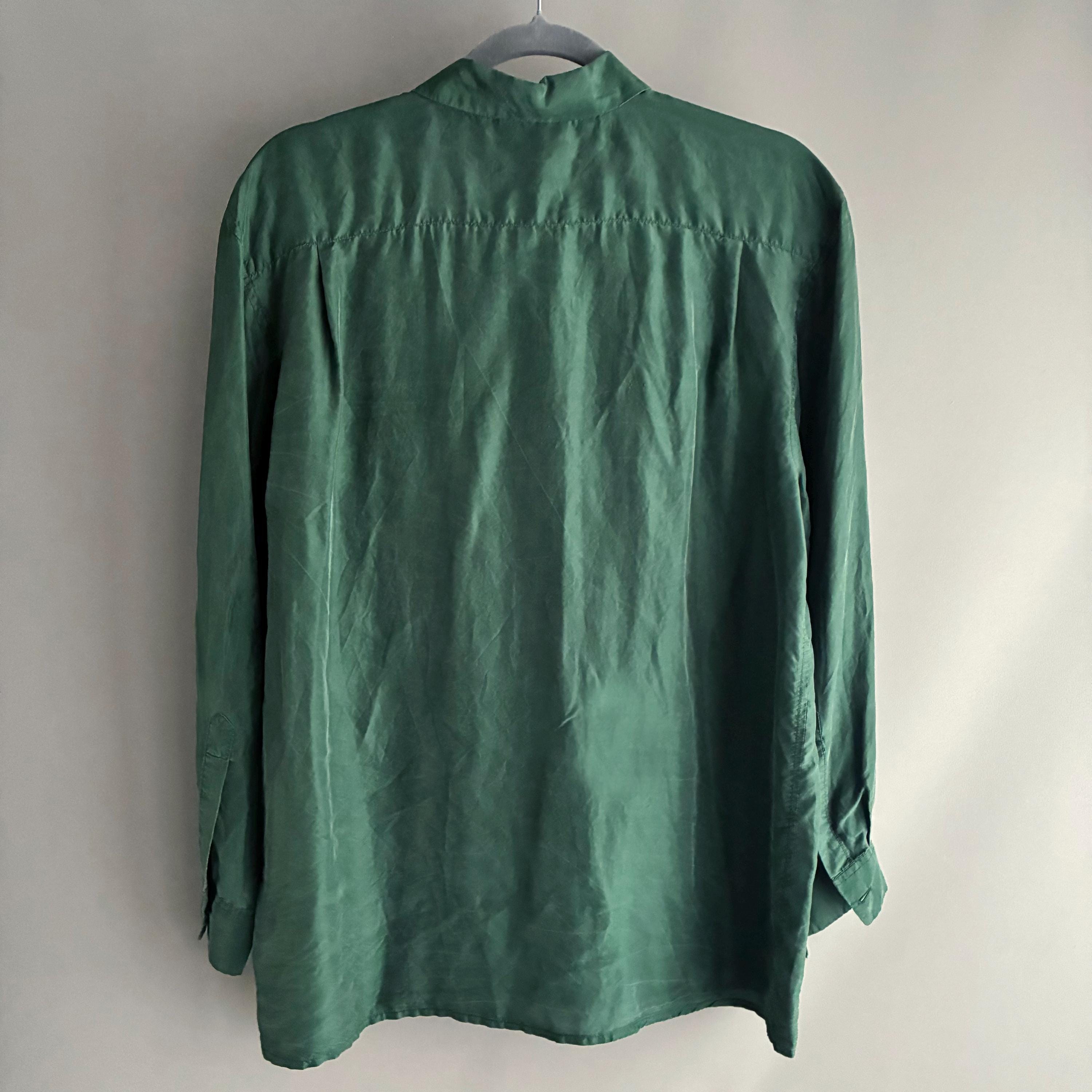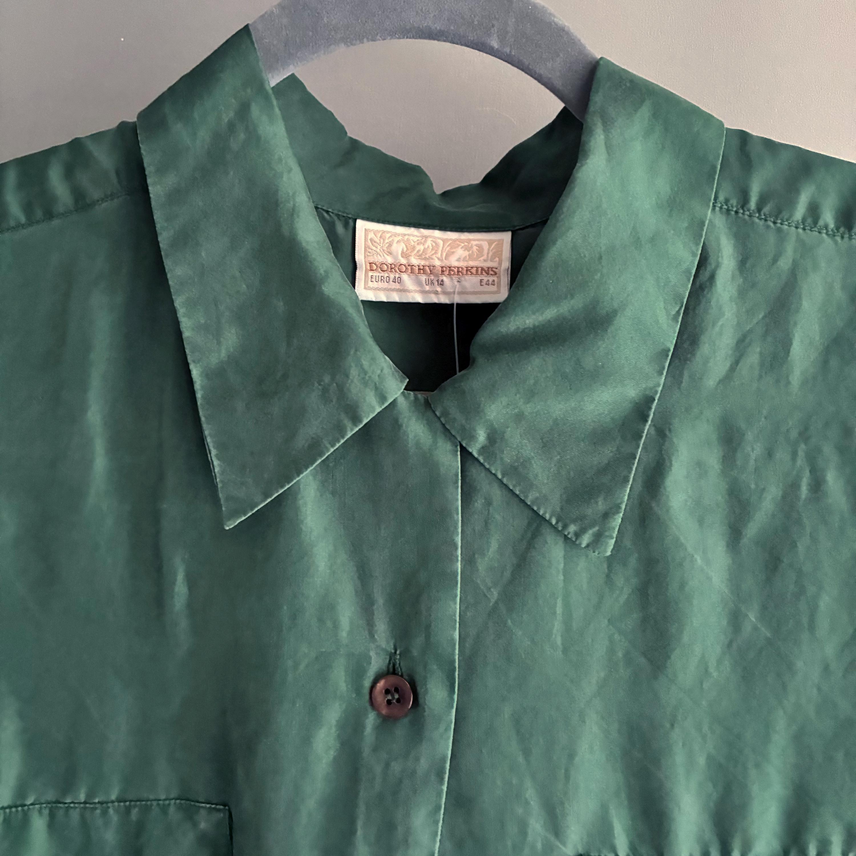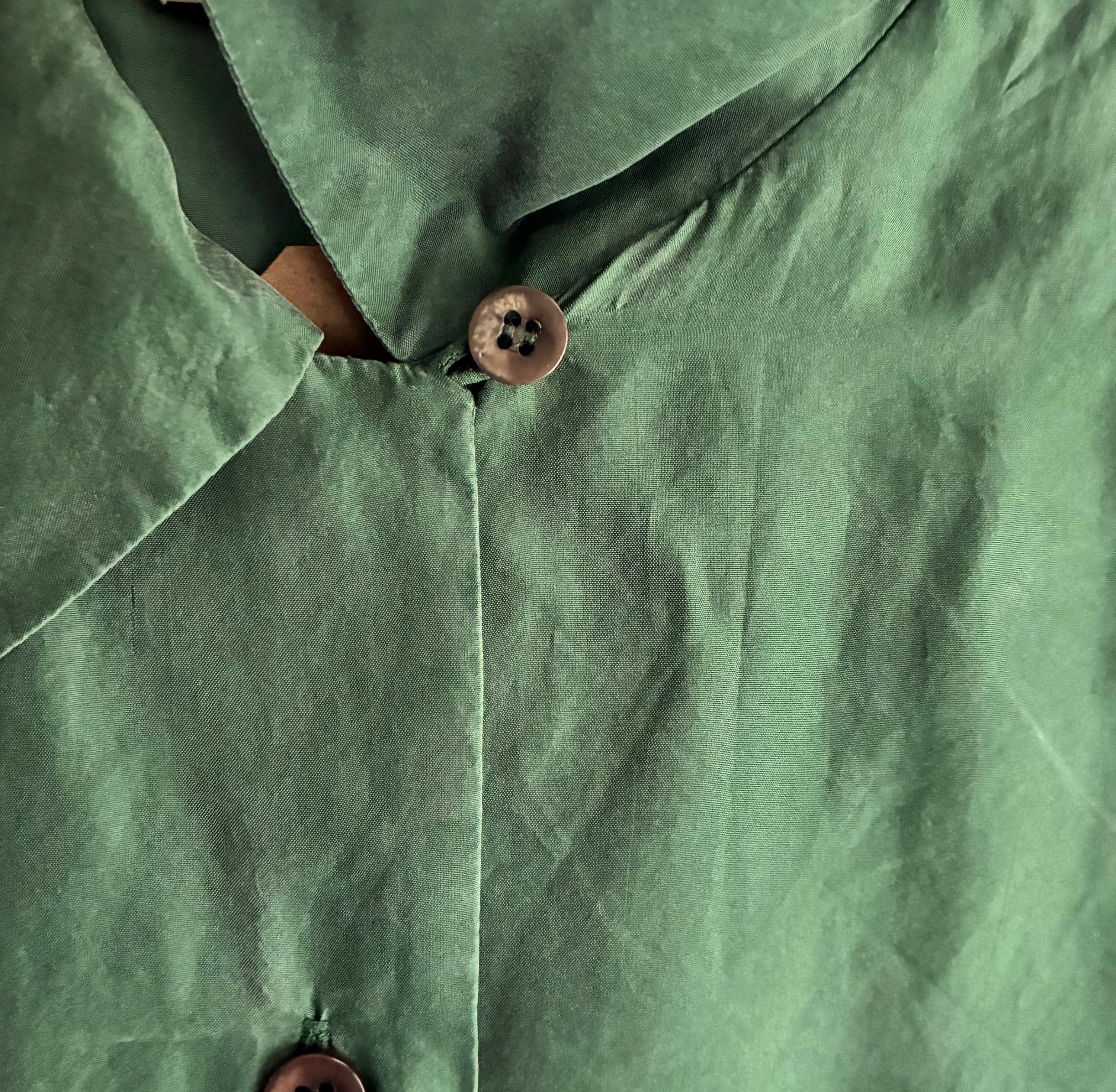 In a lovely forest green with a typical silk sheen this is your new favourite Staple. Silk is such a pleasure to ware as it is breathable and regulates body temperature. It has Dainty little buttons up to the coller as well as a little button to keep the colllar neat ( see pictures) 2 faux pockets on the breast. Lable says UK 14 but more like a modern day size 12