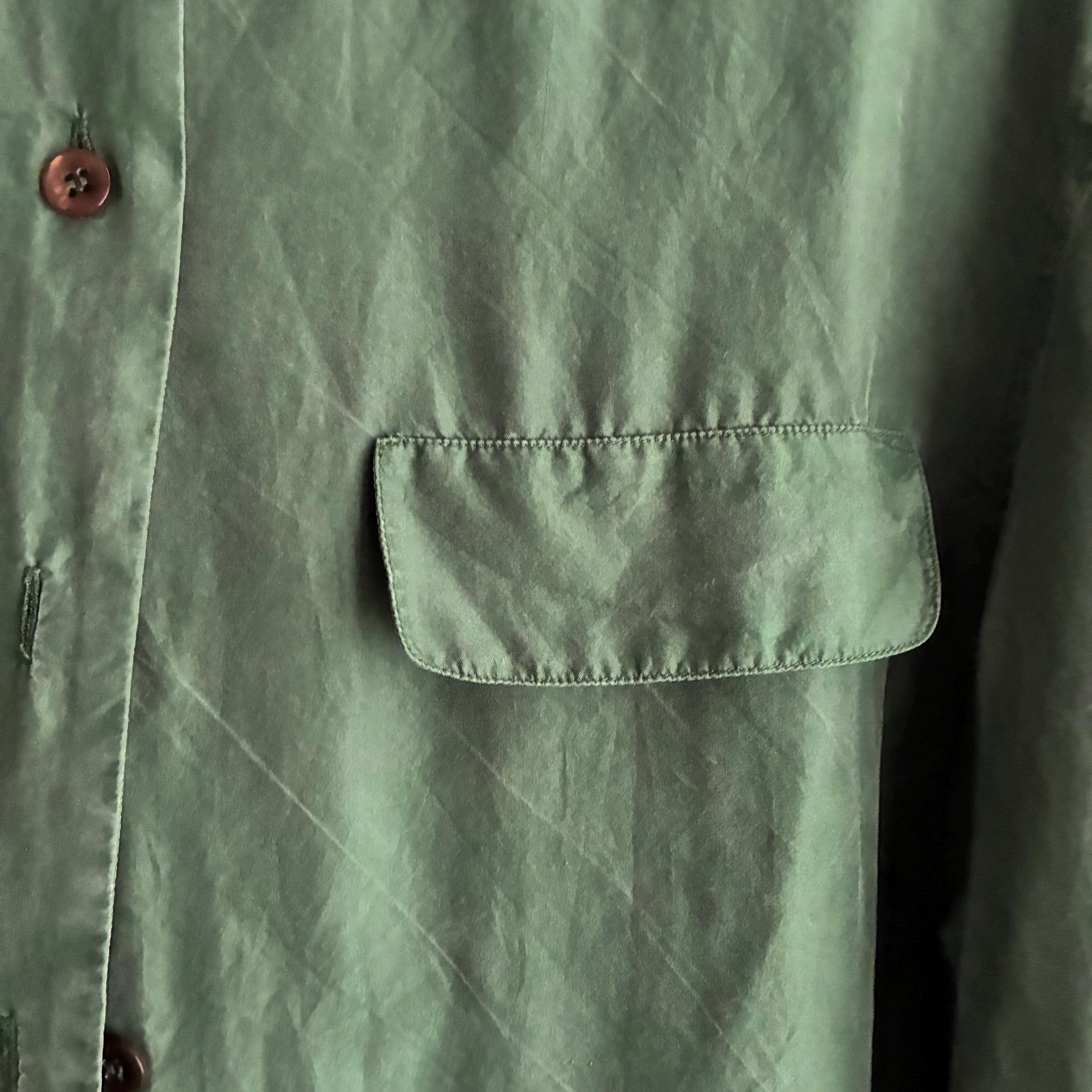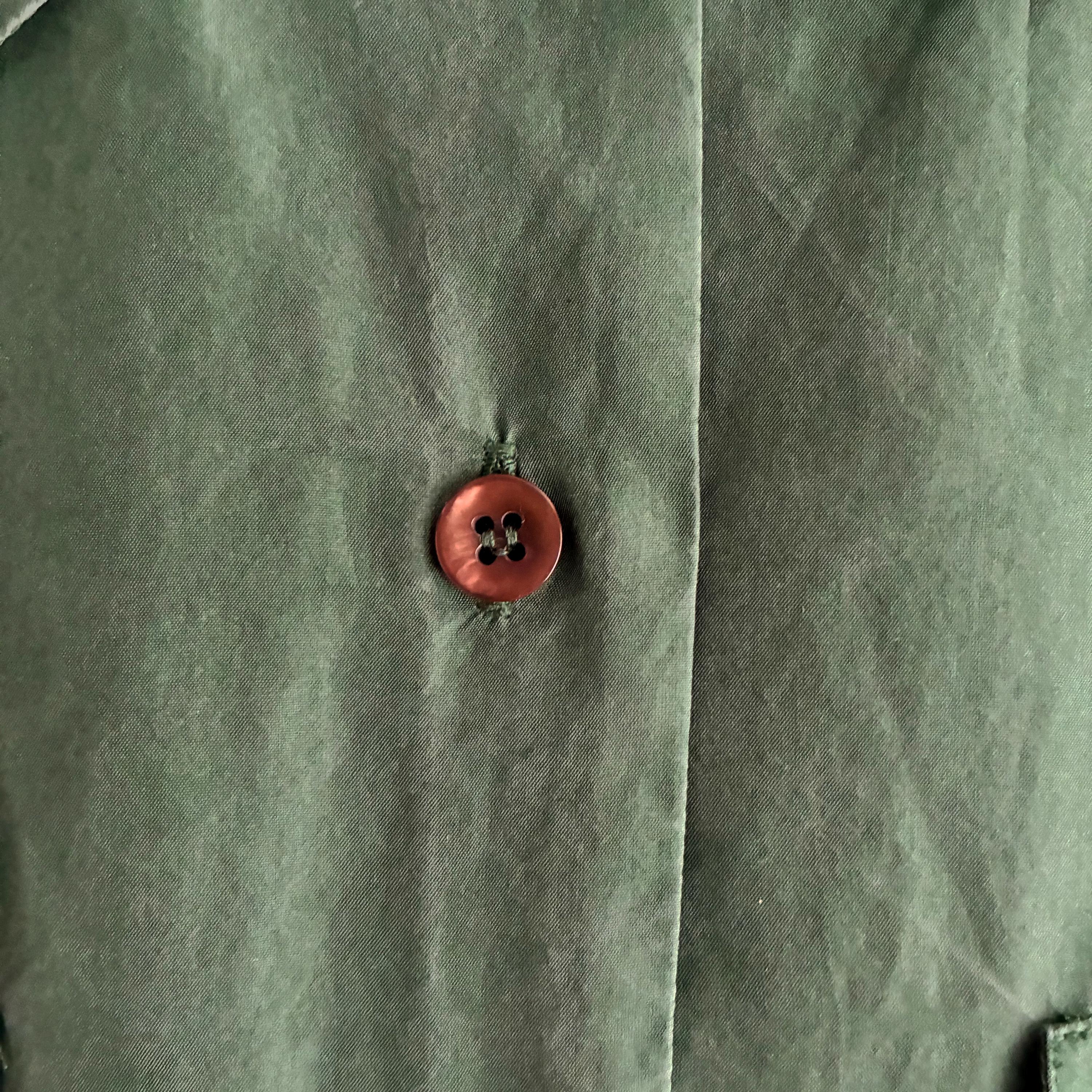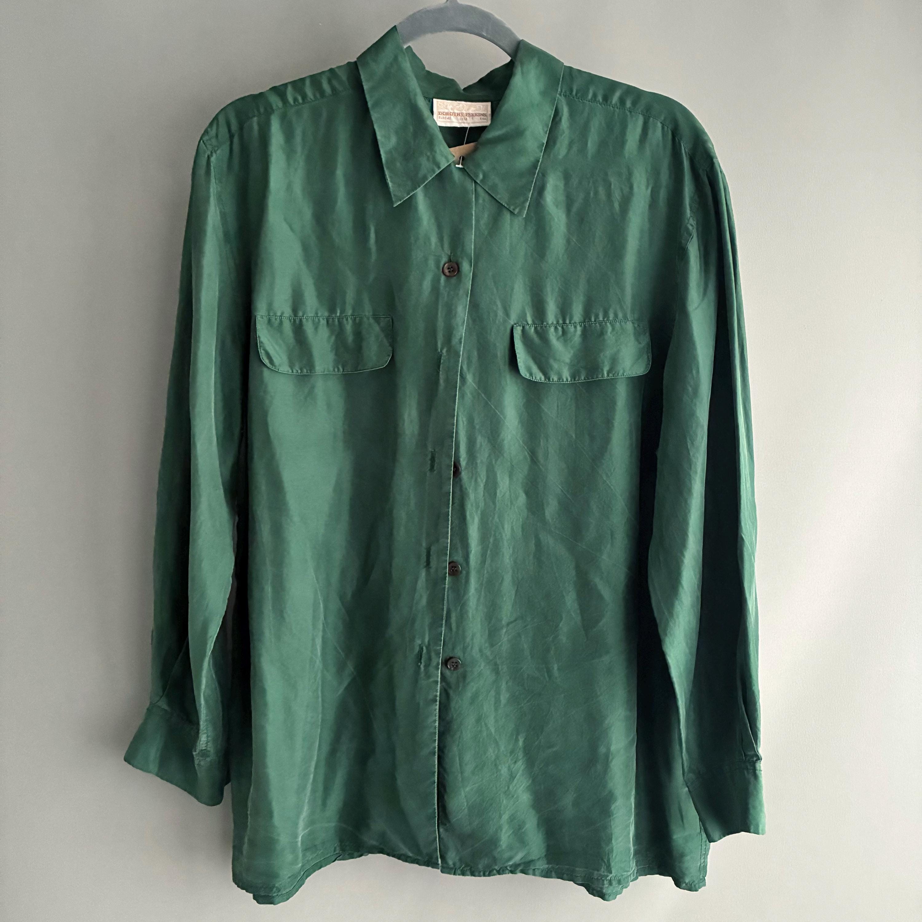 In a lovely forest green with a typical silk sheen this is your new favourite Staple. Silk is such a pleasure to ware as it is breathable and regulates body temperature. It has Dainty little buttons up to the coller as well as a little button to keep the colllar neat ( see pictures) 2 faux pockets on the breast. Lable says UK 14 but more like a modern day size 12