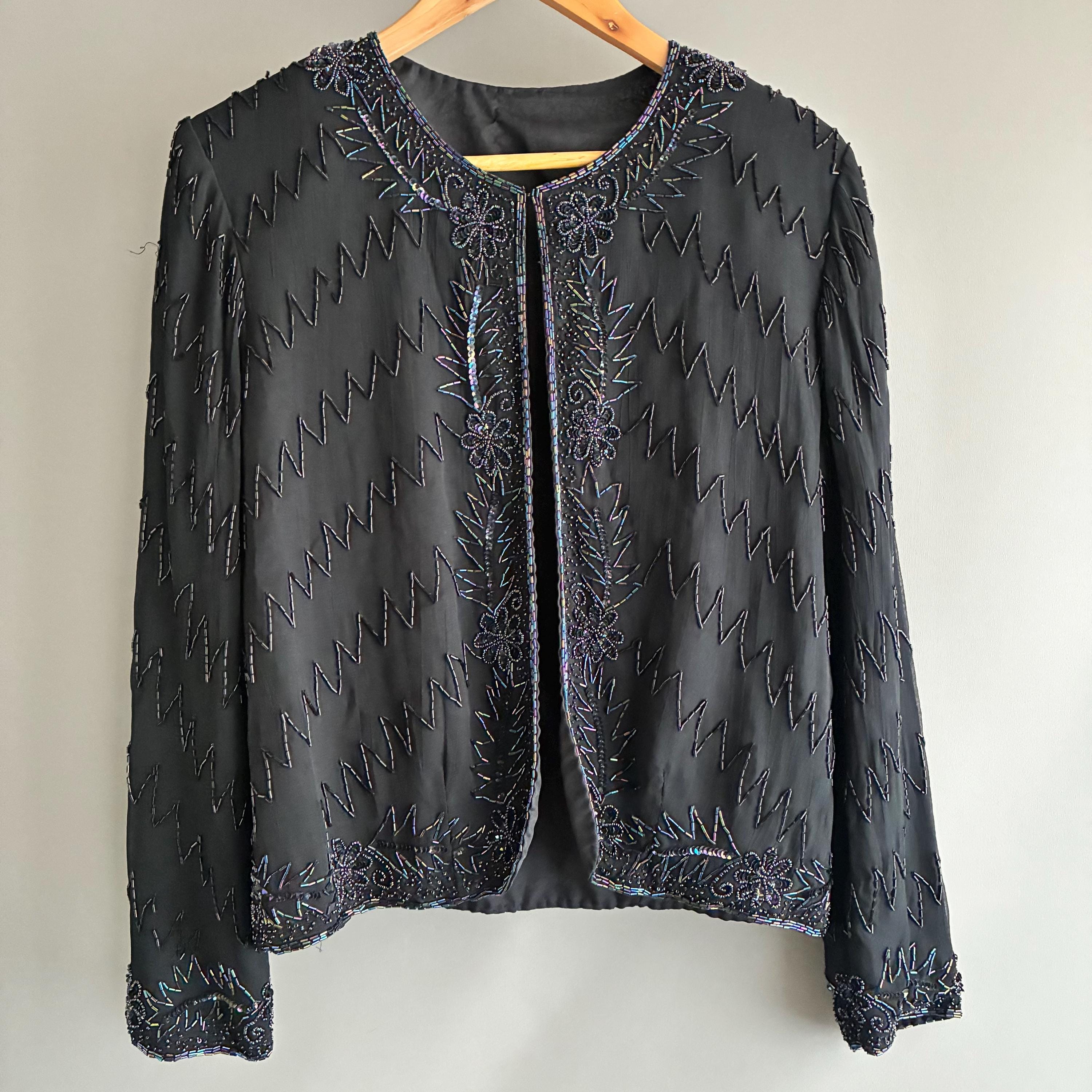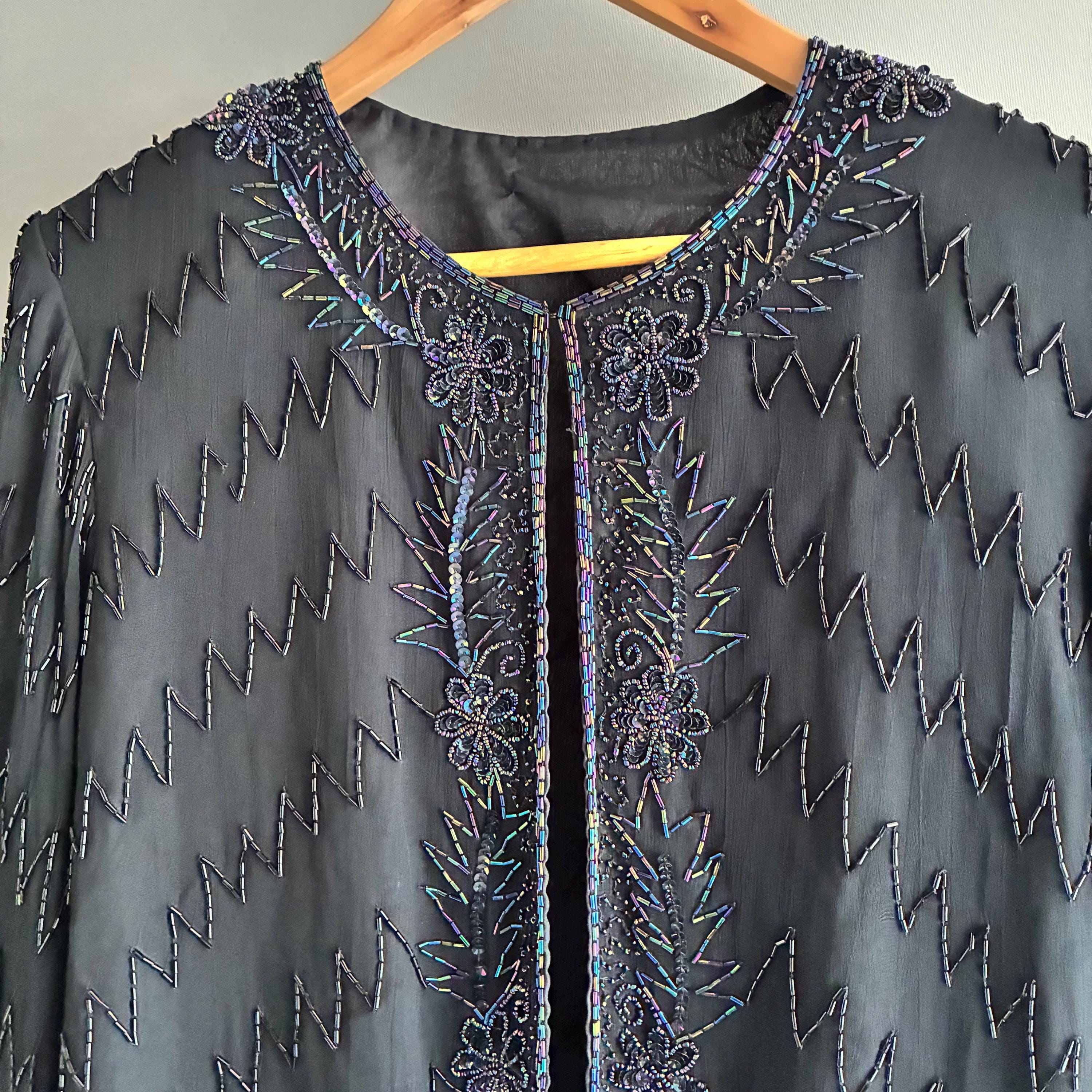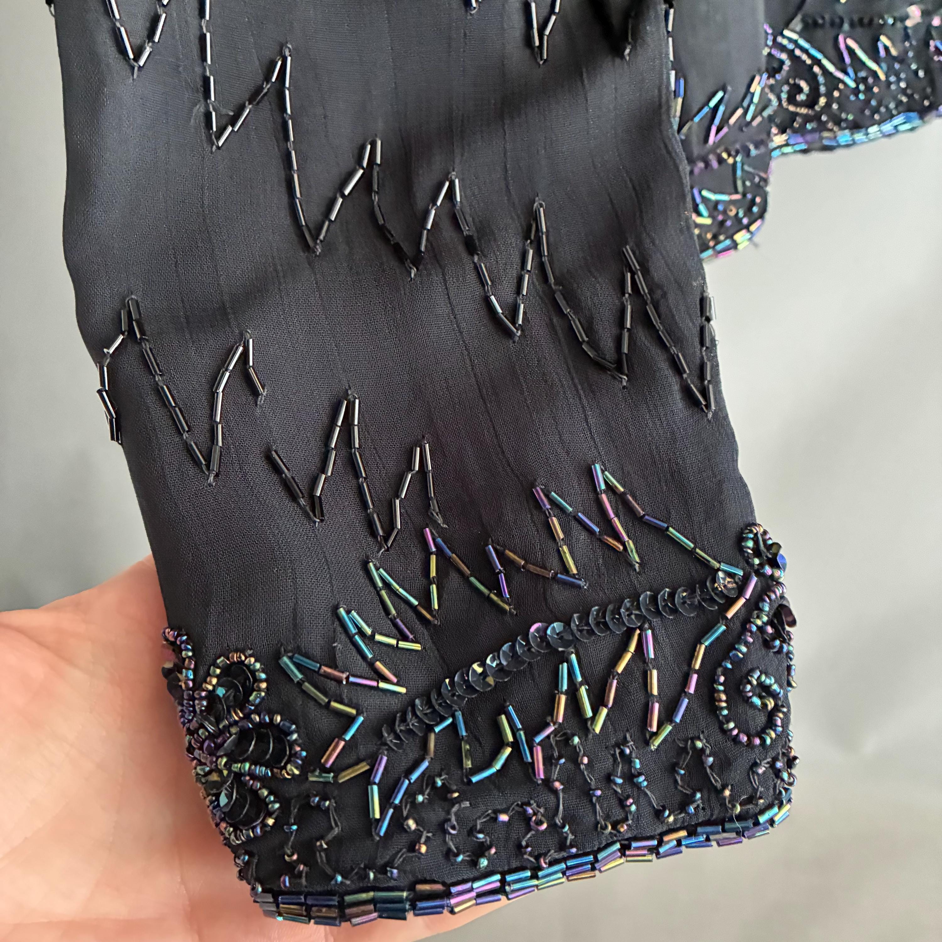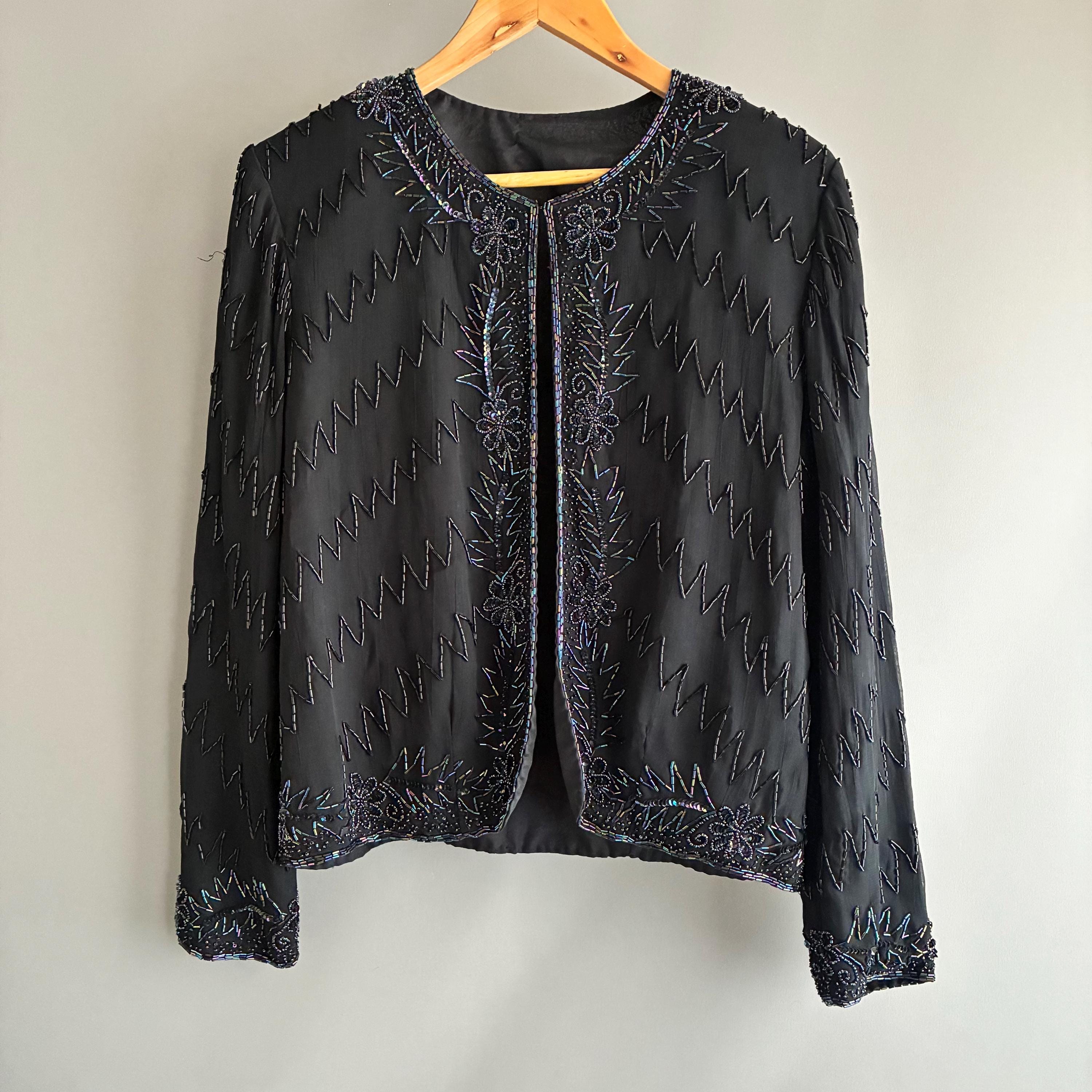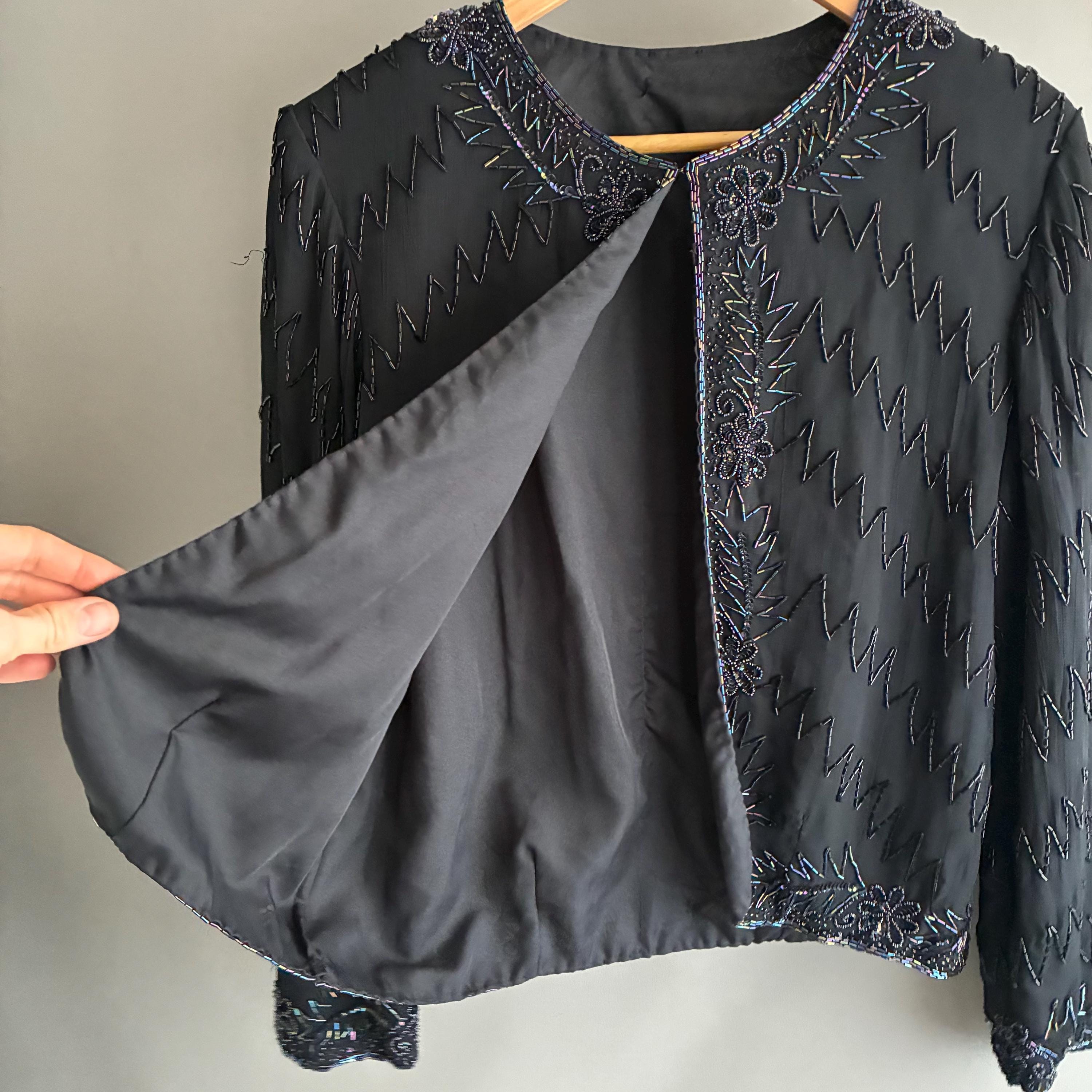 Beautiful glass bead embelished silk evening jacket. Fully lined with 1 hook closure at the crew neck collar. Small shoulderpads for structure. The glass beads have an iridescent sheen ( see pictures) this will fit UK size 12 . In exellent vintage condition . This snazzy little jacket will glam up anything its thrown over