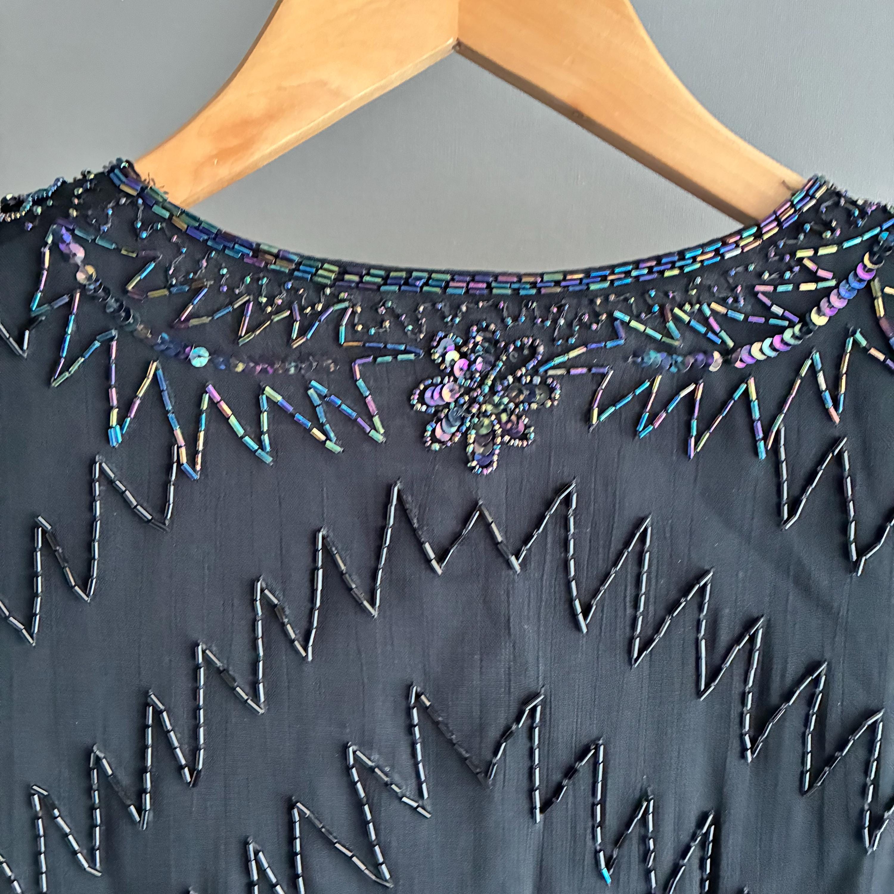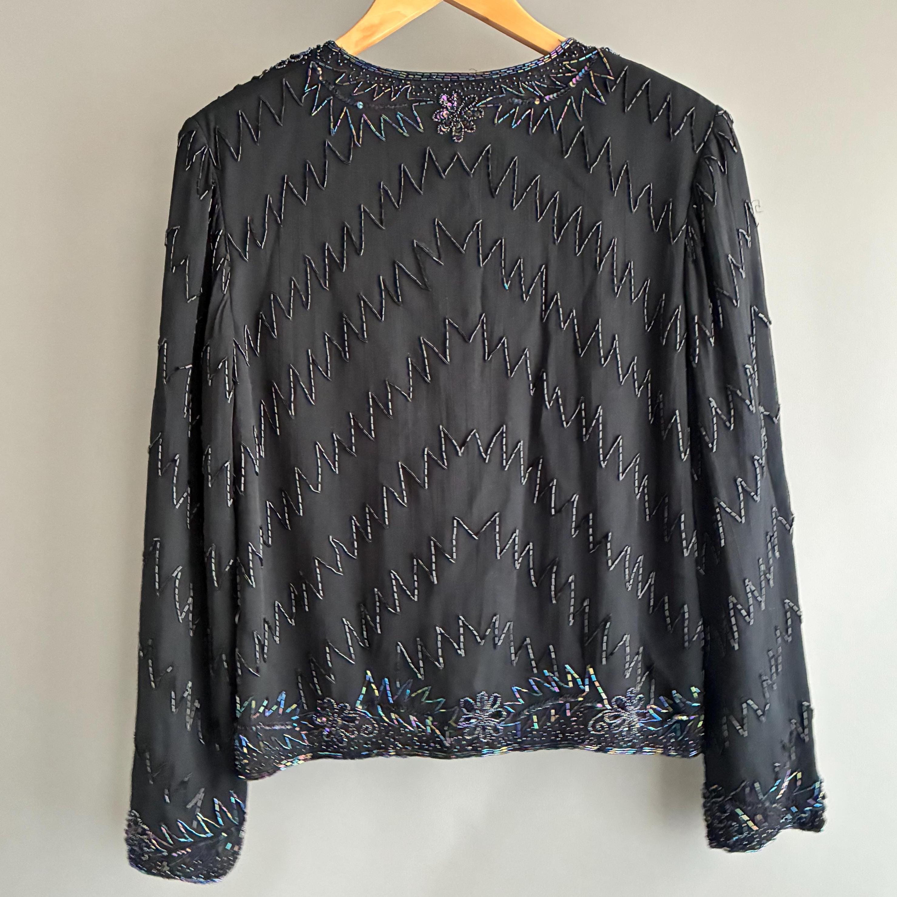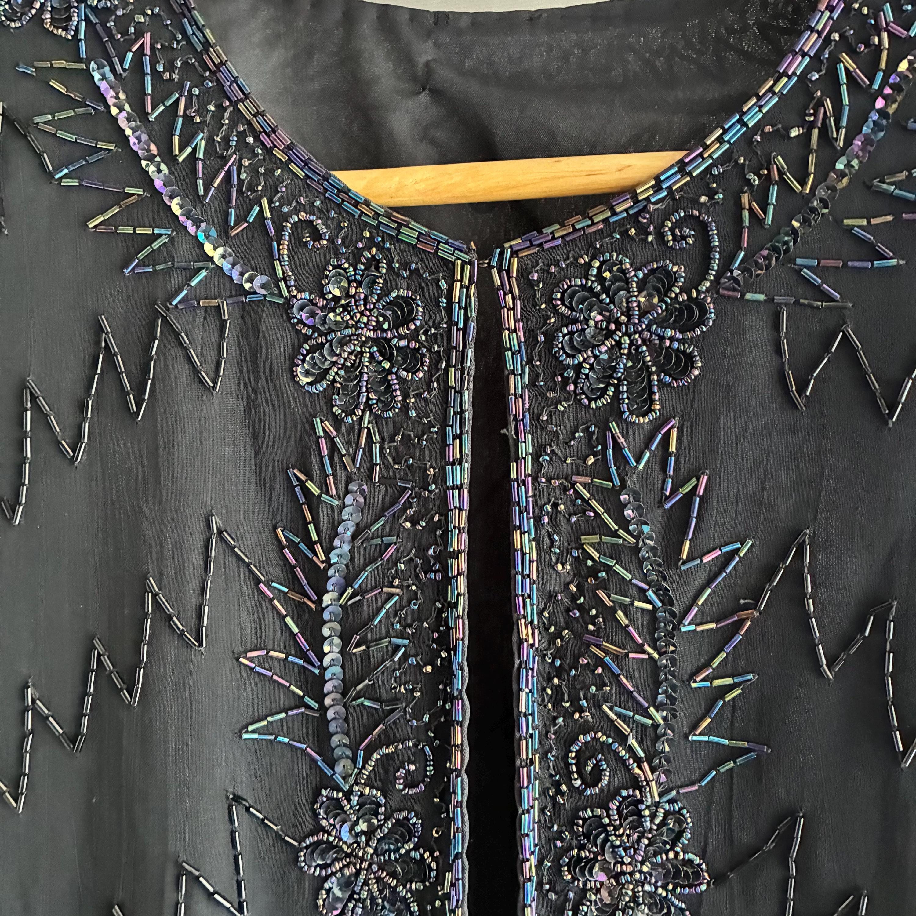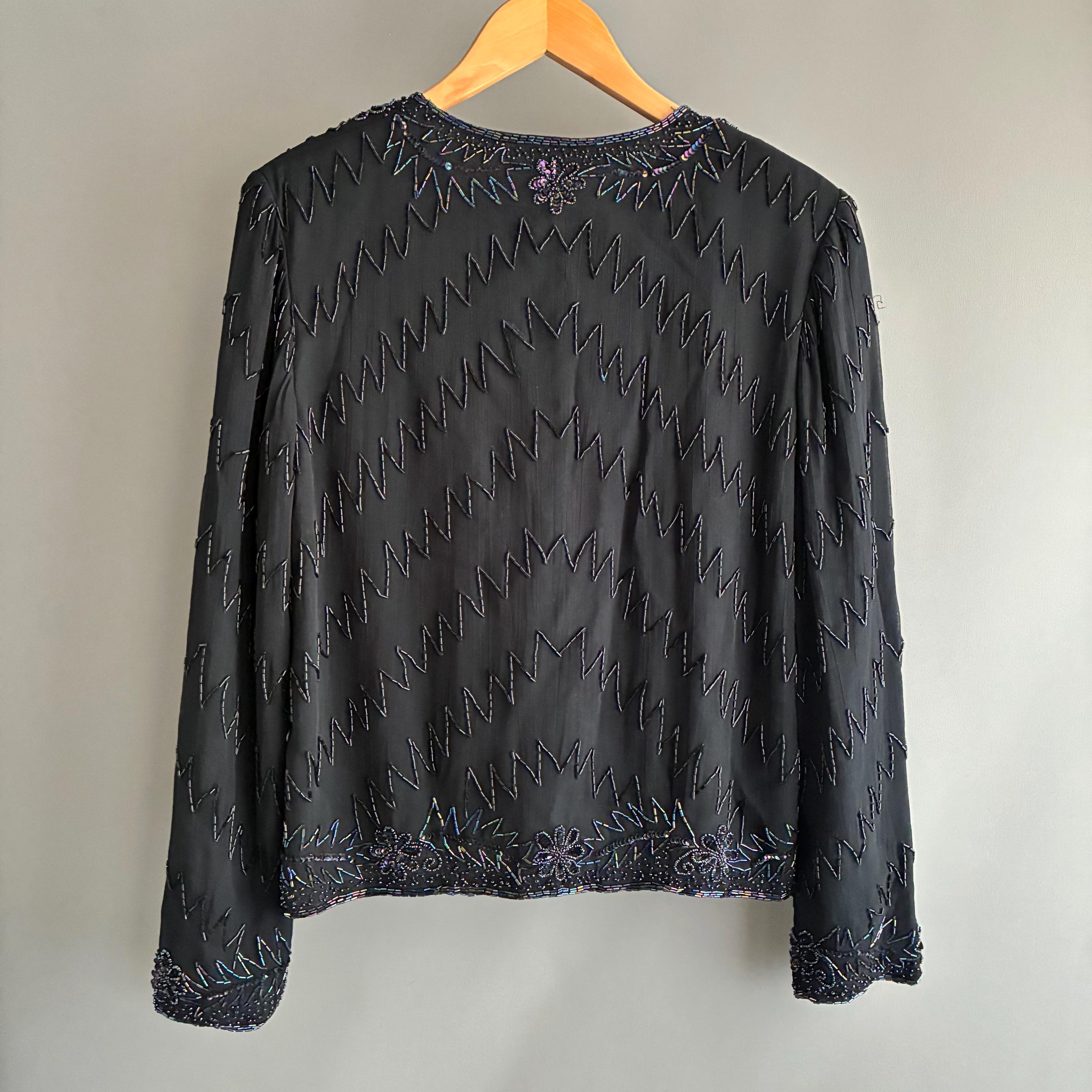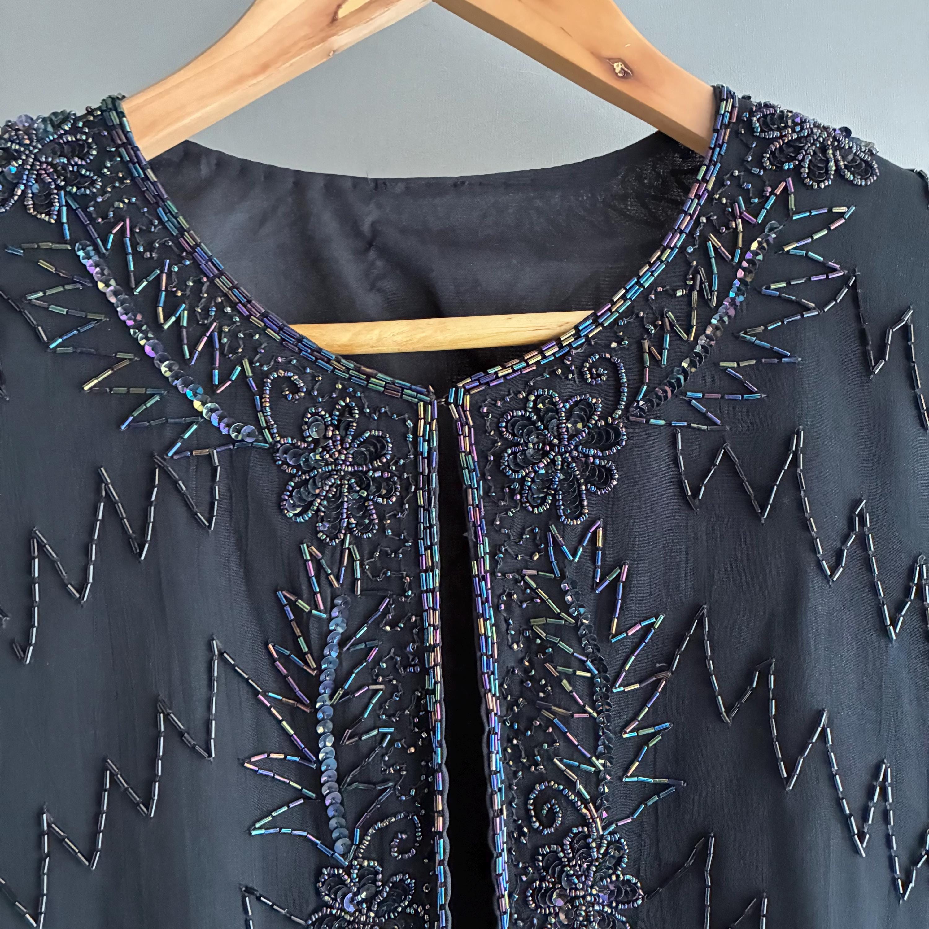 Beautiful glass bead embelished silk evening jacket. Fully lined with 1 hook closure at the crew neck collar. Small shoulderpads for structure. The glass beads have an iridescent sheen ( see pictures) this will fit UK size 12 . In exellent vintage condition . This snazzy little jacket will glam up anything its thrown over