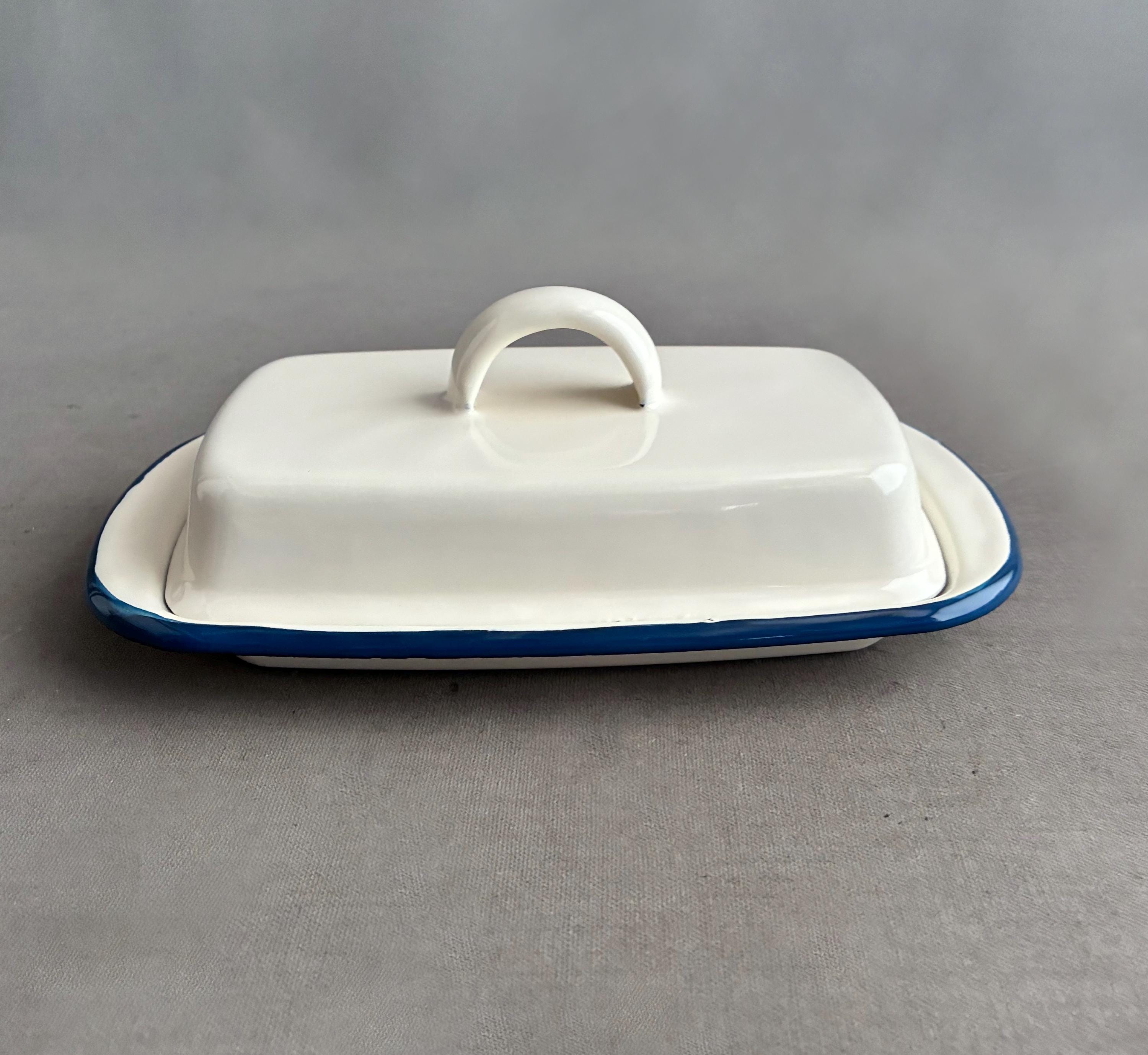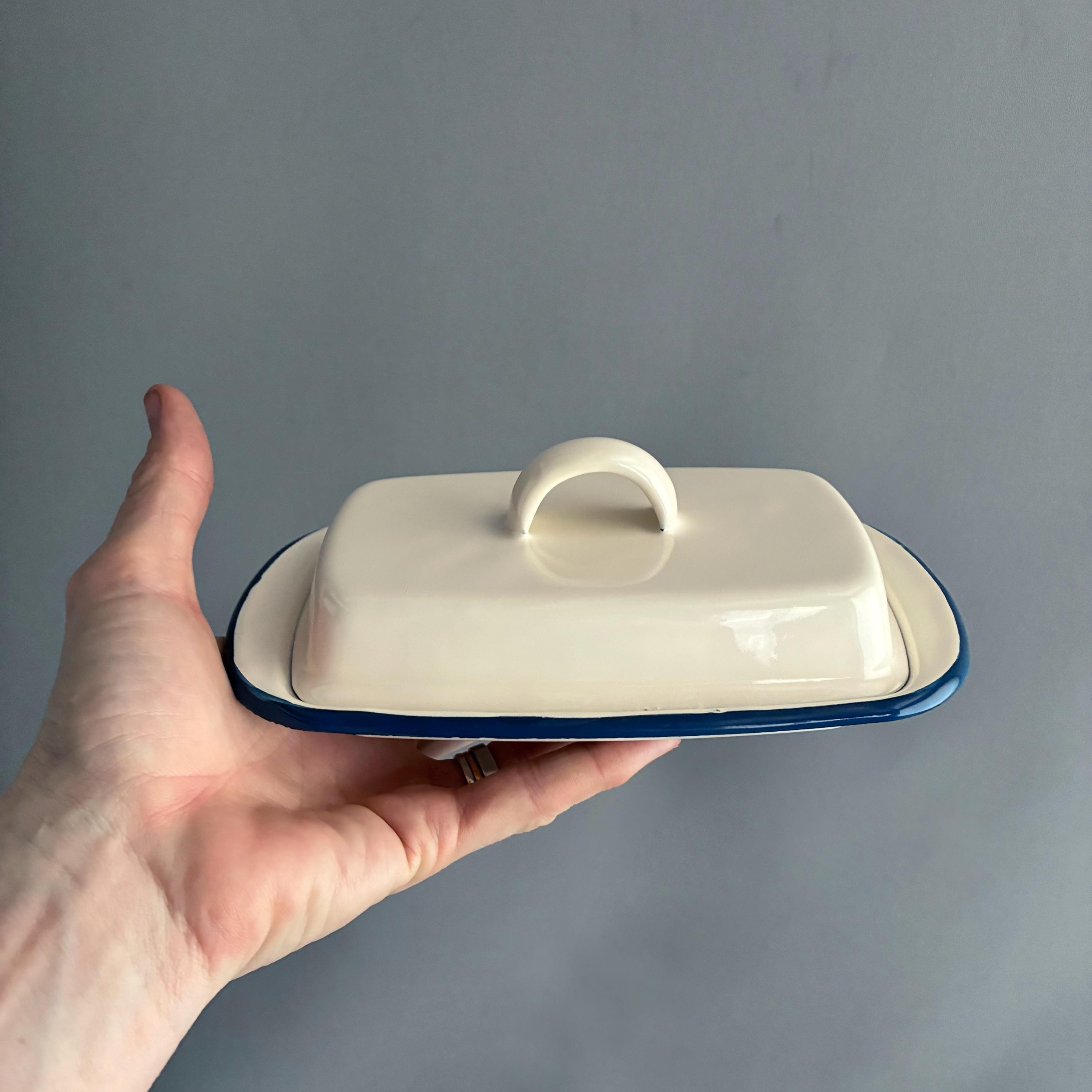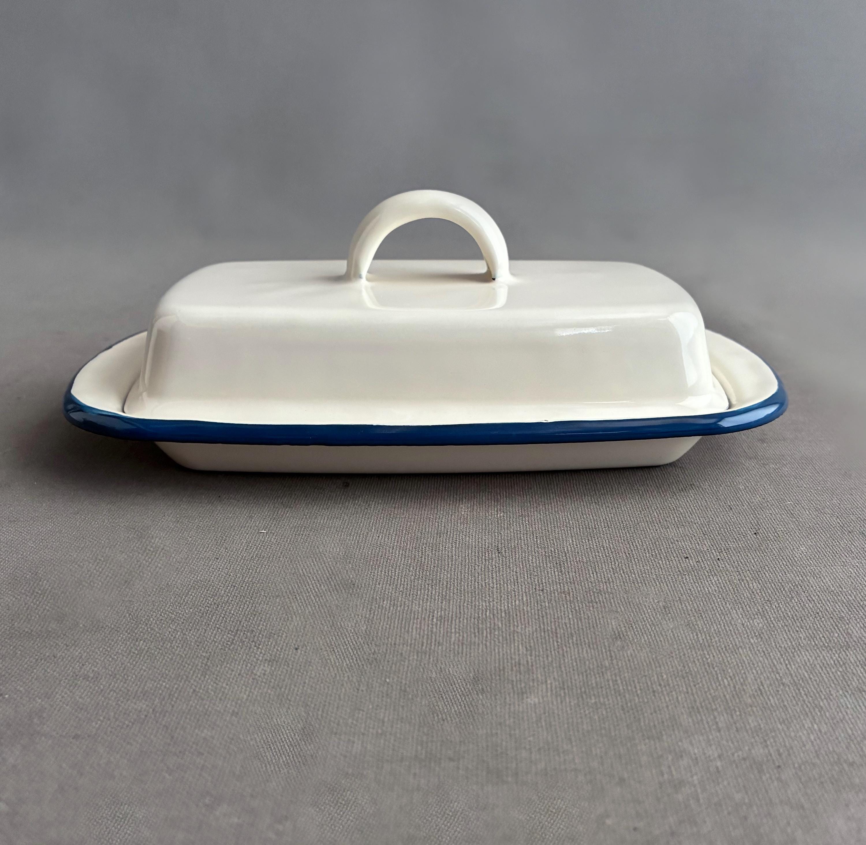 A neat and compact enamel tin butter dish. light pale cream colour with blue edge rim. Lift off lid with raised edge base tray. Classic french country kitchen styling for a practical item.