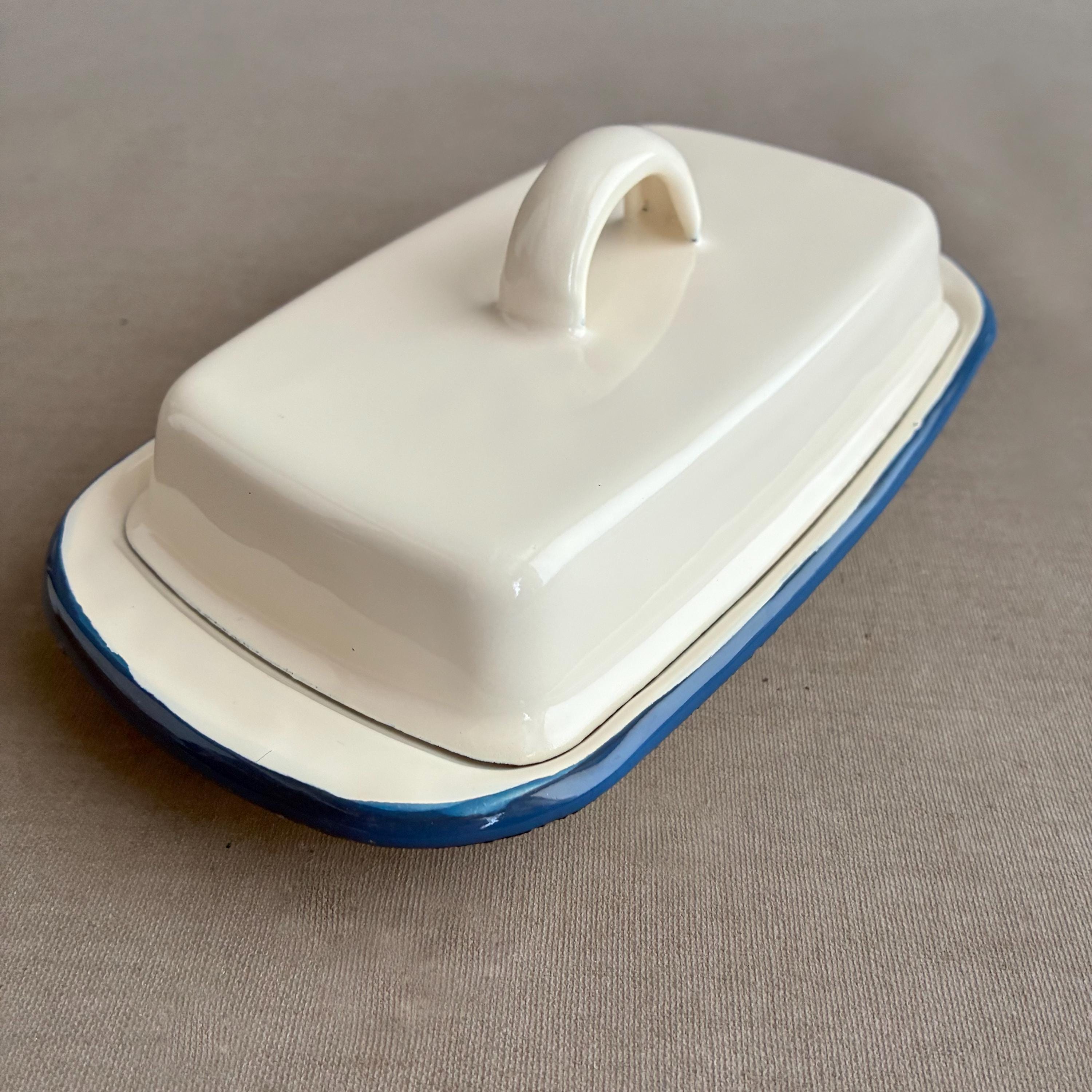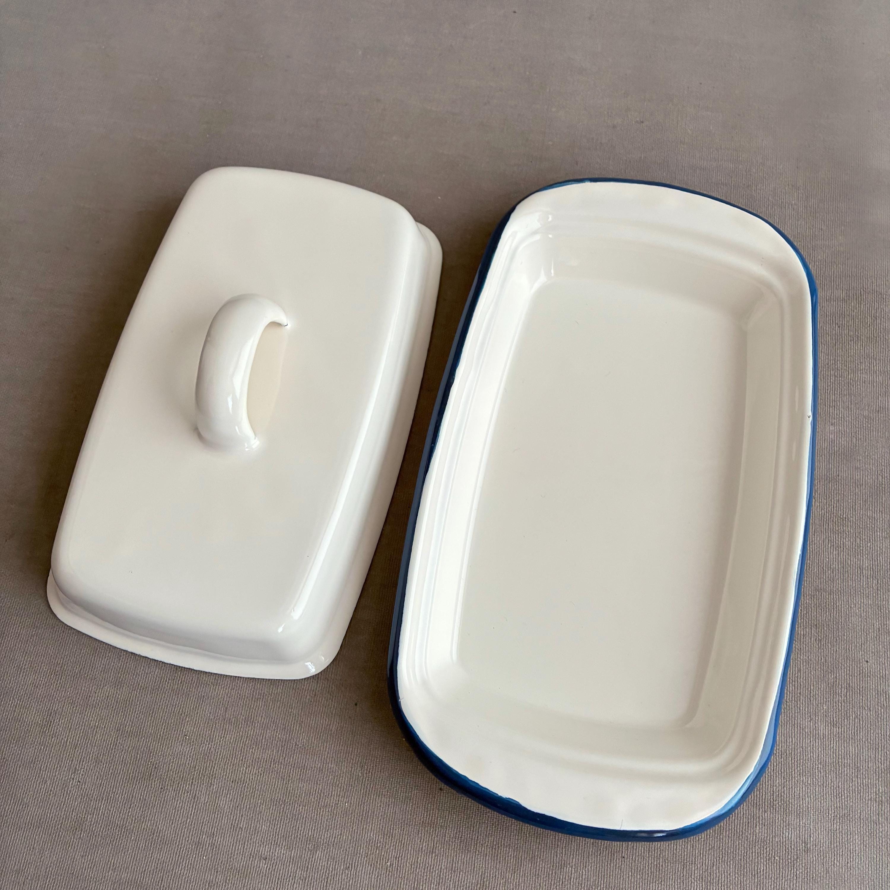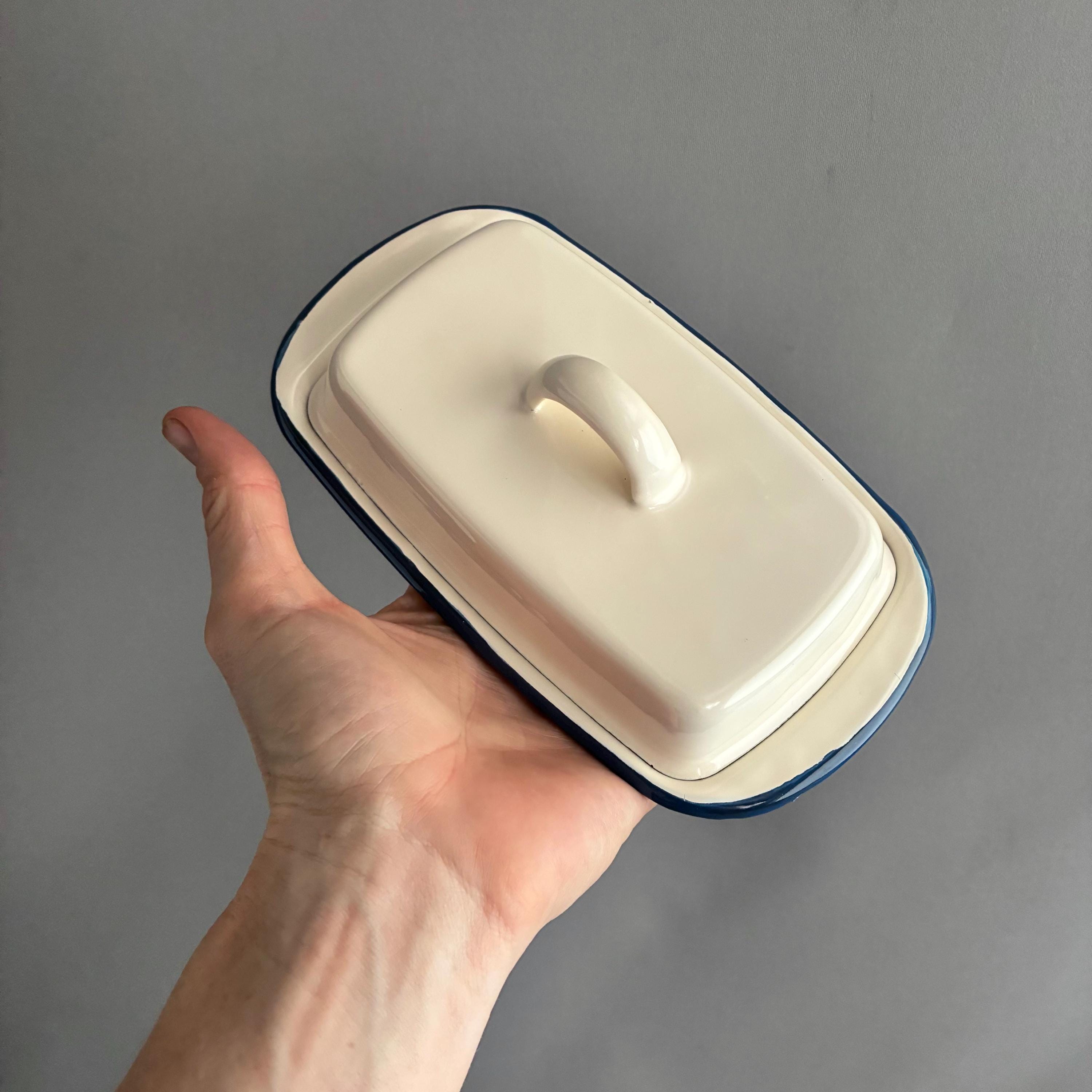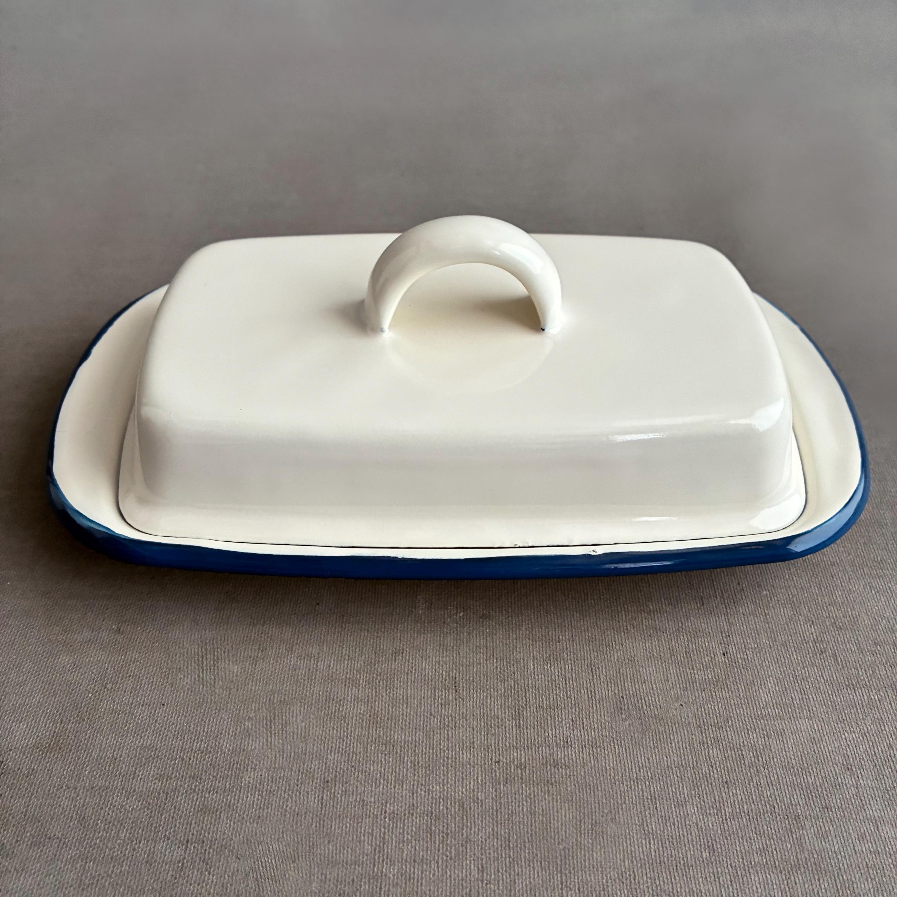 A neat and compact enamel tin butter dish. light pale cream colour with blue edge rim. Lift off lid with raised edge base tray. Classic french country kitchen styling for a practical item.