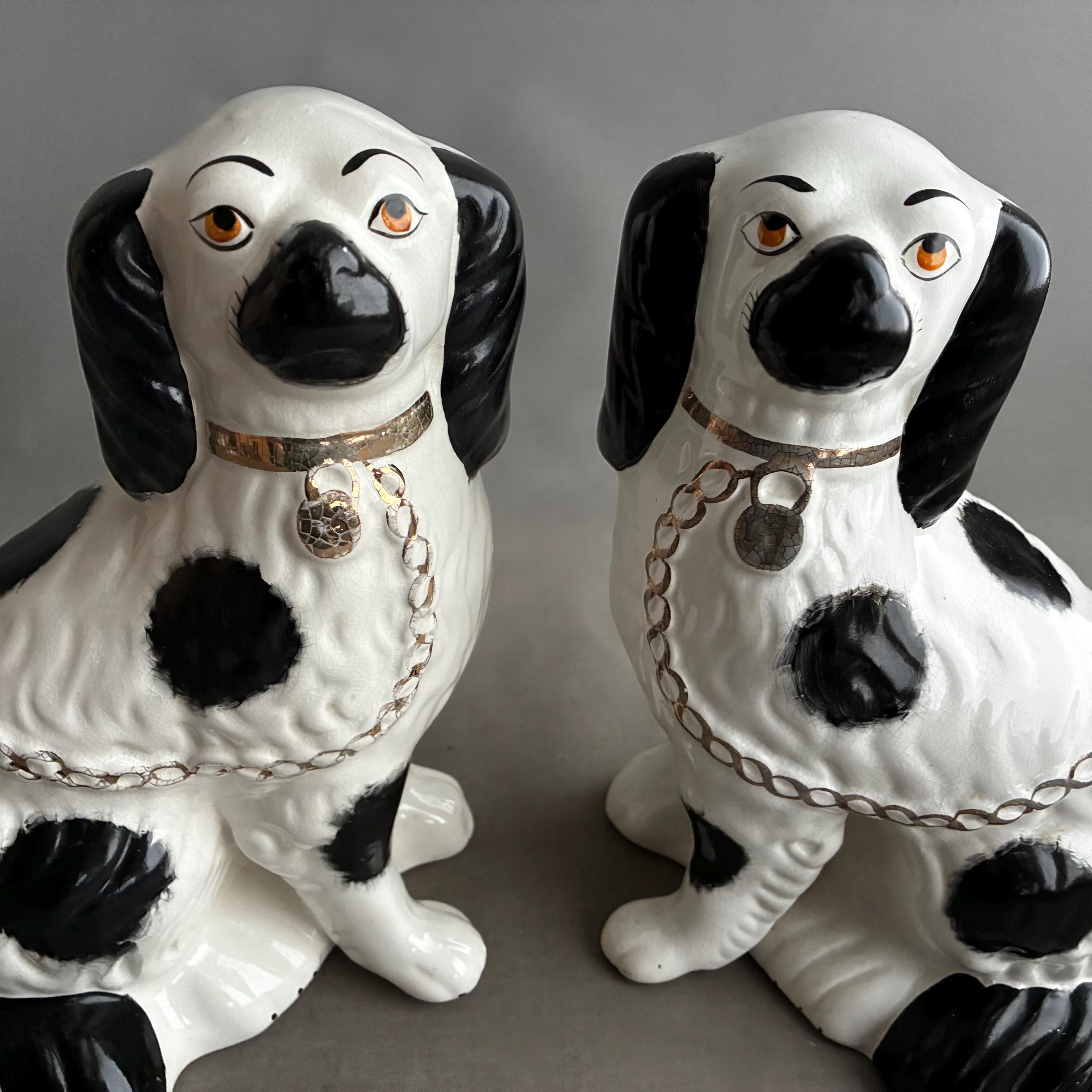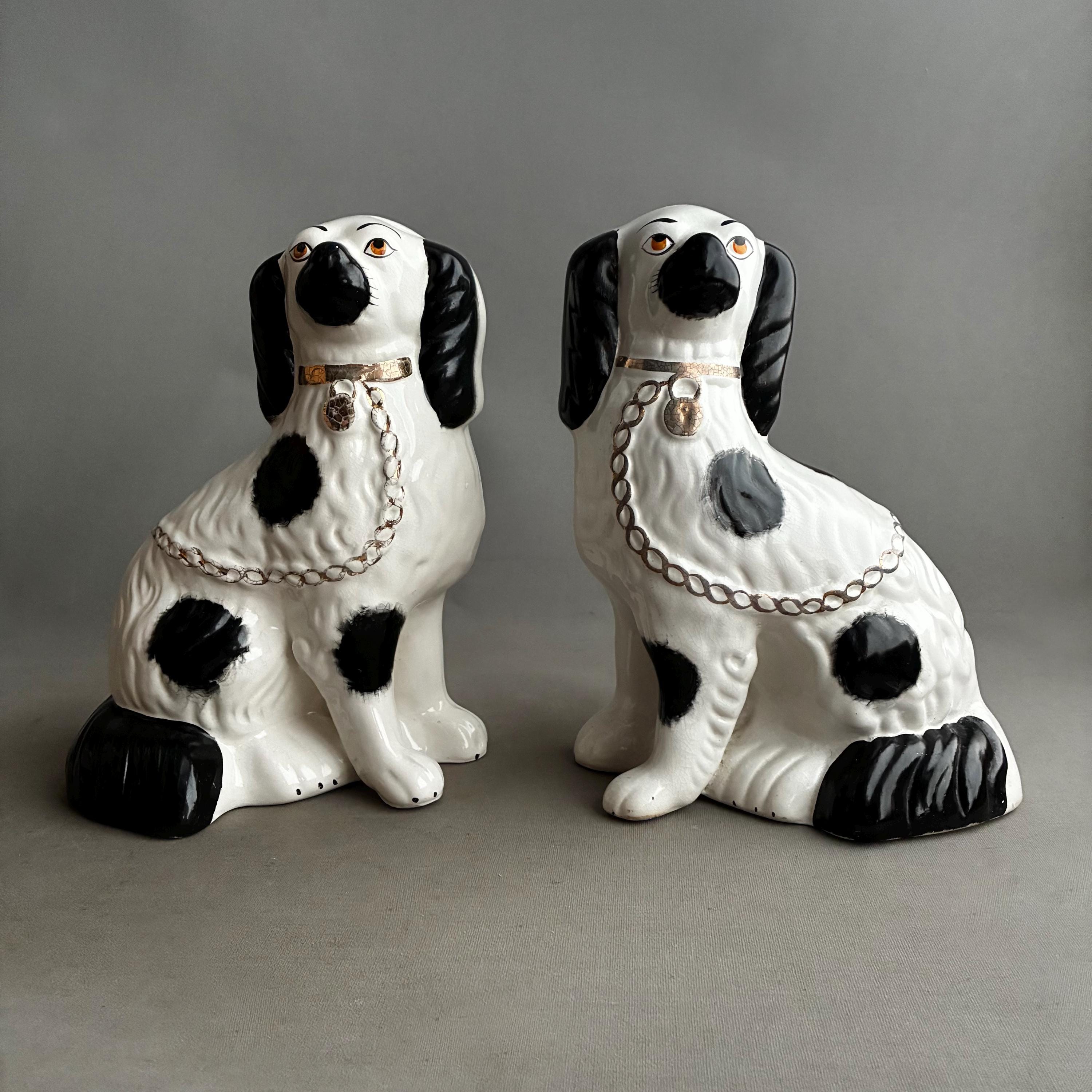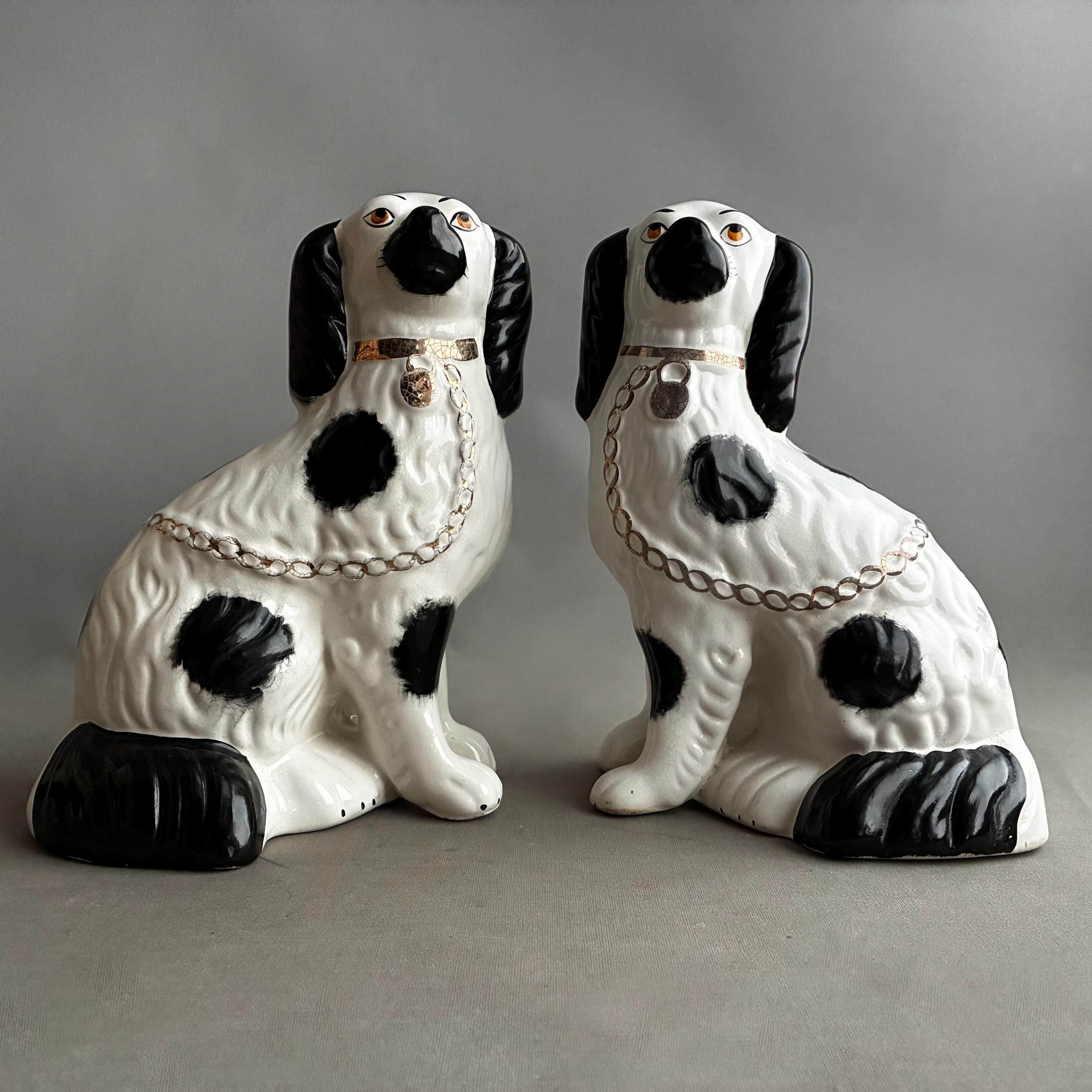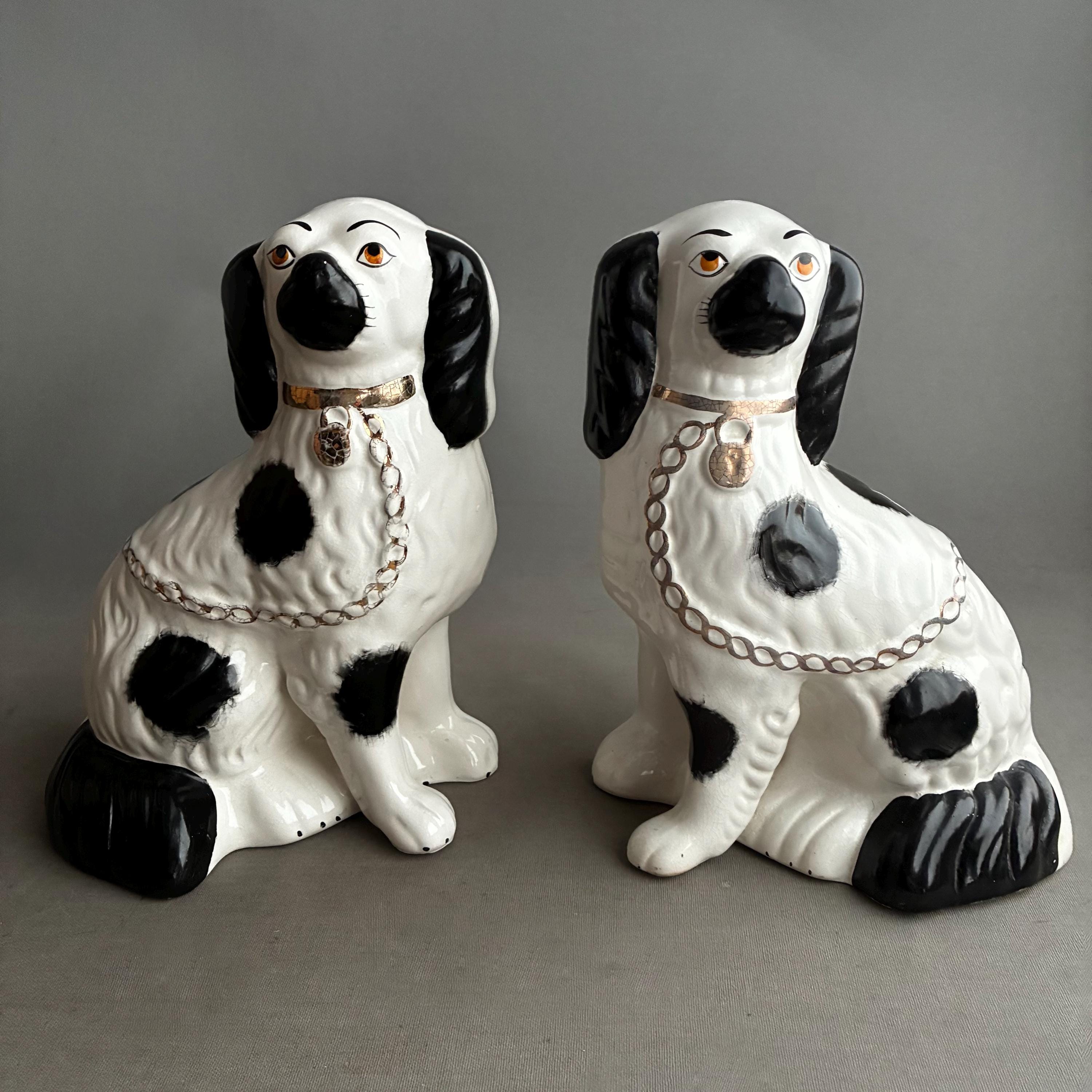 These figurines are a pair of 20th-century decorative black and white King Charles Spaniel mantle dogs, manufactured in Staffordshire, England hence they are known as Staffordshire Dogs ,colloquially known as "Wally Dugs". White earthenware with black painted spots, black ears, and gold-painted chains, collars, and lock tags. Produced as facing pairs to sit on mantelpieces, styled after Victorian-era originals.