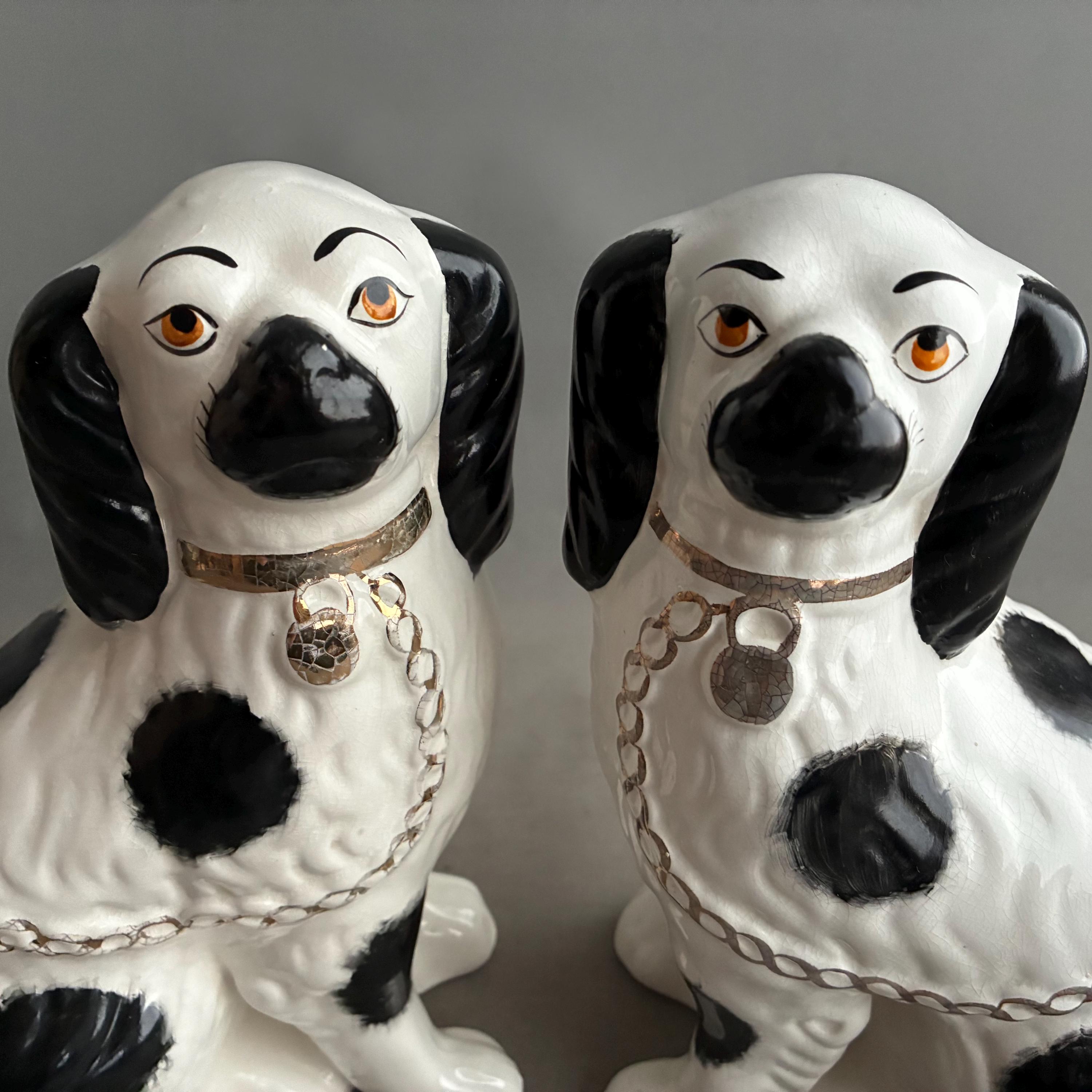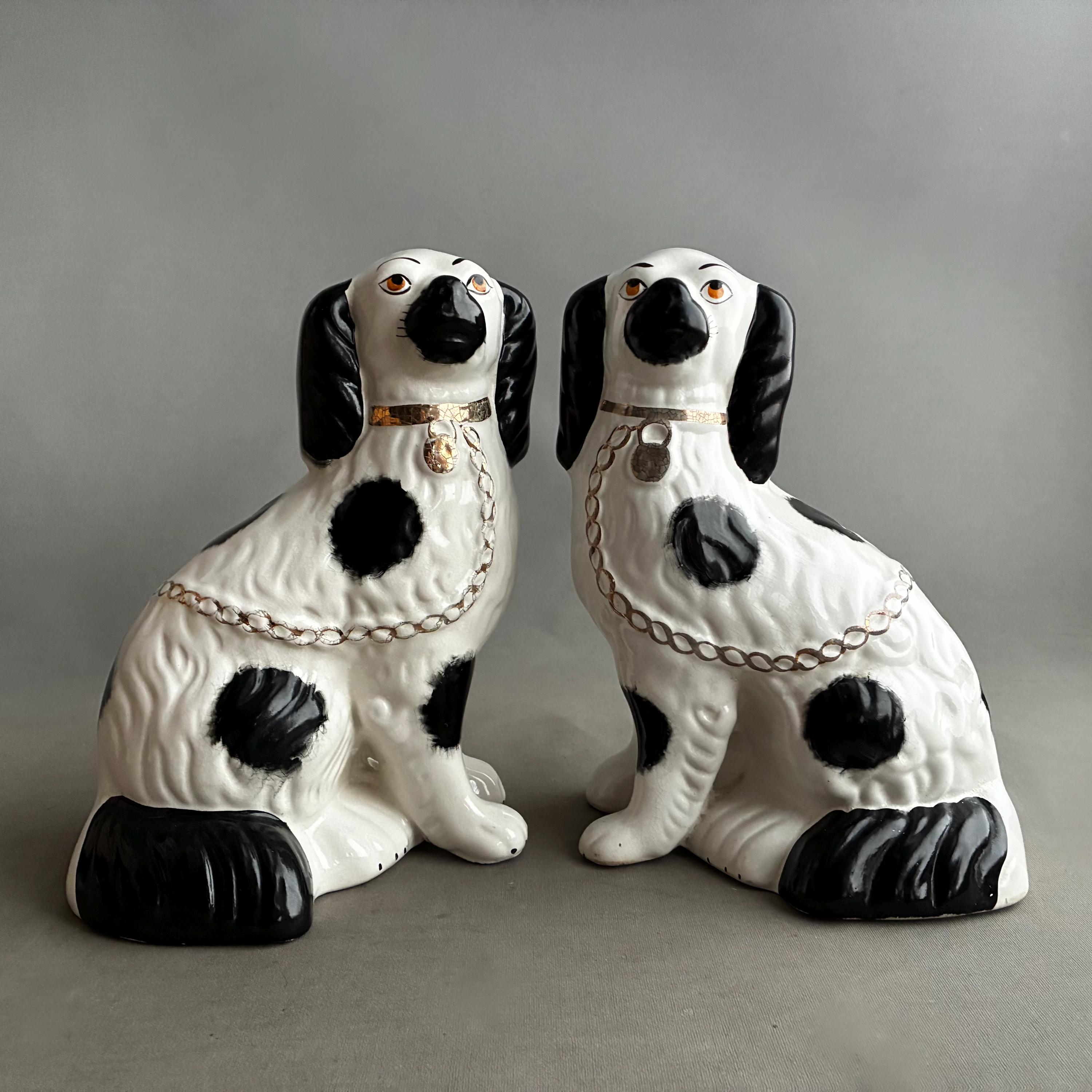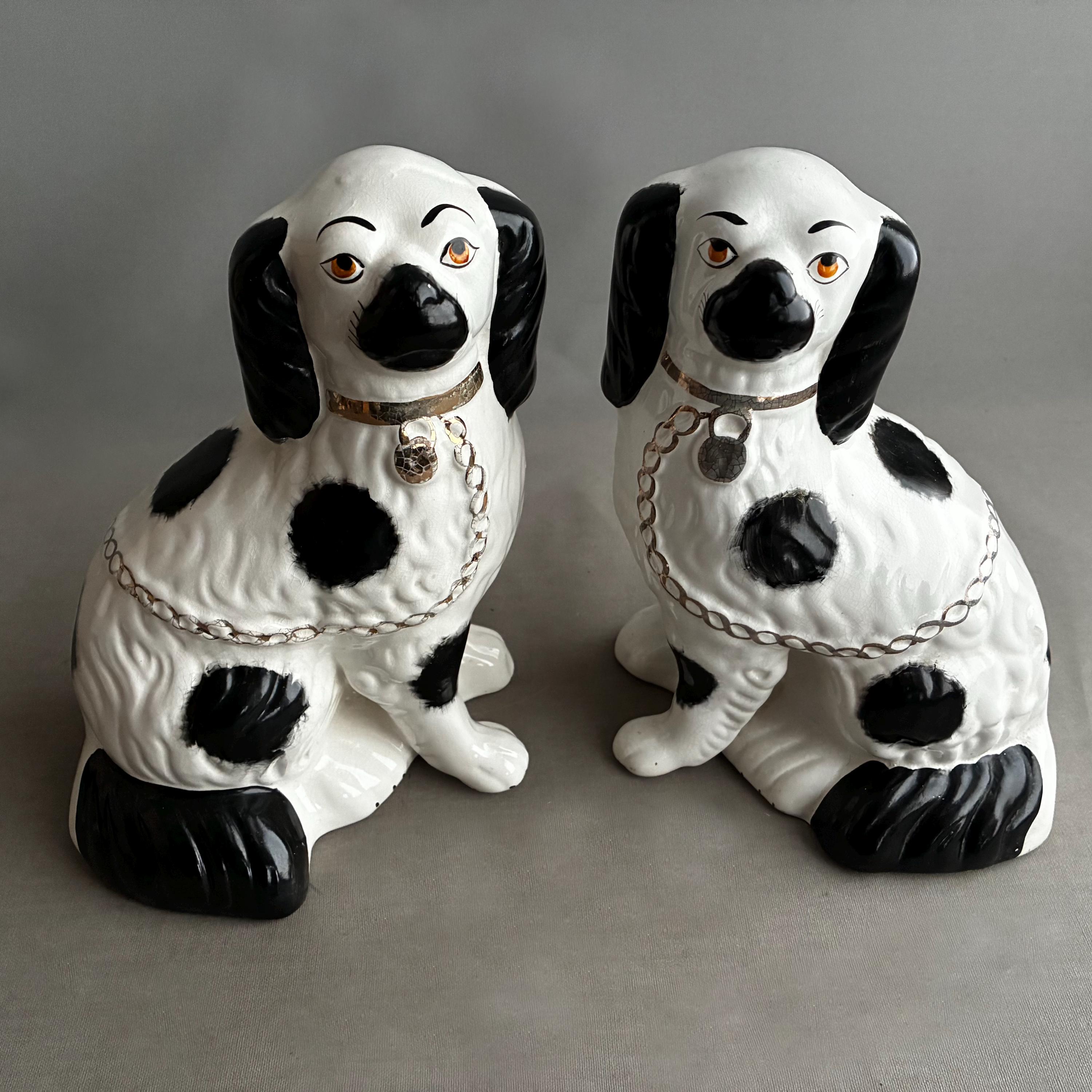 These figurines are a pair of 20th-century decorative black and white King Charles Spaniel mantle dogs, manufactured in Staffordshire, England hence they are known as Staffordshire Dogs ,colloquially known as "Wally Dugs". White earthenware with black painted spots, black ears, and gold-painted chains, collars, and lock tags. Produced as facing pairs to sit on mantelpieces, styled after Victorian-era originals.
