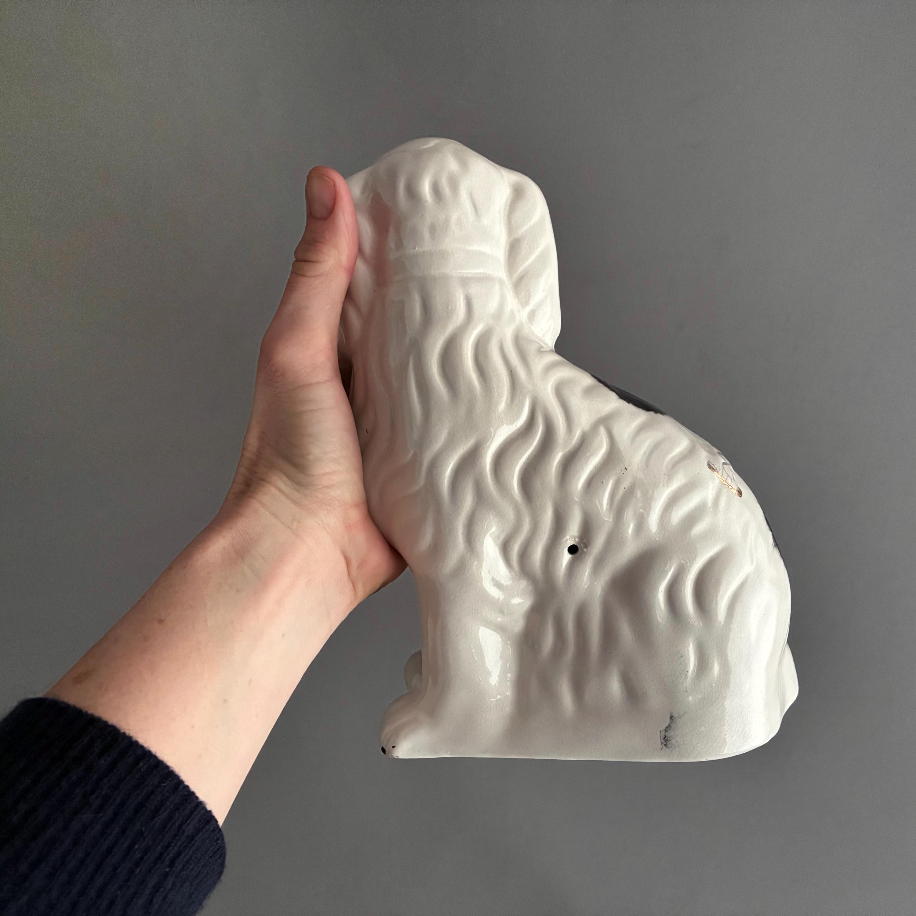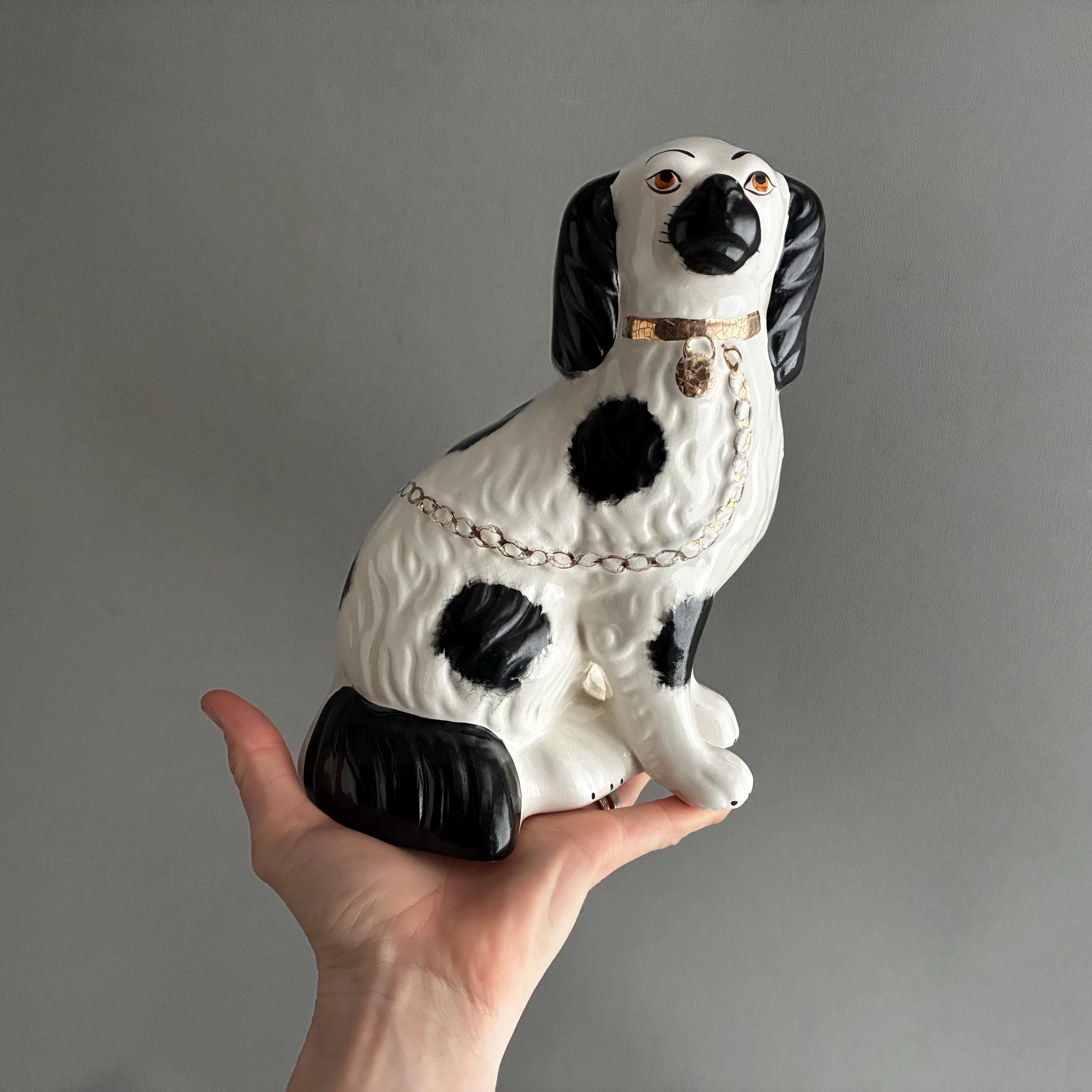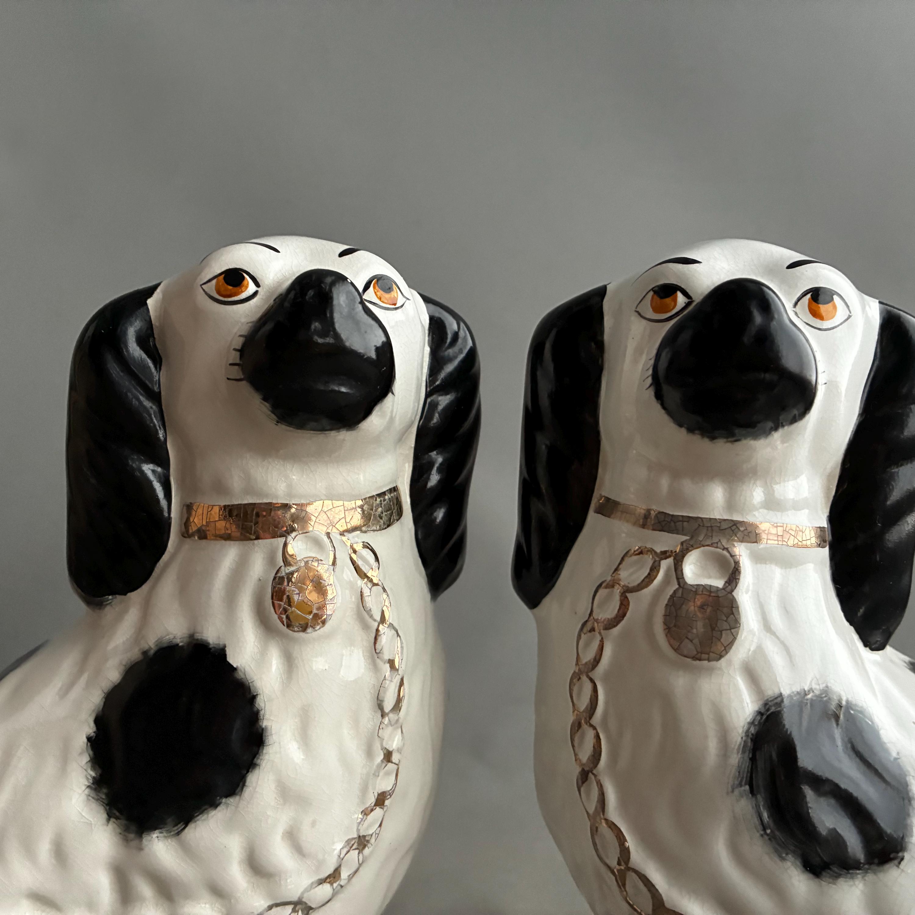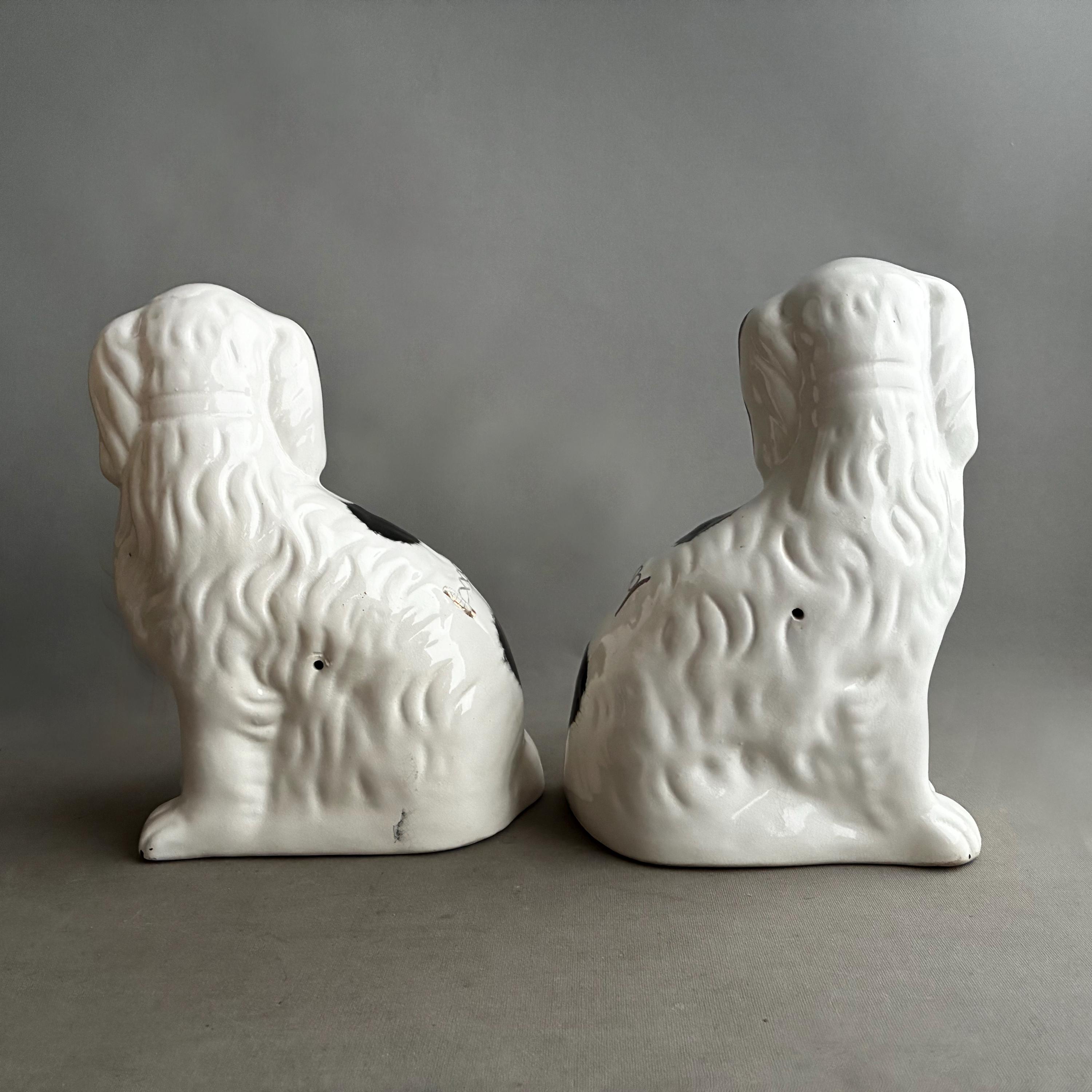 These figurines are a pair of 20th-century decorative black and white King Charles Spaniel mantle dogs, manufactured in Staffordshire, England hence they are known as Staffordshire Dogs ,colloquially known as "Wally Dugs". White earthenware with black painted spots, black ears, and gold-painted chains, collars, and lock tags. Produced as facing pairs to sit on mantelpieces, styled after Victorian-era originals.