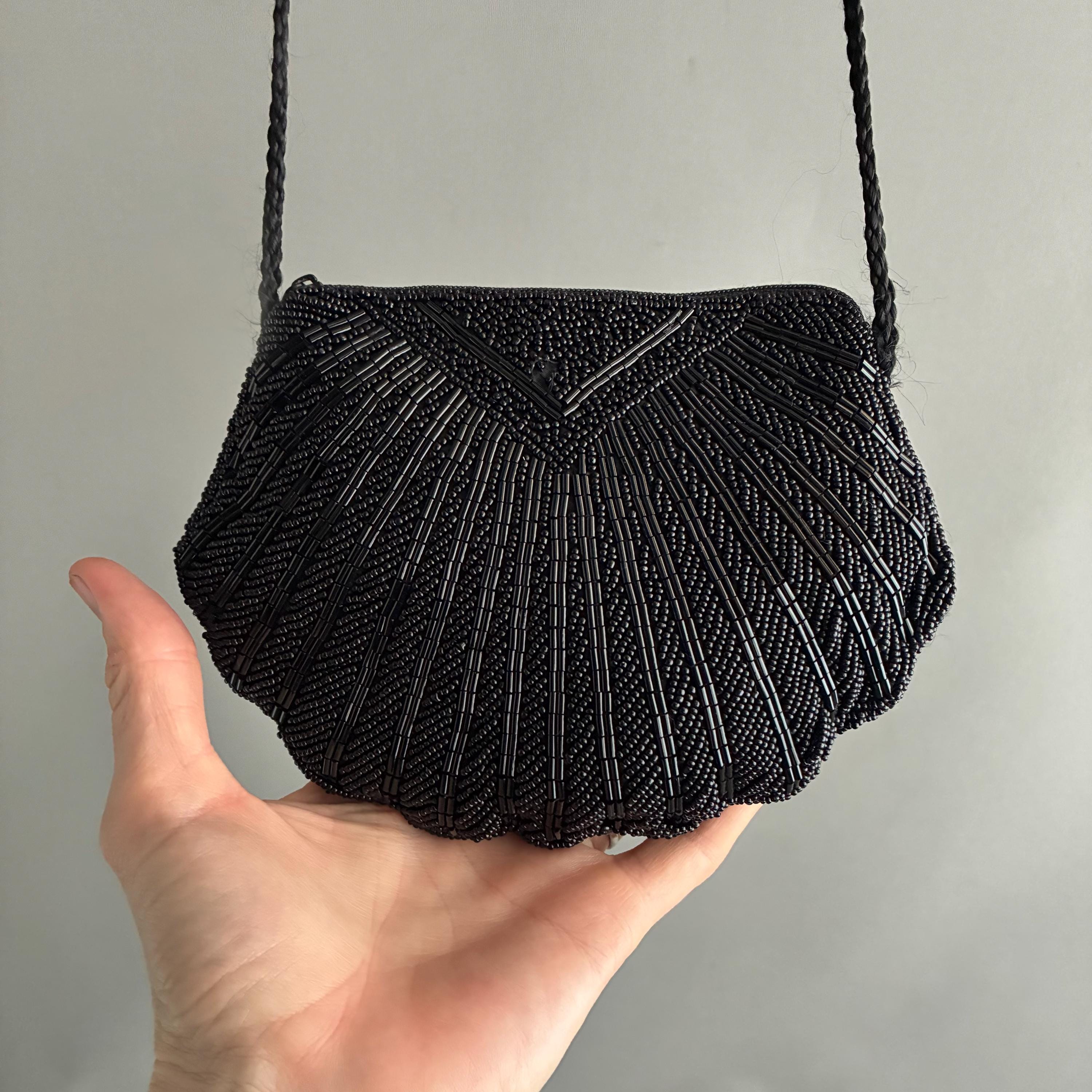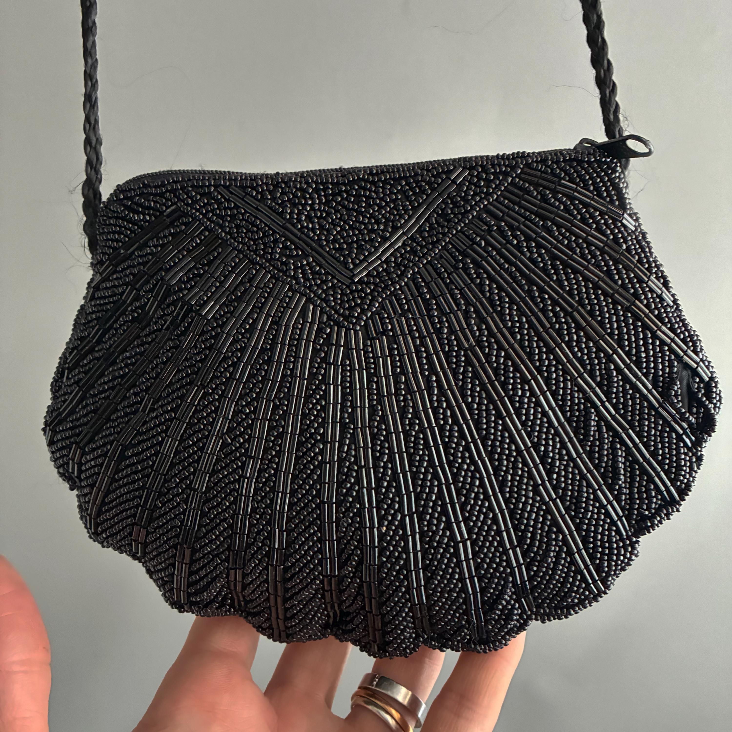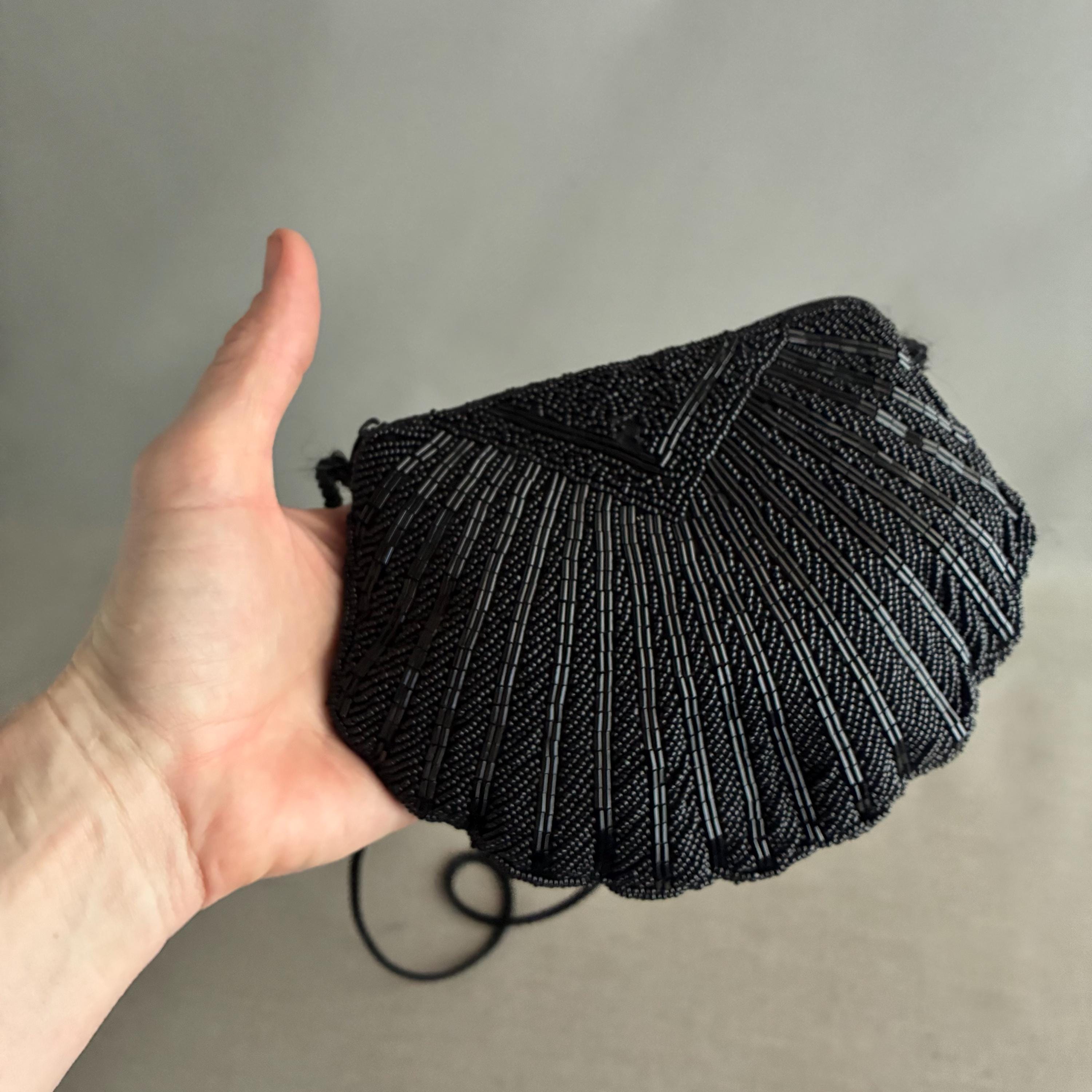 deco style Black Beaded clam Shell Purse Hand Bag. Zip closure , satin lined with long rope strap. A snazzy little bead bag for dressy outings