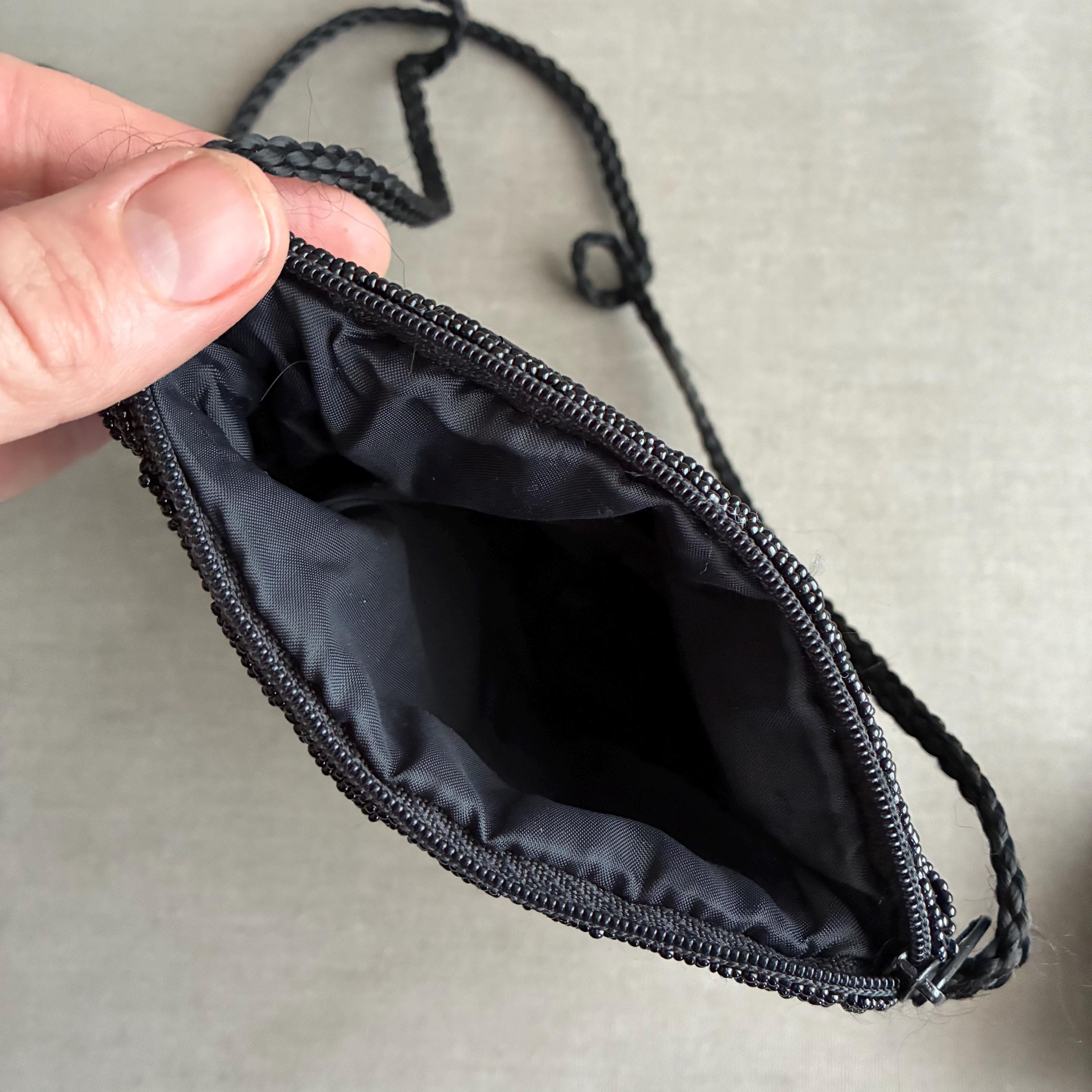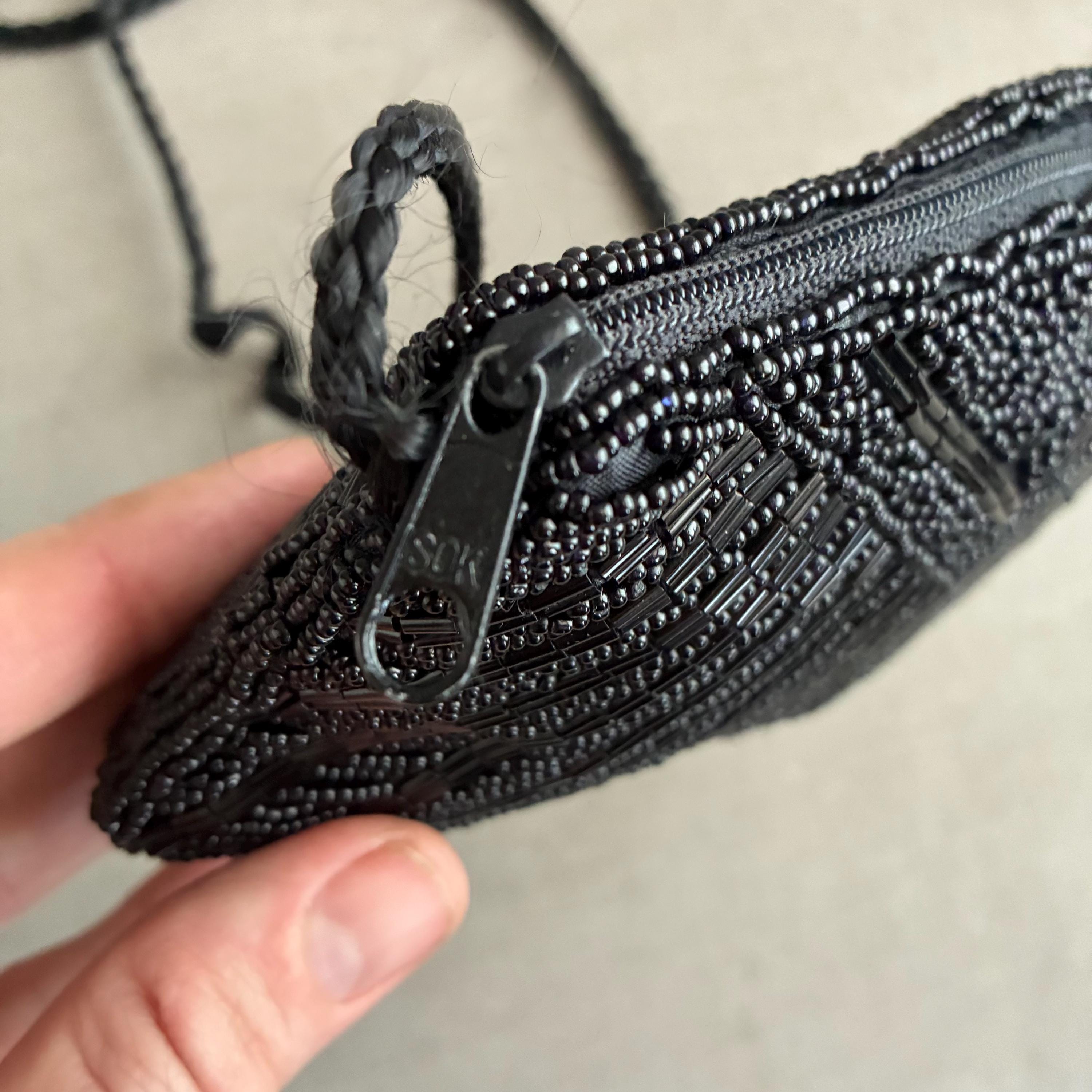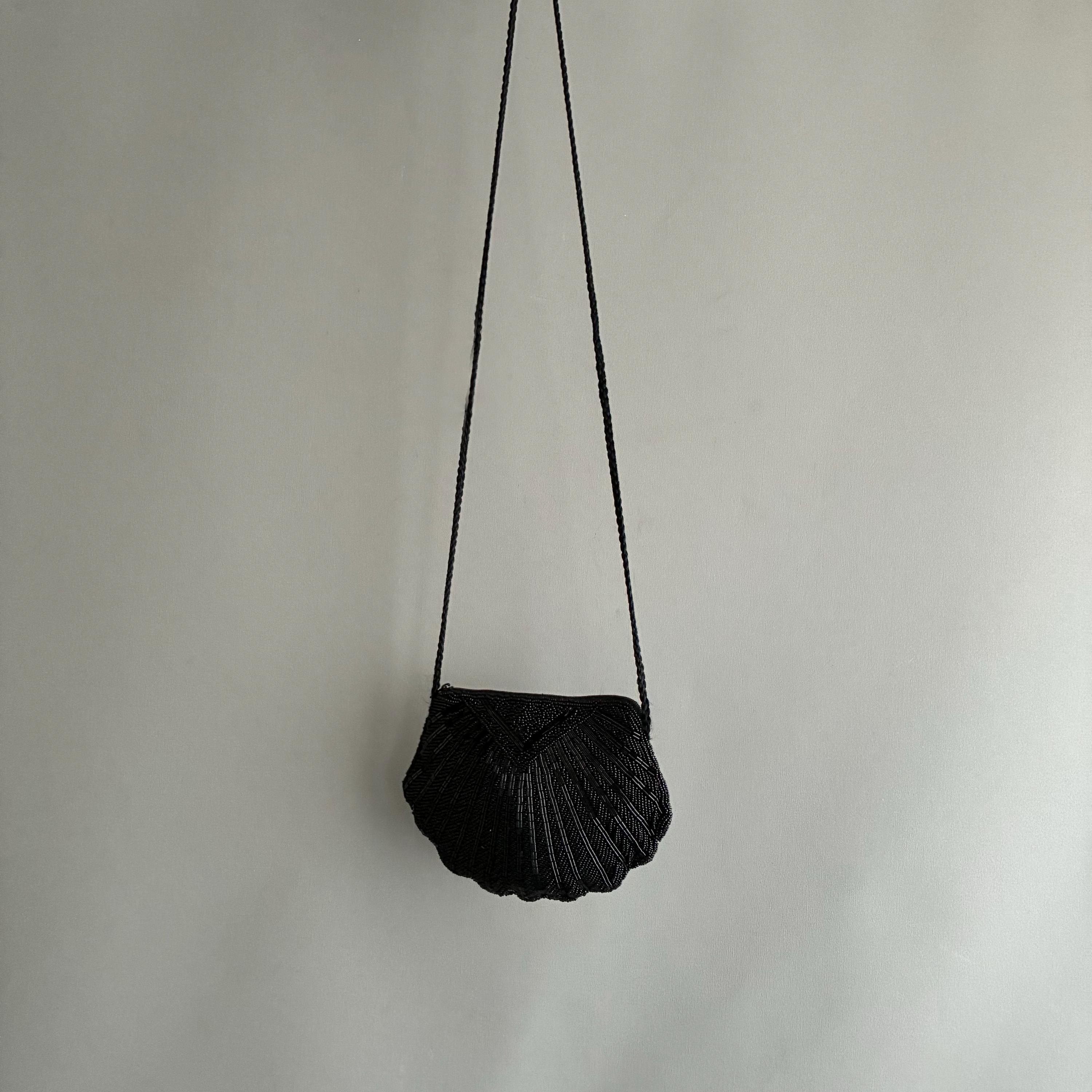 deco style Black Beaded clam Shell Purse Hand Bag. Zip closure , satin lined with long rope strap. A snazzy little bead bag for dressy outings