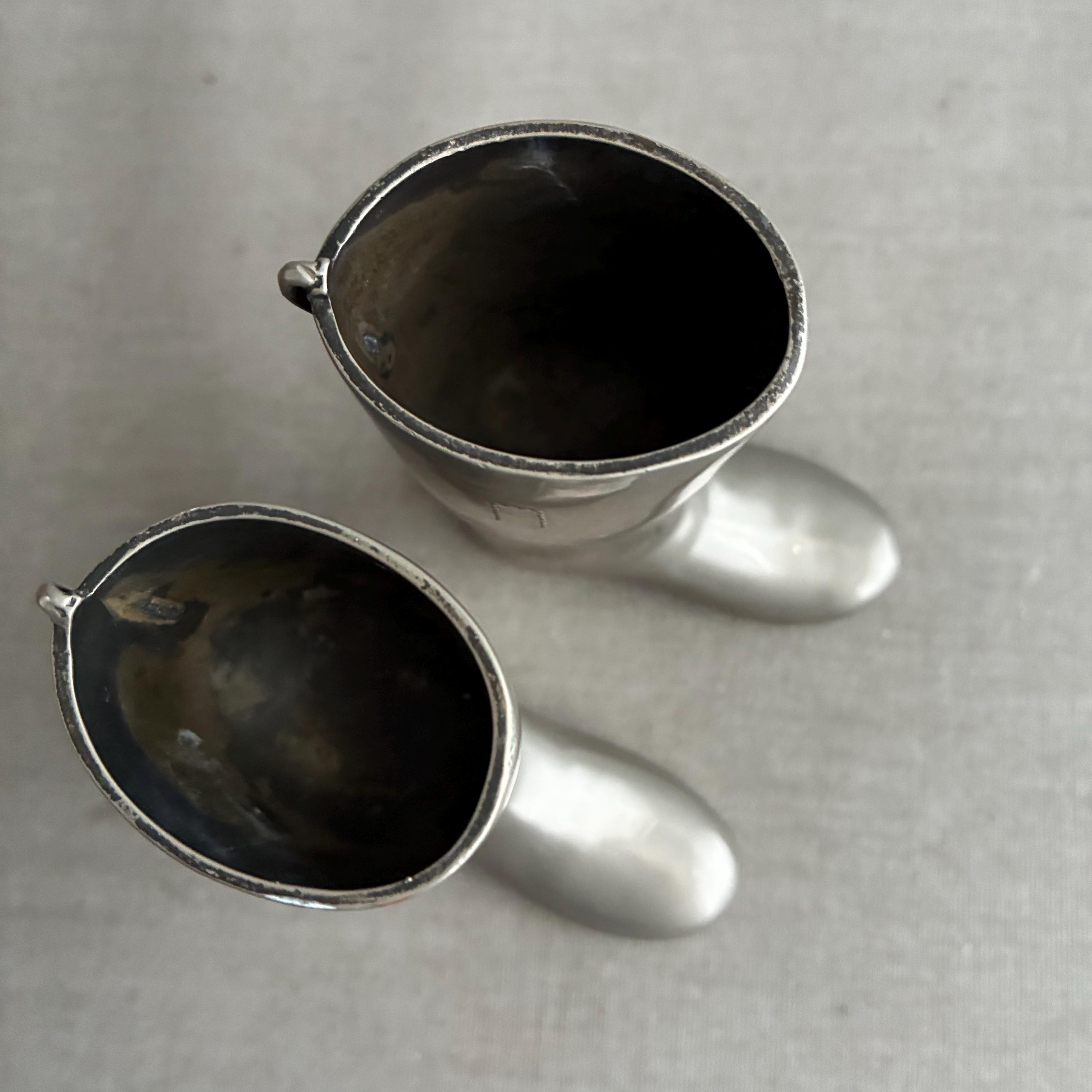A quirky Vintage set of Silver Plated Boot Shot Glass Measuring Cups – Made in England. These novelty bar accessories combine practical use with decorative vintage style.