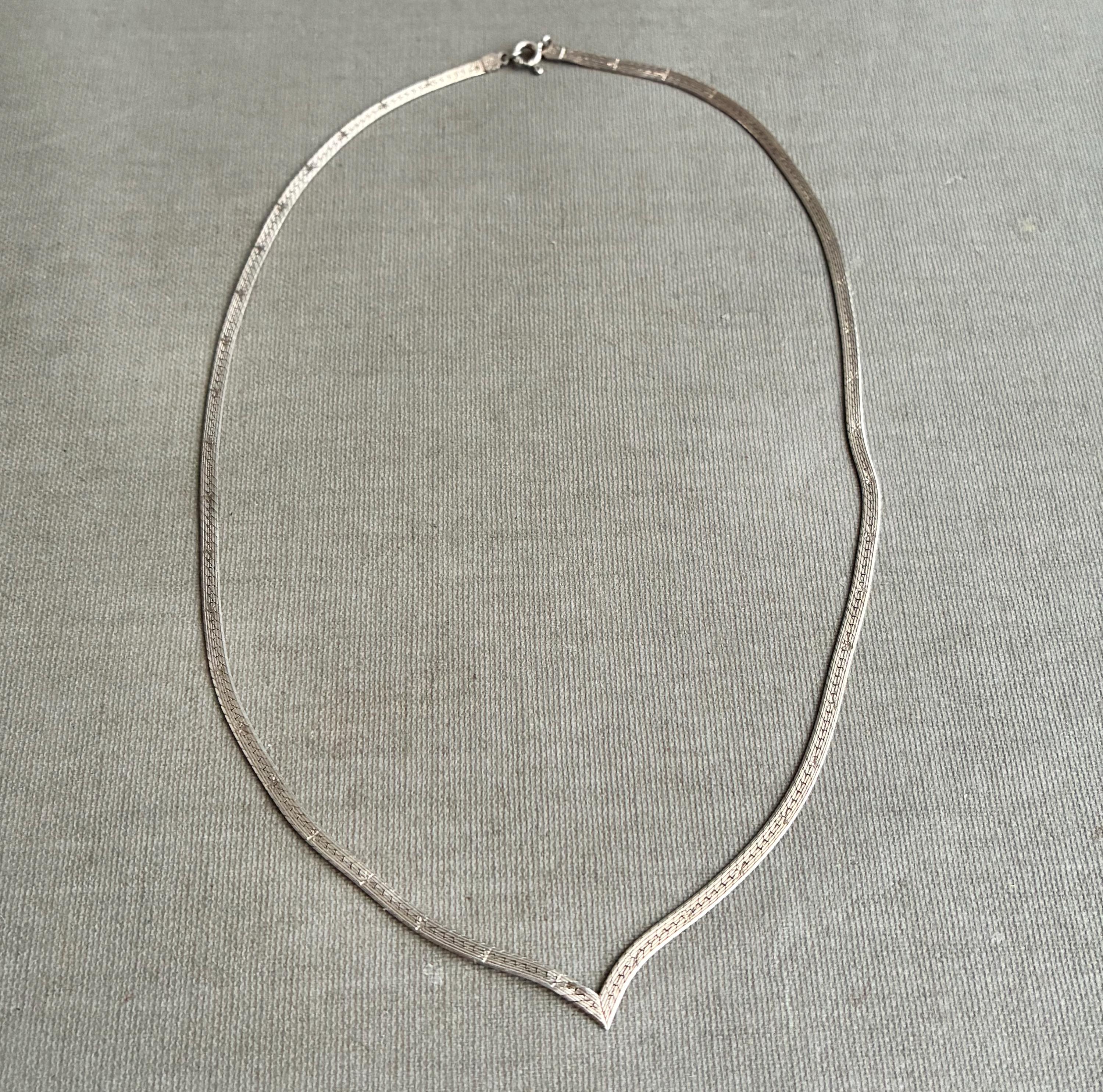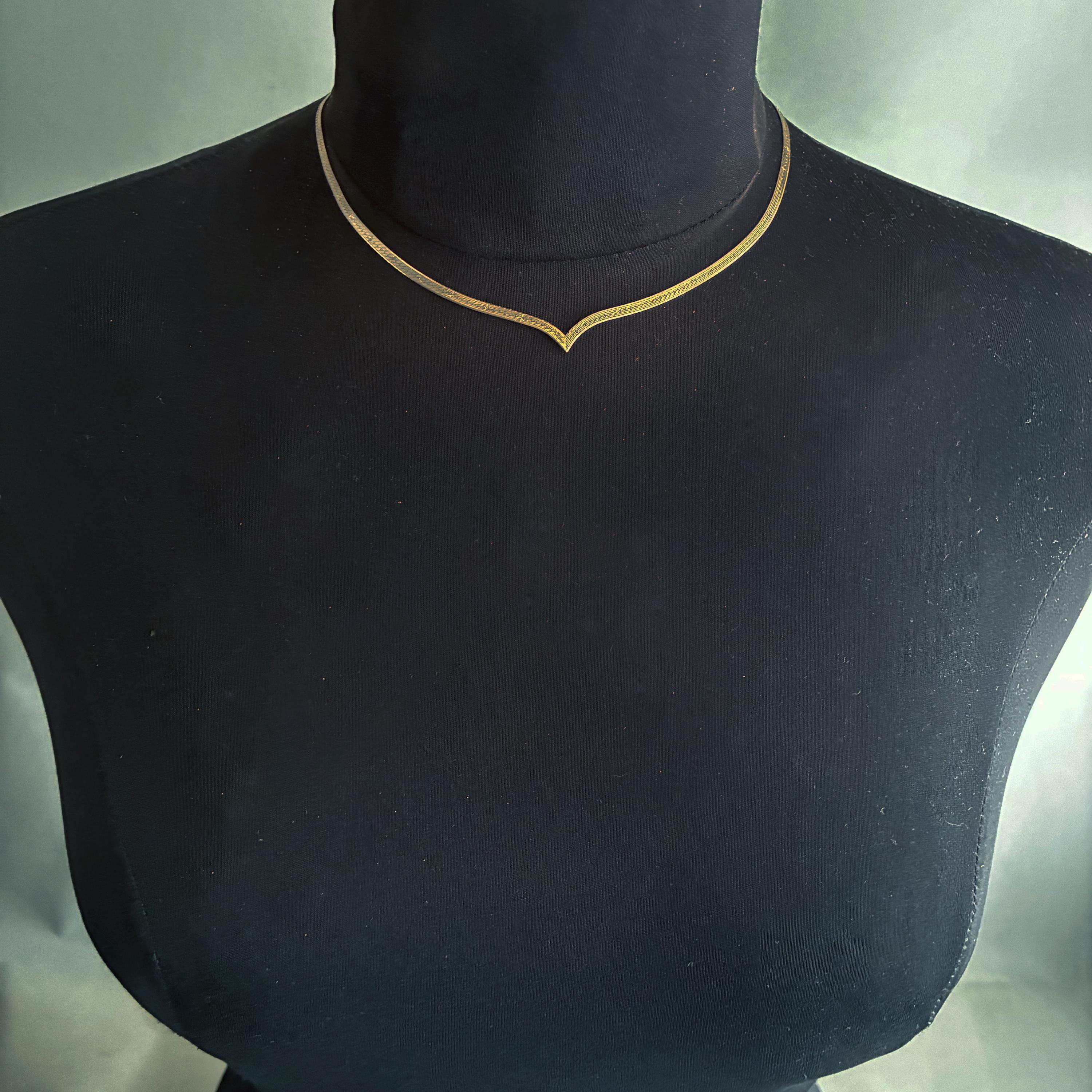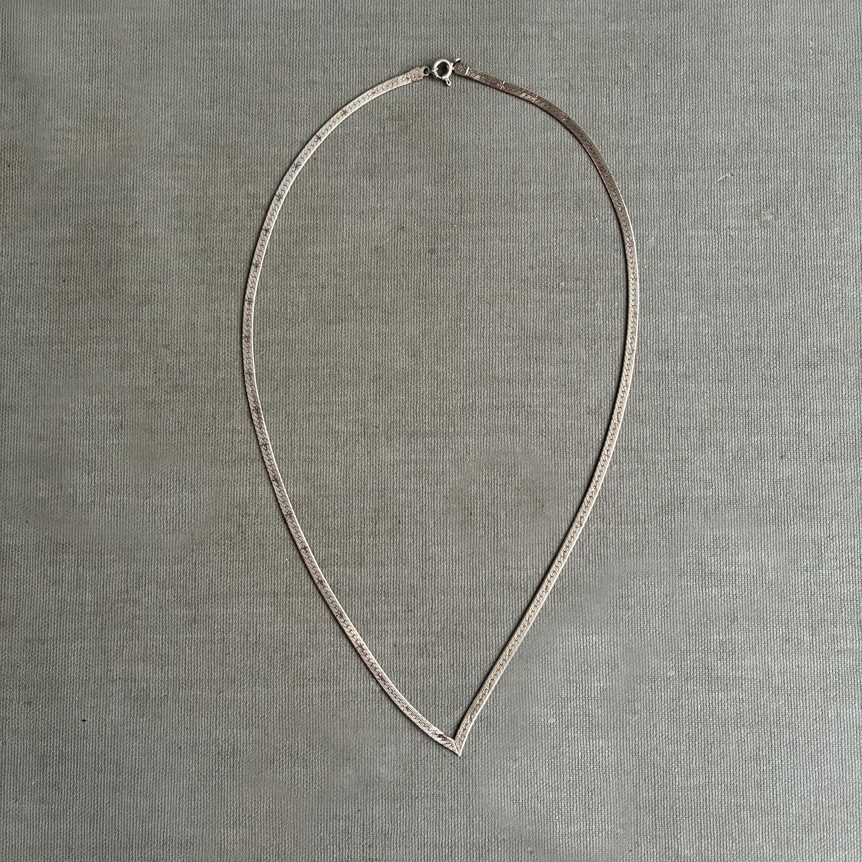 A minimalist and very elegant V-shaped flat snake chain choker necklace, fashioned from sterling silver ( 925 ) It looks gold on the mannequine but this is just reflection off the silver .Supplied in a box perfect for gifting
