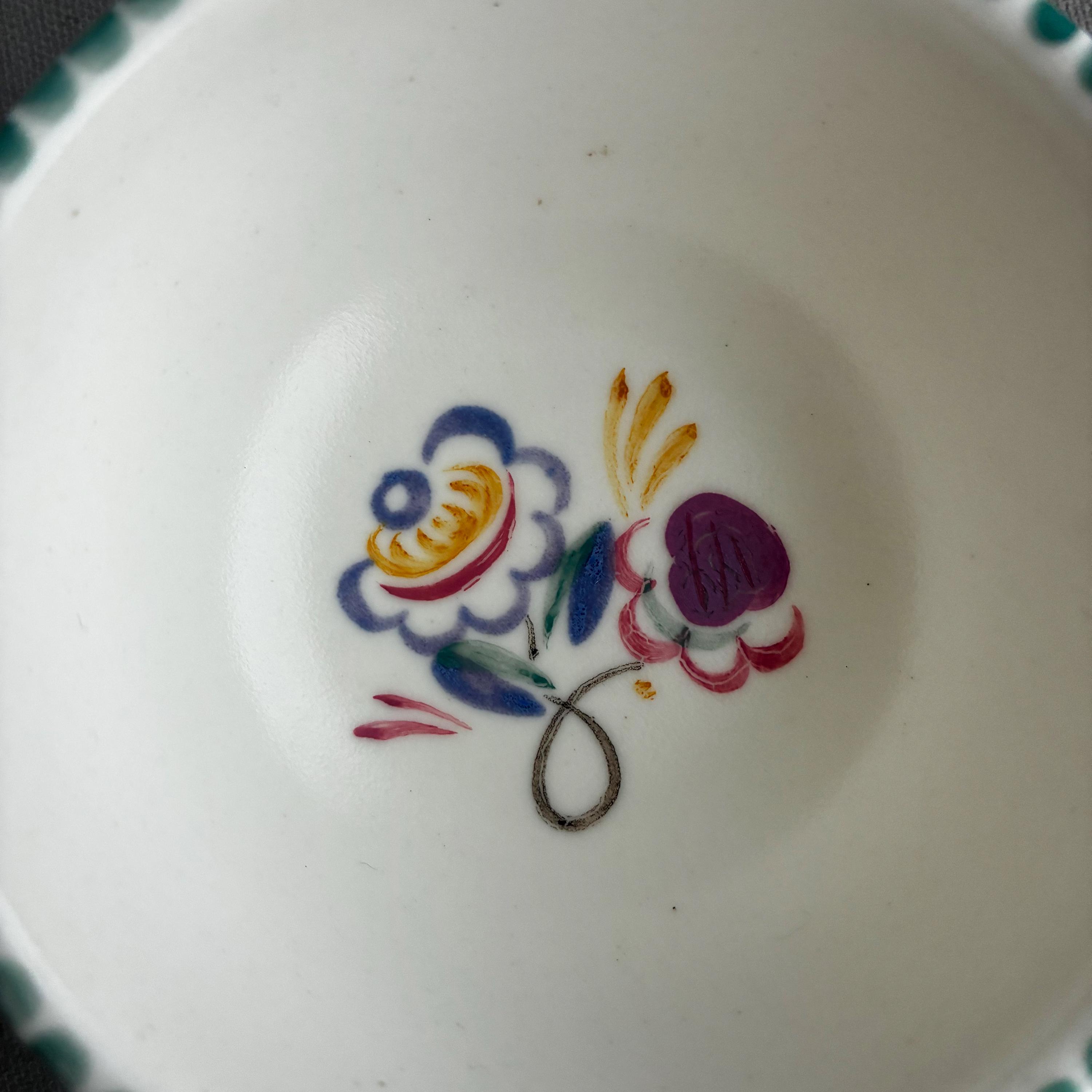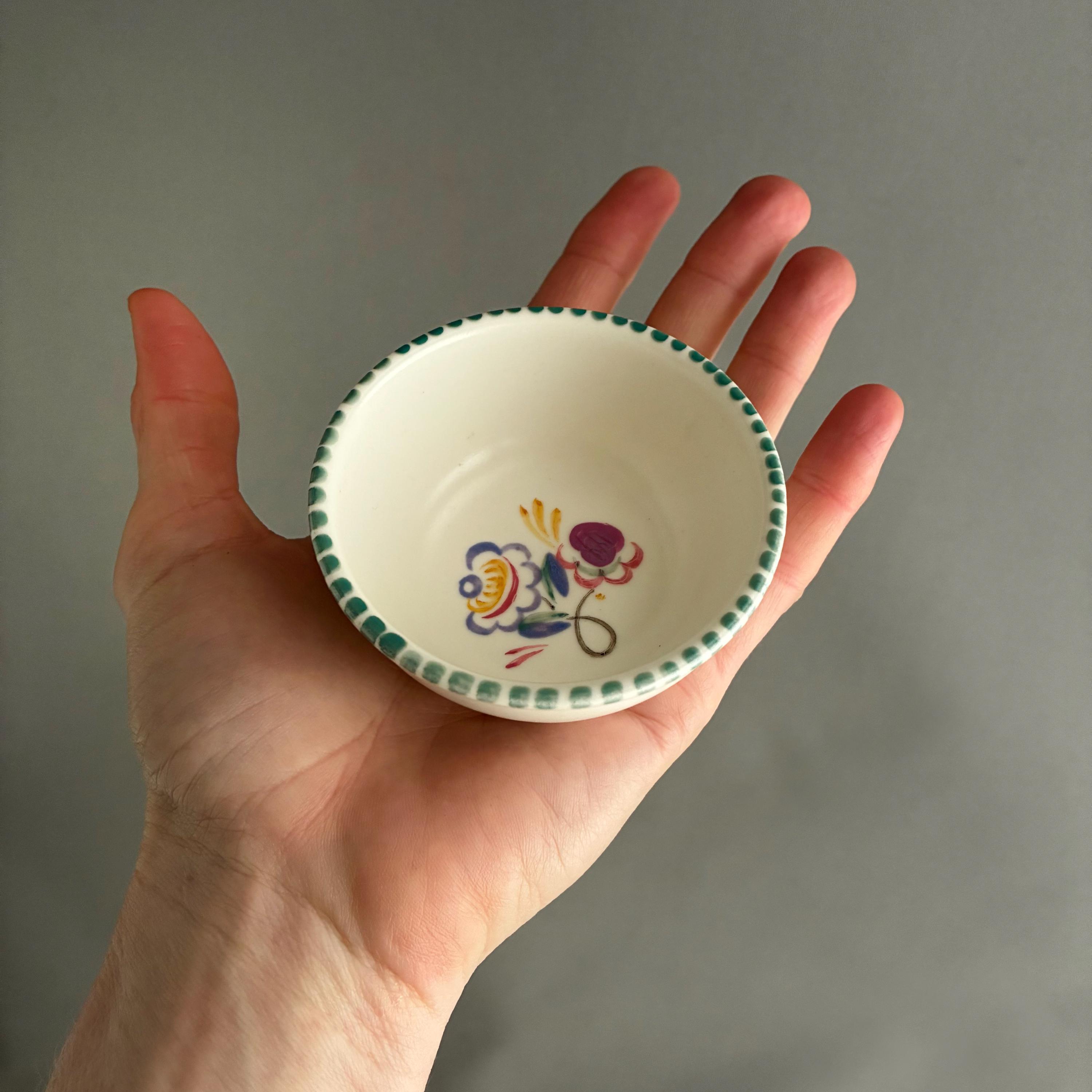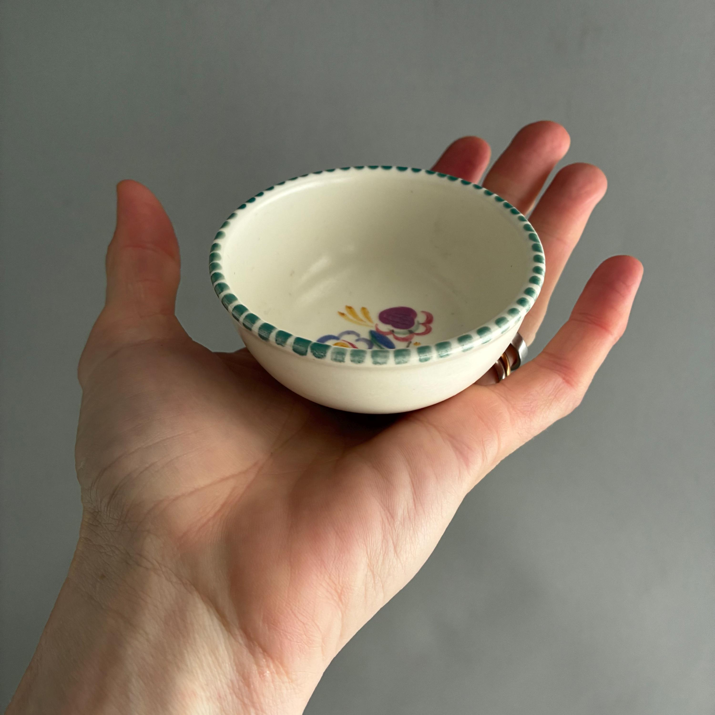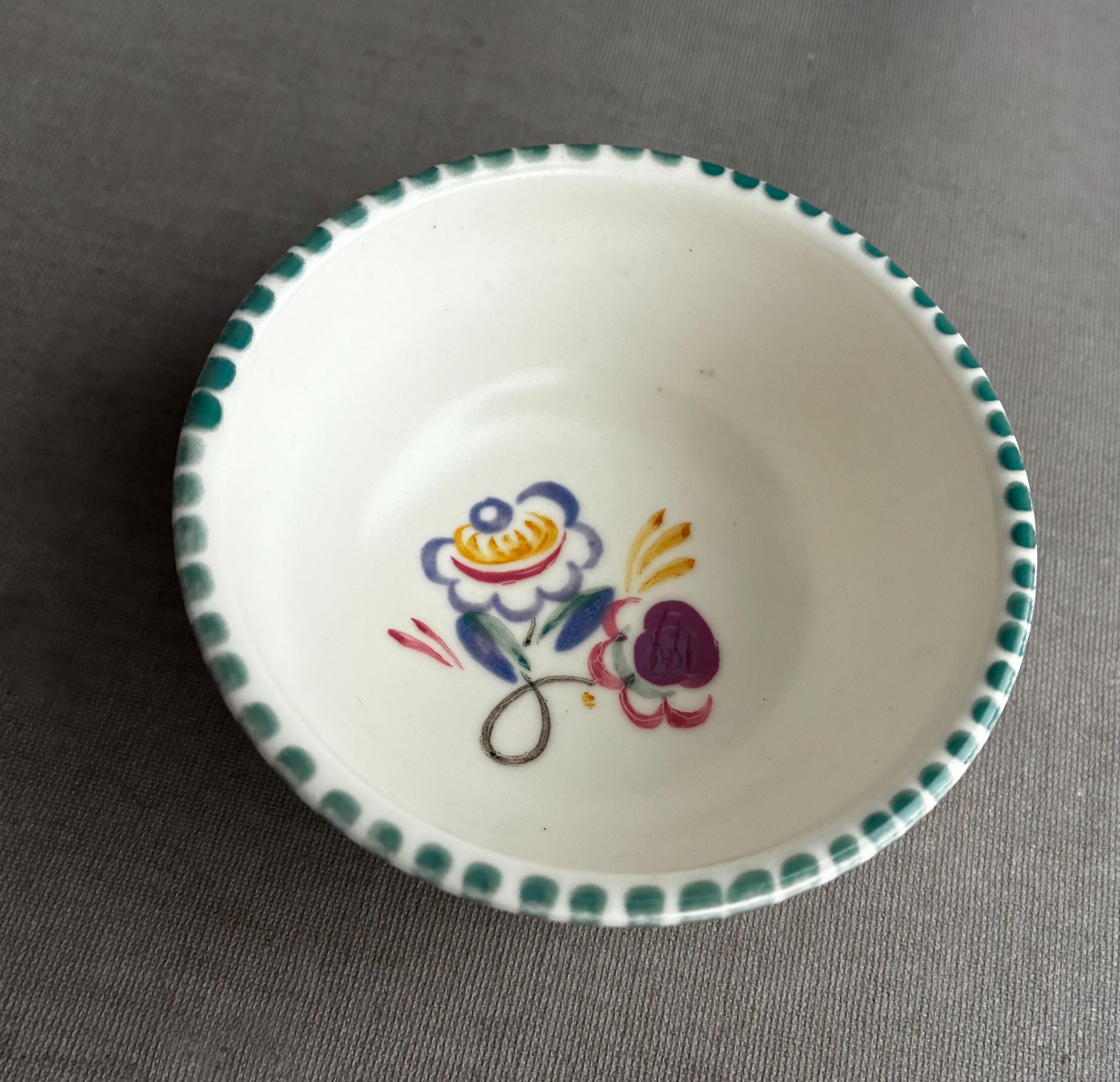 A vintage Poole Pottery traditional ware small dish / pin tray, featuring the floral 'RL' pattern -a hand-painted floral motif with a teal or green dotted rim on a Ceramic with a matte finish.