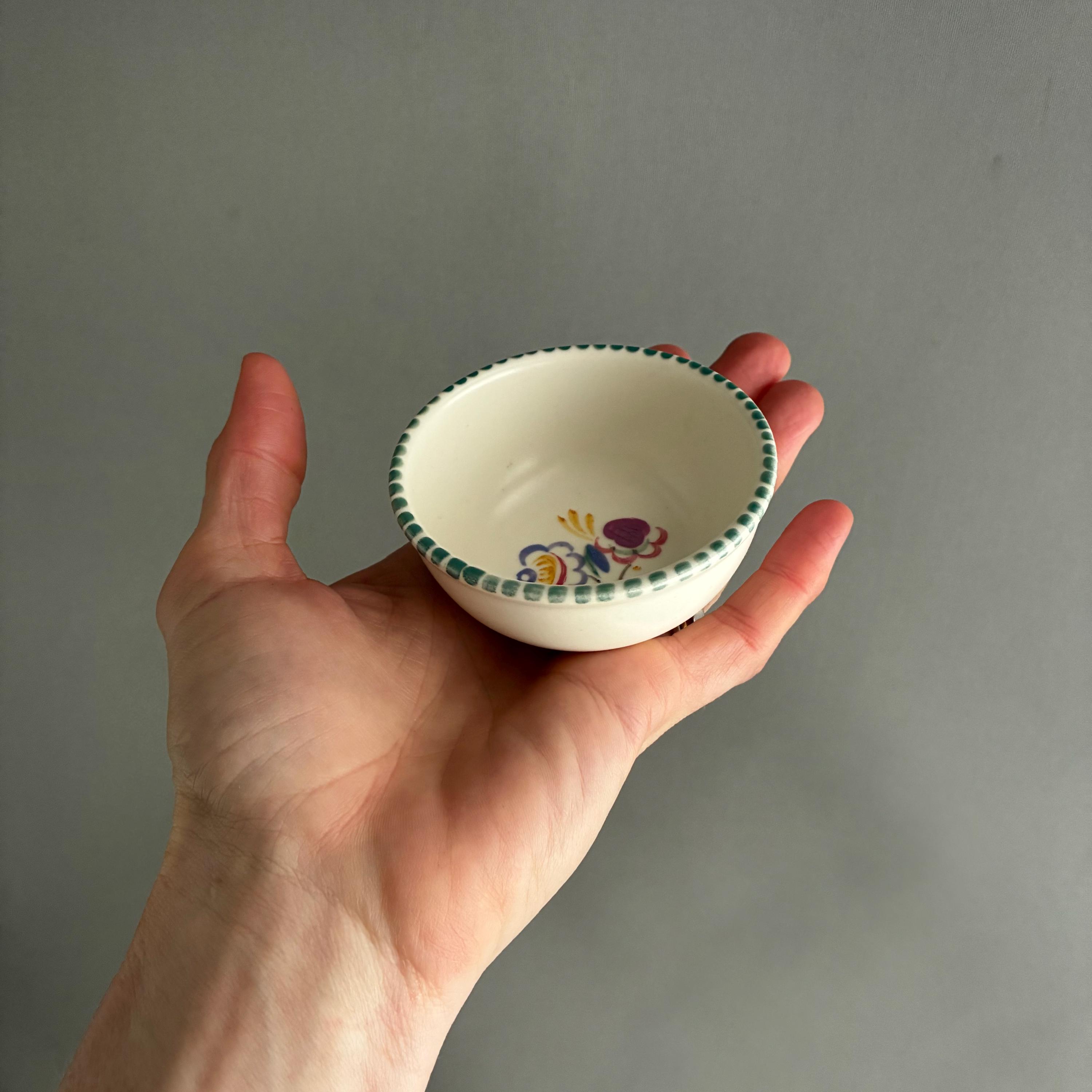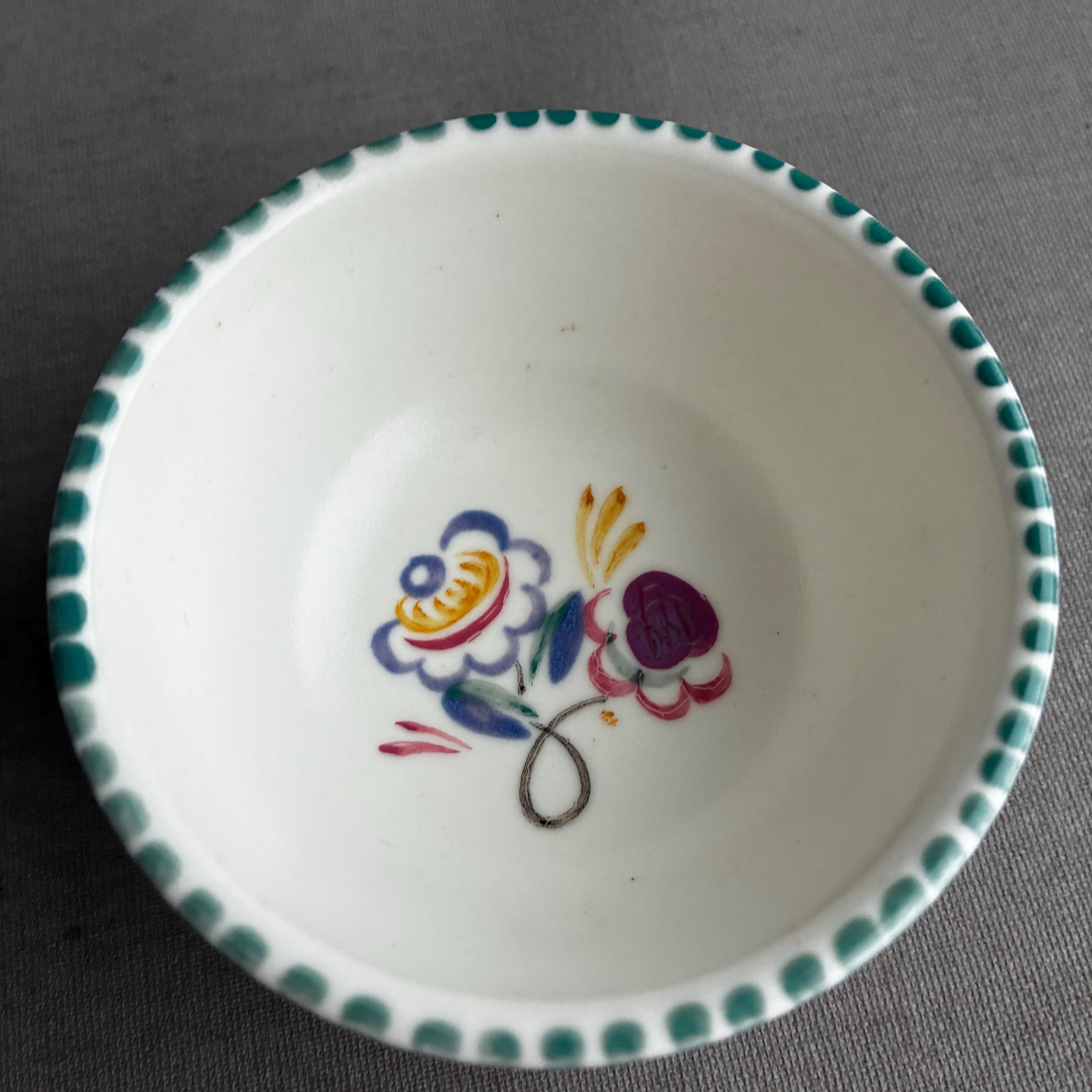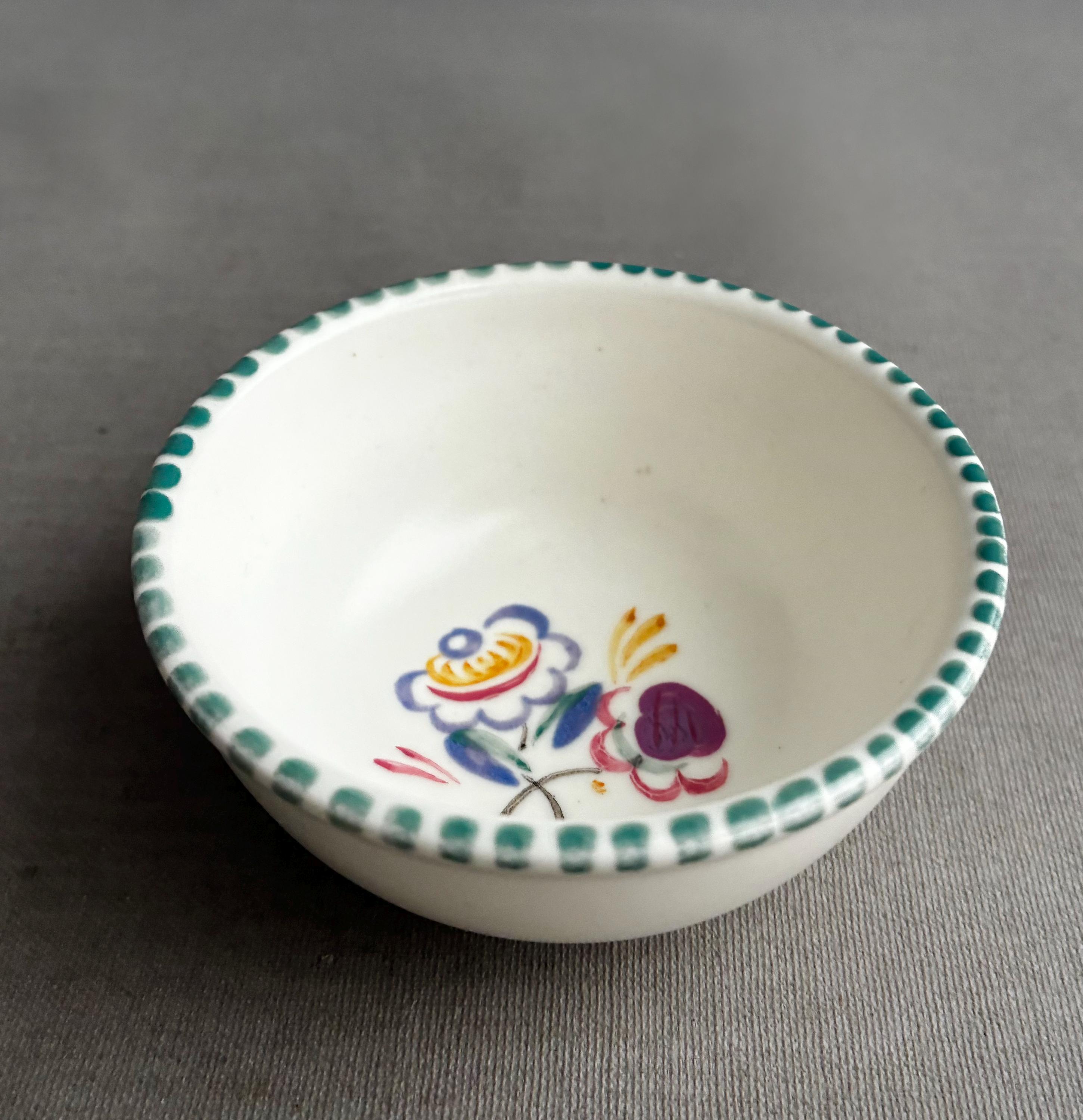 A vintage Poole Pottery traditional ware small dish / pin tray, featuring the floral 'RL' pattern -a hand-painted floral motif with a teal or green dotted rim on a Ceramic with a matte finish.